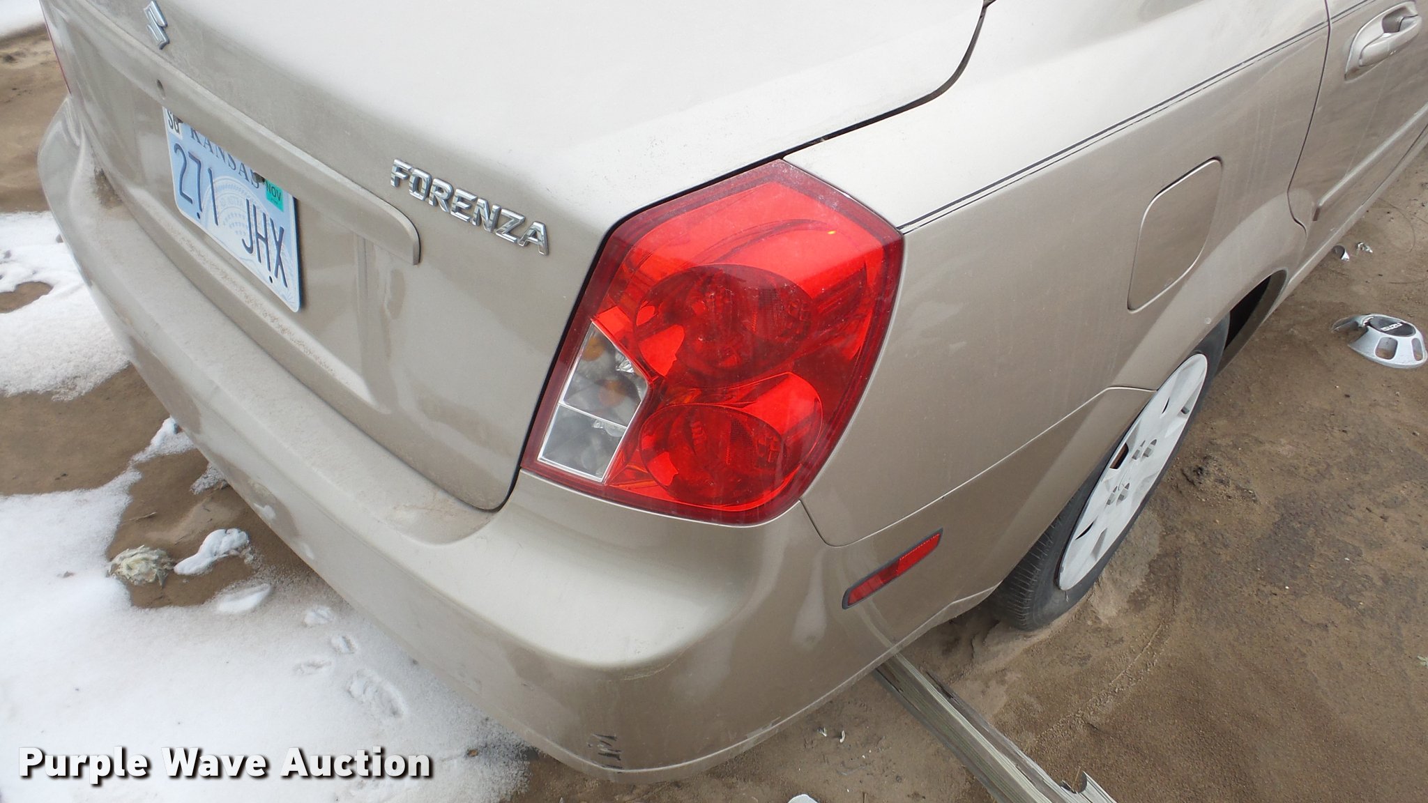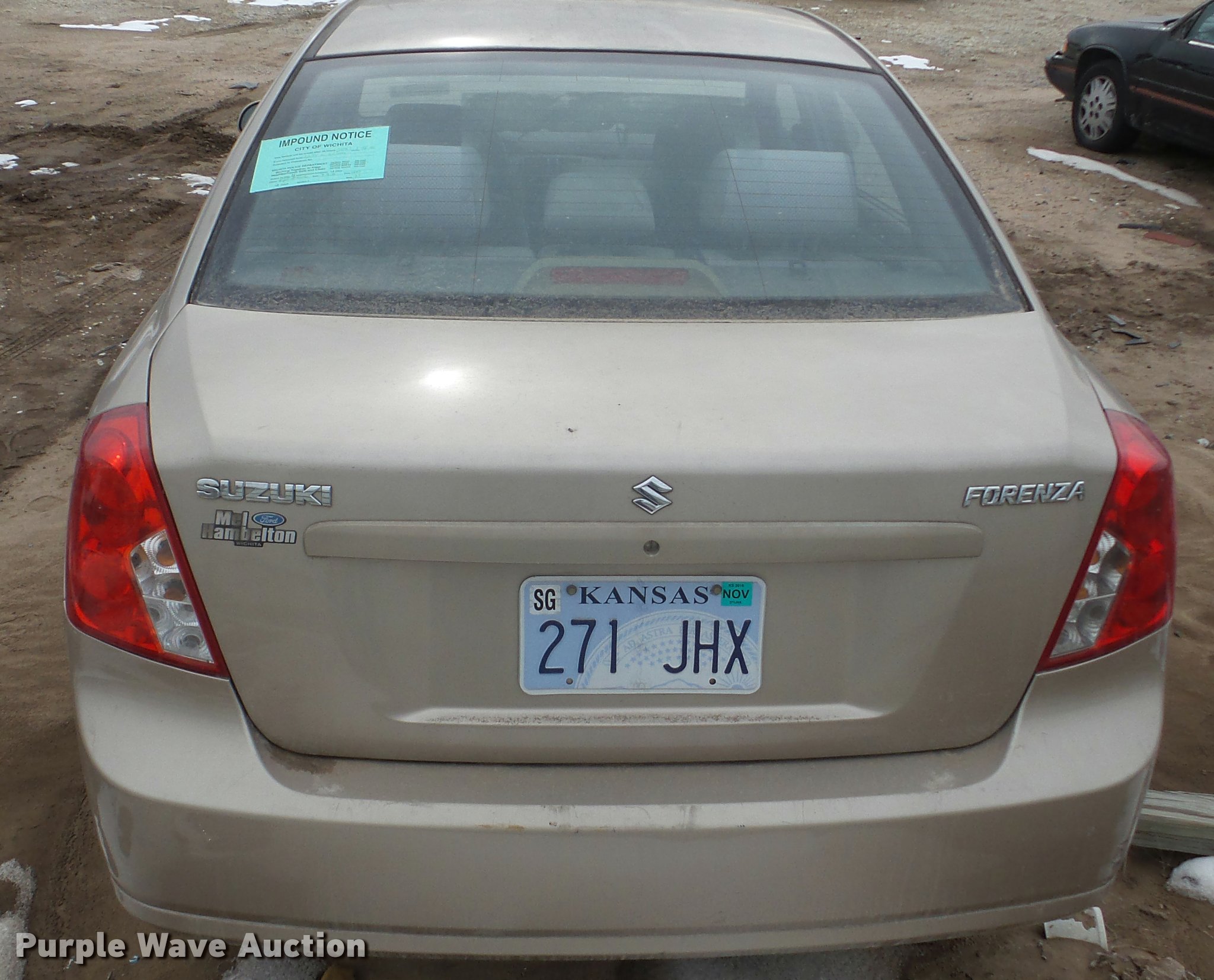 Purple Wave is selling a used Passenger Vehicle in Kansas. This item is a 2006 Suzuki Forenza with the following: Unknown miles on odometer, 2.0L L4 DOHC 16V gas engine, Automatic transmission, AC and heat, Tilt, Cruise, AM/FM/CD, Power windows, locks, and mirrors, Cloth interior, 195/60R15 tires, Doors locked, Cracked windshield, Case# 16C066125