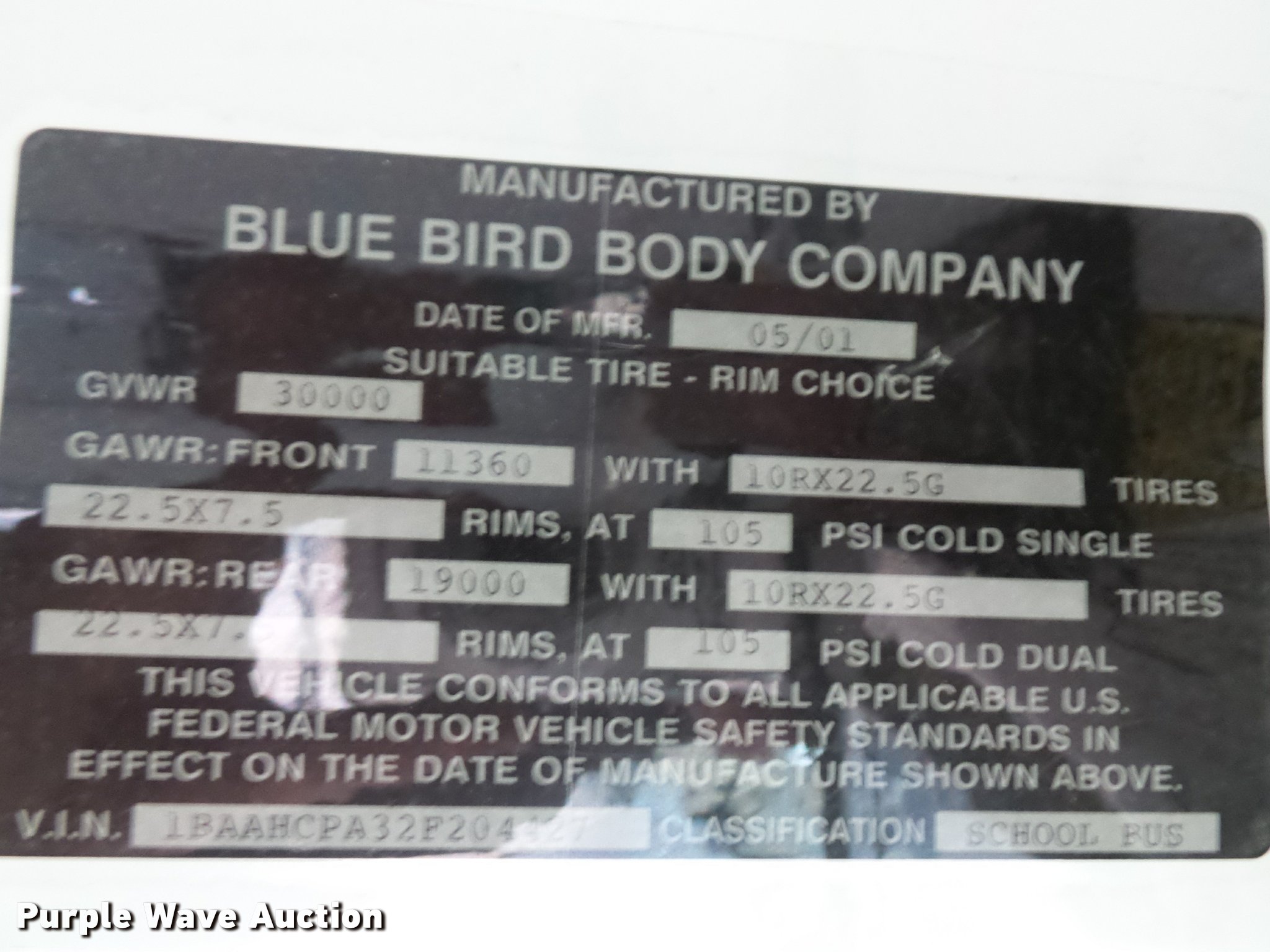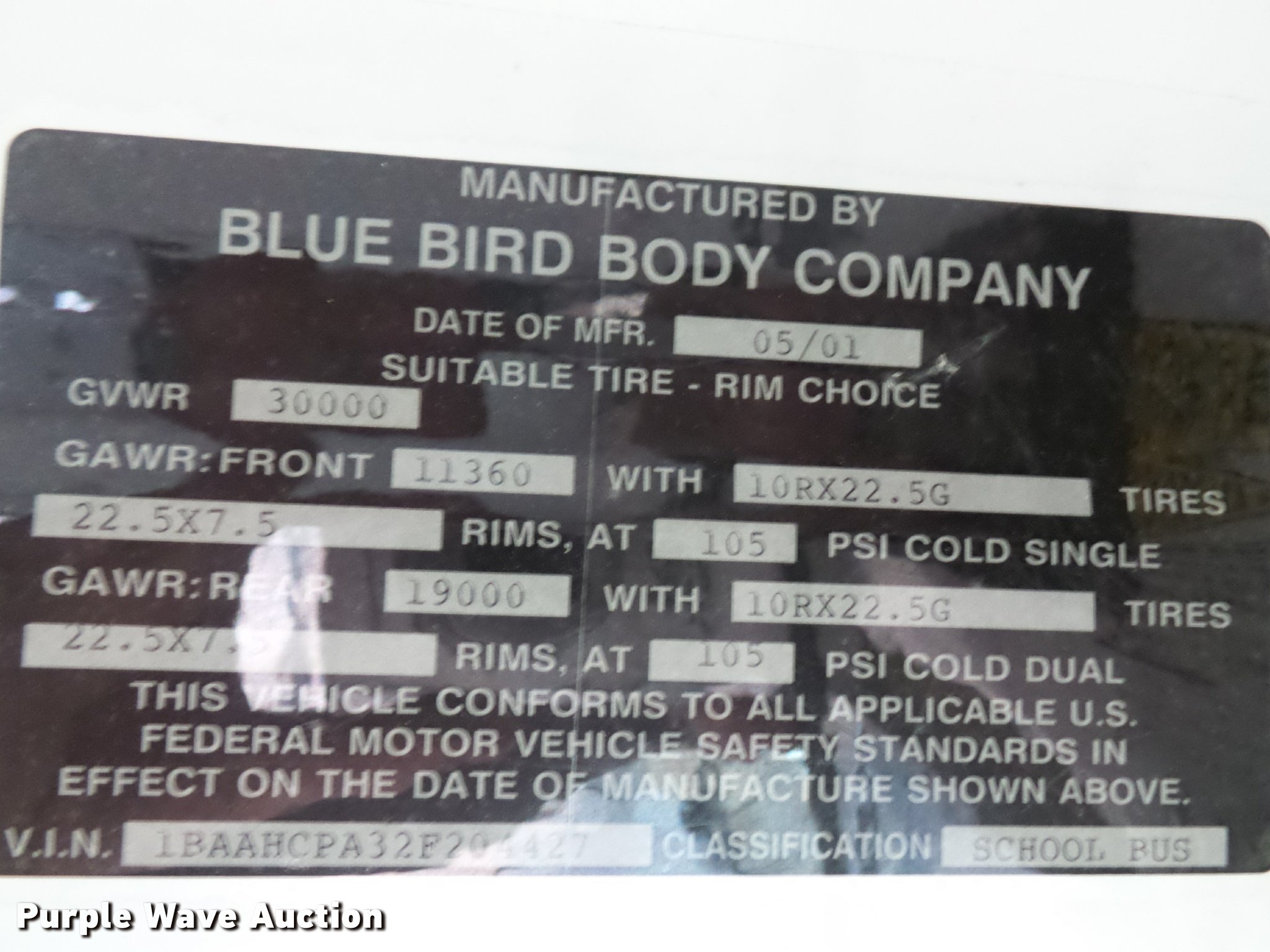 Purple Wave is selling a used Bus in Missouri. This item is a 2002 Blue Bird TC2000 school bus with the following: 143,434 miles on odometer, Cummins ISB 5.9L L6 diesel engine, Automatic transmission, Heat, Cruise, AM/FM/CD, Vinyl interior, Spring suspension, Air brakes, 10R22.5 tires, GVWR 30,000 lbs, Check engine light on, Dead battery, Unit must be jump started