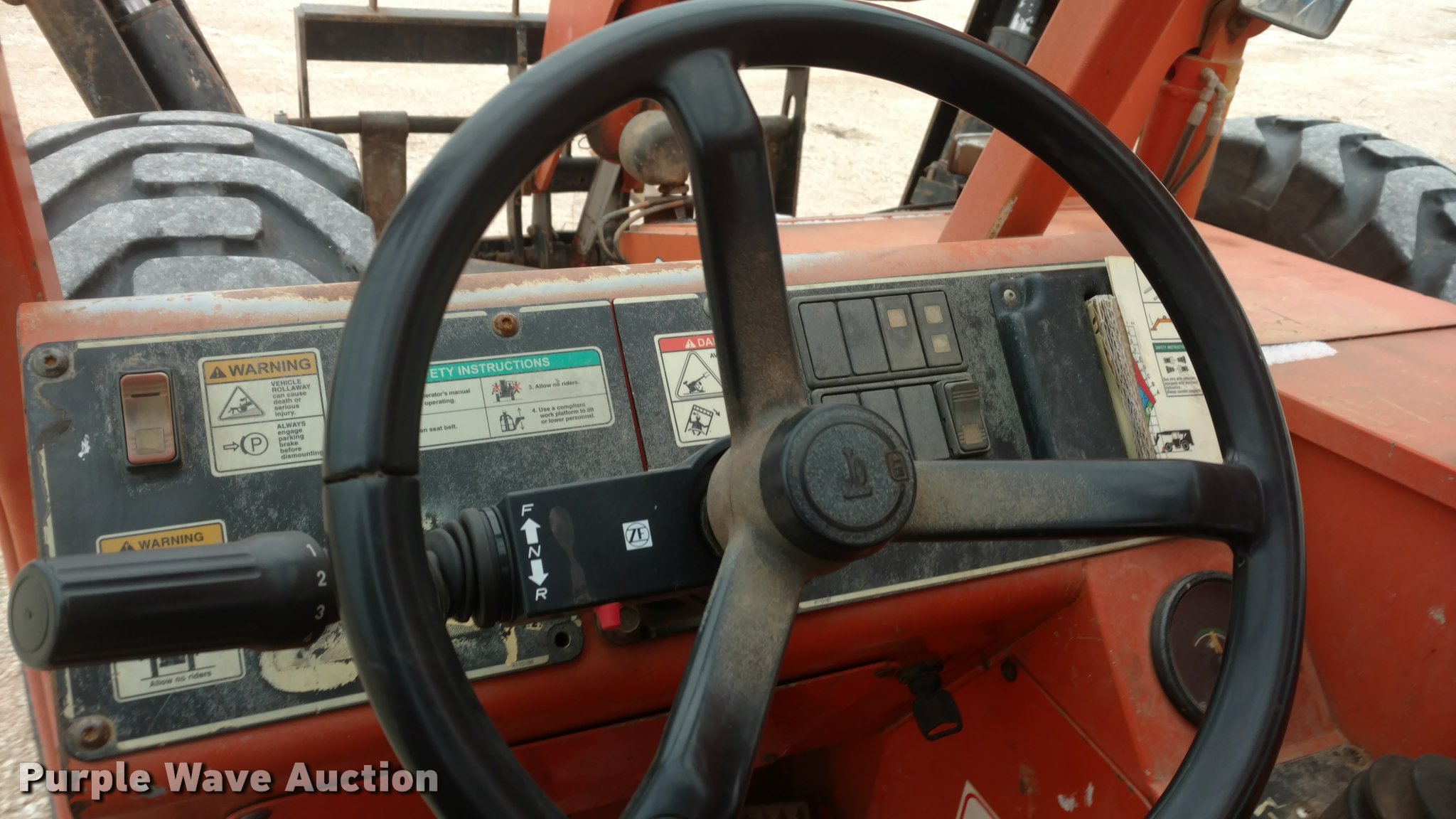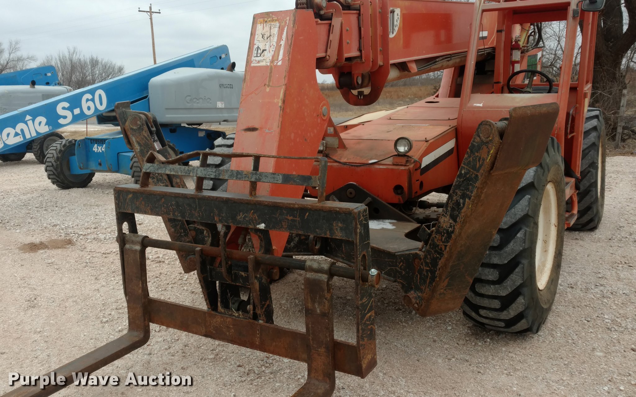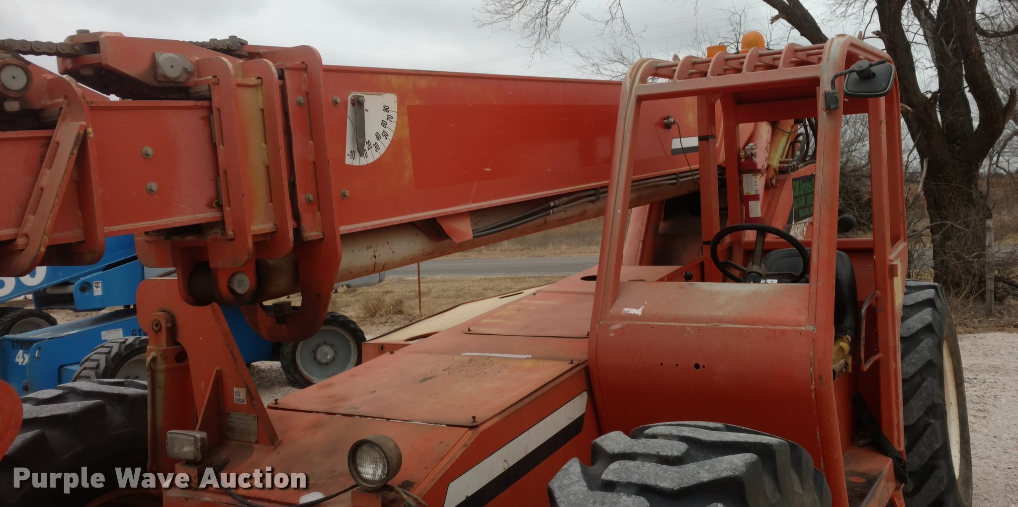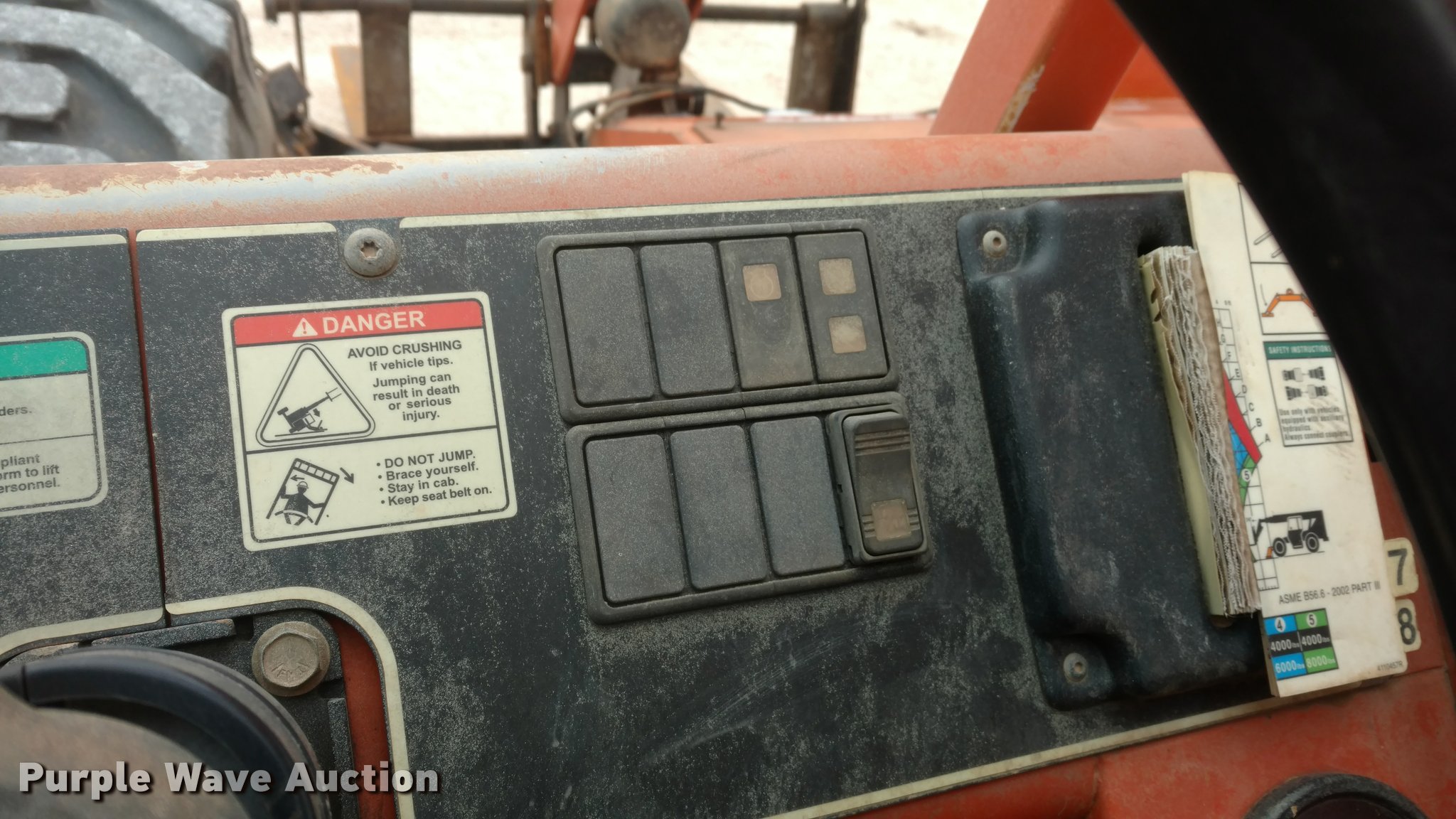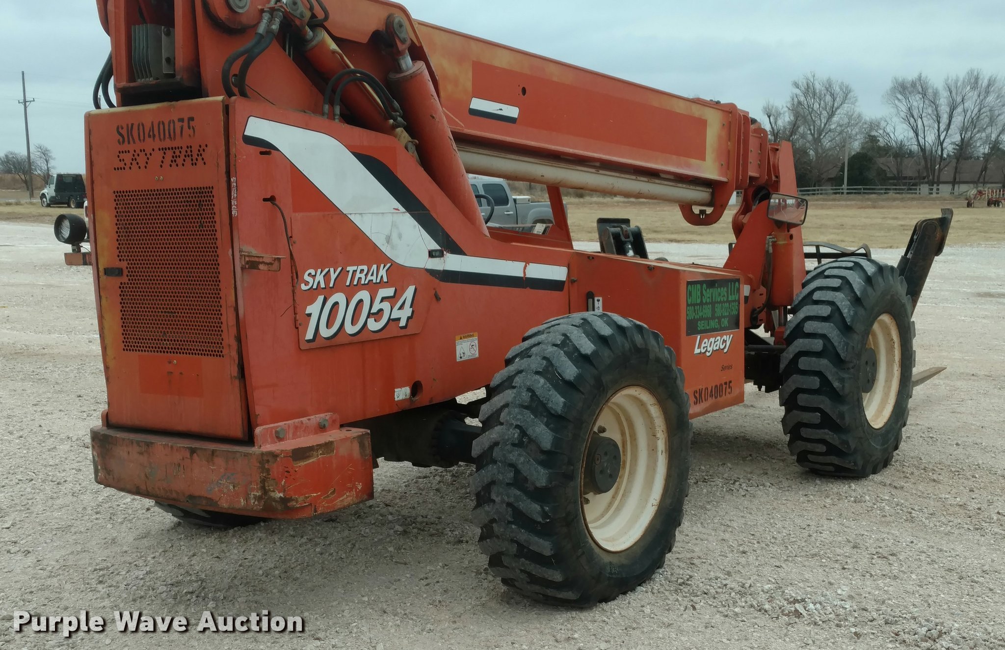 Purple Wave is selling a used Telehandler in Oklahoma. This item is a 2004 Sky Trak 10054 telehandler with the following: 3,888 hours on meter, Cummins four cylinder diesel engine, Powershift transmission, 4F-4R gears, Four wheel drive, Locking differential, Crab steer, Four wheel steer, 10,000 lbs maximum lift capacity, 54' maximum lift height, 26'7" maximum reach, Four stage mast, Hydraulic outriggers, 17.5-25 tires, Serial 0160006508