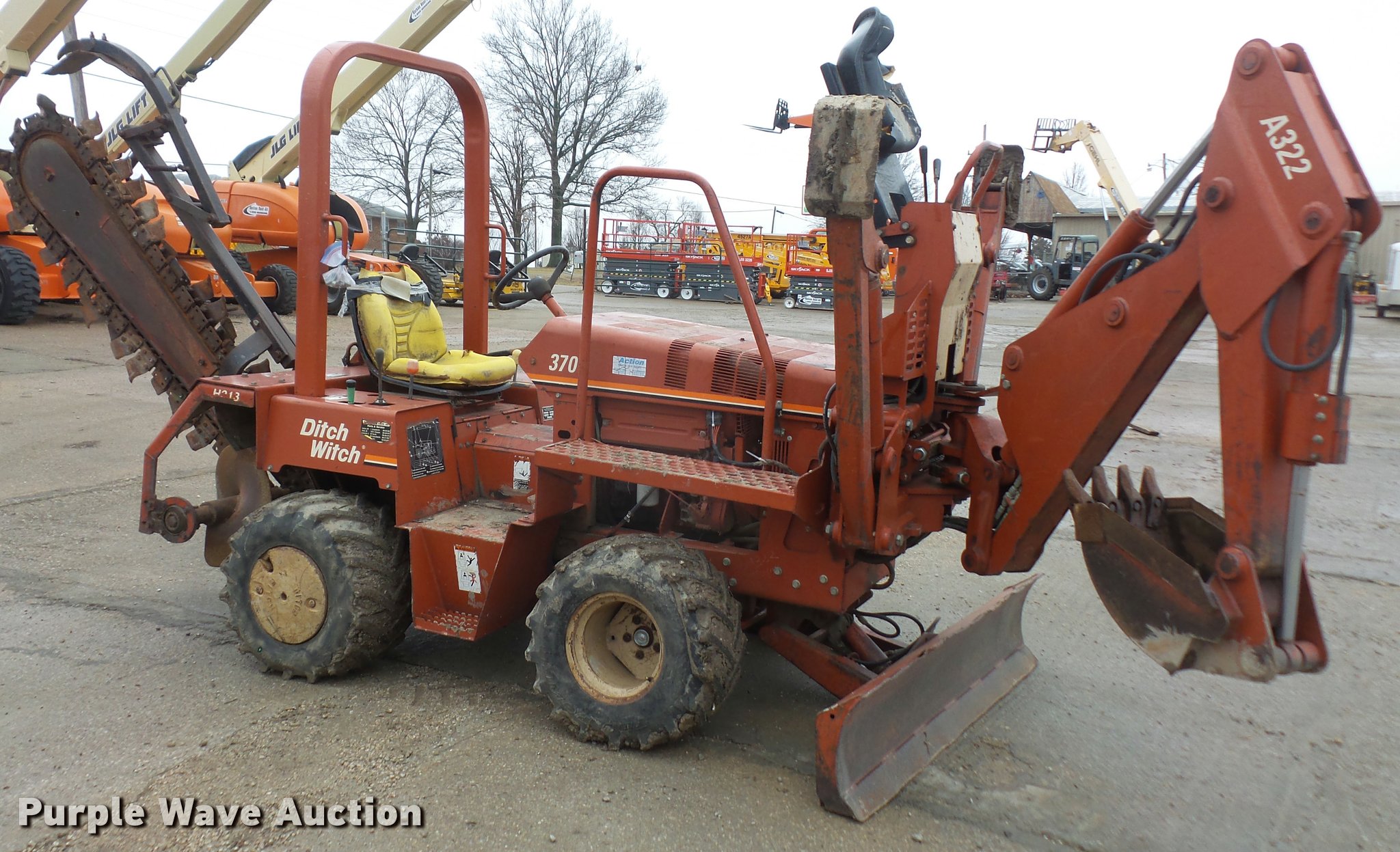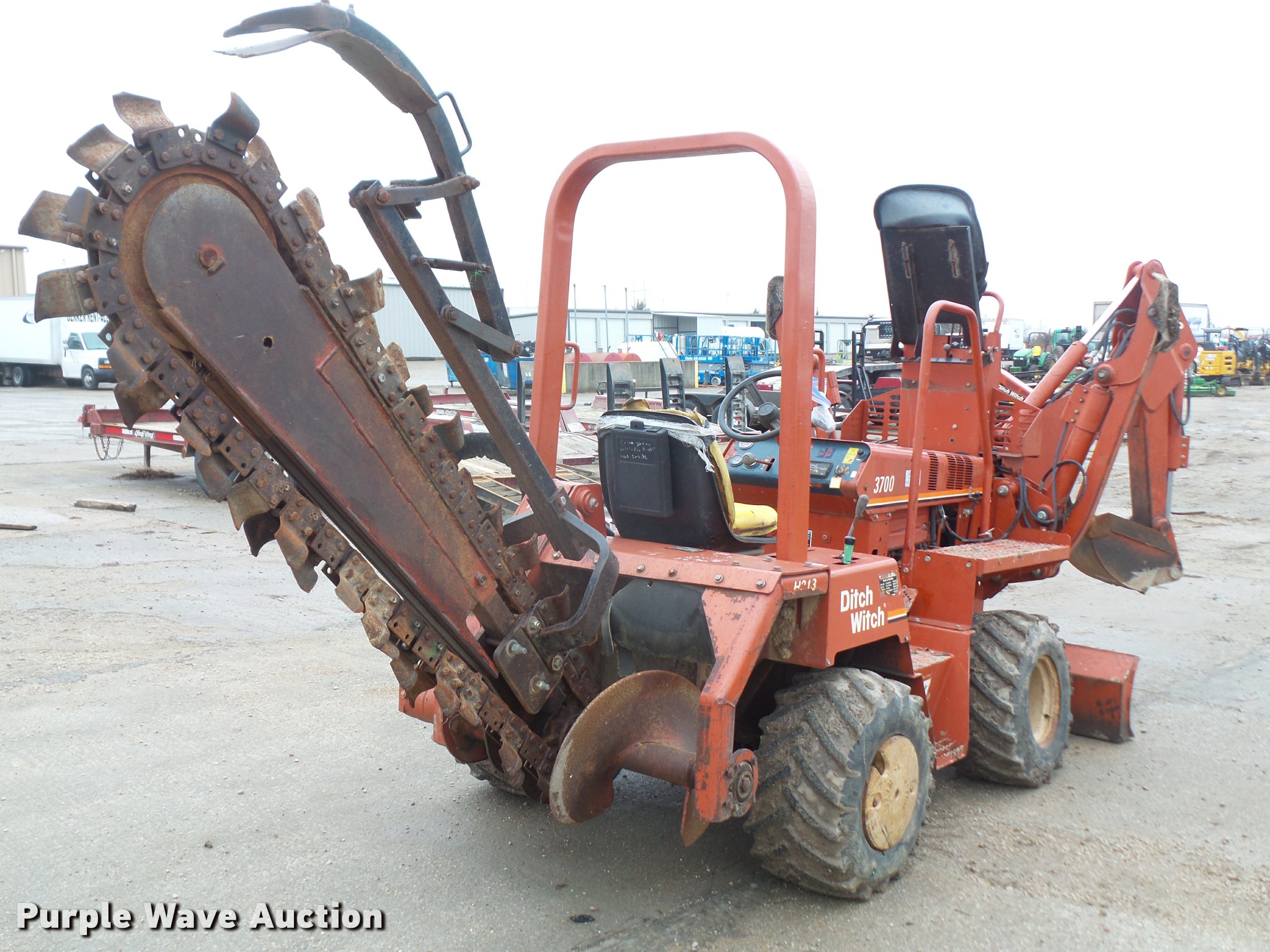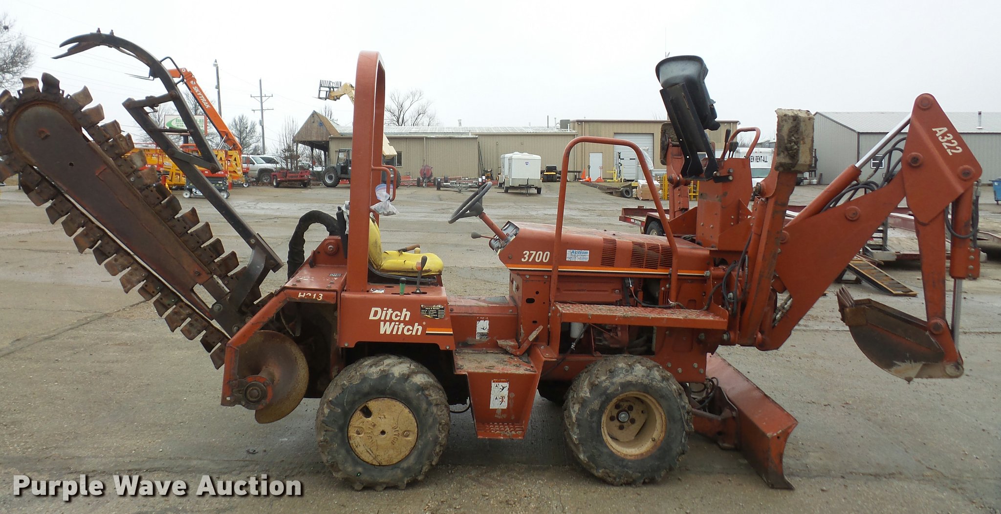 Purple Wave is selling a used Trencher or Rock Saw in Kansas. This item is a 2000 Ditch Witch 3700 trencher with the following: 765 hours on meter, Deutz threee cylinder diesel engine, 20.5 kW, Hydrostatic transmission, Four wheel drive, OROPS, 64" two-way backfill blade, H313 trencher, Serial 8T0585, 5' maximum digging depth, 6" cutting width, Backhoe model A322, Serial 1T0414, 34" stick length, Stick controls, 13"W bucket, (4) teeth, Hydraulic outriggers, 26 x 12.00-12 tires, Serial 3T0325