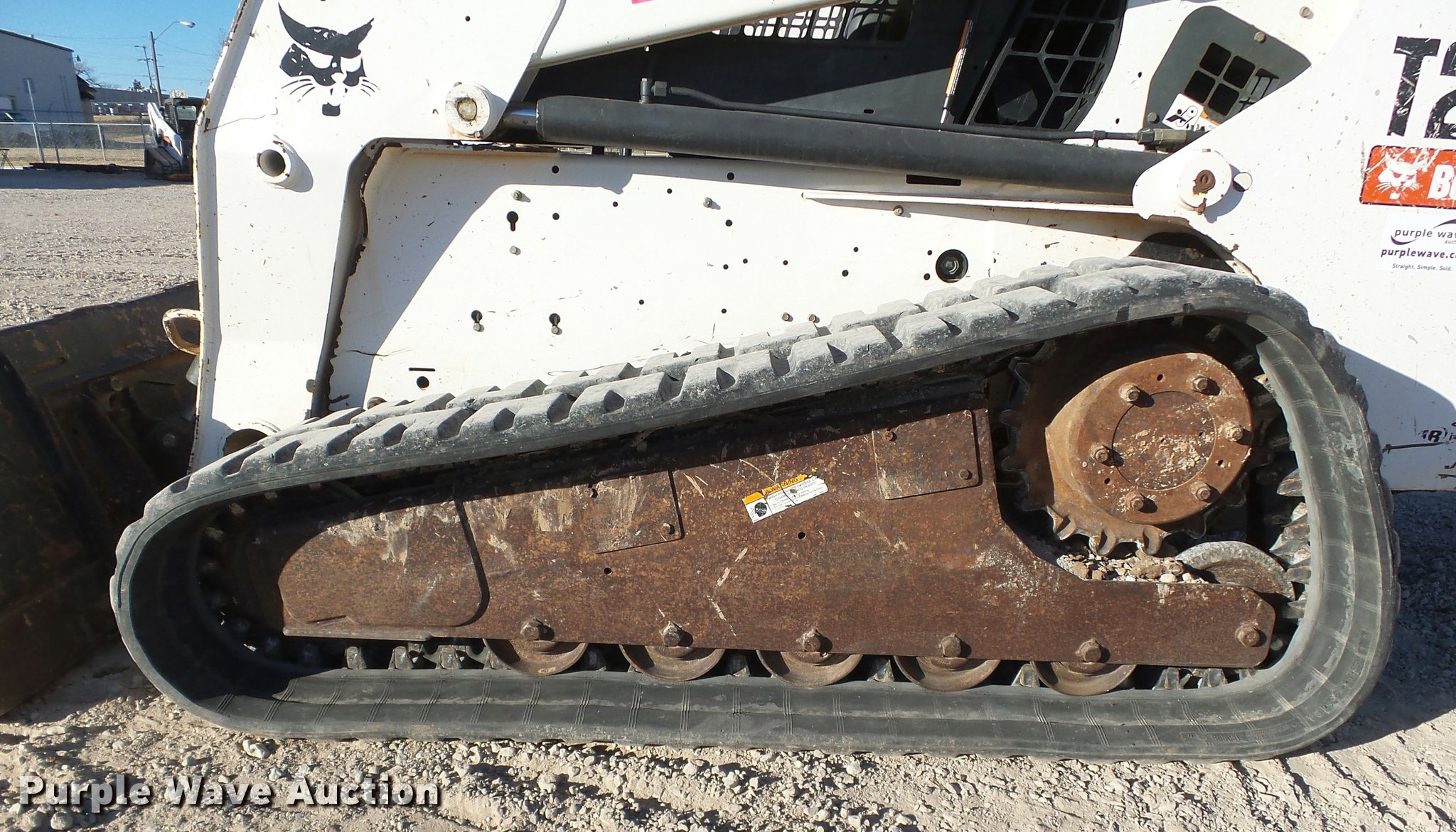 Purple Wave is selling a used Tracked Skid Steer Loader in Oklahoma. This item is a 2007 Bobcat T250 skid steer with the following: 4,869 hours on meter, Kubota V3300T four cylinder turbo diesel engine, Hydrostatic transmission, Open station/canopy, Hand and foot controls, EMS panel, Spring suspension seat, Front work lights, 80"W bucket, Manual quick coupler, High Flow auxiliary hydraulics, Five bottom rollers, Bridgestone 17.5"W tracks, 2,500 lbs rated operating capacity, Serial 531813369