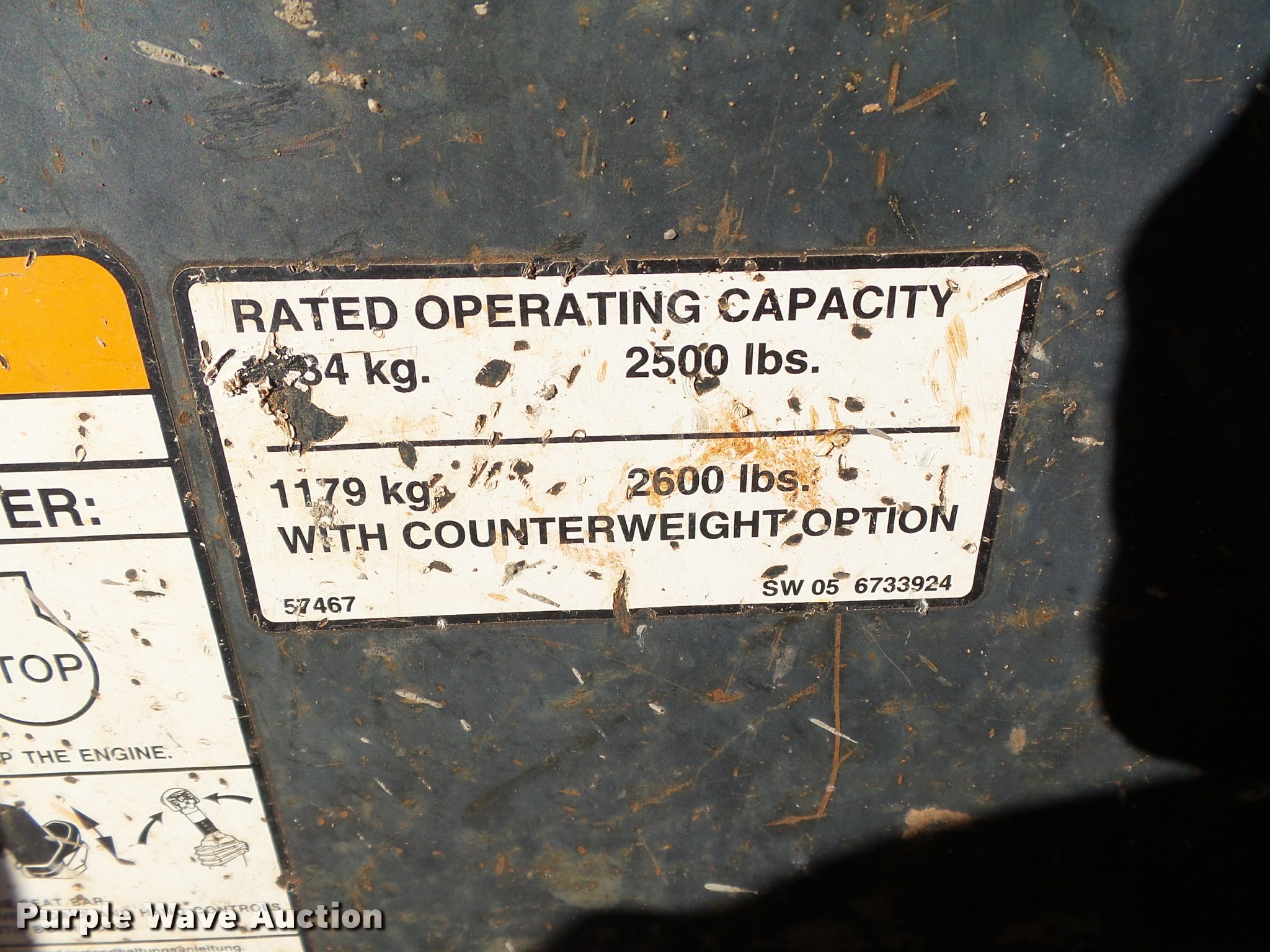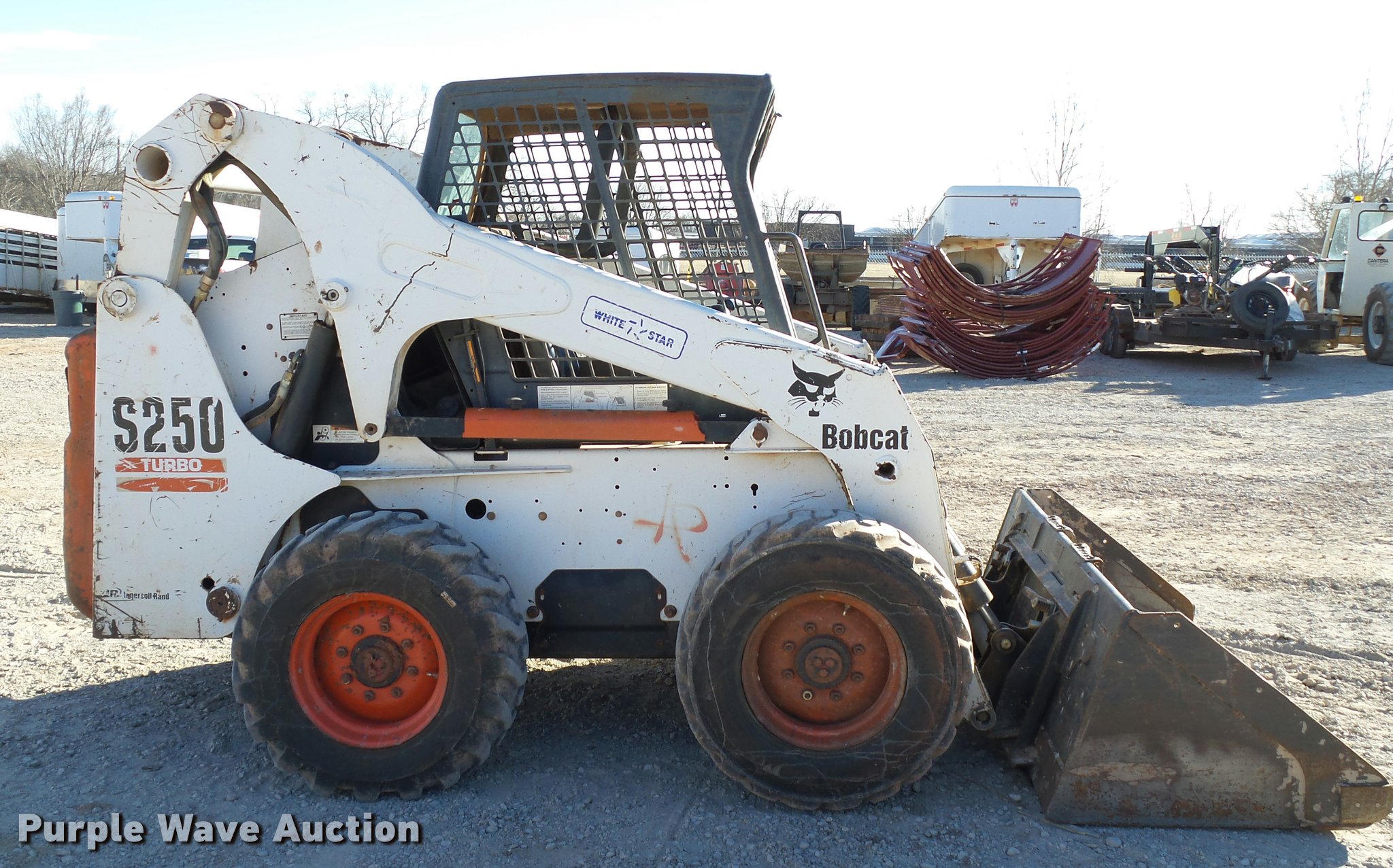 Purple Wave is selling a used Skid Steer Loader in Oklahoma. This item is a 2005 Bobcat S250 skid steer with the following: 6,263 hours on meter, Kubota V3300-T four cylinder turbo diesel engine, Serial 5E2034, Hydrostatic transmission, Open station/canopy, Hand and foot controls, EMS panel, Spring suspension seat, Front work lights, 72"W bucket, Manual quick coupler, High Flow auxiliary hydraulics, 12-16.5 NHS tires, 2,500 lbs rated operating capacity, Serial 526017552