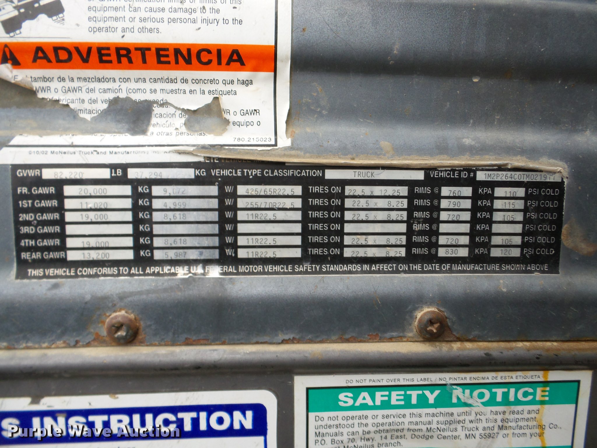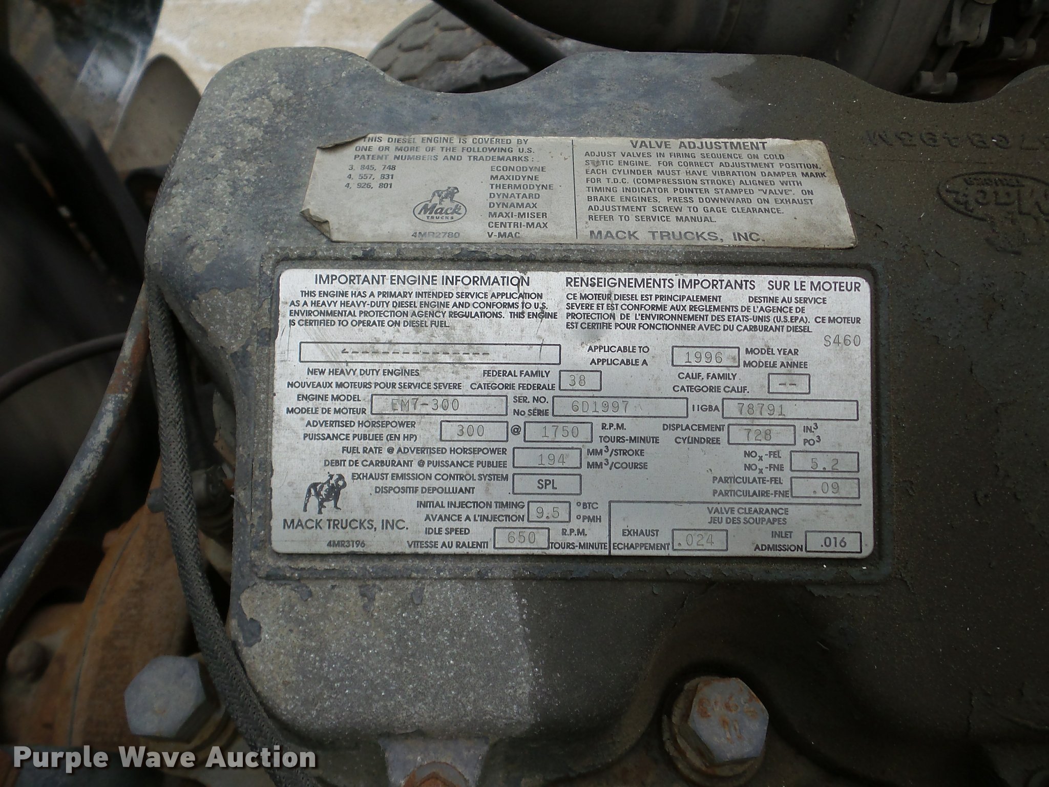 Purple Wave is selling a used Ready Mix or Pump Truck in Iowa. This item is a 1996 Mack RD690S ready mix truck with the following: 207,337 miles on odometer, 30,904 hours on meter, Mack E7 12.0L L6 turbo diesel engine, Eight speed manual transmission, Triple axle, Heat, Air suspension seat, Air ride cab, PTO, McNeilus mixer body, 11 cu.yd. capacity, Rear drum controls, (3) steel chute extensions, Water tank, Ladder, Rear discharge, Single fuel tank, 252" wheelbase, Walking beam suspension, Air brakes, 425/65R22.5 front tires, 11R22.5 rear tires, GVWR 82,220 lbs, FAWR 20,000 lbs, IAWR 19,000 lbs, RAWR 13,200 lbs, Unit# 6