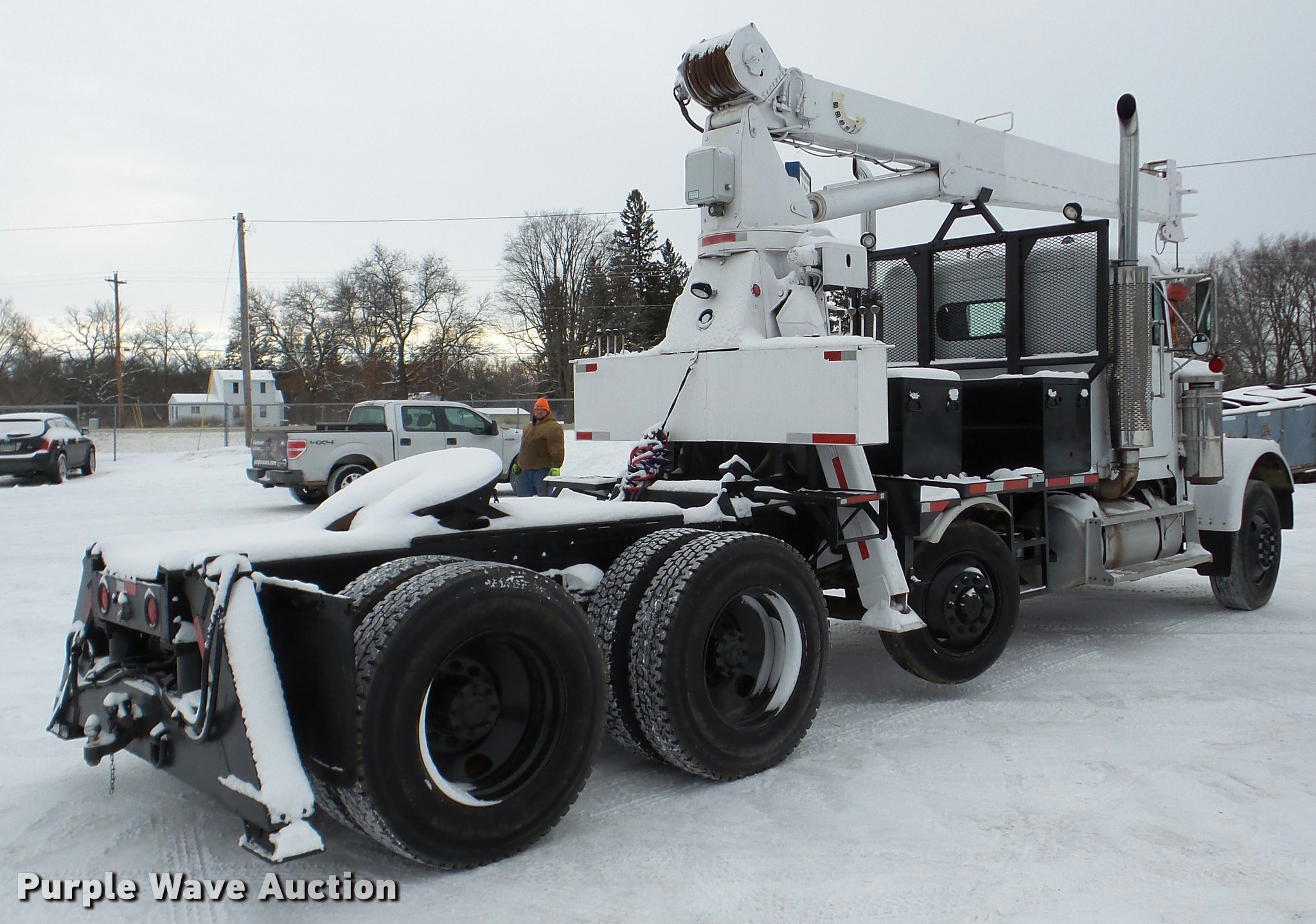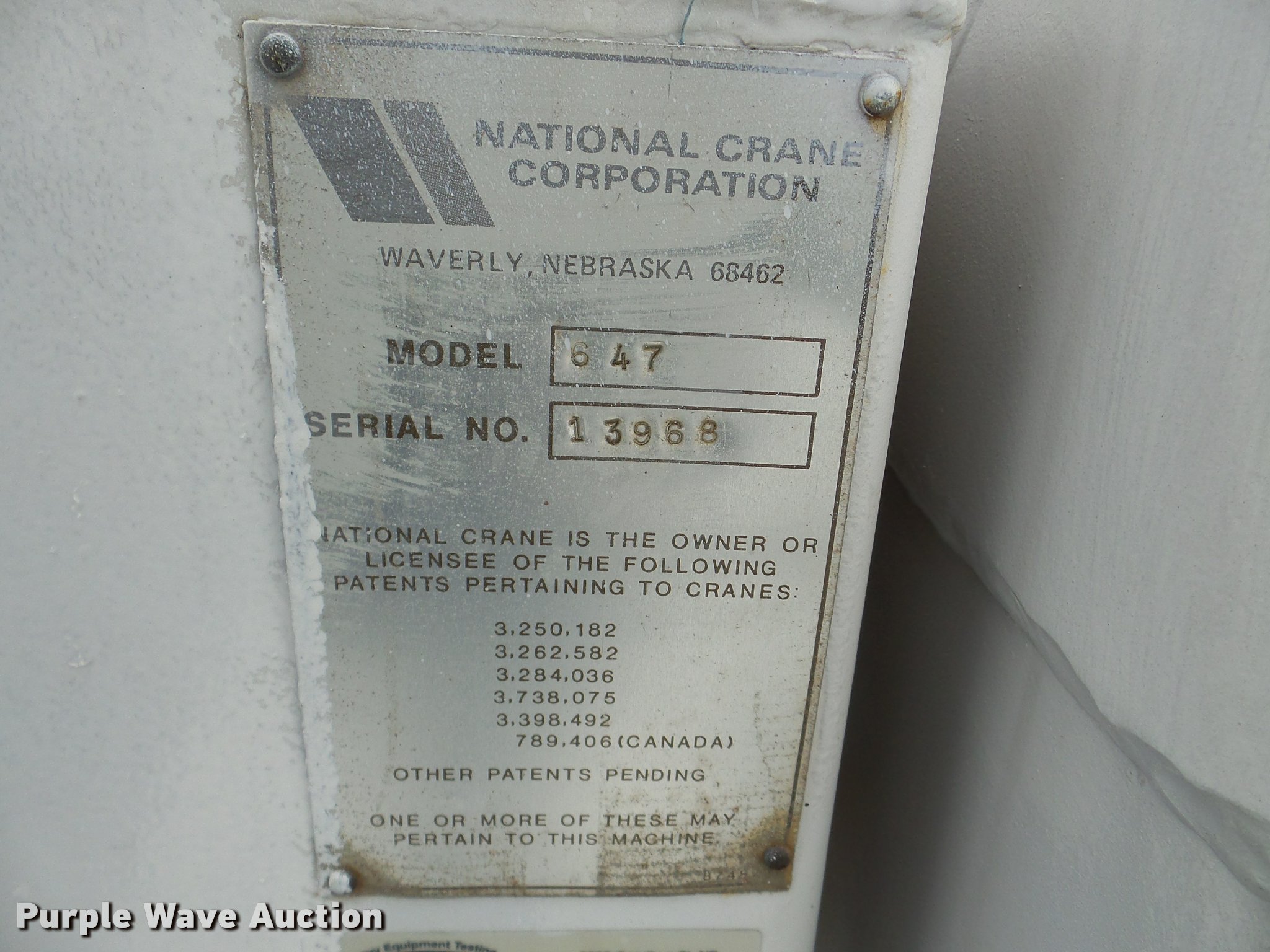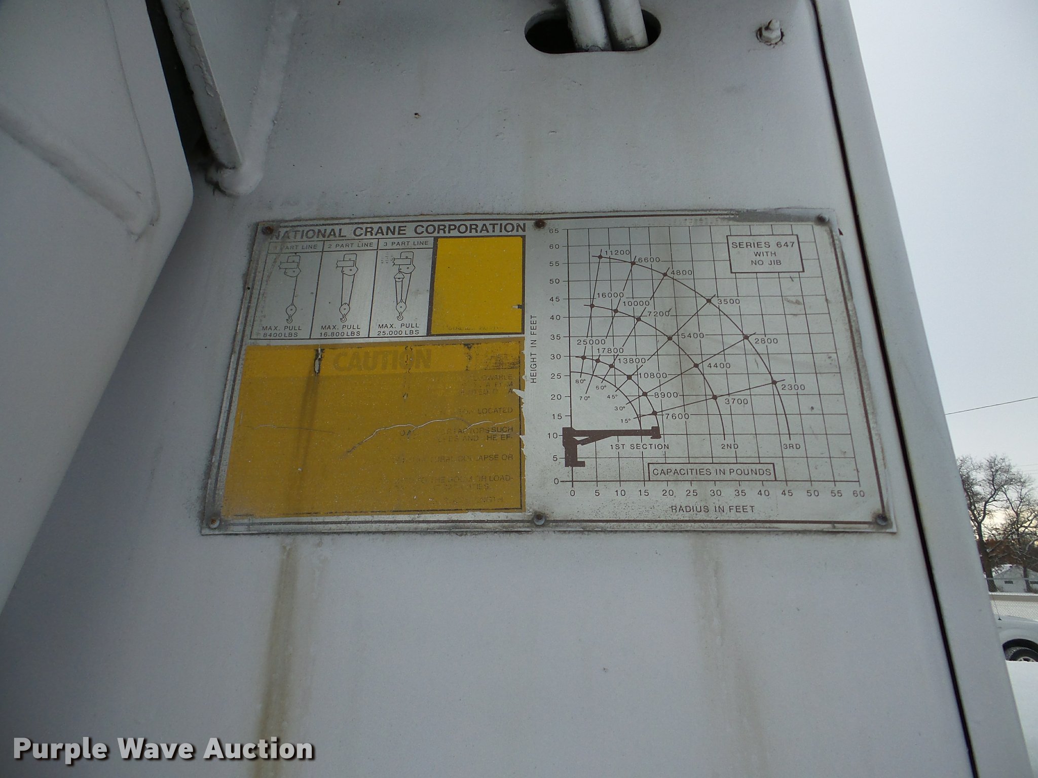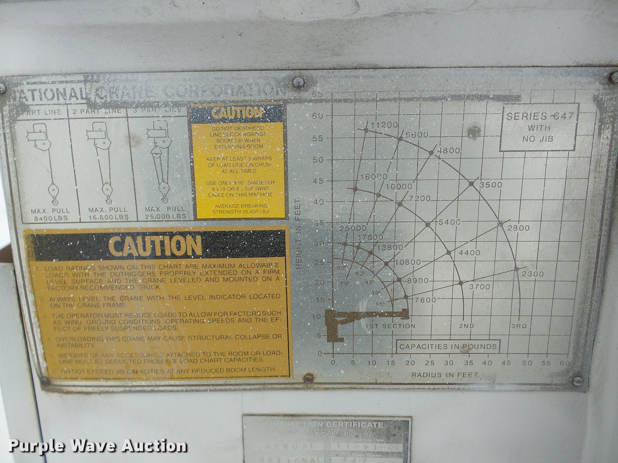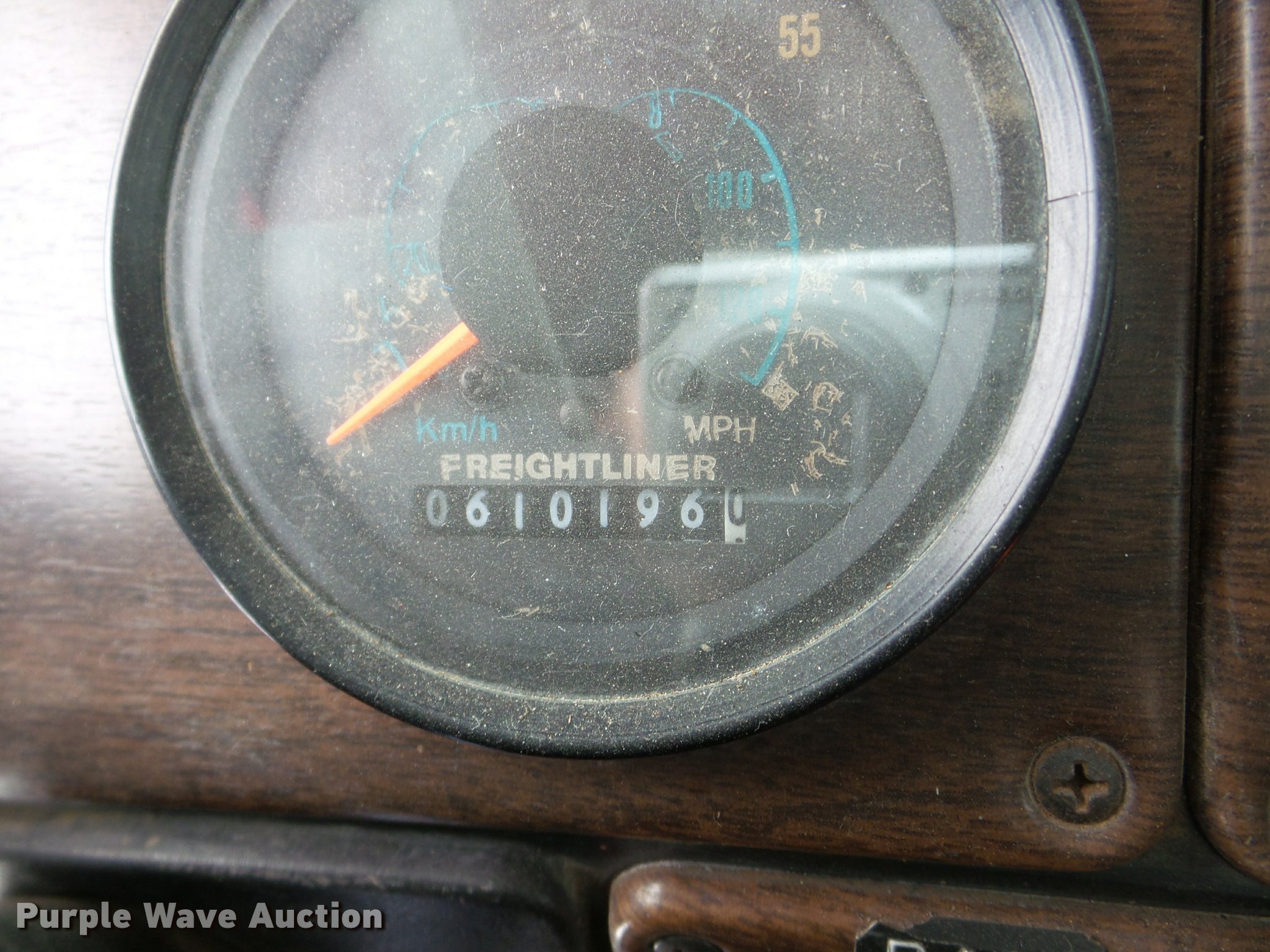 Purple Wave is selling a used Crane Truck in Minnesota. This item is a 1988 Freightliner FLC-64 crane truck with the following: 610,196 miles on odometer, 3,191 hours on meter, Caterpillar 3406B 14.6L L6 diesel engine, 18 speed manual transmission, Triple axle, Heat, AM/FM/cassette, Air suspension seat, Inter-axle differential lock, PTO, National Crane Corperation 647 crane, Serial 13968, 25,000 lbs maximum lift capacity, 55' boom length, Three stage mast, Ground controls, Boom rotation, Telescopic boom, (4) outriggers, One outrigger missing,, Toolboxes, Fifth wheel plate, Dual exhaust stacks, Dual fuel tanks, Air suspension, Air brakes, 11R24.5 tires, 235/80R22.5 steerable axle tires