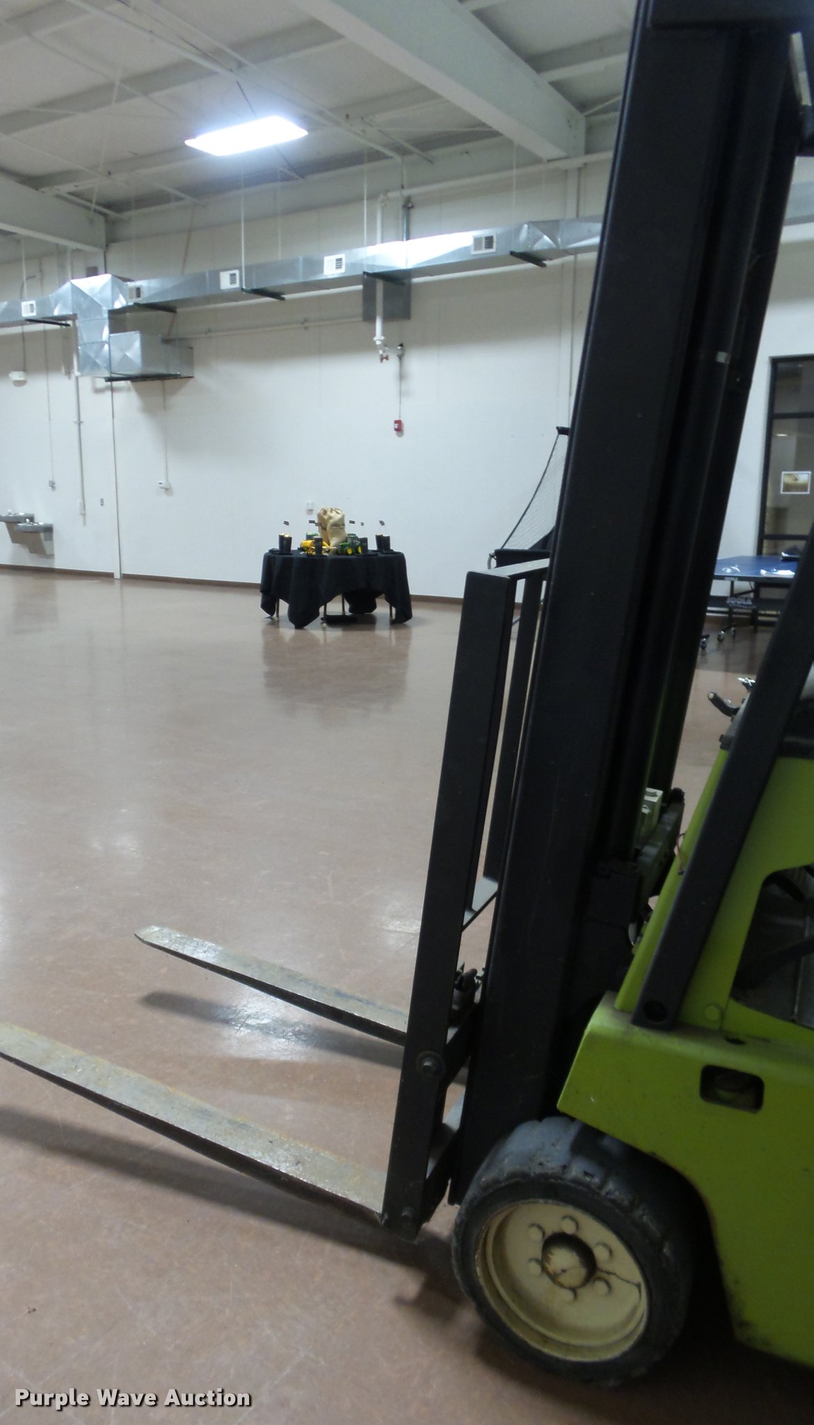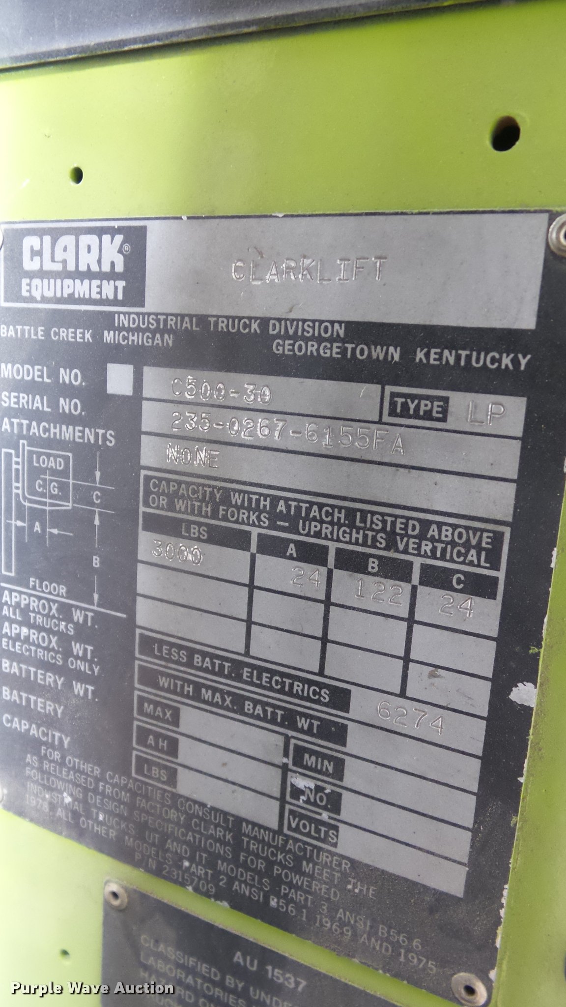Purple Wave is selling a used Warehouse Forklift in Kansas. This item is a Clark C500-30 forklift with the following: Front work lights, 42"L x 4"W x 4.5" thick forks, Mast tilt, 13.5 x 5.5 x 8 rear tires, Propane tank included, Unit will not stay running, Serial 235-0267-6155FA
