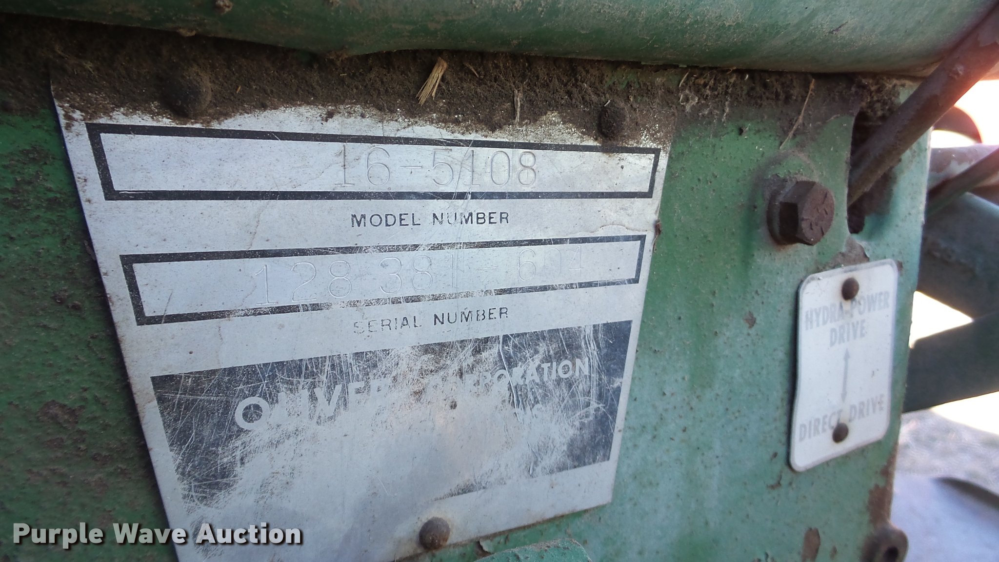 Purple Wave is selling a used Tractor in Kansas. This item is a Oliver 1600 tractor with the following: 7,916 hours on meter, Oliver 3.8L six cylinder gas engine, Manual transmission, 6F-2R gears, Front and rear work lights, Great Bend Workmaster 800 loader, 72"W bucket, Three point, 540 PTO, 105" wheelbase, 11L-15 front tires, 18.4-30 rear tires, Serial 128381-604