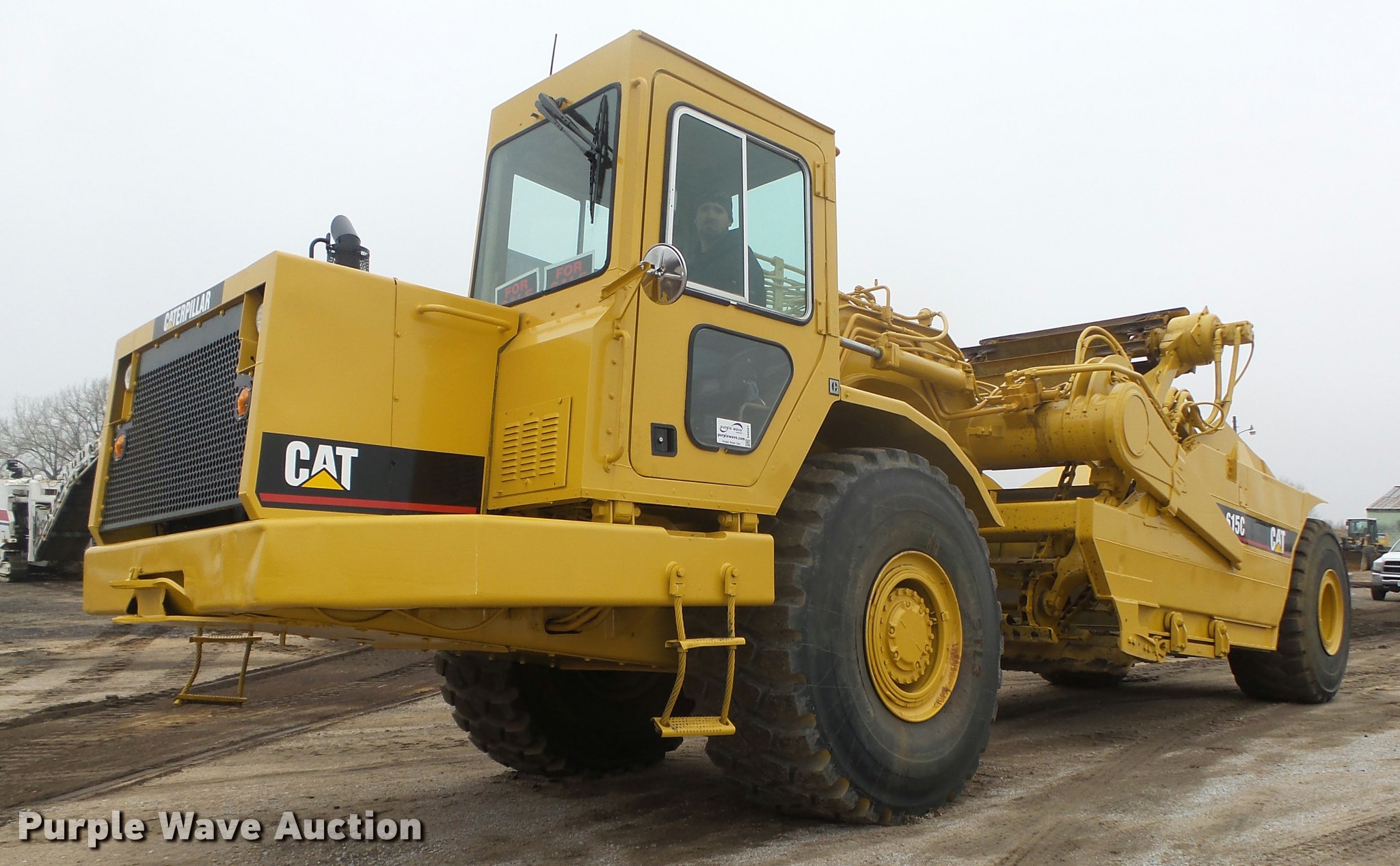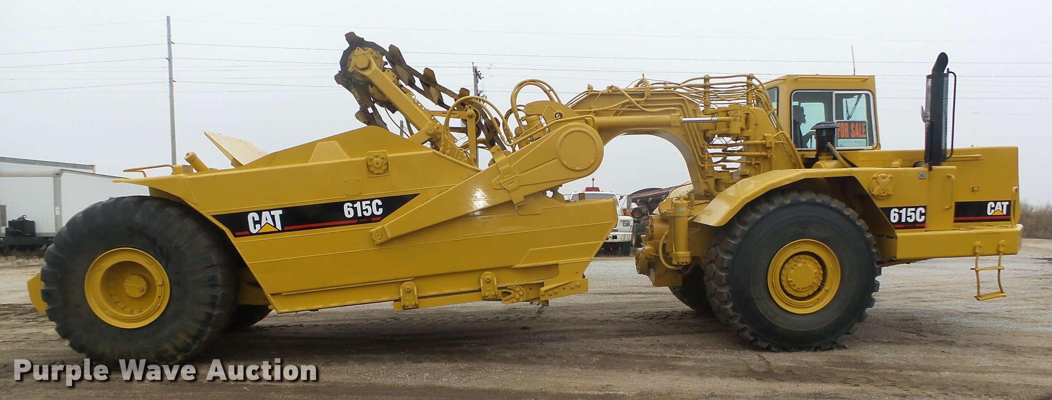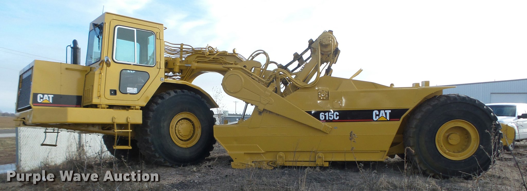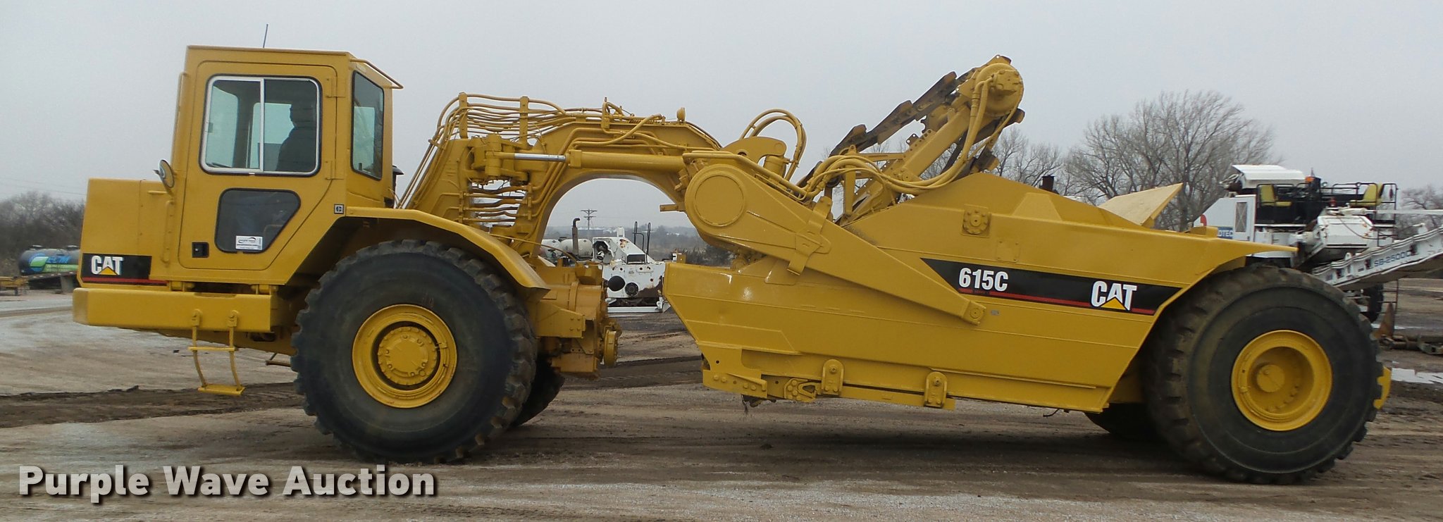 Purple Wave is selling a used Elevating Scraper in Nebraska. This item is a Caterpillar 615C Series I elevating scraper with the following: 3,691 hours on meter, Caterpillar 3306 six cylinder diesel engine, Serial 08Z51771, Powershift transmission, 6F-1R, Serial 4WAD1353, Arrangement No. 8P7900, Differential lock, Enclosed cab, AC and heat, AM/FM/cassette, 103"W I.D. bowl, 78"W paddle, Rear pin hitch, 29.5R25 tires, Serial 5TF00242