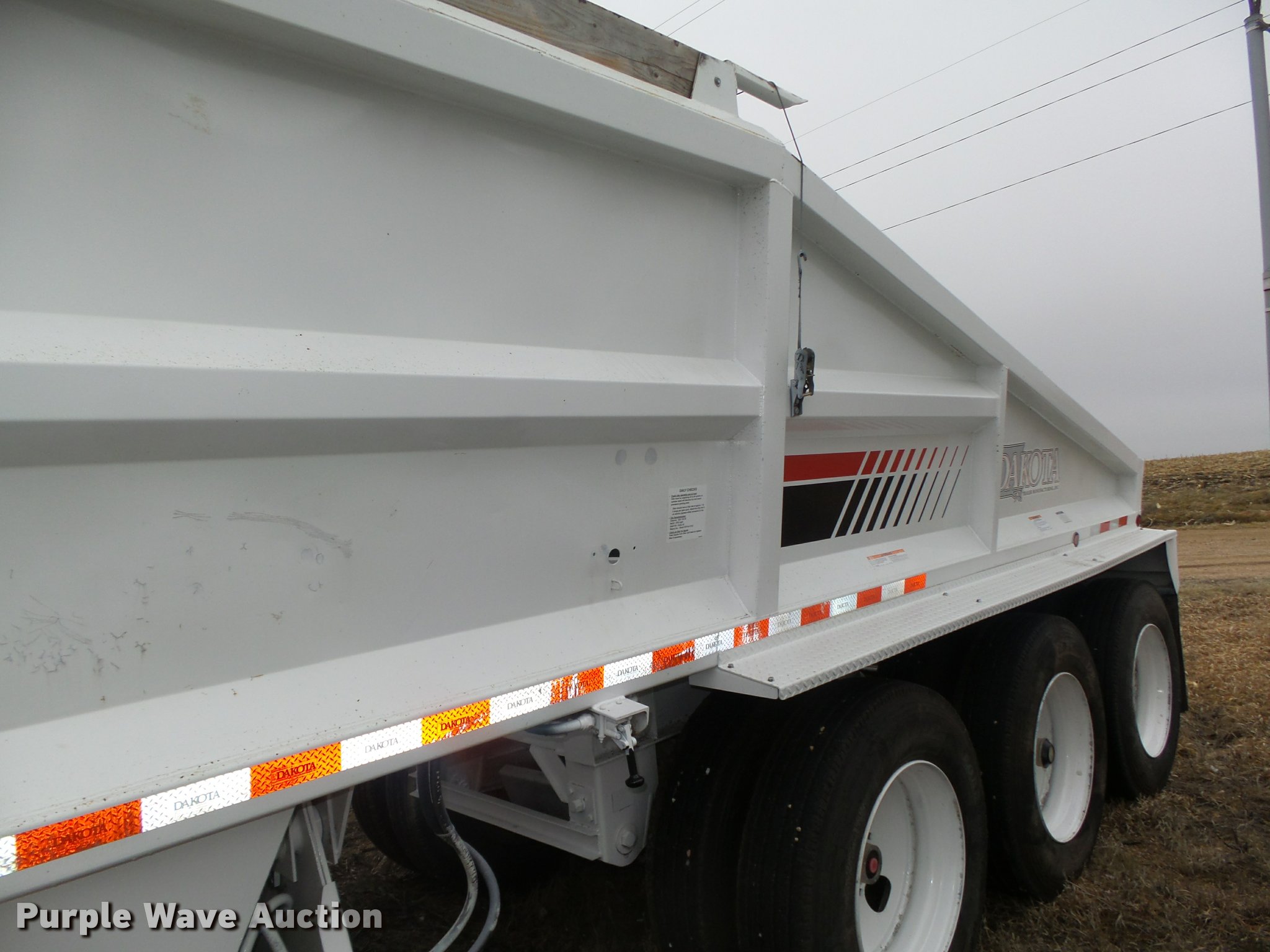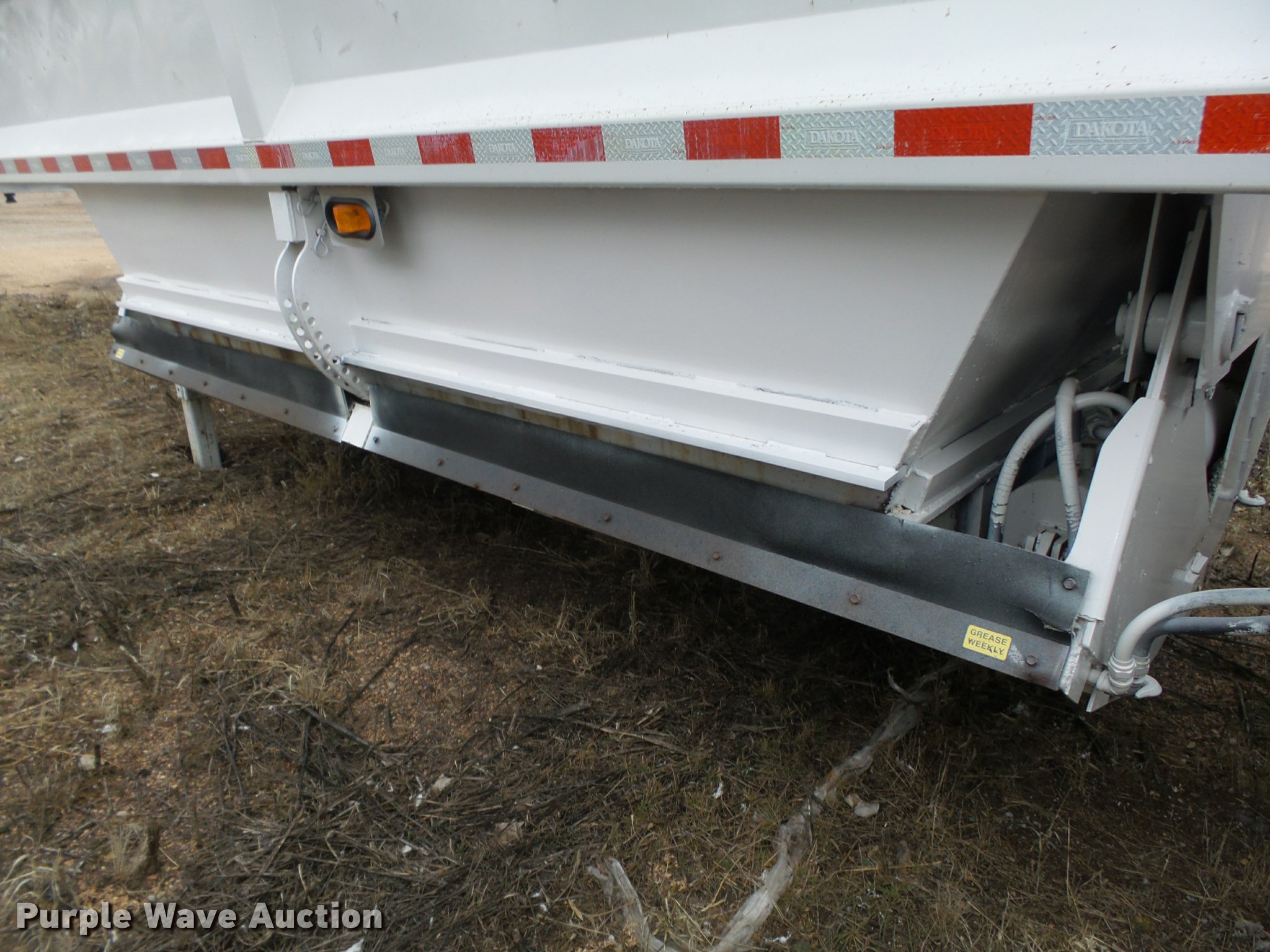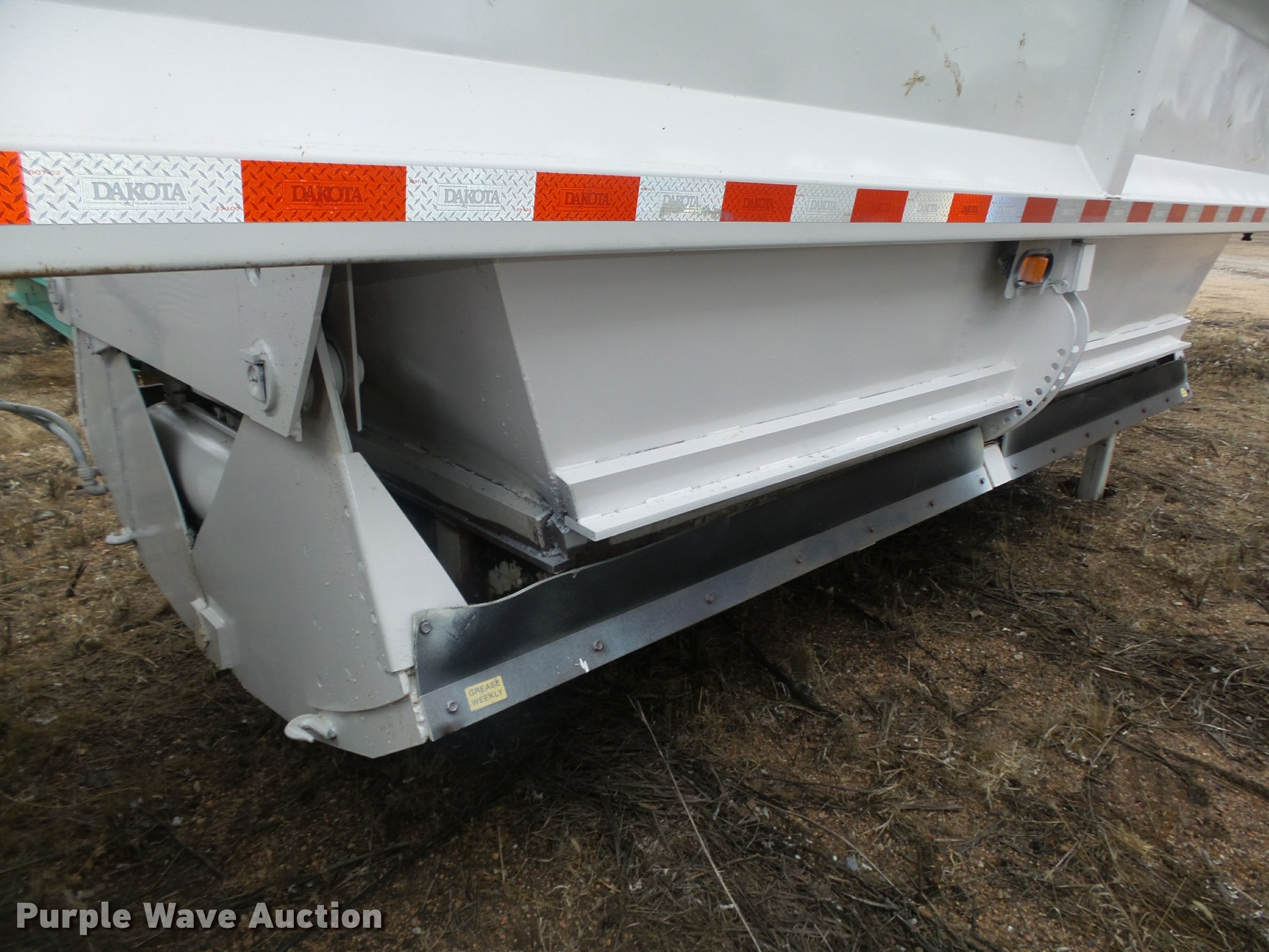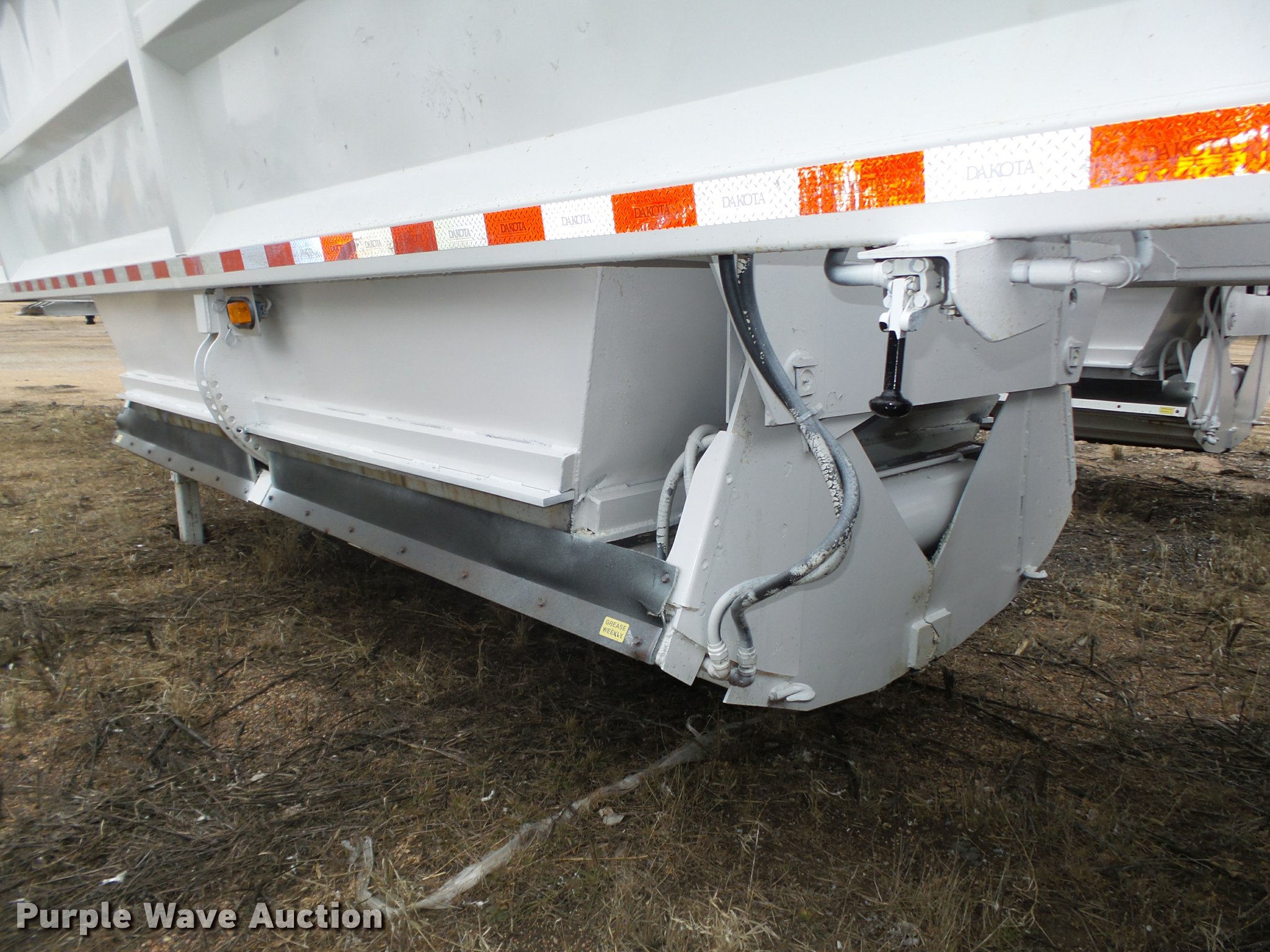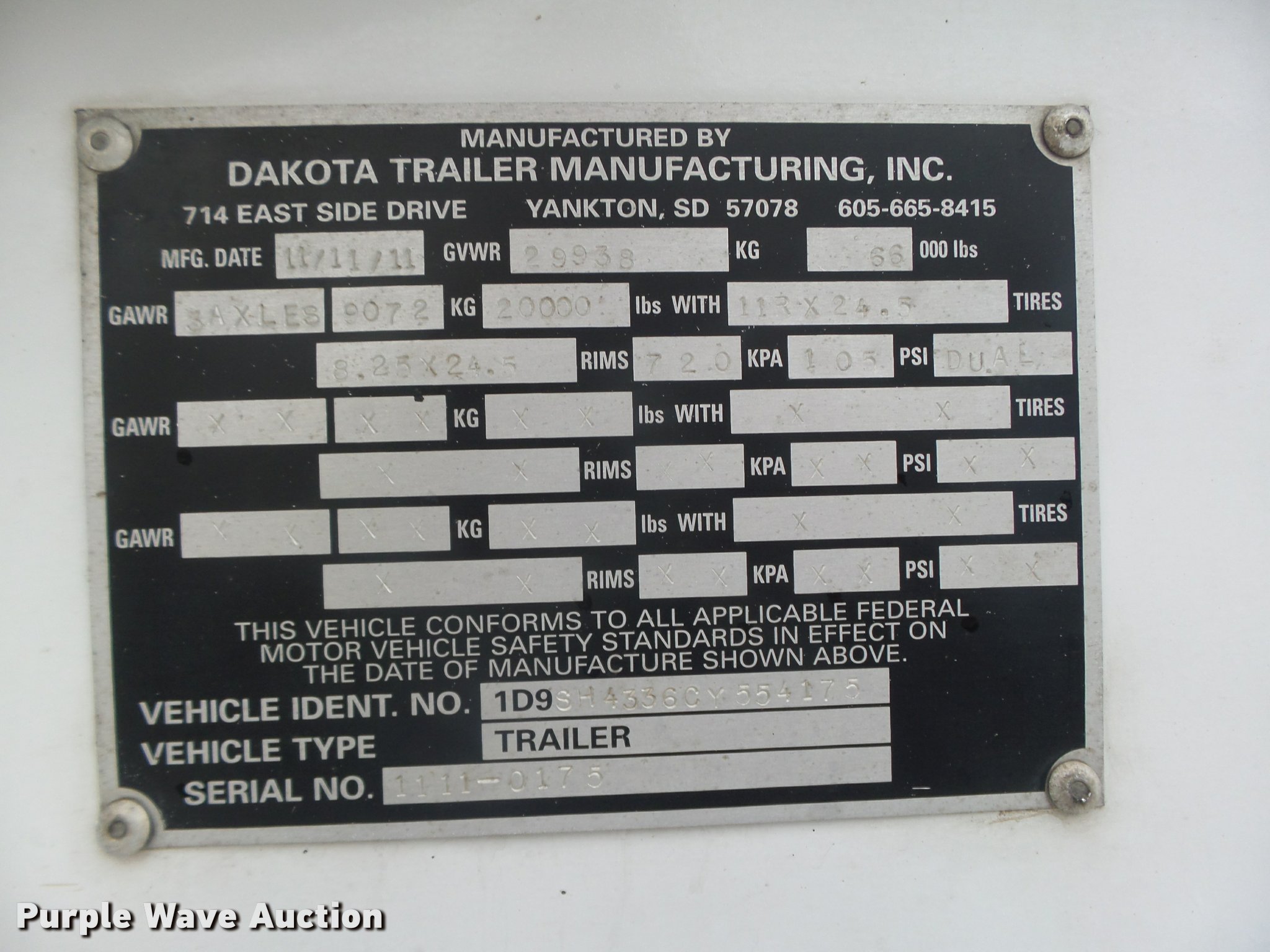 Purple Wave is selling a used Bottom Dump Trailer in Nebraska. This item is a 2012 Dakota 4300BDT bottom dump trailer with the following: 45' overall length, 43'L x 96"W, 2" x 6" side boards, Dual hydraulic cylinders, Air operated clamshell gate, Manual tarp, Rear push block, Trailer controls, Dual leg landing gear, Fifth wheel plate, Triple axle, Four pin and seven pin trailer wiring, Gladhand connectors, Air suspension, Air brakes, Steel wheels, 11R24.5 tires, GVWR 66,000 lbs, GAWR 20,000 lbs, Serial 1111-0175, Unit# 246