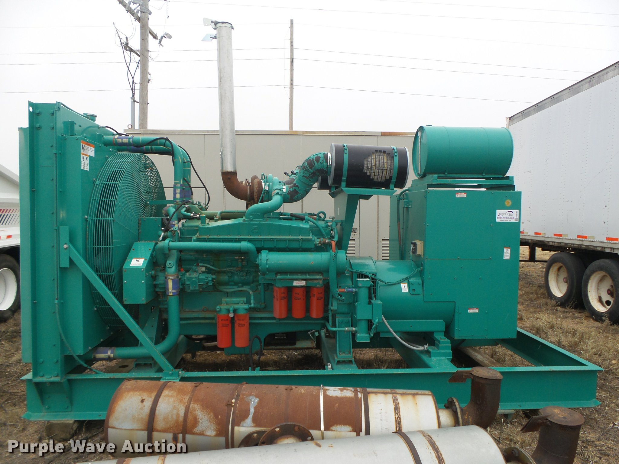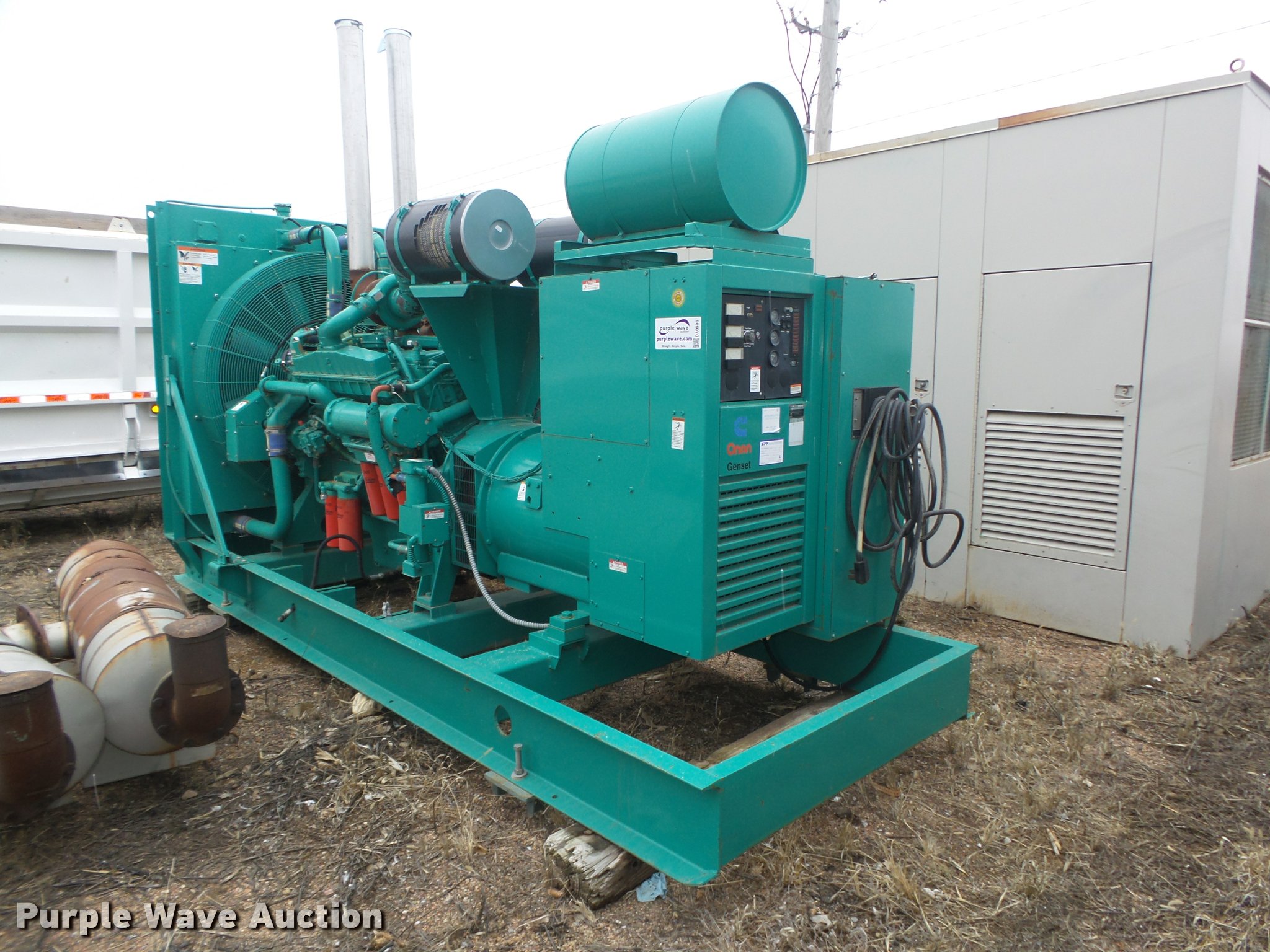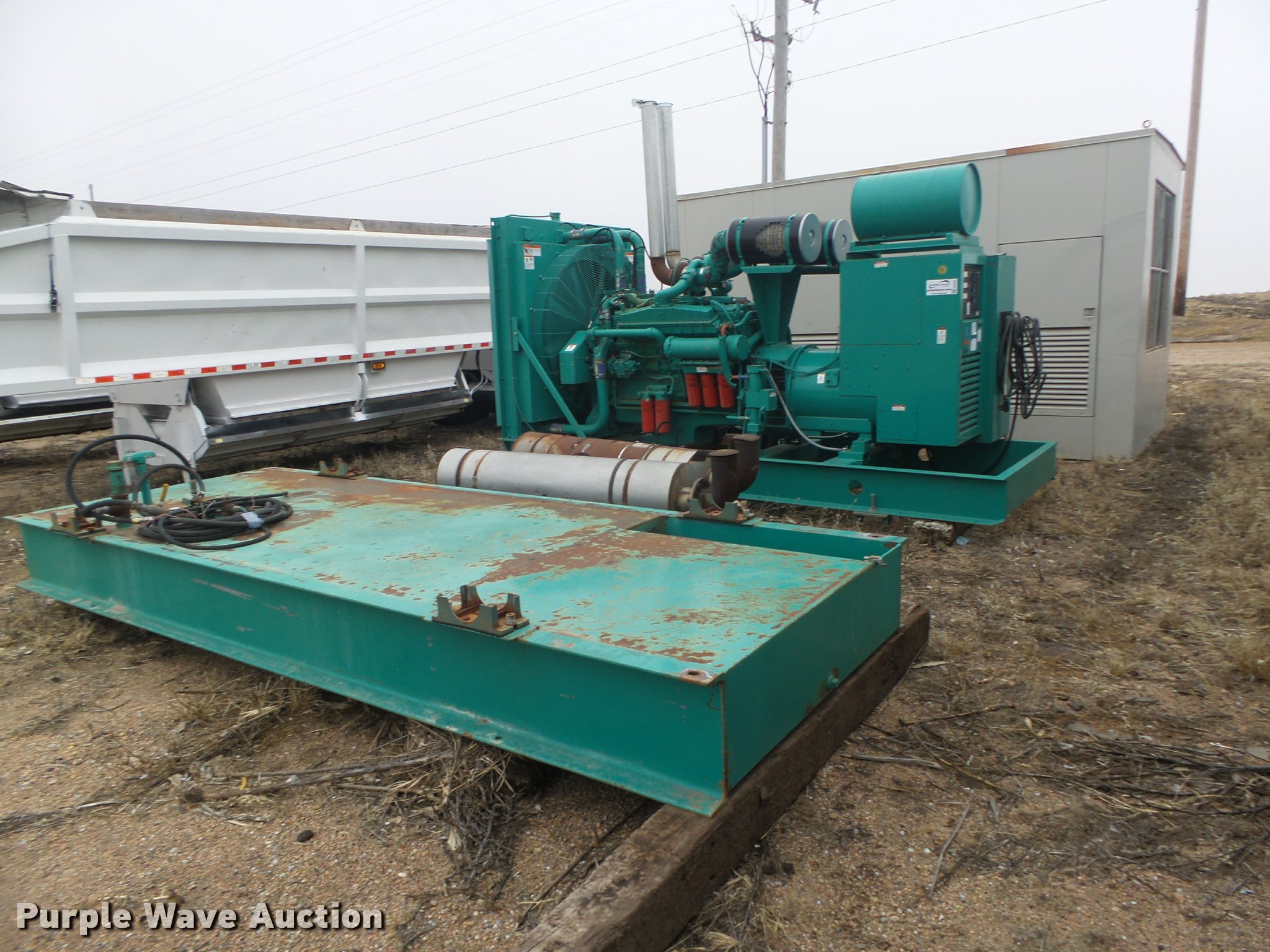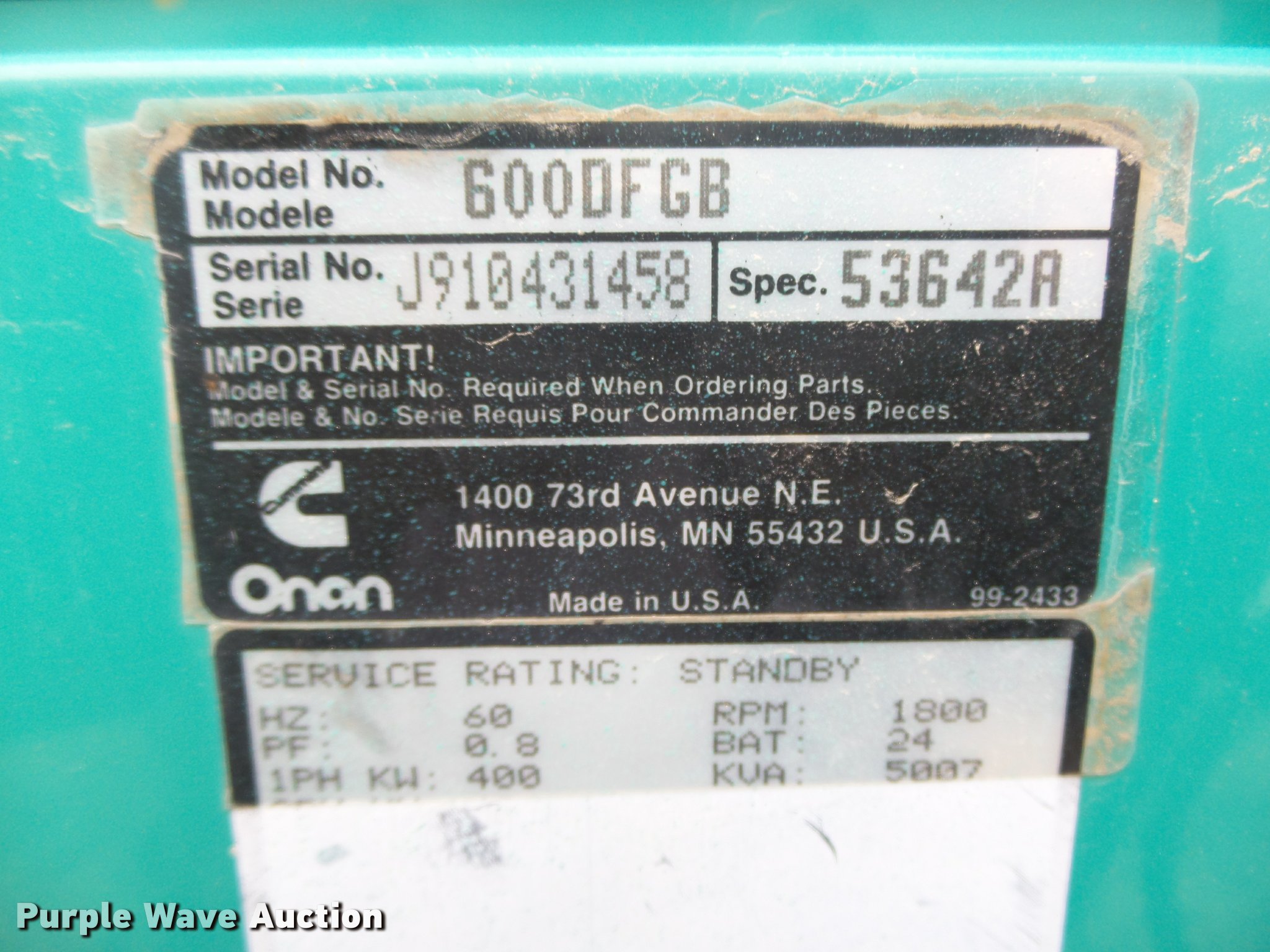 Purple Wave is selling a used Generator Set in Nebraska. This item is a 1991 Cummings Onan 600DFGB generator set with the following: 597 hours on meter, Cummins VTA28G2 eight cylinder turbo diesel engine, 900 HP, Serial 25180247, Onan generator, Control panel, Electric start, Integrated Lowe fuel tank removed but included, 14' 1 1/2"L x 5'3"W O.D., Fuel hose, Piping, 600 kW, Single and three phase, 14'2"L x 72"W x 90"H O.D. main unit, Removable exhaust stack, Approximately 200"L x 102"W x 118"H O.D. enclosure, Side and end doors, Vents, 600V 8AWG SE00W/SCE electrical cord, Four prong adapter, Serial J910431458