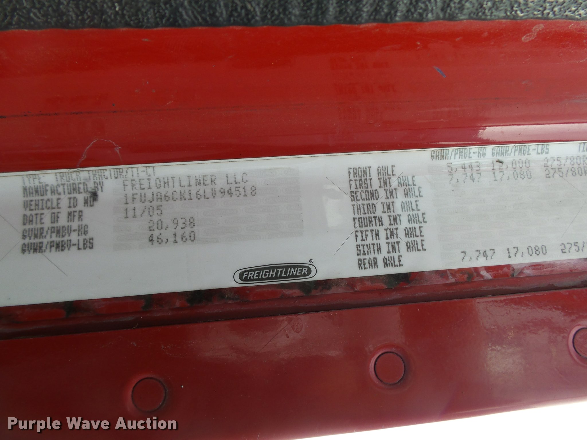 Purple Wave is selling a used Truck Tractor in Nebraska. This item is a 2006 Freightliner Columbia semi truck with the following: 799,467 miles on odometer, Detroit Diesel Series 60 14.0L L6 turbo diesel engine, Smart Shift automatic transmission, Tandem axle, Inter-axle differential lock, AC and heat, Tilt, Telescoping steering wheel, Cruise, AM/FM/CD, Power and heated mirrors, Air suspension seats, Air ride cab, Exterior visor, Single rear exhaust stack, Aluminum deck plate, Sliding fifth wheel plate, Dual fuel tanks, Quarter fenders, Mud flaps, Air suspension, Air brakes, 172" wheelbase, Steel inner wheels, Aluminum outer wheels, 295/75R22.5 tires, GVWR 46,160 lbs, FAWR 12,000 lbs, IAWR 17,080 lbs, RAWR 17,080 lbs, Unit# 52