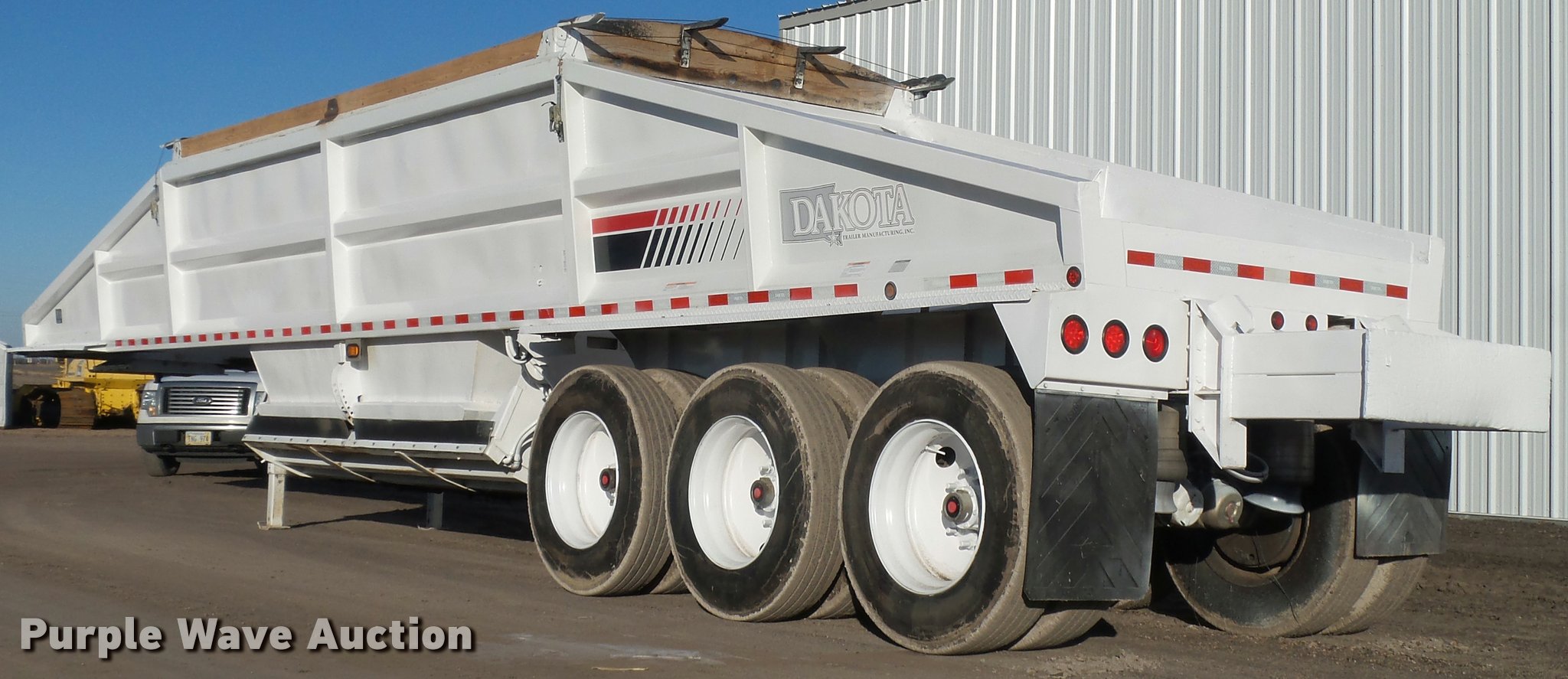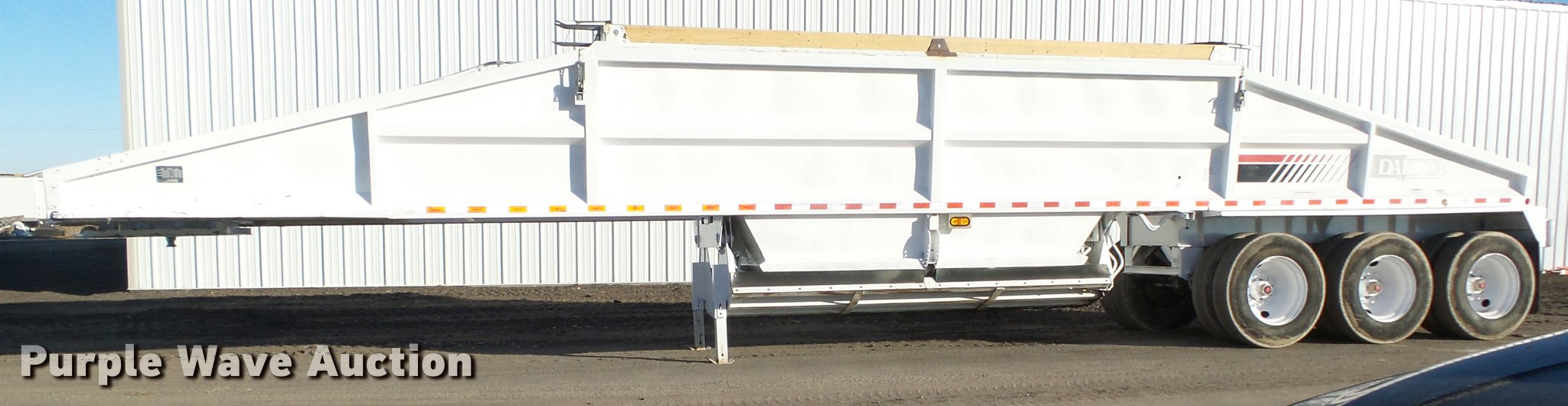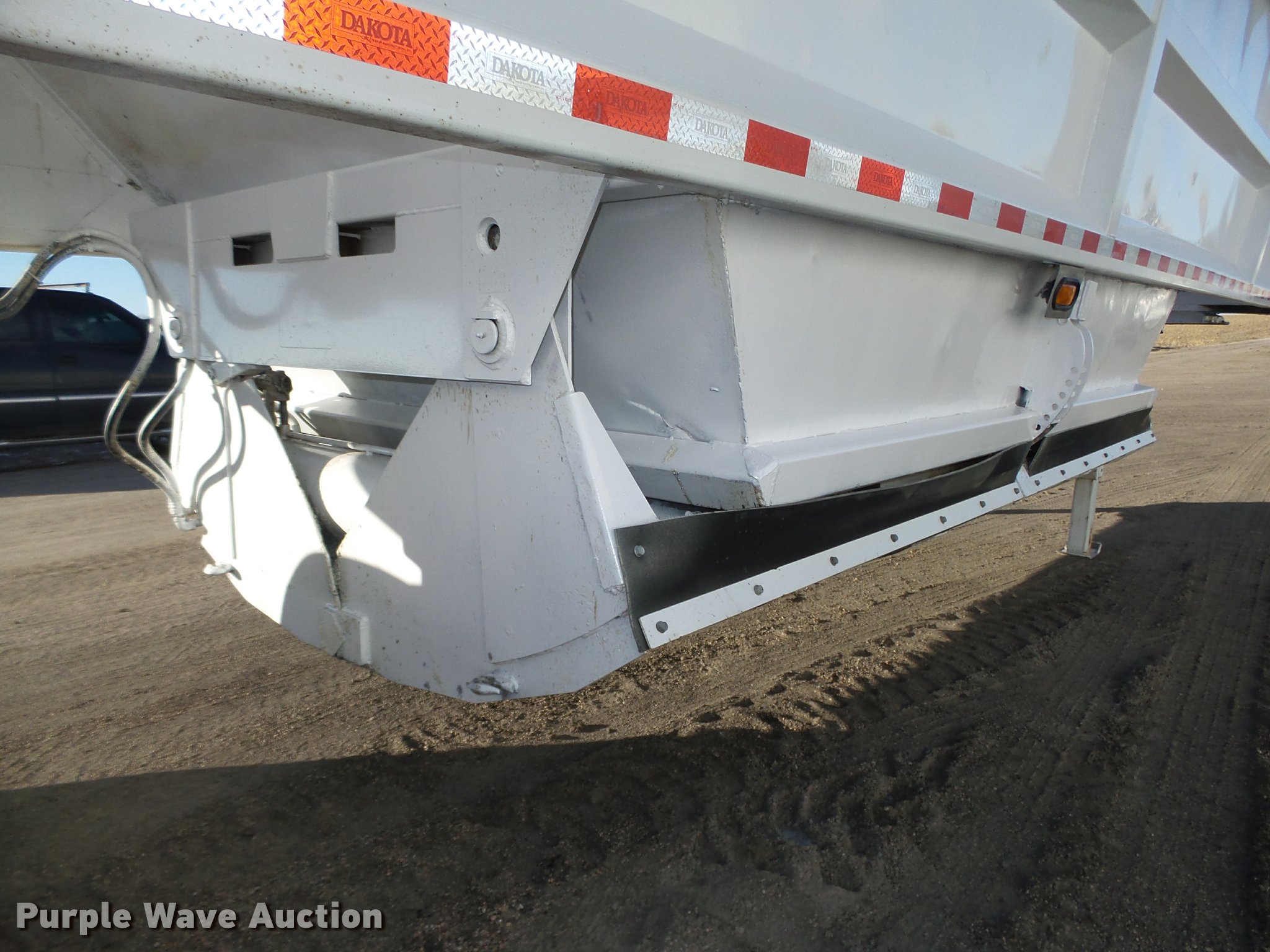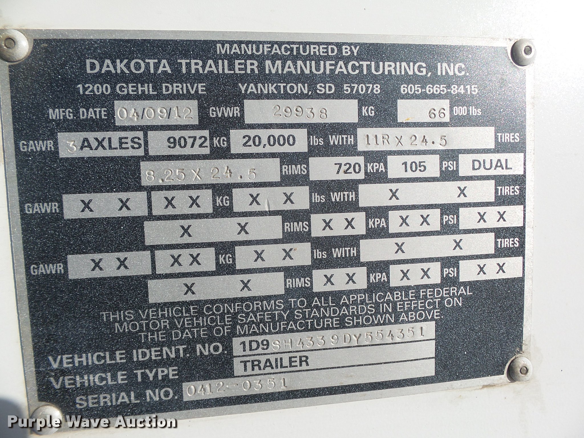 Purple Wave is selling a used Bottom Dump Trailer in Nebraska. This item is a 2013 Dakota 4300BDT bottom dump trailer with the following: 45'L x 96"W overall, 43'L body, Dual hydraulic cylinders, Air operated clamshell gate, Rear push block, Manual tarp, 2" x 6" side boards, Steel construction, Fifth wheel plate, Dual leg landing gear, Air brakes, Air suspension, Triple axle, Steel wheels, 11R24.5 tires, GVWR 66,000 lbs, GAWR 20,000 lbs, Serial 0412-0351, Unit# 250
