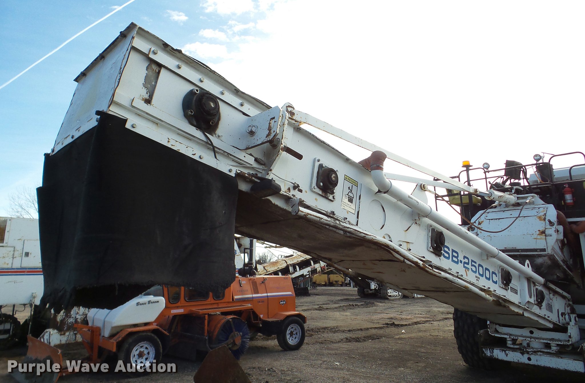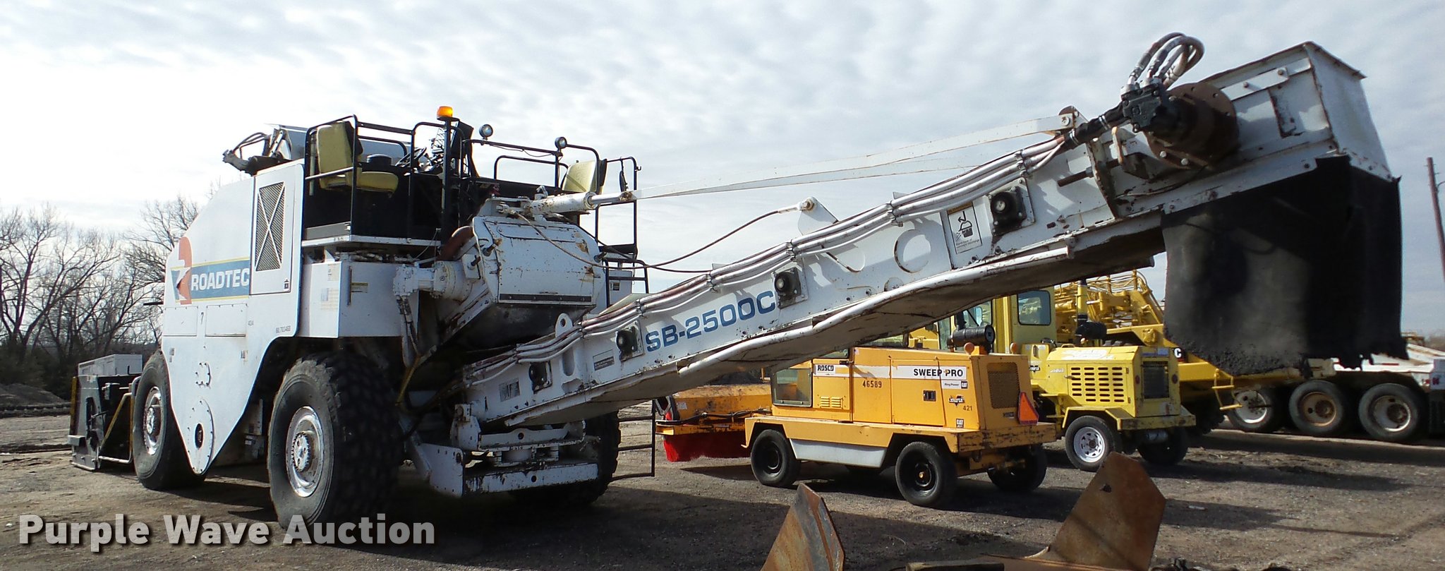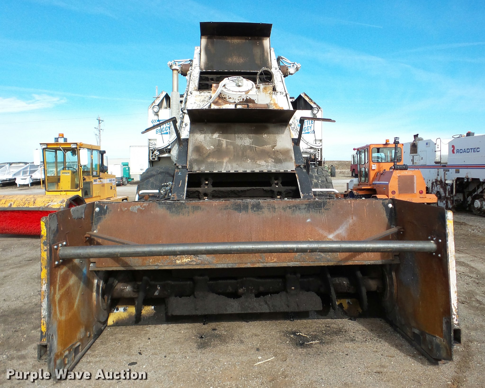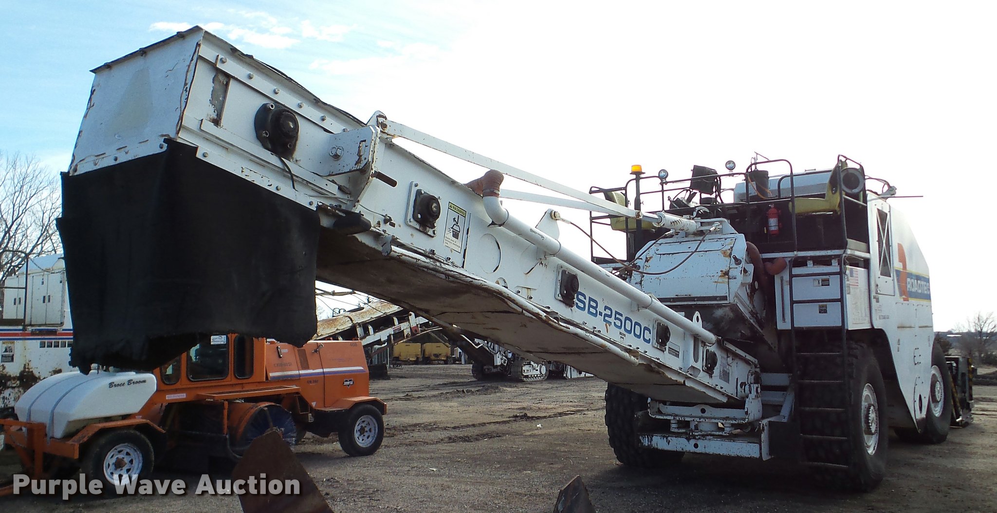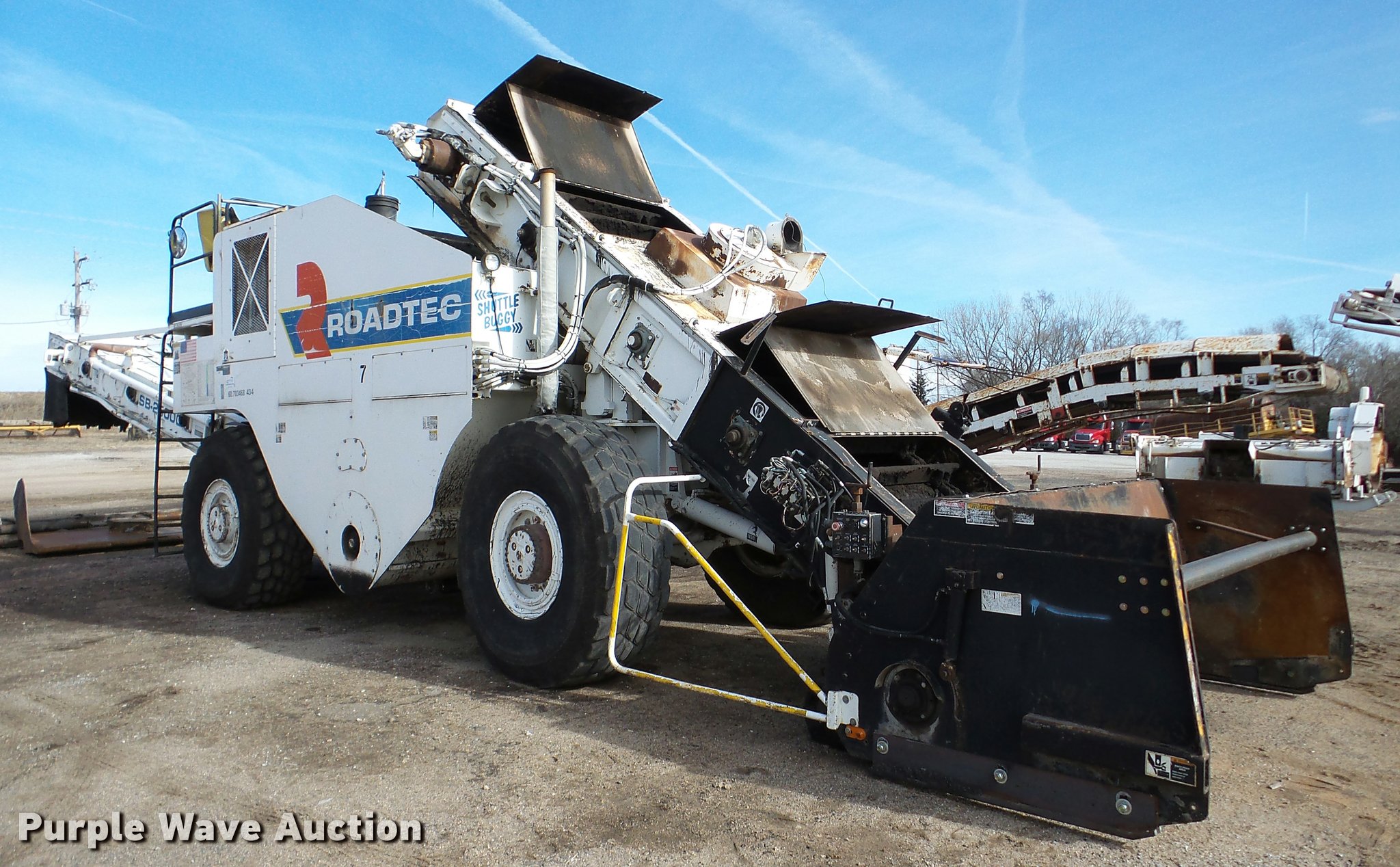 Purple Wave is selling a used Planer or Milling Machine in Nebraska. This item is a 2002 Roadtec SB2500C Shuttle Buggy material transfer vehicle with the following: 6,341 hours on meter, Six cylinder turbo diesel engine, Hydrostatic transmission, Operator station, 55' overall length, Approximately 112" overall width, Approximately 14' overall height, 25'L x 31"W conveyor, 9'L x 9'8"W x 9'D hopper, Windrow pickup attachment, Bridgestone 21.00R25 tires, Unit# 434