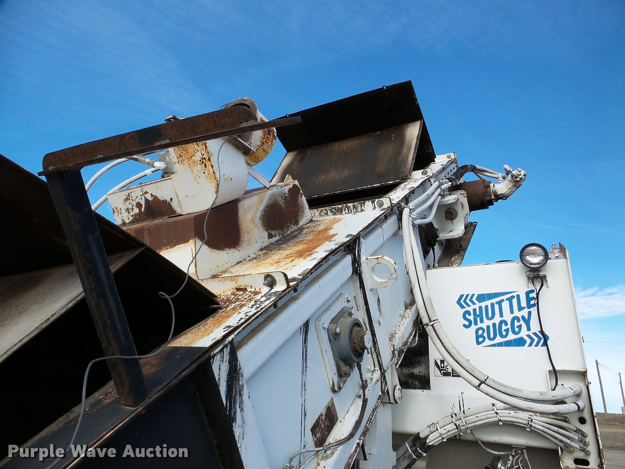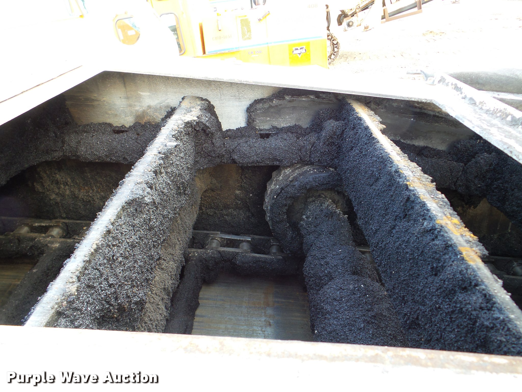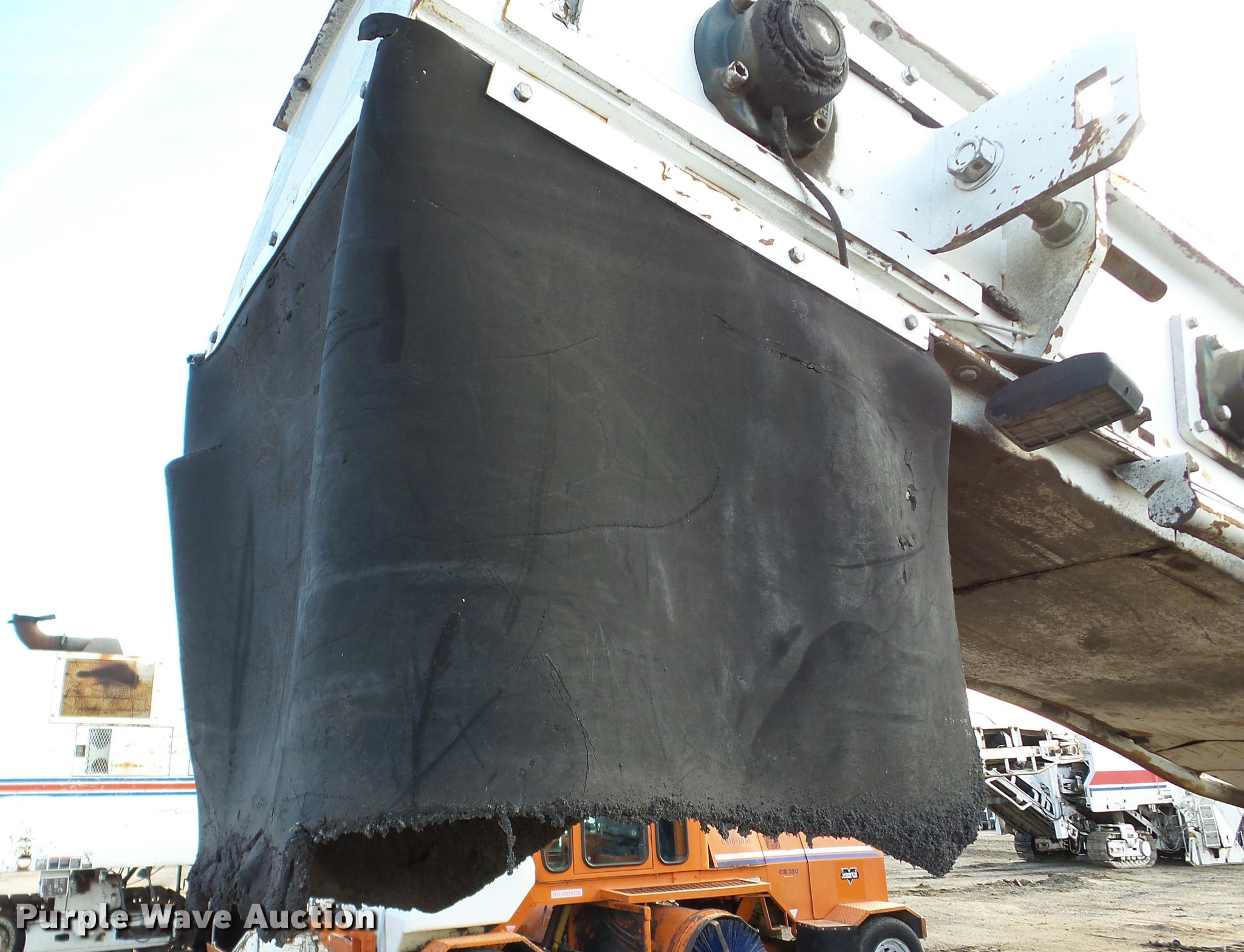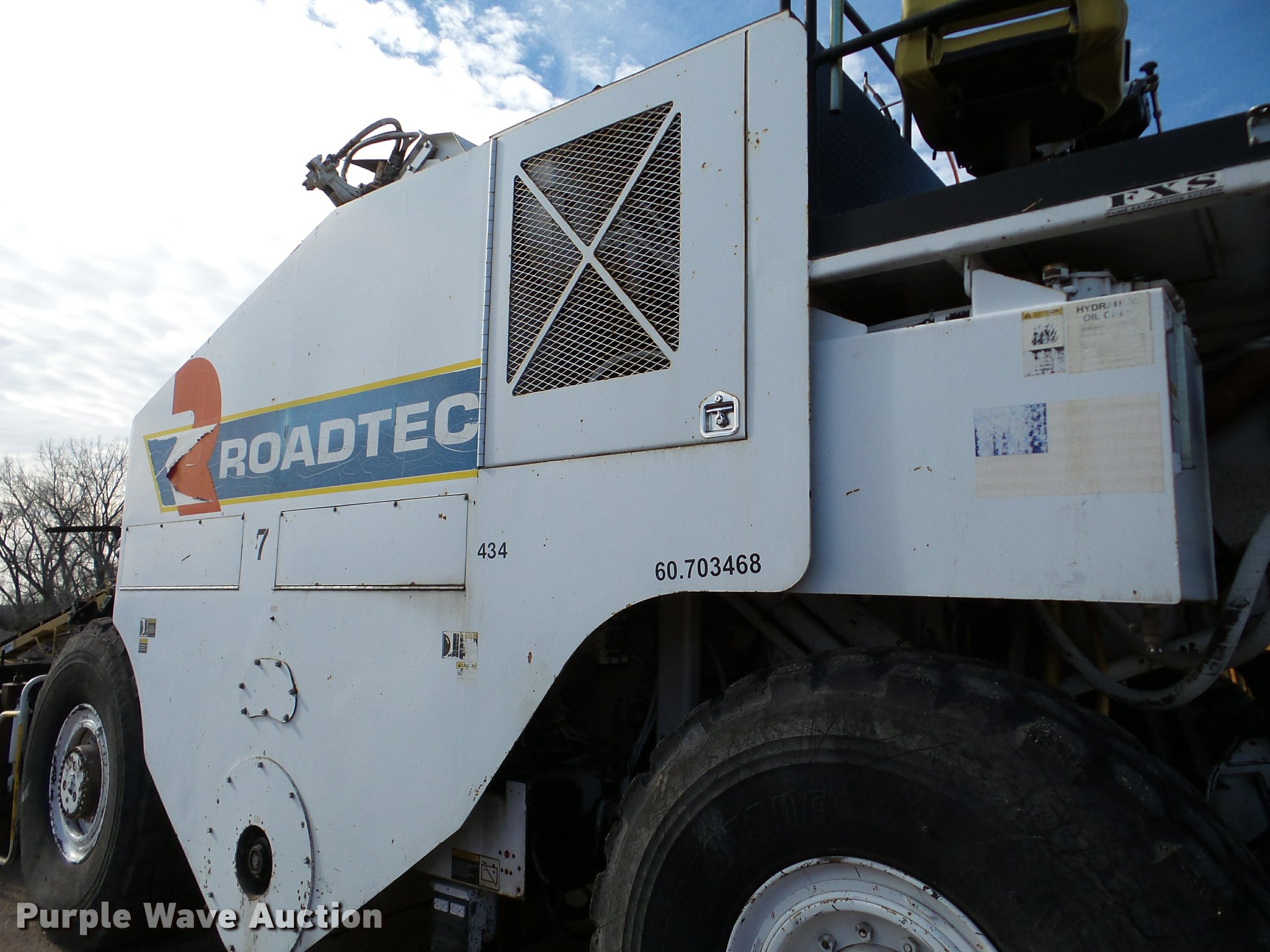 Purple Wave is selling a used Planer or Milling Machine in Nebraska. This item is a 2002 Roadtec SB2500C Shuttle Buggy material transfer vehicle with the following: 6,341 hours on meter, Six cylinder turbo diesel engine, Hydrostatic transmission, Operator station, 55' overall length, Approximately 112" overall width, Approximately 14' overall height, 25'L x 31"W conveyor, 9'L x 9'8"W x 9'D hopper, Windrow pickup attachment, Bridgestone 21.00R25 tires, Unit# 434