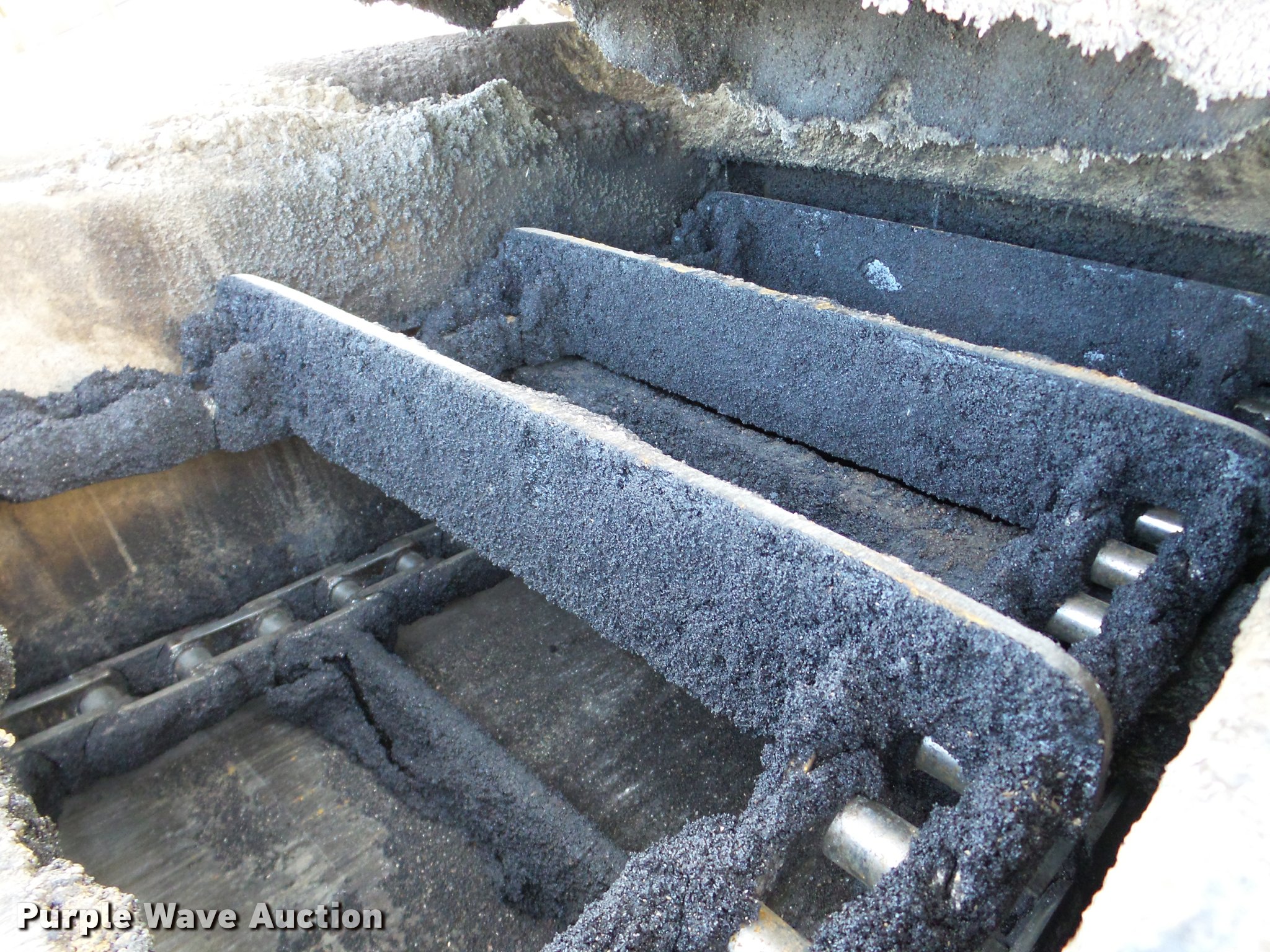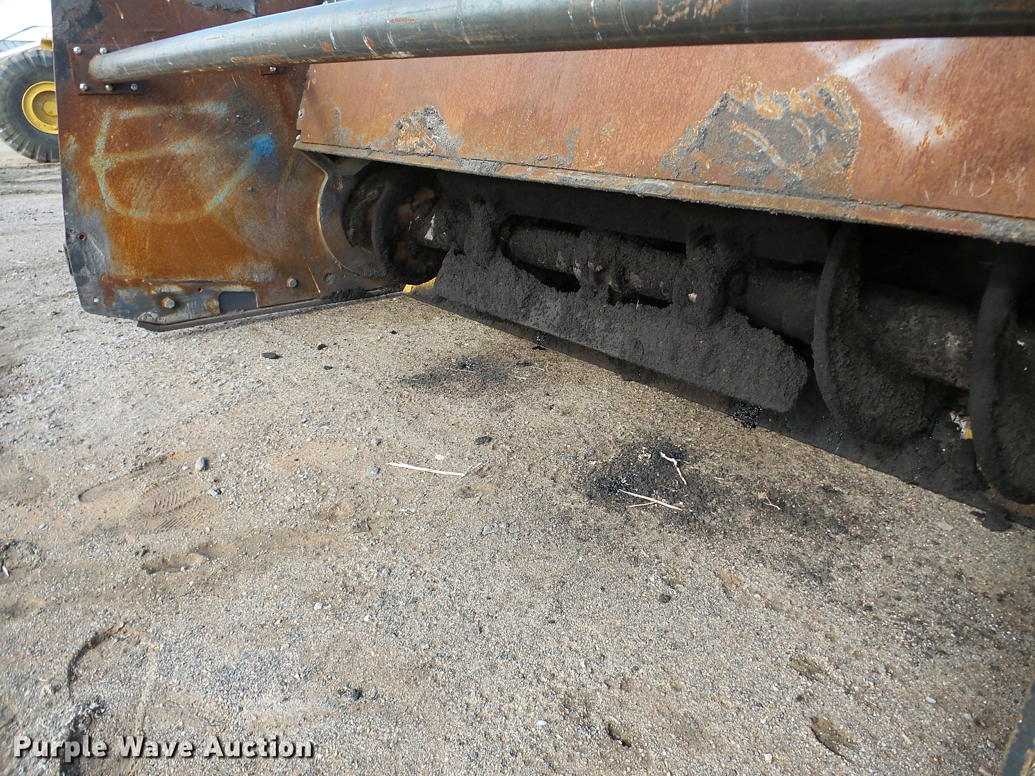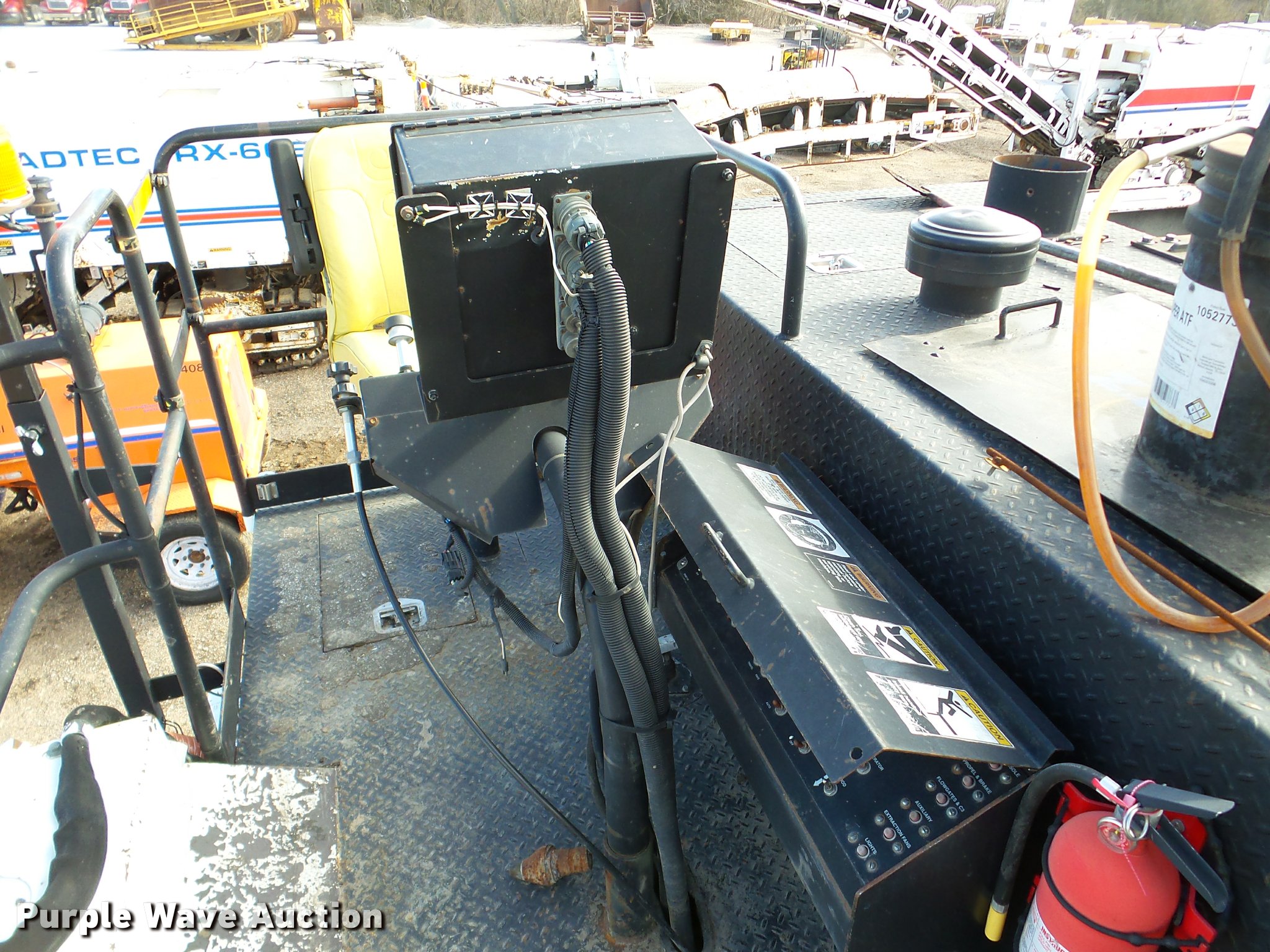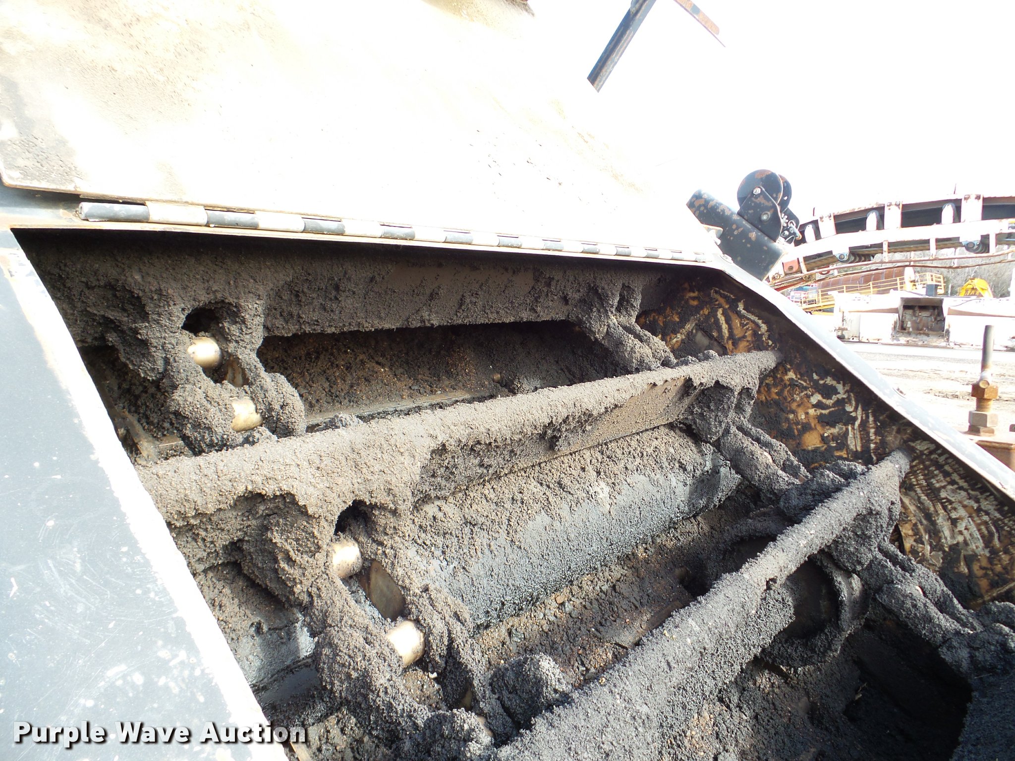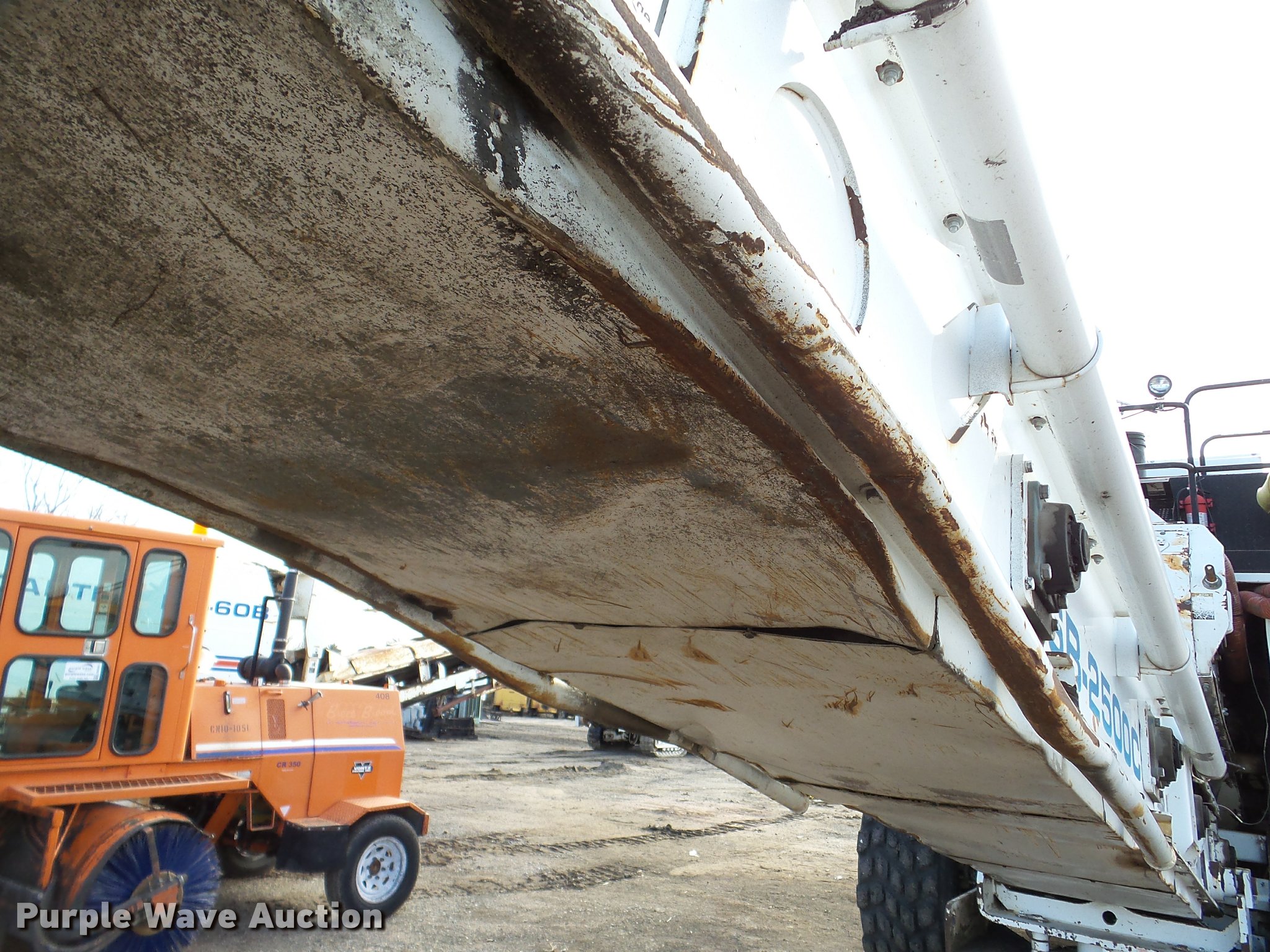Purple Wave is selling a used Planer or Milling Machine in Nebraska. This item is a 2002 Roadtec SB2500C Shuttle Buggy material transfer vehicle with the following: 6,341 hours on meter, Six cylinder turbo diesel engine, Hydrostatic transmission, Operator station, 55' overall length, Approximately 112" overall width, Approximately 14' overall height, 25'L x 31"W conveyor, 9'L x 9'8"W x 9'D hopper, Windrow pickup attachment, Bridgestone 21.00R25 tires, Unit# 434