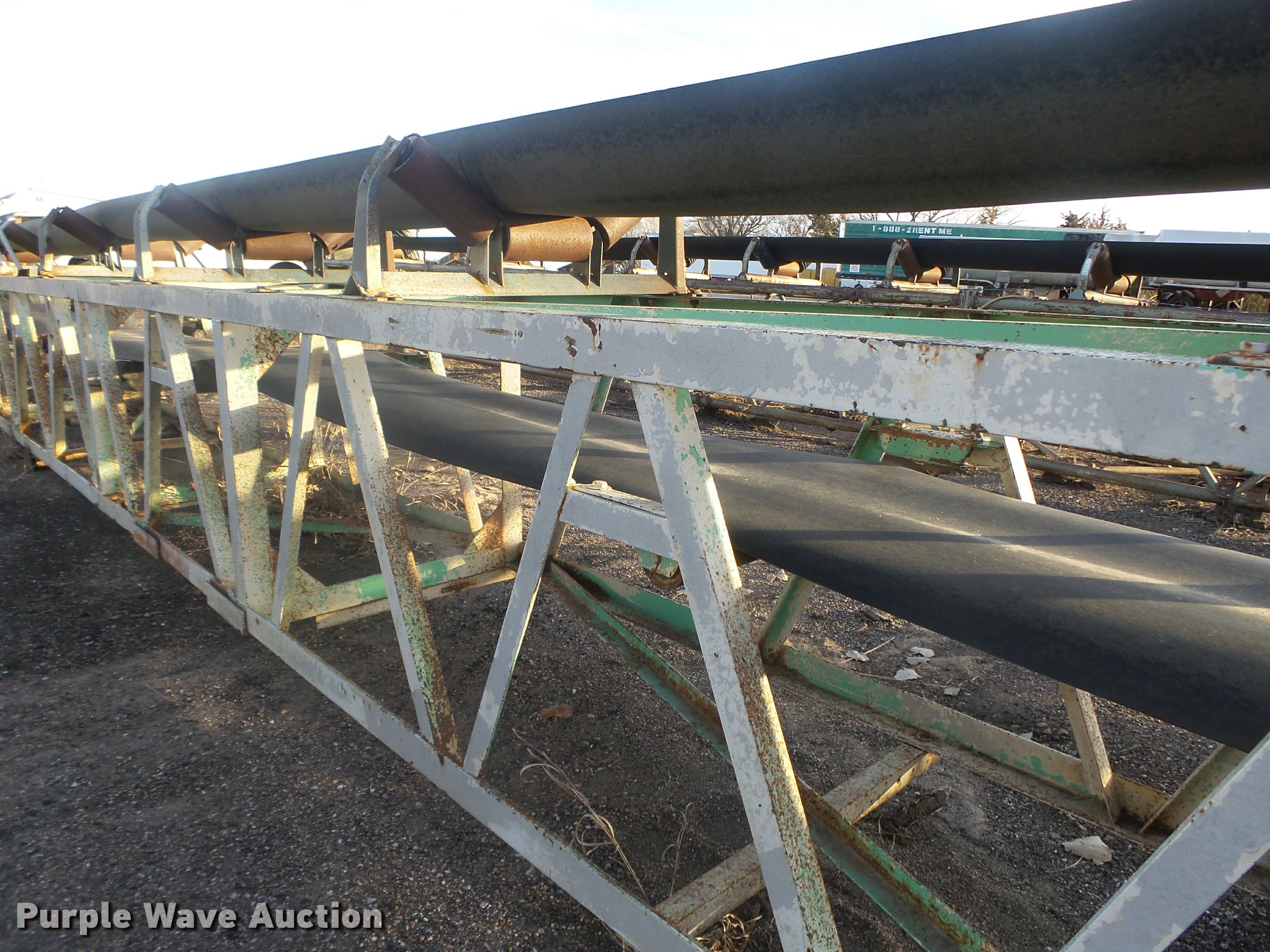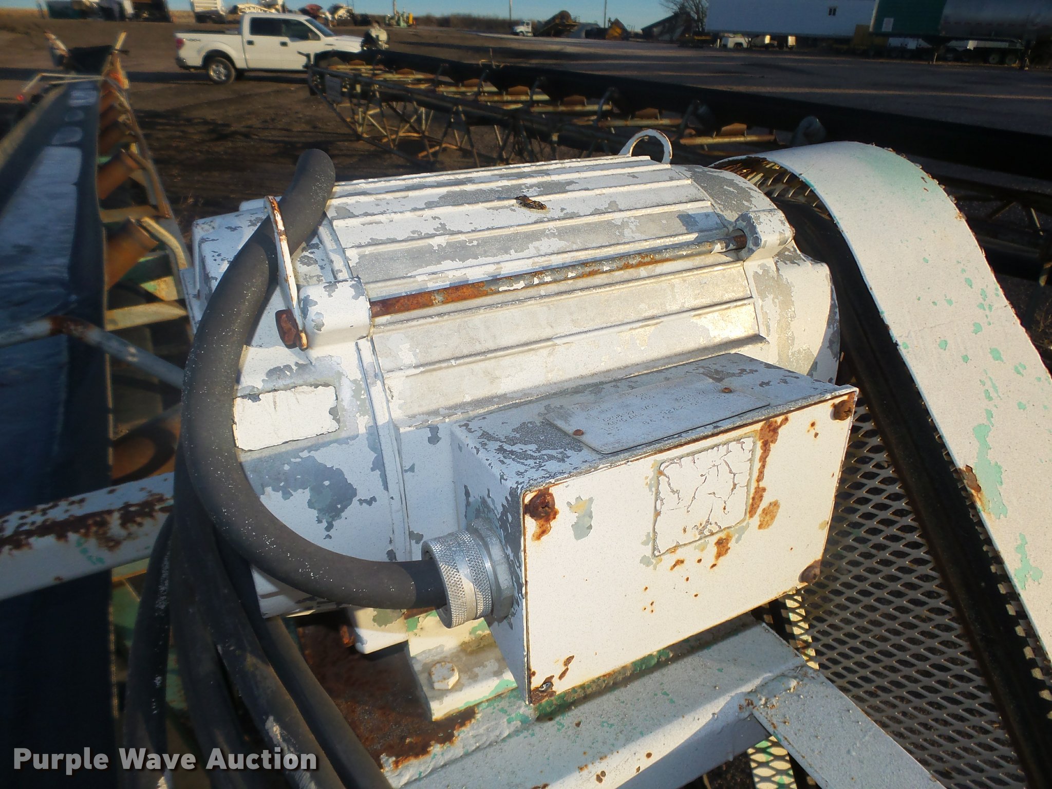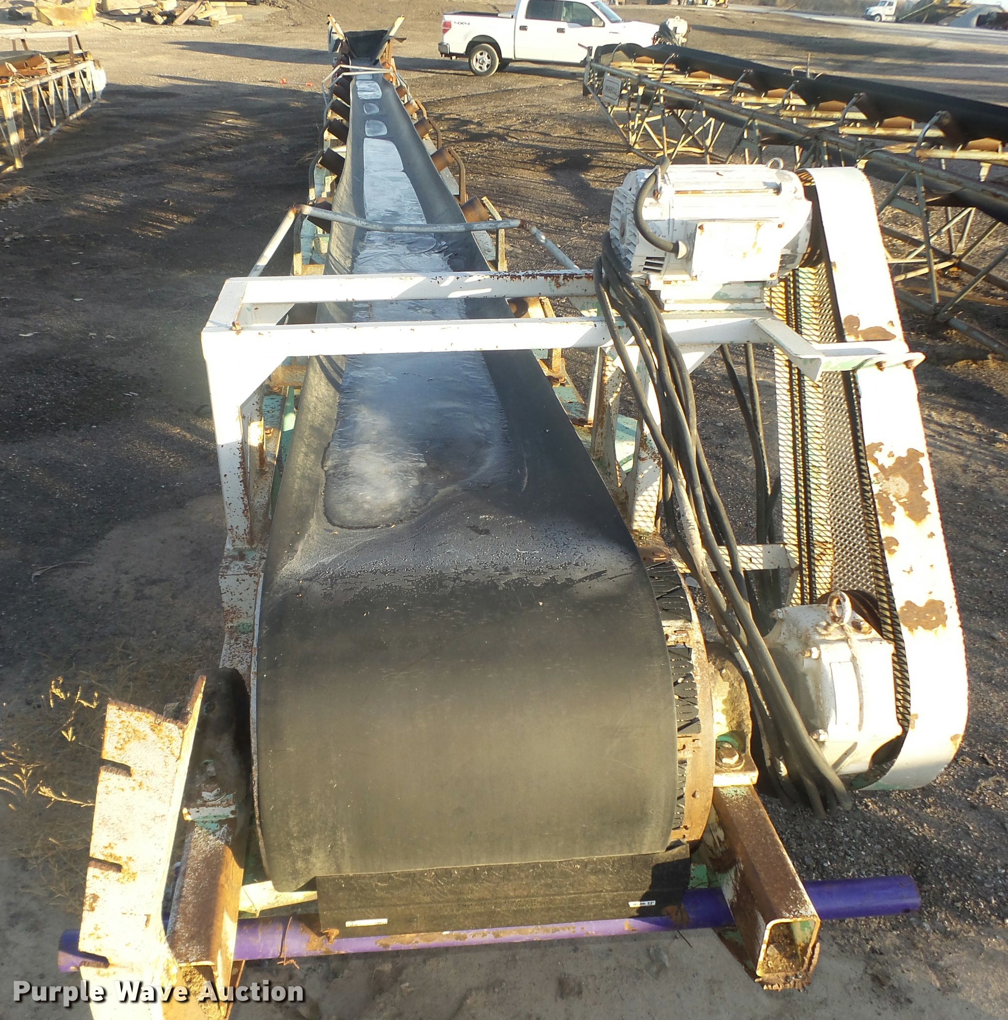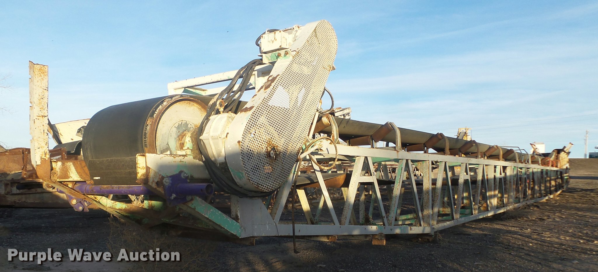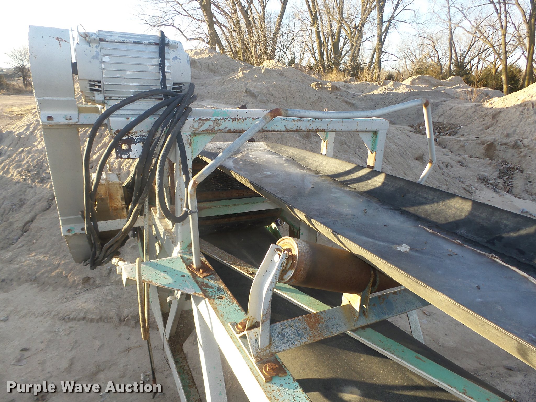 Purple Wave is selling a used Conveyor in Nebraska. This item is a Conveyor with the following: Approx. 60'L x 36"W main frame, Approx. 48"W x 72"H O.D., 23"W flat belt, V rollers, Electric motor, 21" diameter drive roller, 15" diameter bottom roller, Four wire electrical cord
