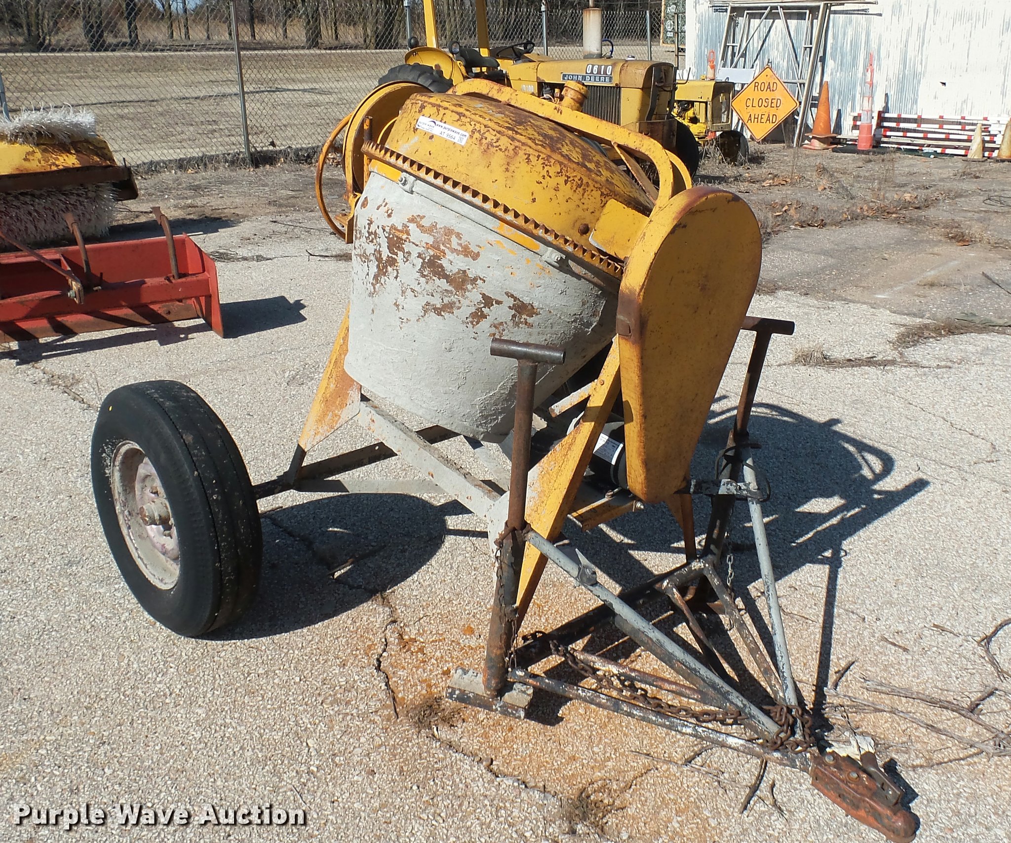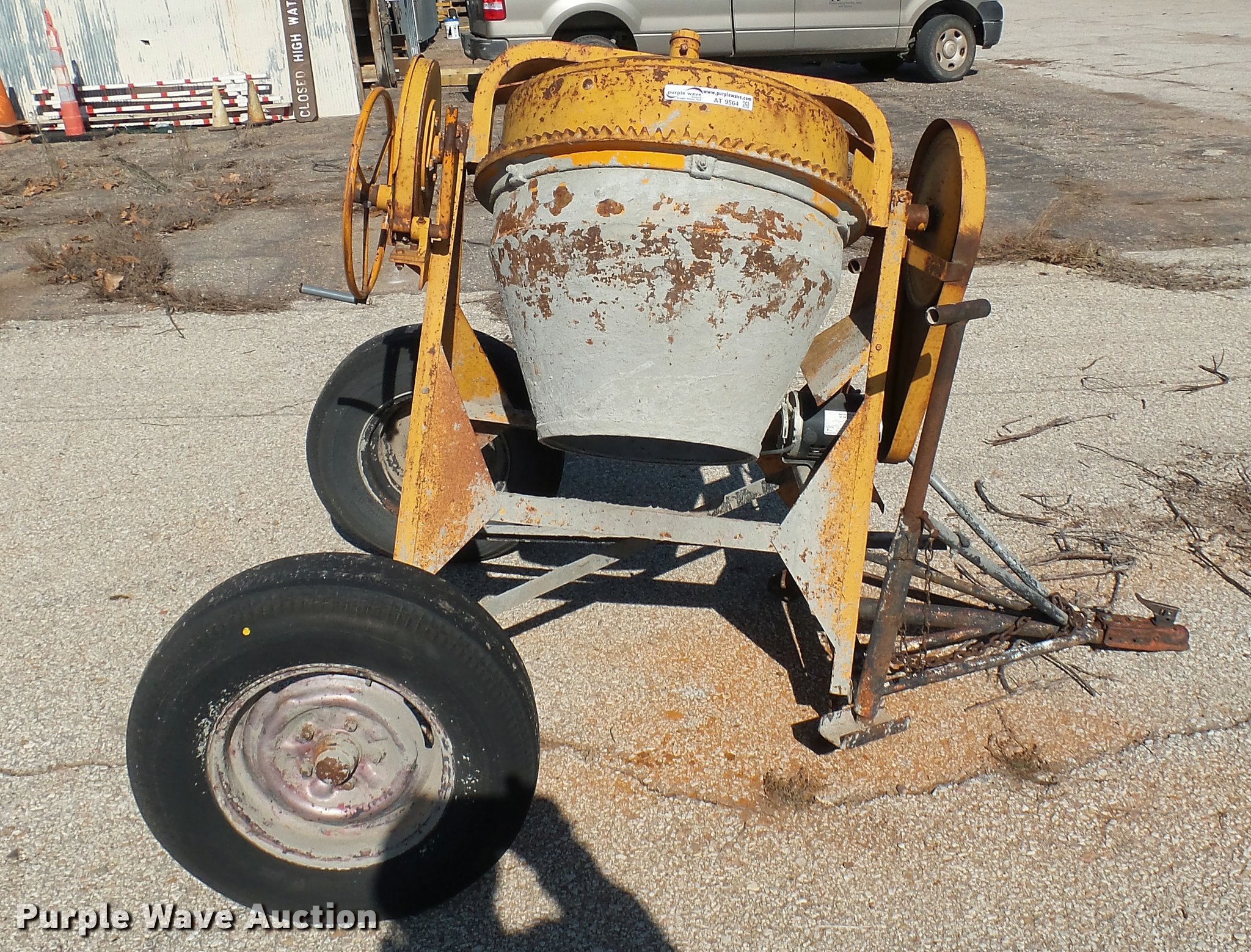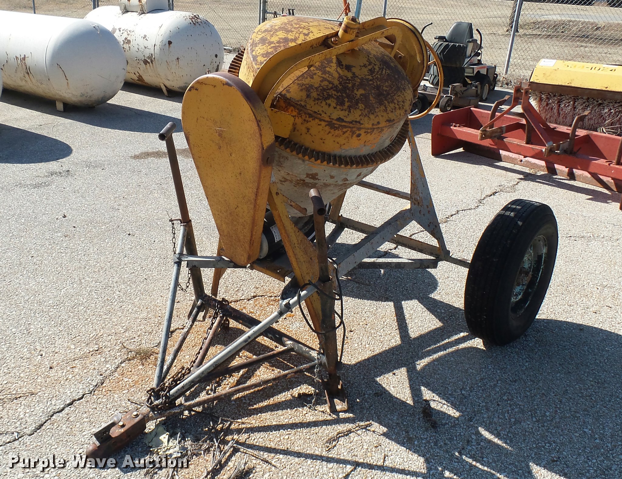 Purple Wave is selling a used Concrete Dispenser in Kansas. This item is a Cement mixer with the following: Electric motor, Manual dump, Ball hitch, Unknown operating condition