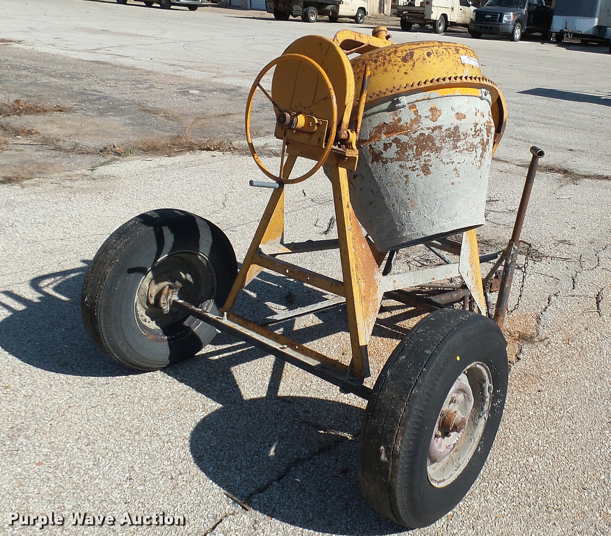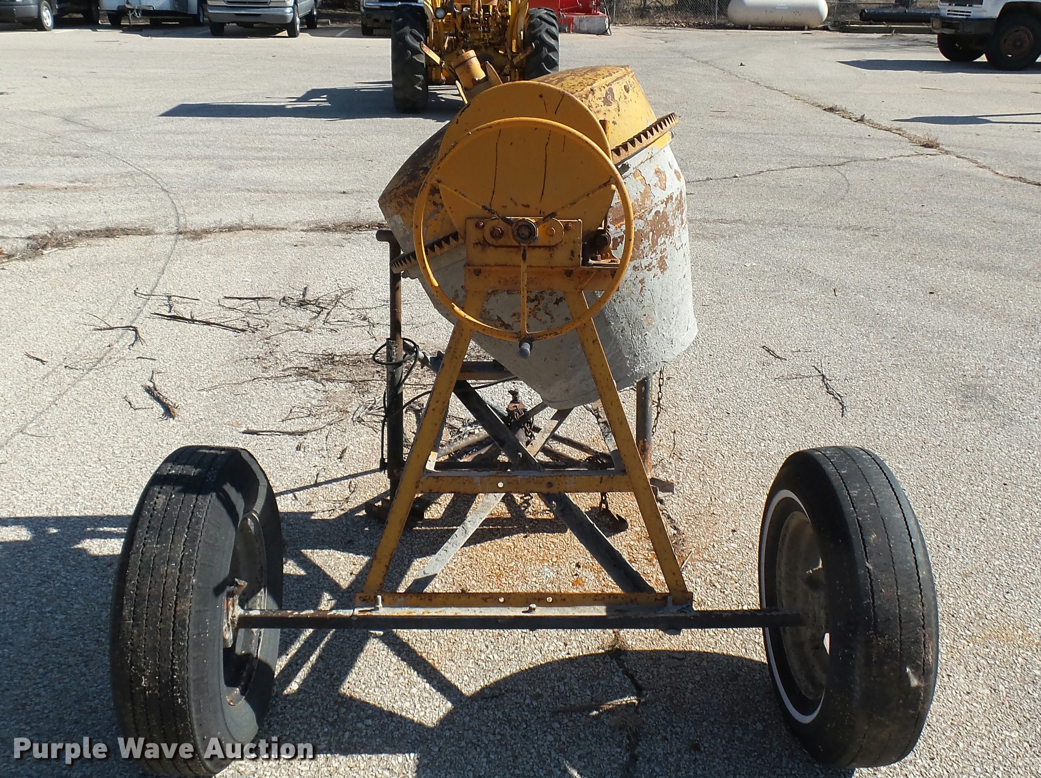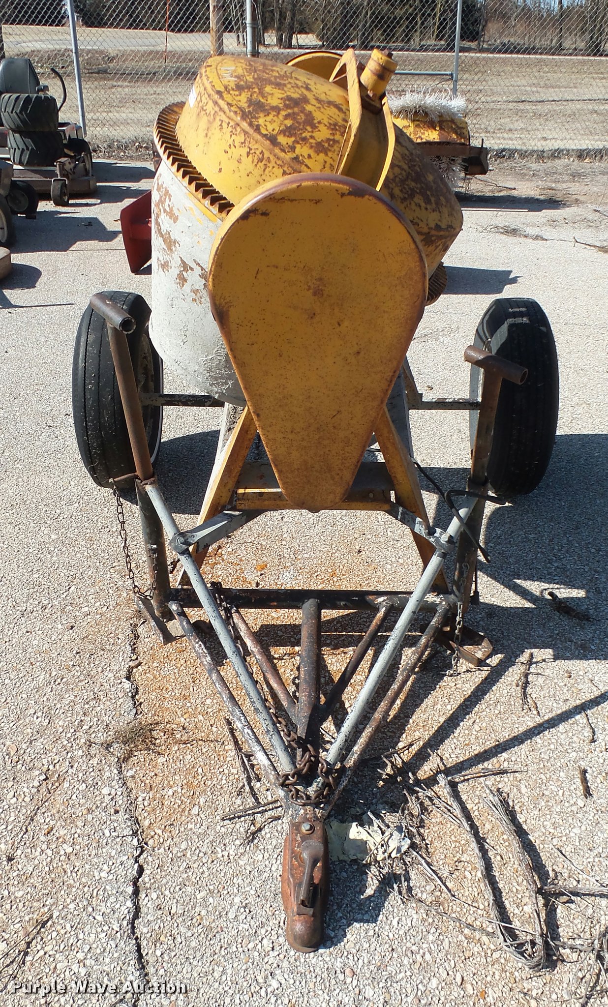 Purple Wave is selling a used Concrete Dispenser in Kansas. This item is a Cement mixer with the following: Electric motor, Manual dump, Ball hitch, Unknown operating condition