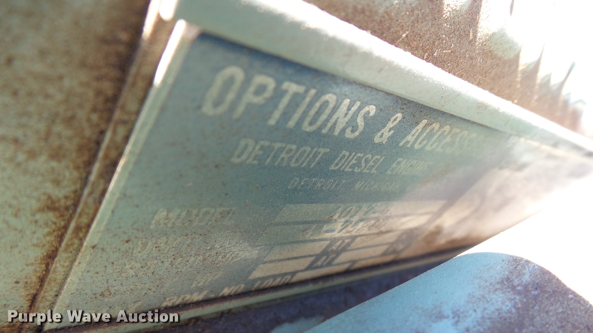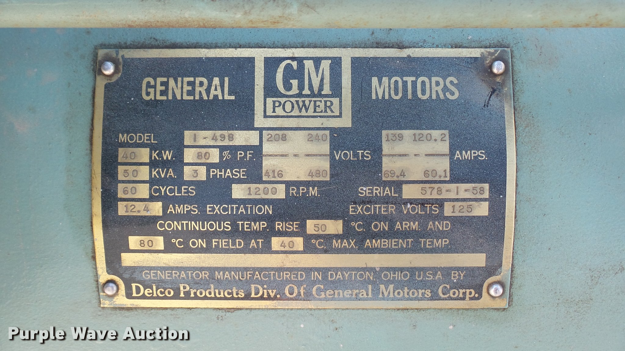 General Motors I-498 generator. 1,015 hours on meter, Detroit Diesel four cylinder diesel engine, Three phase, 40 kW, 50 kVA, 60 cycles, 1,200 RPM, Approx 90" x 35" x 50"H, Serial 578-I-58. Clearwater, KS 67026