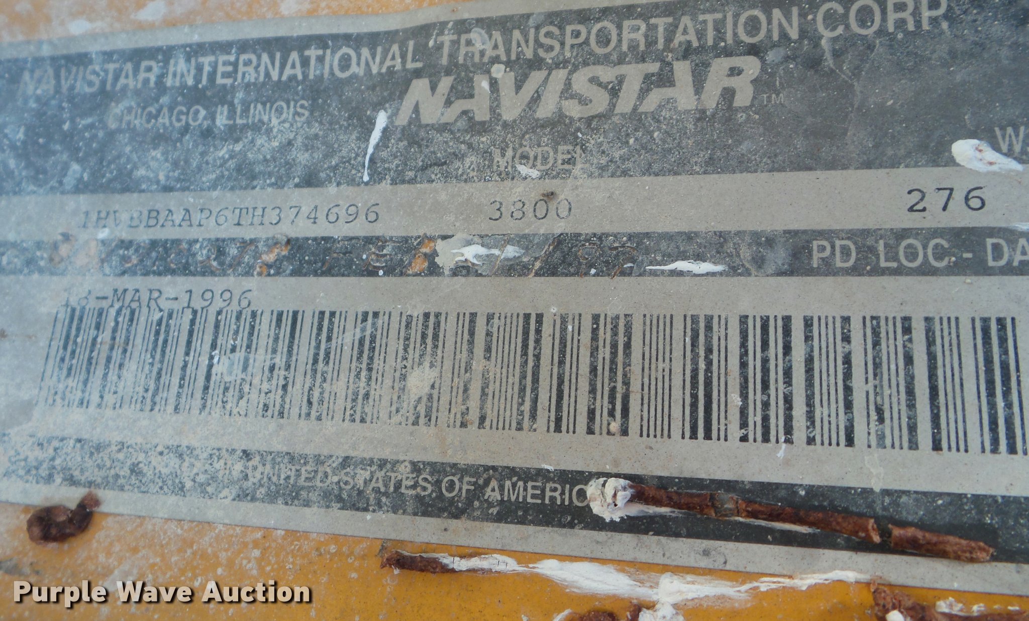 1996 International 3800 school bus. 116,628 miles on odometer, International DT466 7.6L L6 turbo diesel engine, Automatic transmission, Single axle, Heat, Suspension seat, Electric passenger sliding door, Ceiling emergency egress, Front and rear tow hooks, Spring suspension, Hydraulic brakes, 276" wheelbase, 10R22.5 tires, Seats missing, Cracked windshield, Non-operational unit, Unit# B33. Oklahoma title. Title will be available to the buyer at the time of asset removal. 1HVBBAAP6TH374696. Seaboard Foods. Perryton, TX 79070