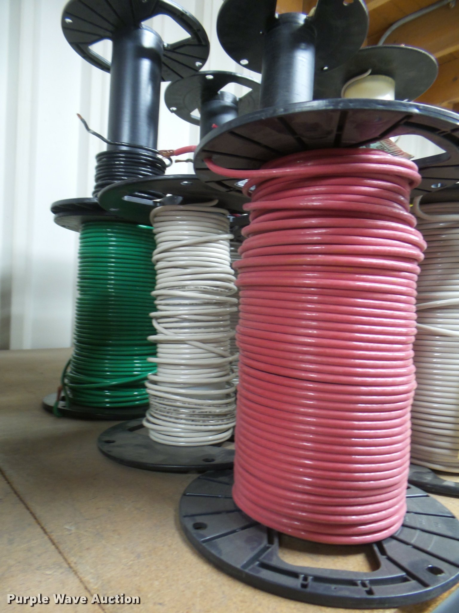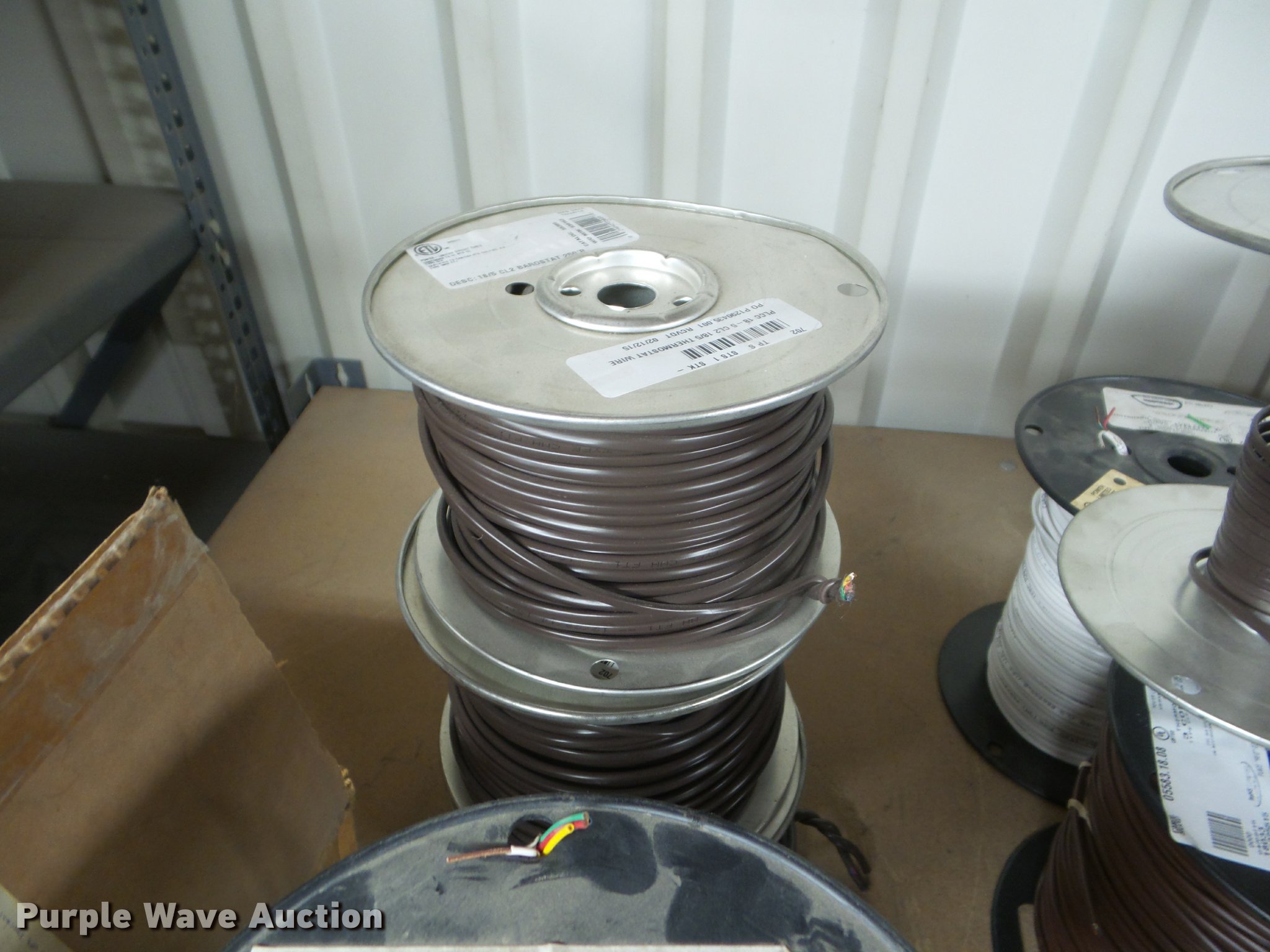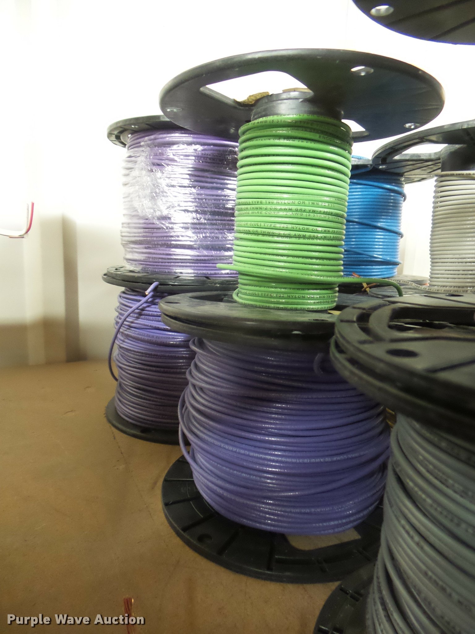 Purple Wave is selling a used Building Materials in Kansas. This item is a (53) spools of wire with the following: 10, 12, 14, and 18-3 gauge, 10 AGW, 18-5, Thermostate cable, Barostat cable, Various lengths