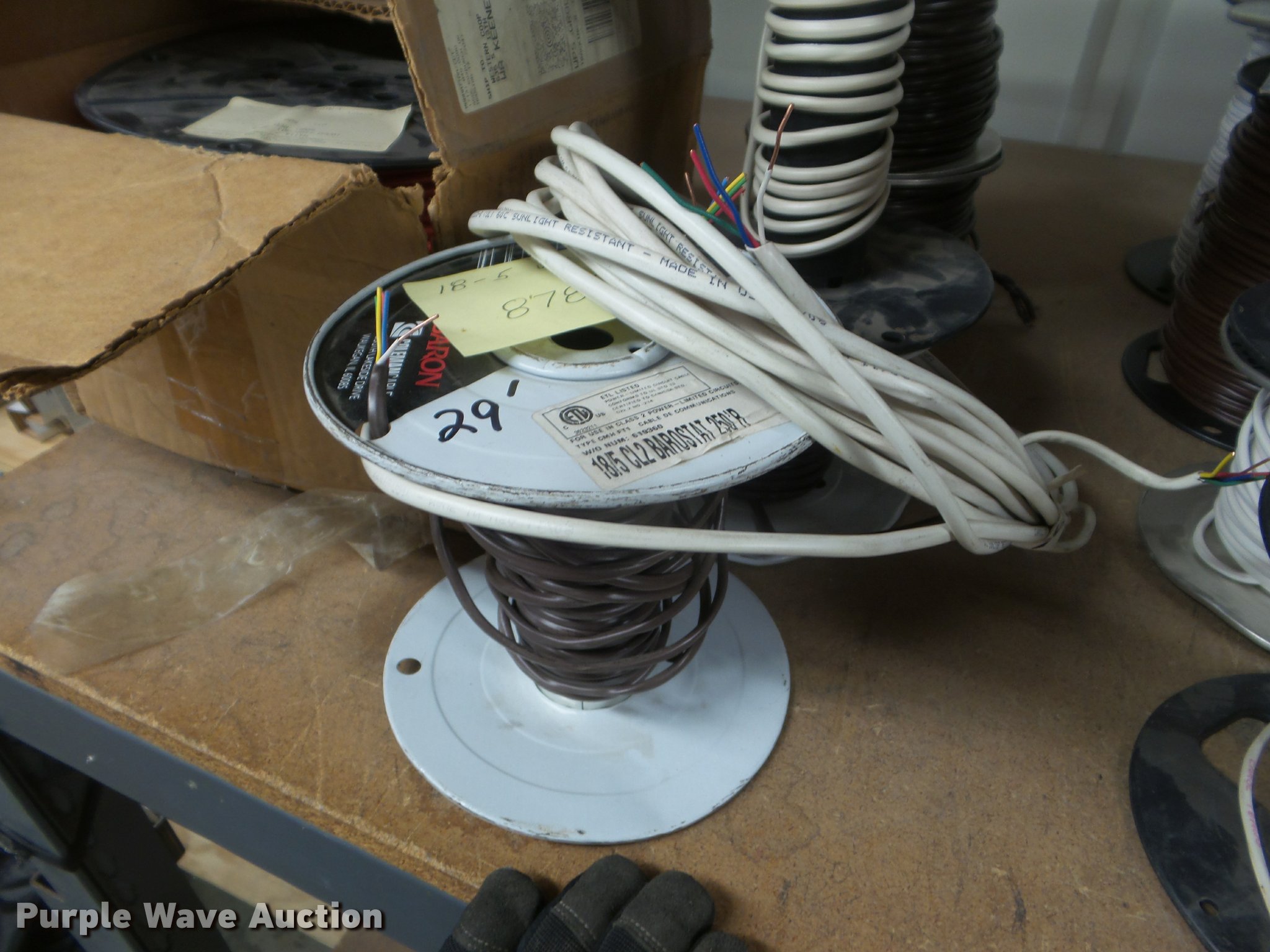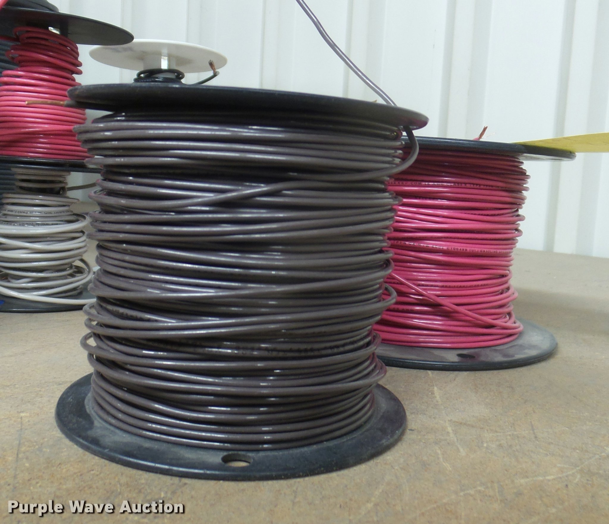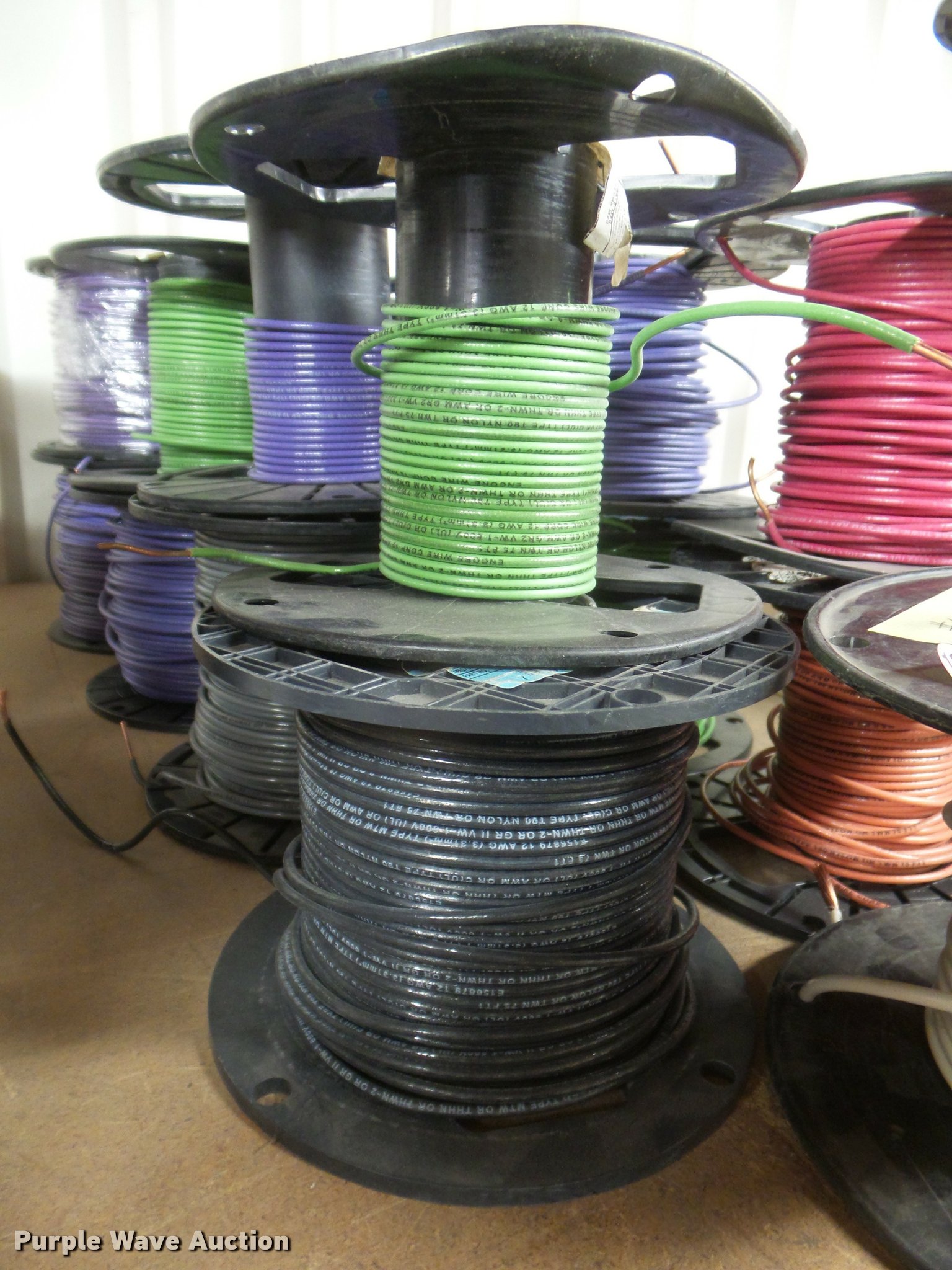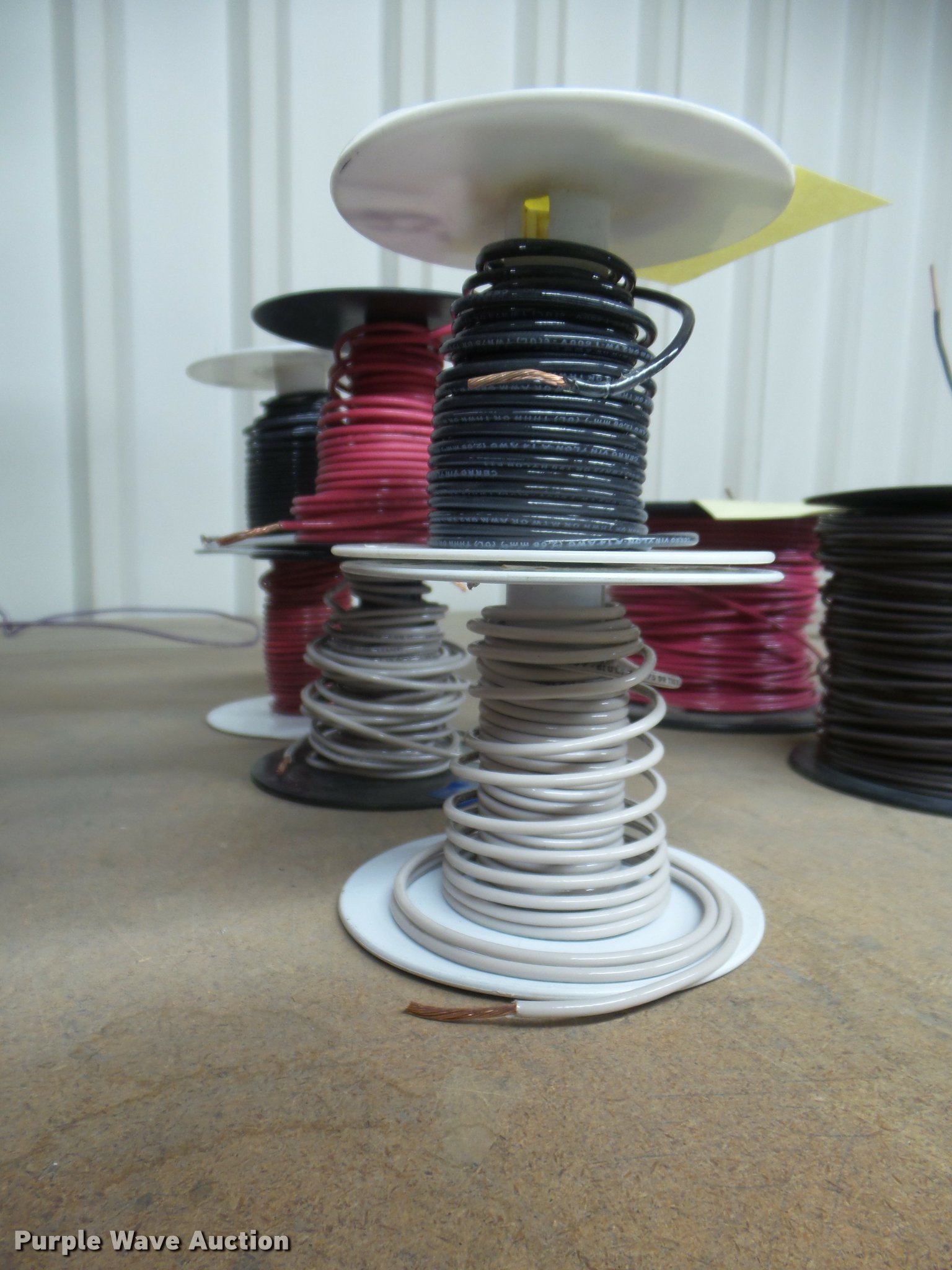 Purple Wave is selling a used Building Materials in Kansas. This item is a (53) spools of wire with the following: 10, 12, 14, and 18-3 gauge, 10 AGW, 18-5, Thermostate cable, Barostat cable, Various lengths