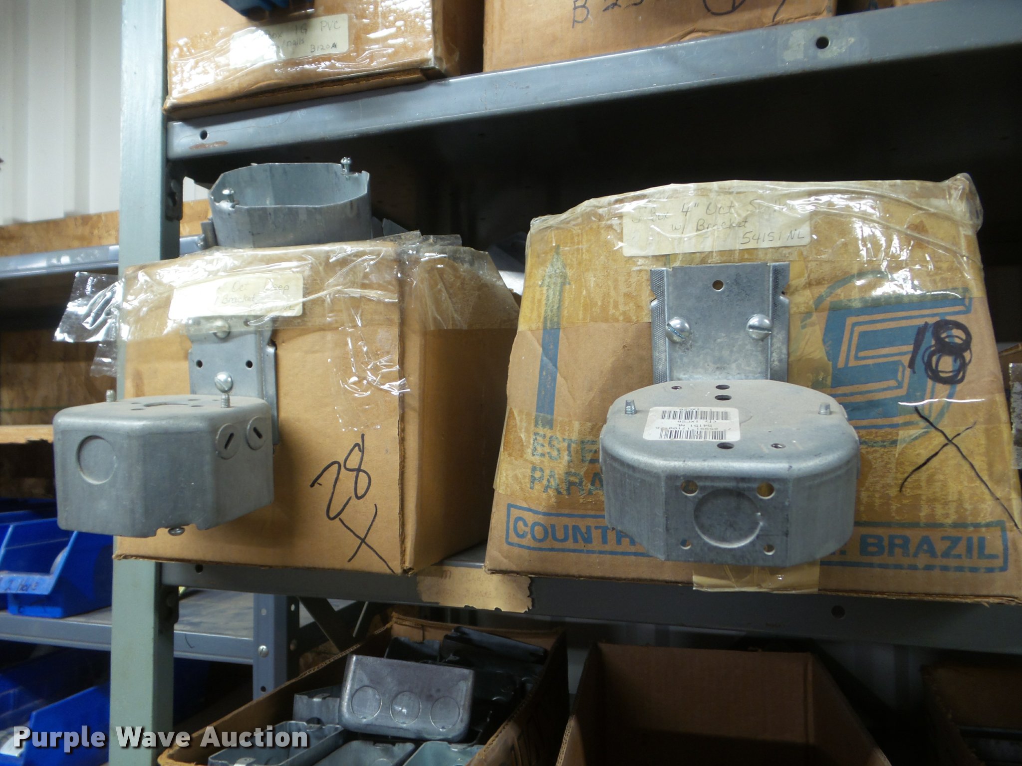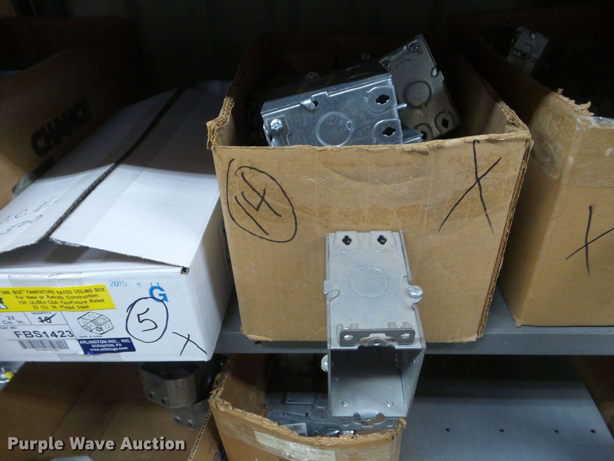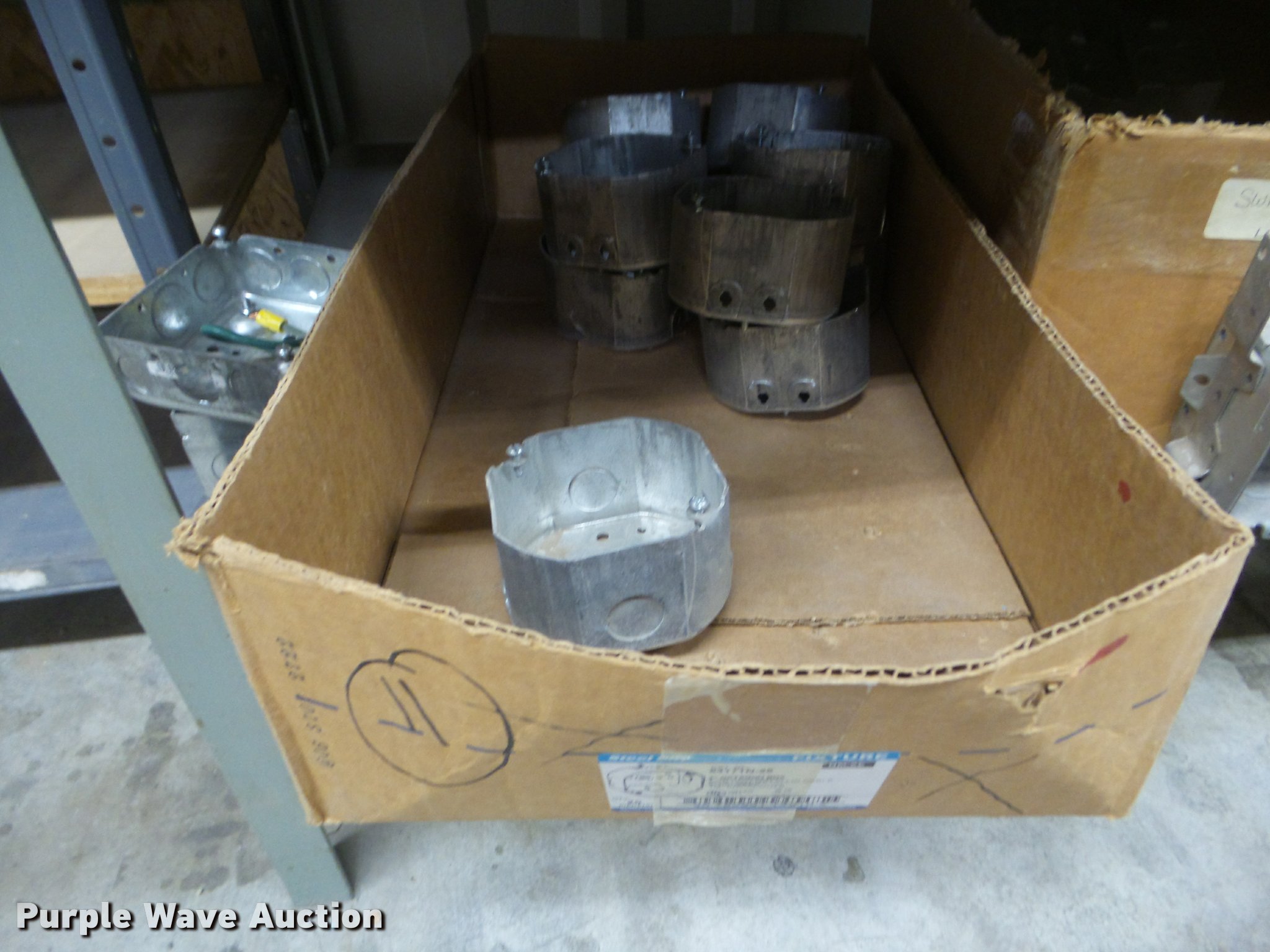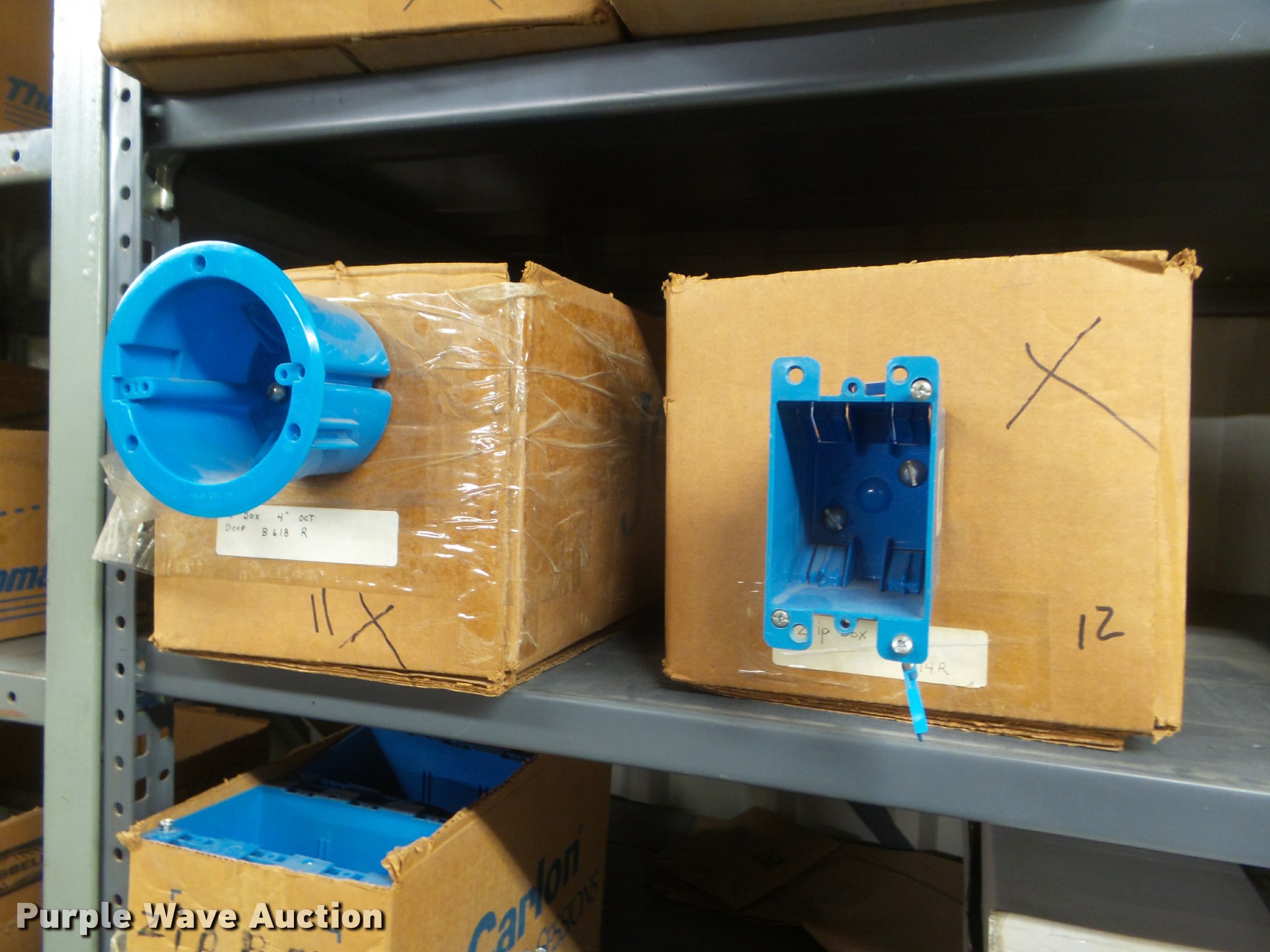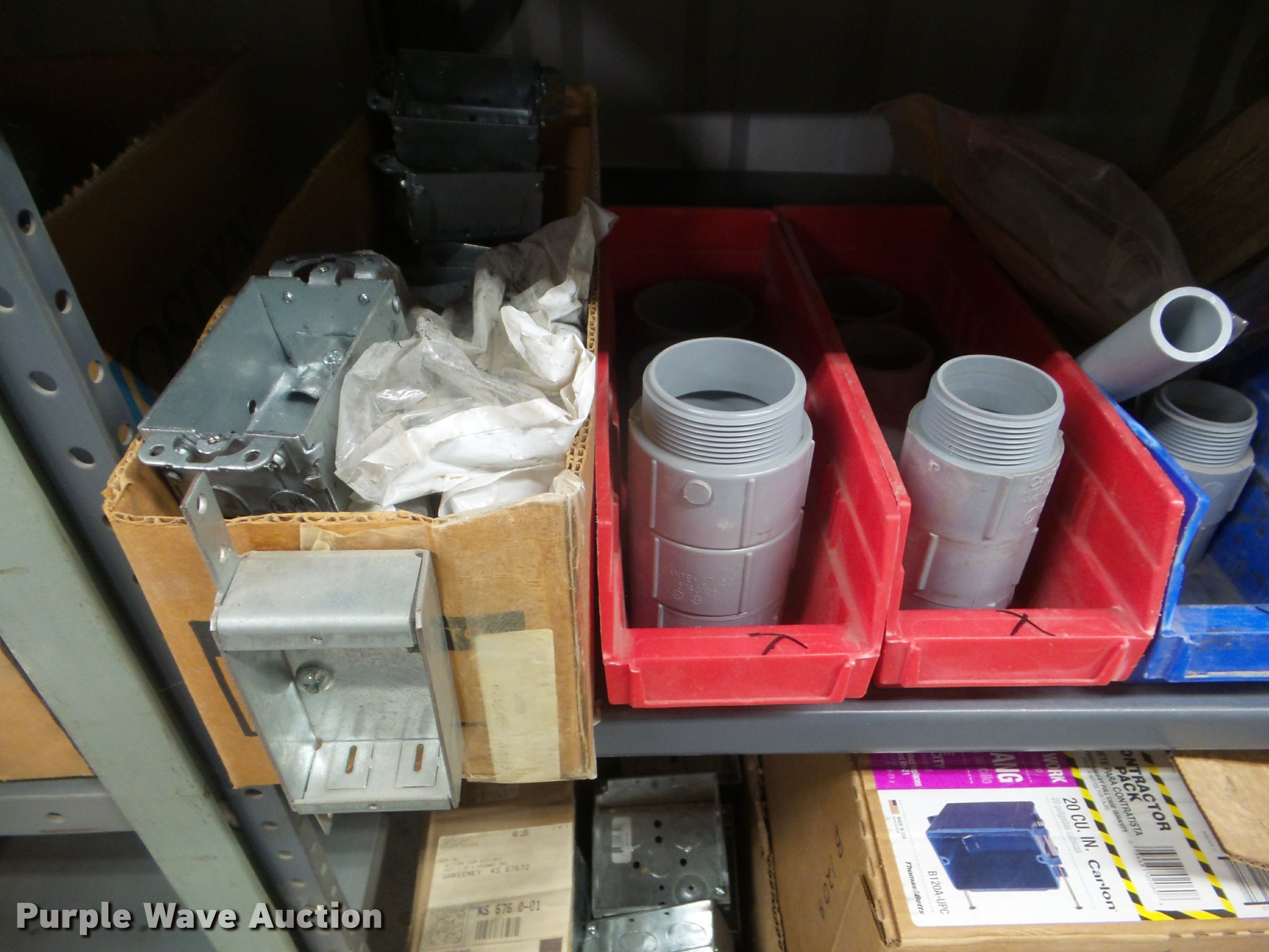 Purple Wave is selling a used Building Materials in Kansas. This item is a Building materials with the following: Rough in boxes, Conduit boxes, Brake box kits, Switch boxes, Junction boxes, Ceiling light boxes, PVC fittings, Shelving not included