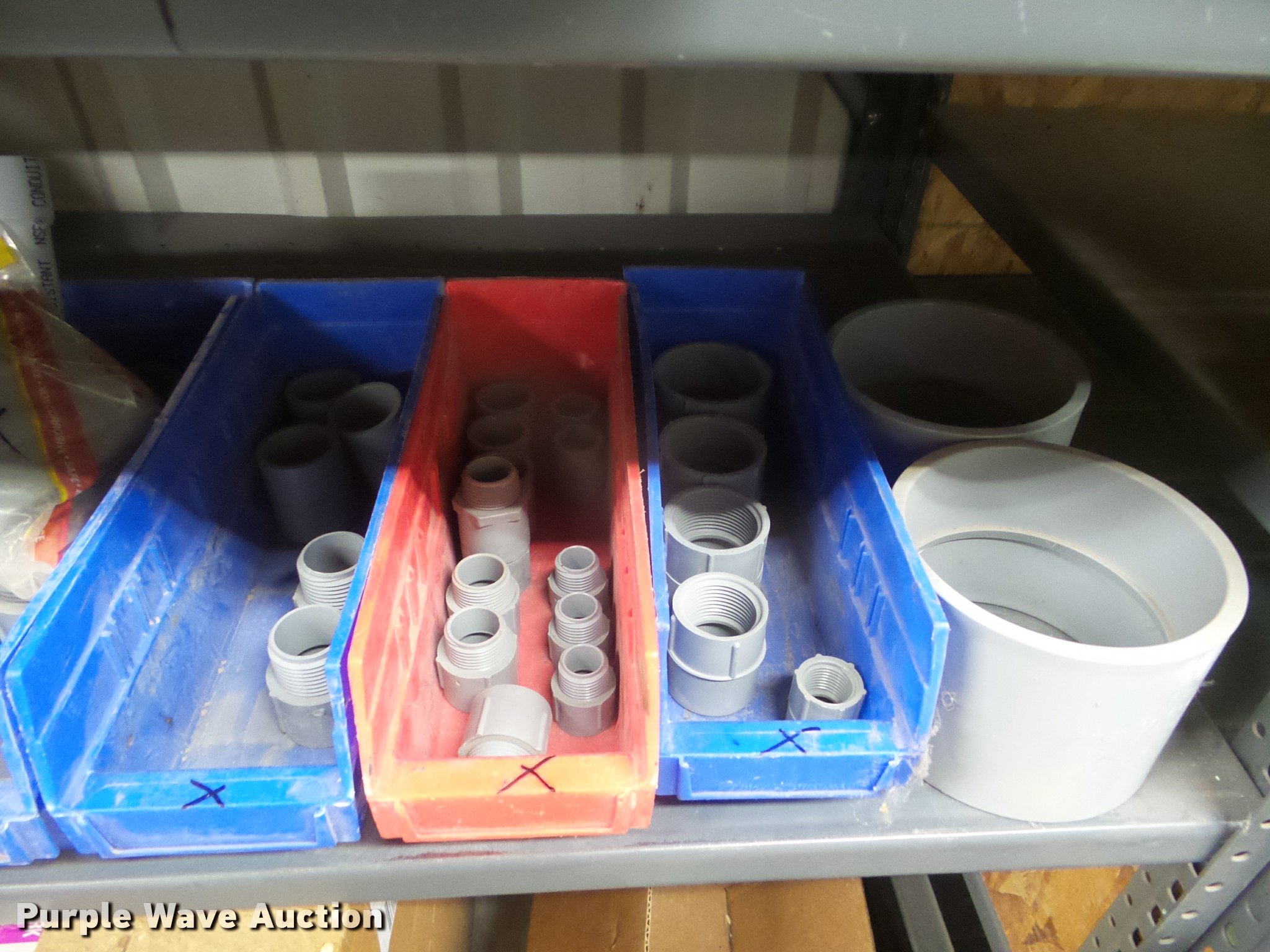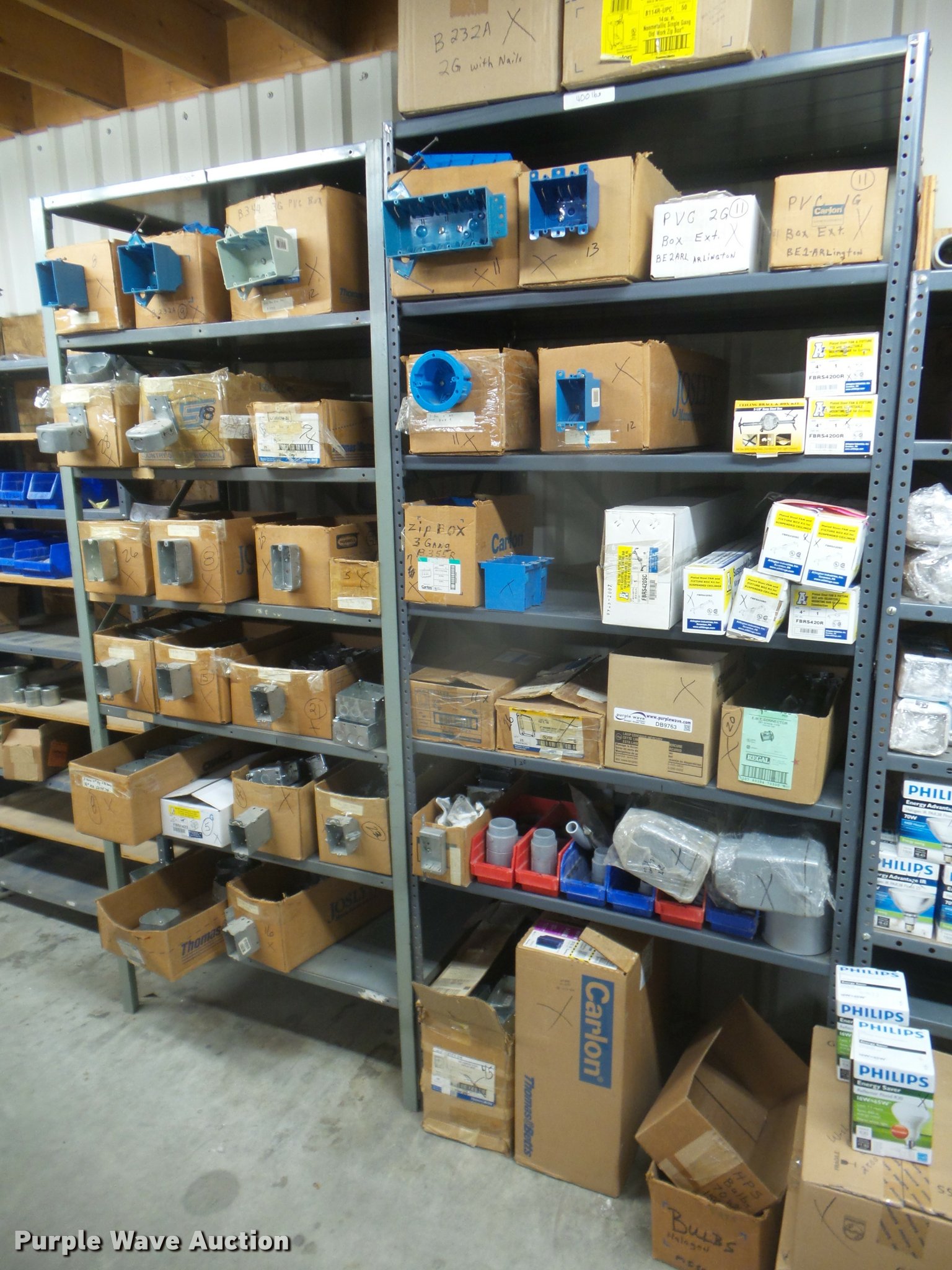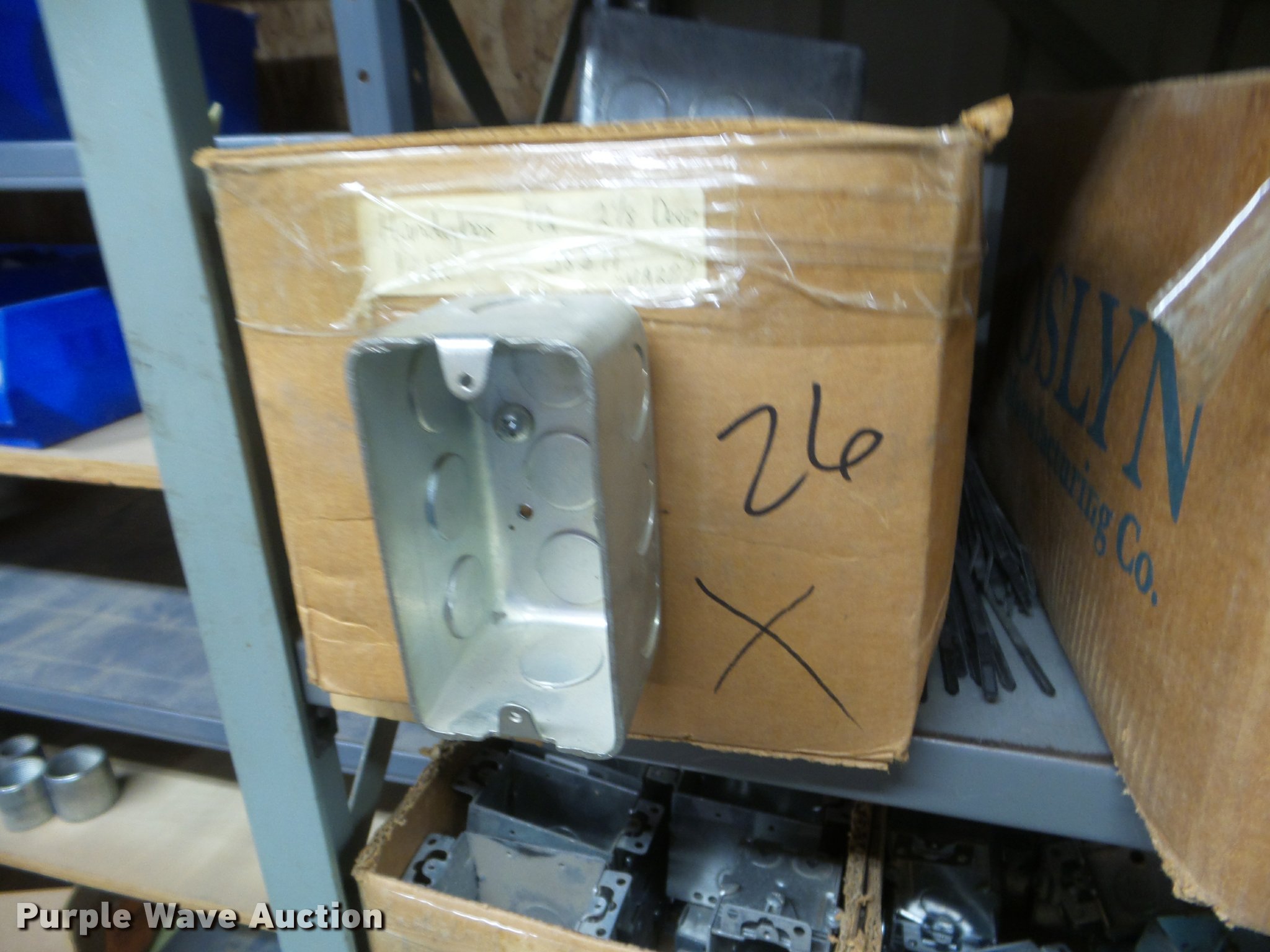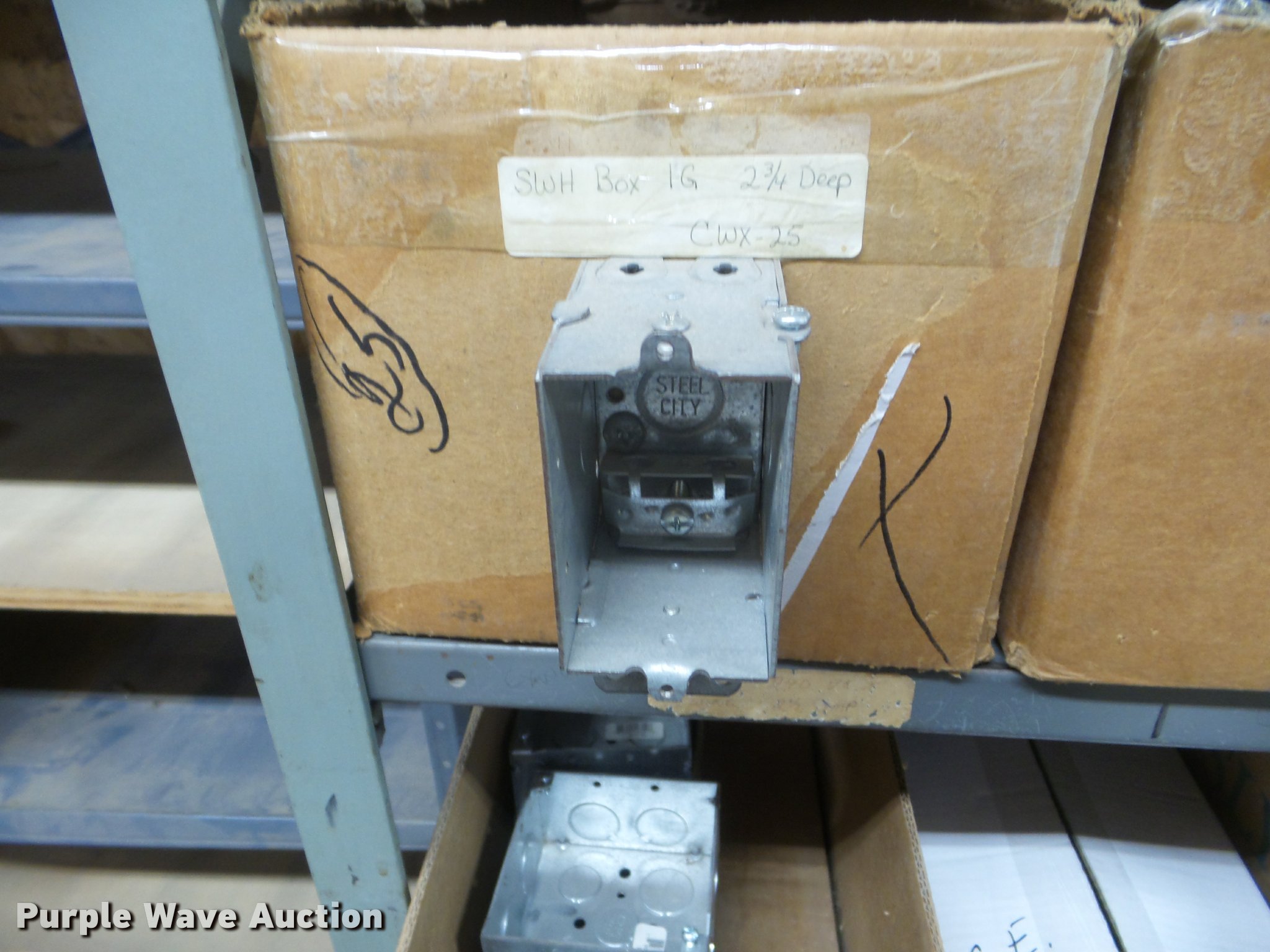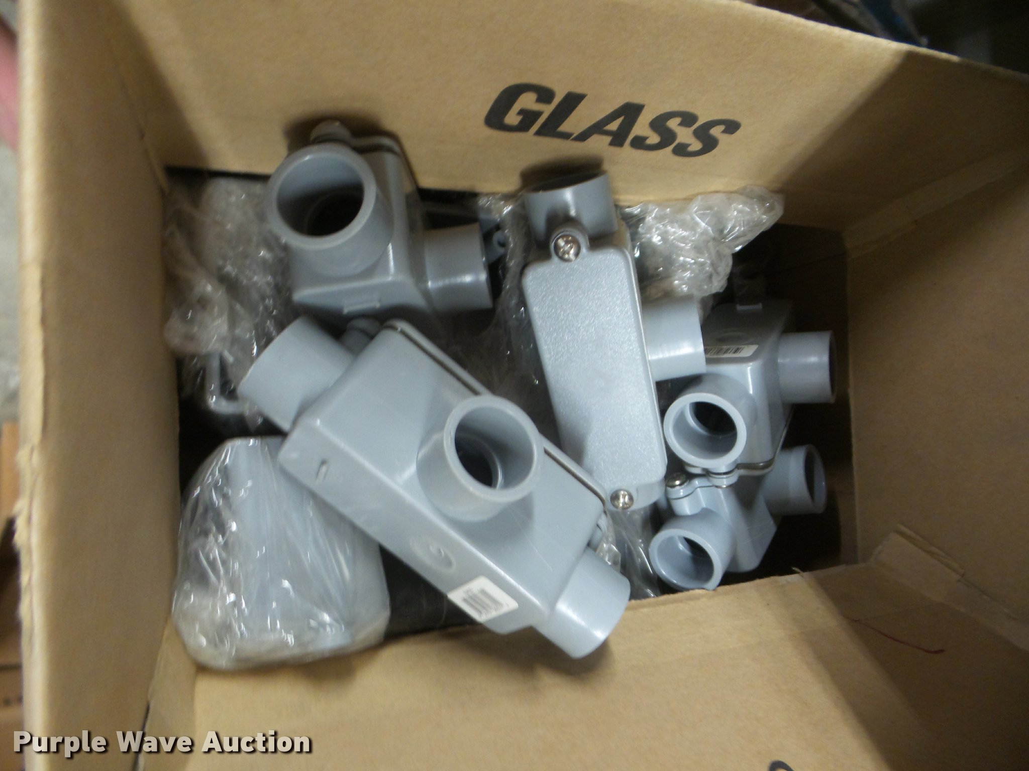 Purple Wave is selling a used Building Materials in Kansas. This item is a Building materials with the following: Rough in boxes, Conduit boxes, Brake box kits, Switch boxes, Junction boxes, Ceiling light boxes, PVC fittings, Shelving not included