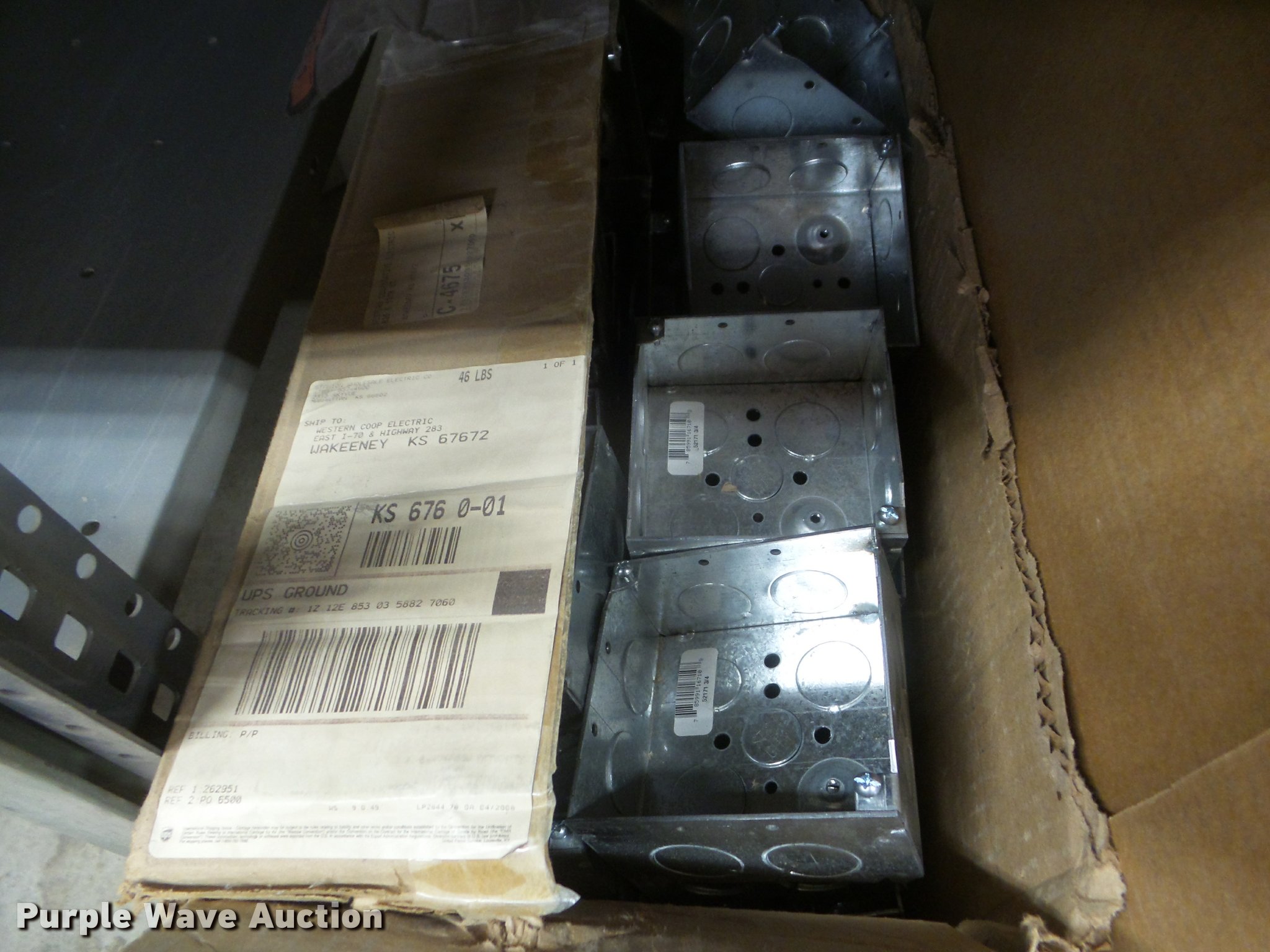 Building materials. Rough in boxes, Conduit boxes, Brake box kits, Switch boxes, Junction boxes, Ceiling light boxes, PVC fittings, Shelving not included. Western Cooperative Electric. WaKeeney, KS 67672