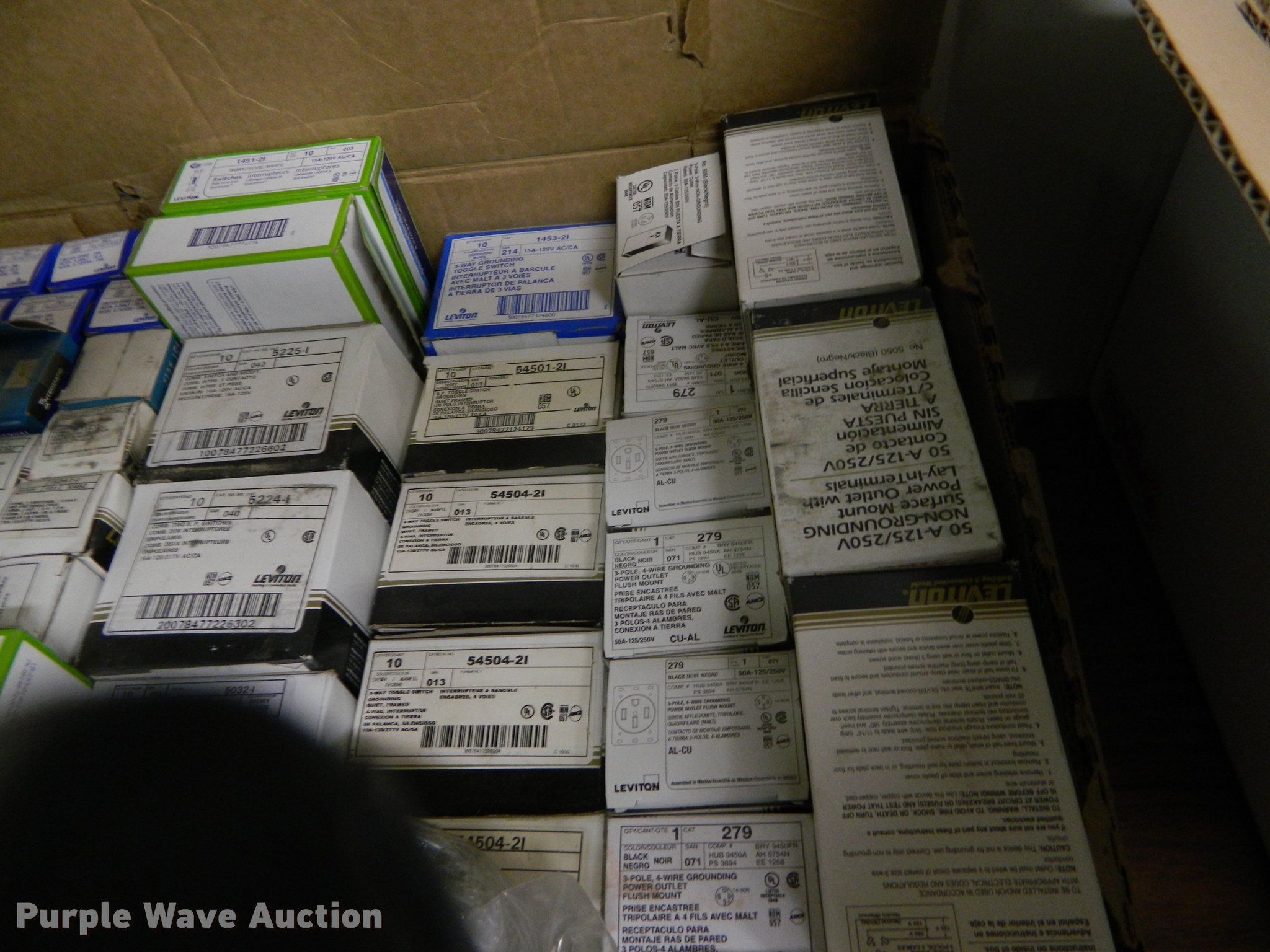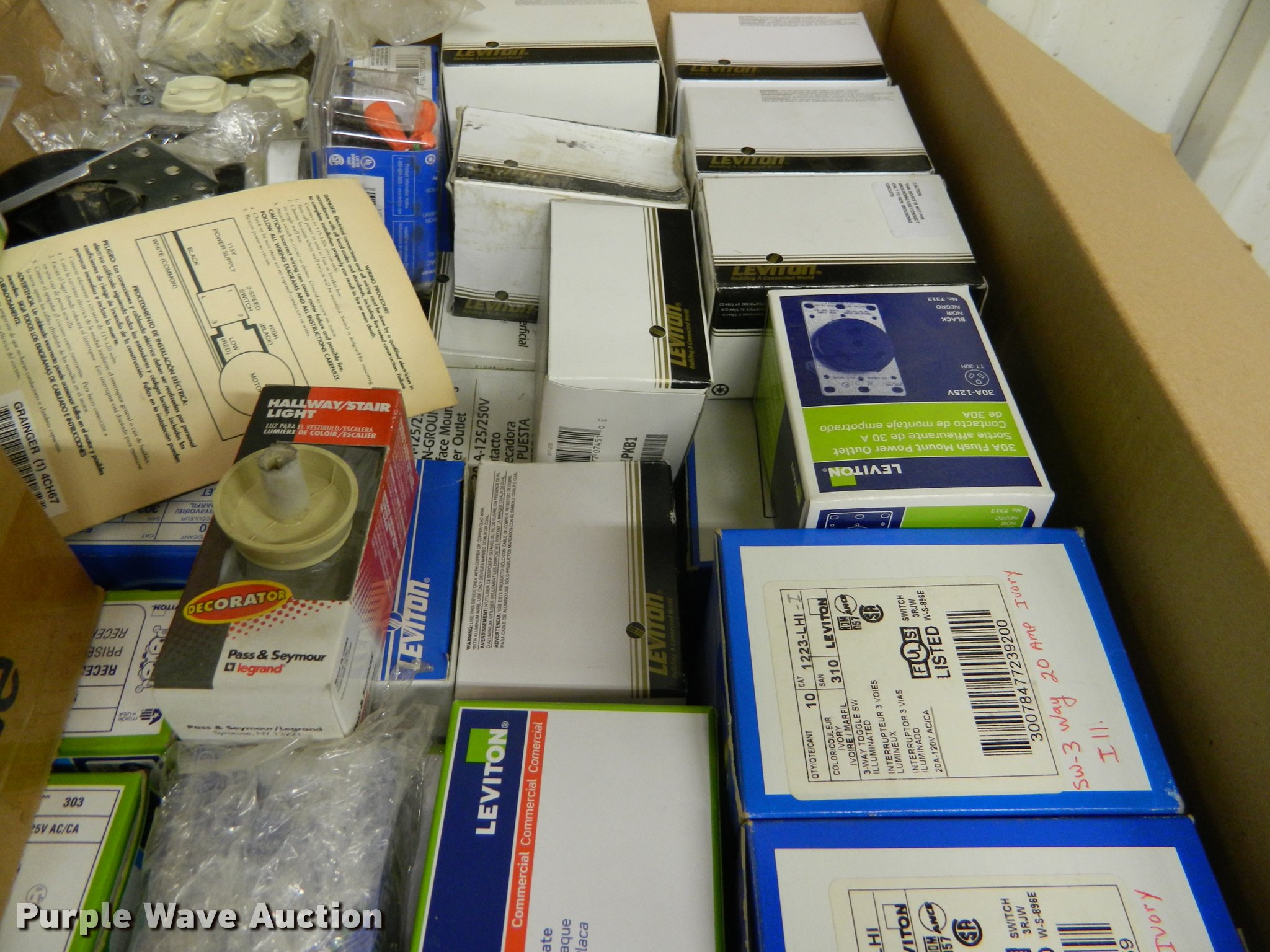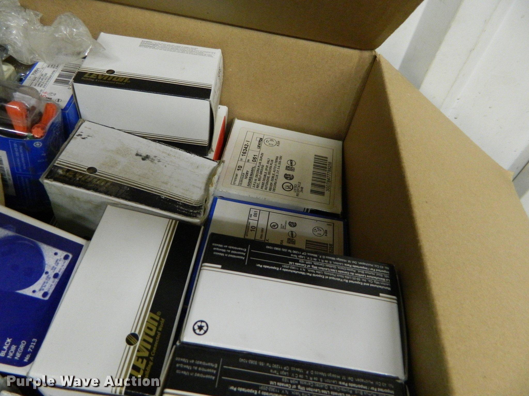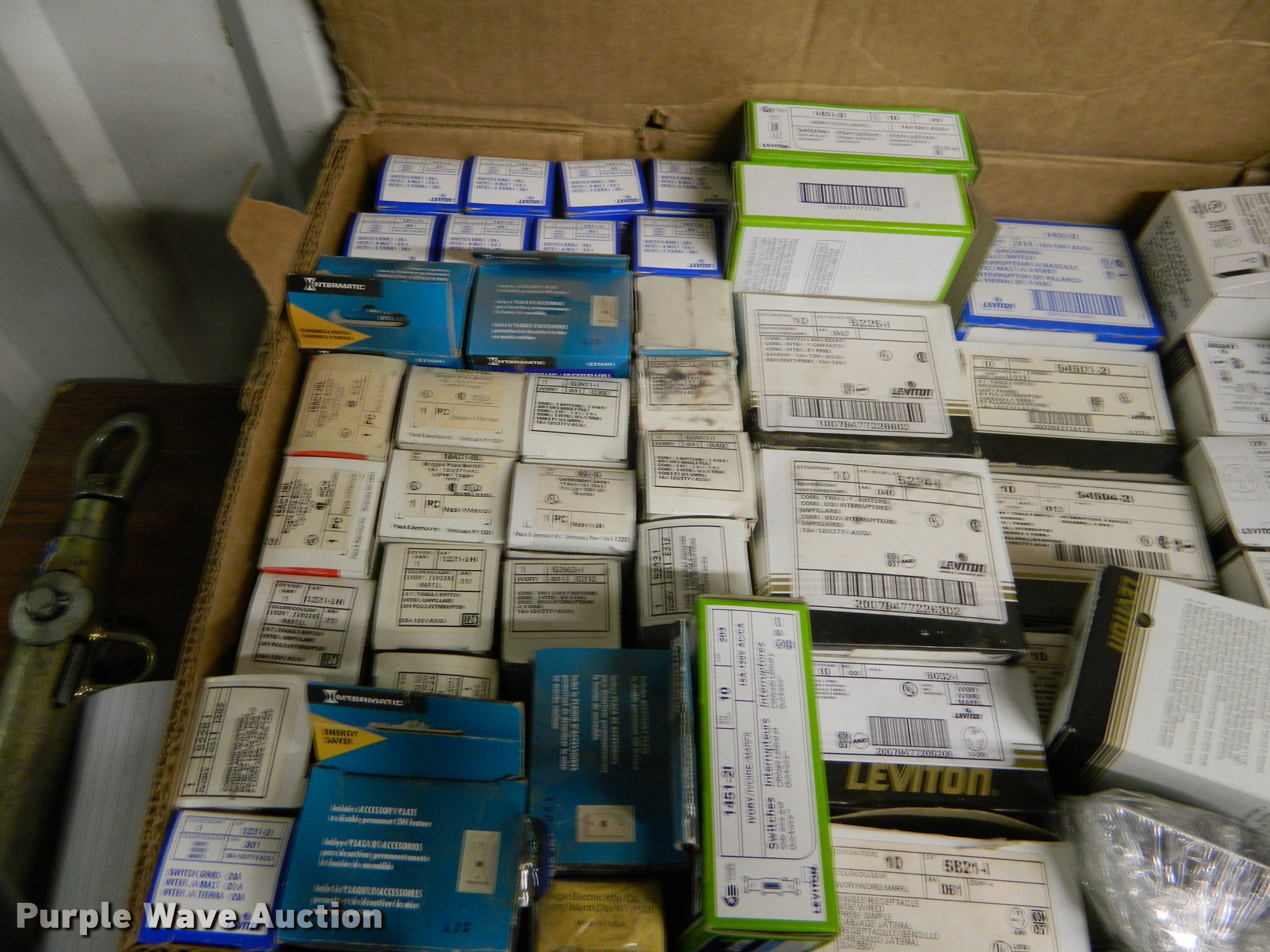 Purple Wave is selling a used Building Materials in Kansas. This item is a Building materials with the following: Electrical fittings, Receptacles, Receptacle covers, Switches, Dimmer switches, Pole switches, Four-way switches, Double pole switches, T-B Meyers hubs, Plate covers, Hubs, Shelving not included