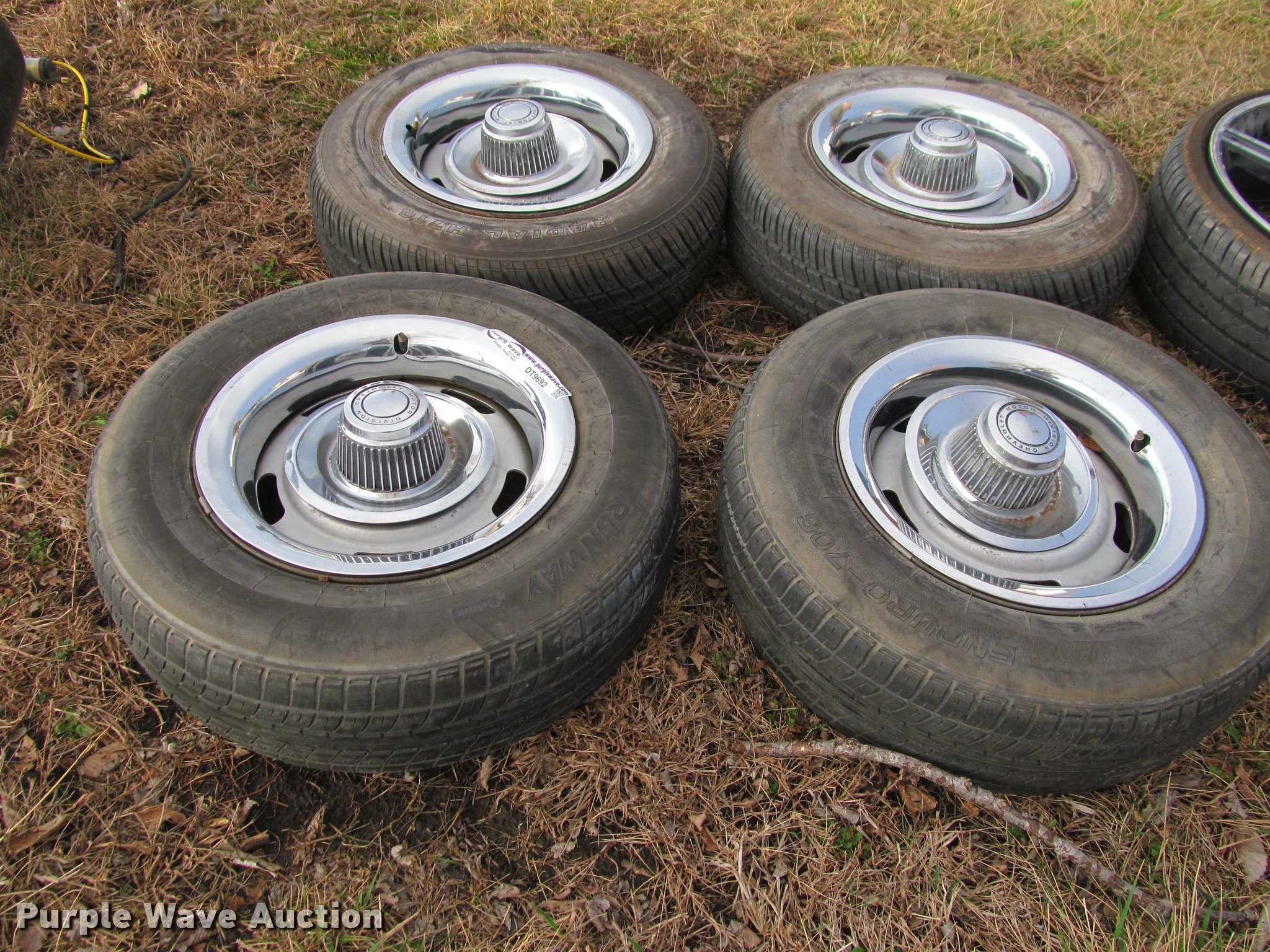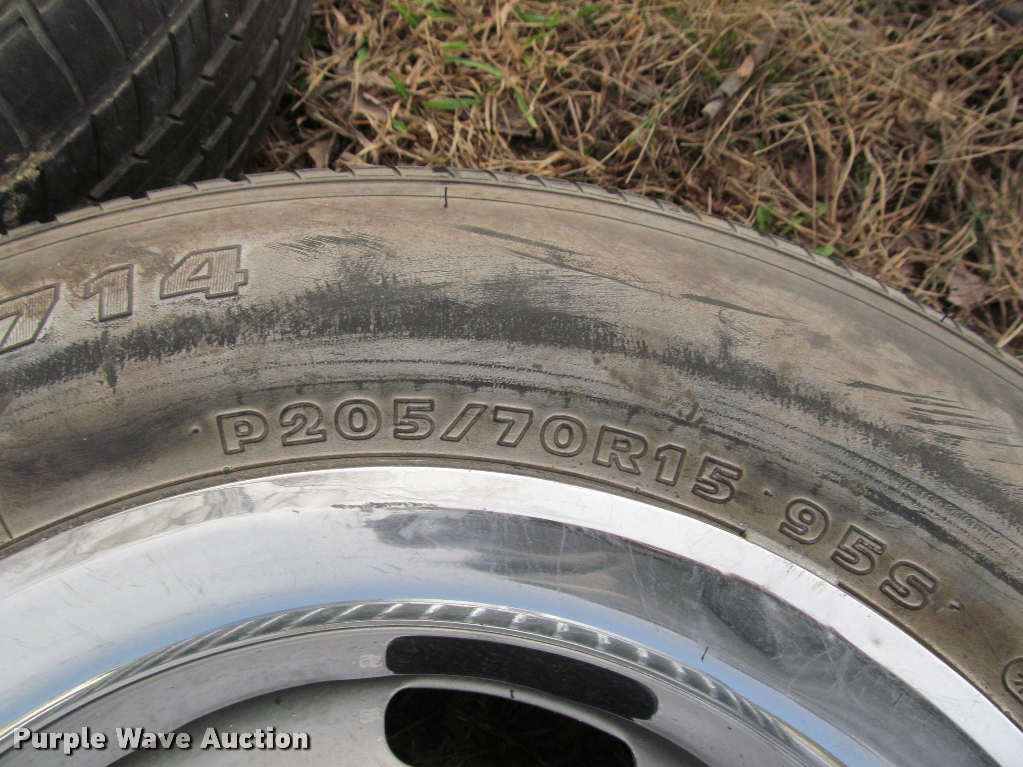 Purple Wave is selling a used Fleet Tires in Kansas. This item is a (4) Chevrolet Rally tires and wheels with the following: 205/70R15 tires, (2) Enduro 706, (2) Hankook H714