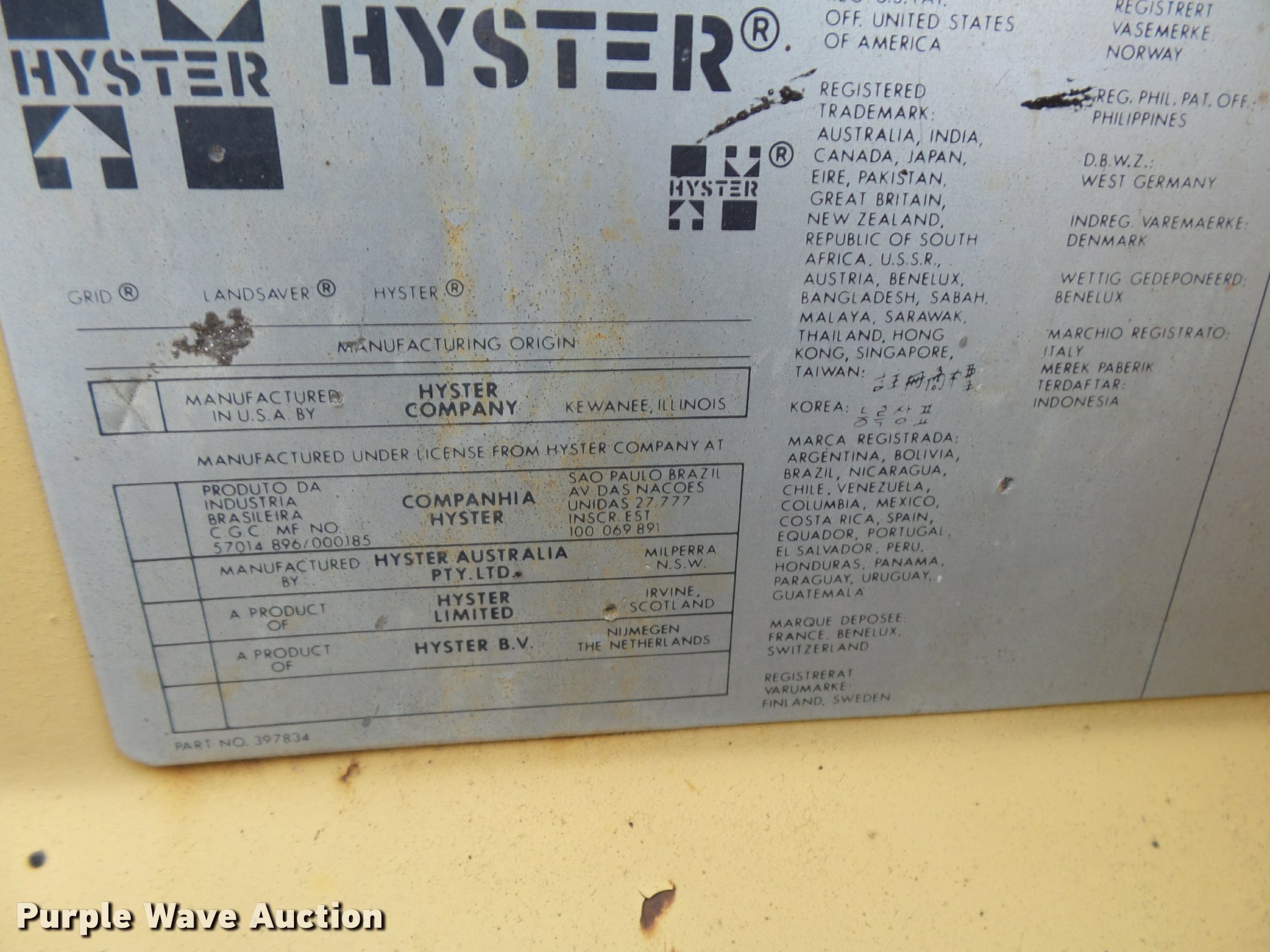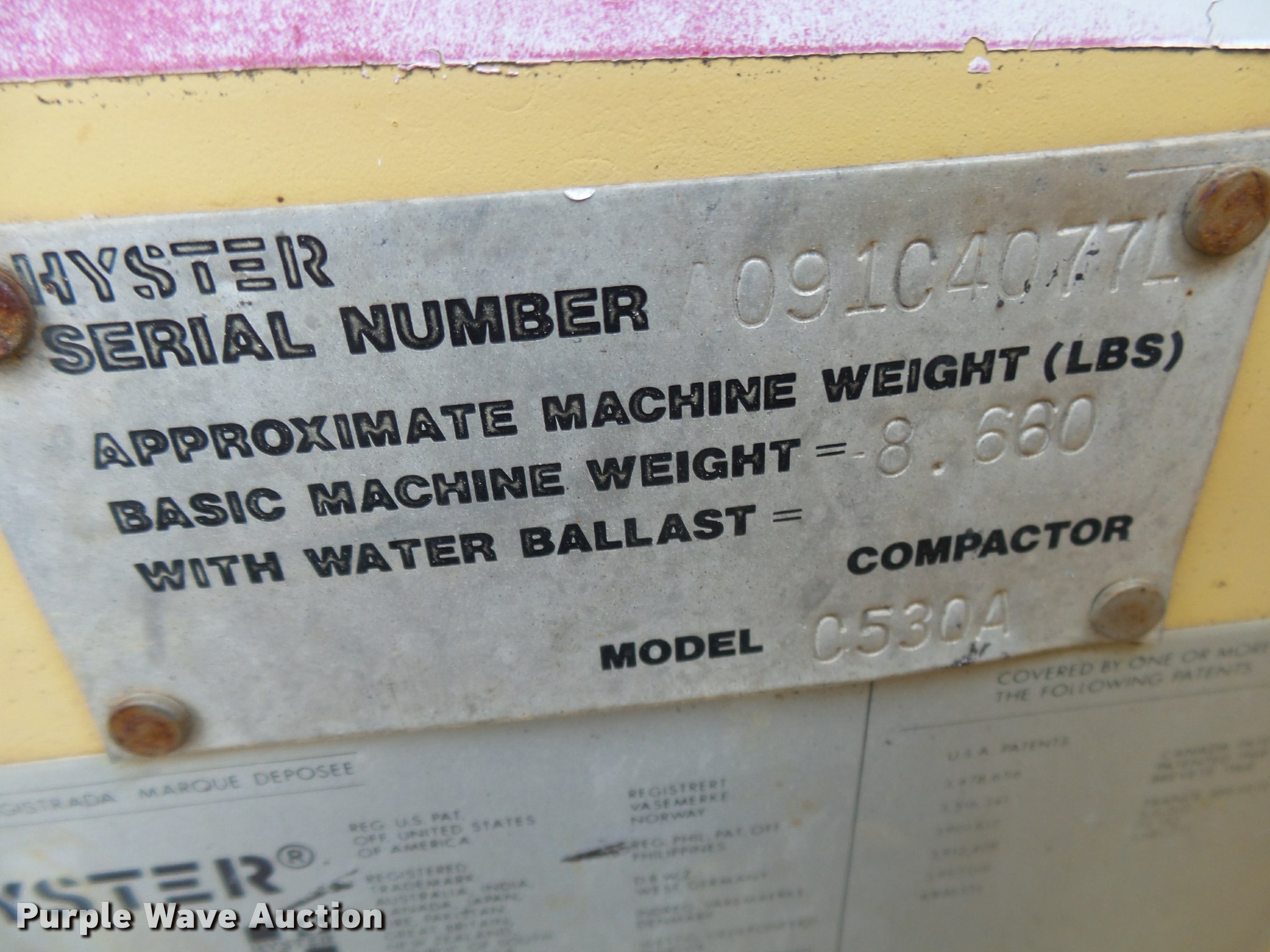 Purple Wave is selling a used Pneumatic Roller in Missouri. This item is a Hyster C530A pneumatic roller with the following: Perkins four cylinder diesel engine, Hydrostatic transmission, Suspension seat, Dual operator stations, Rear work lights, Front and rear water application, (9) tires, 7.50-15 tires, 8,660 lbs. base operating weight, Serial 091C4077L
