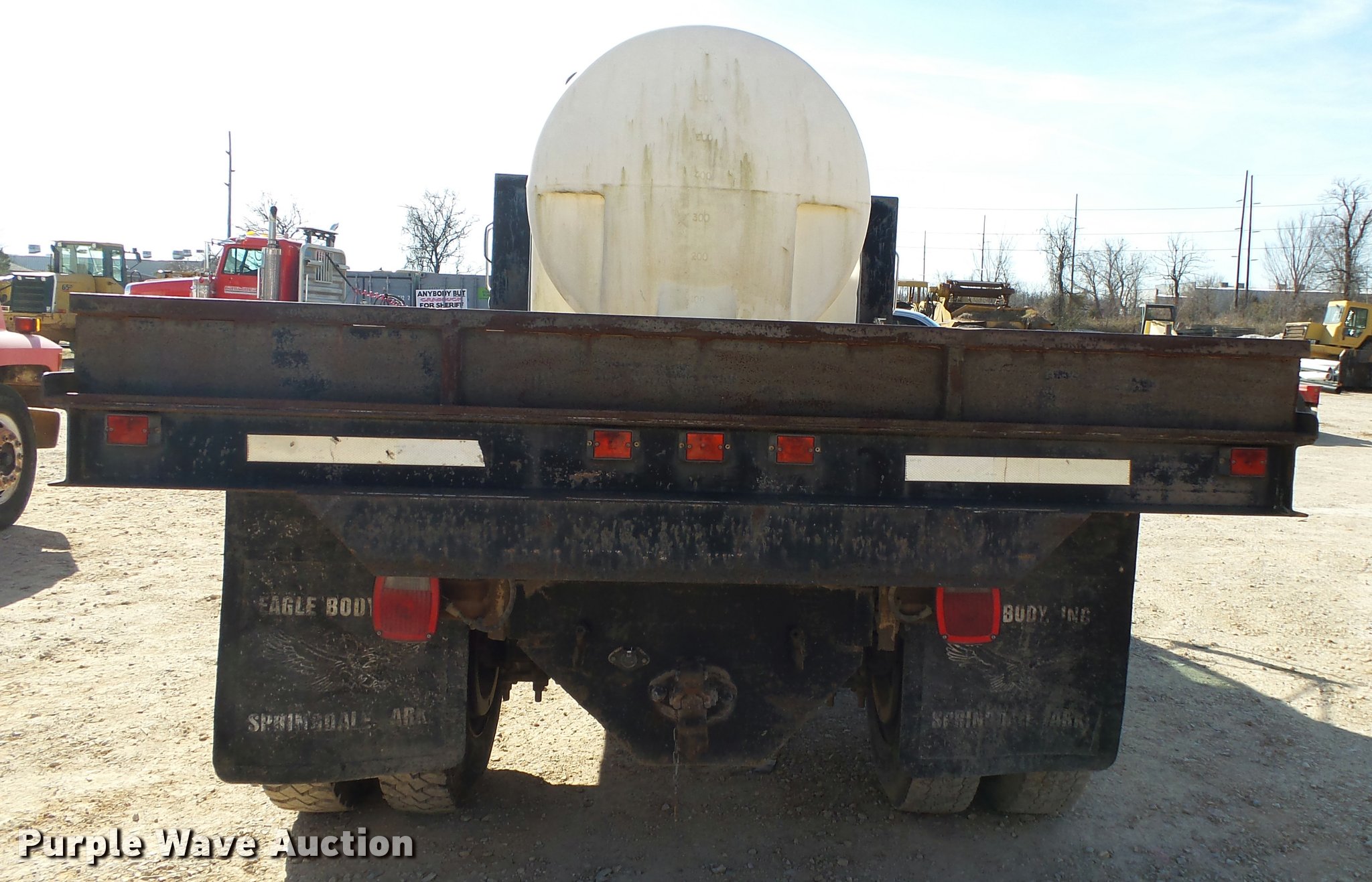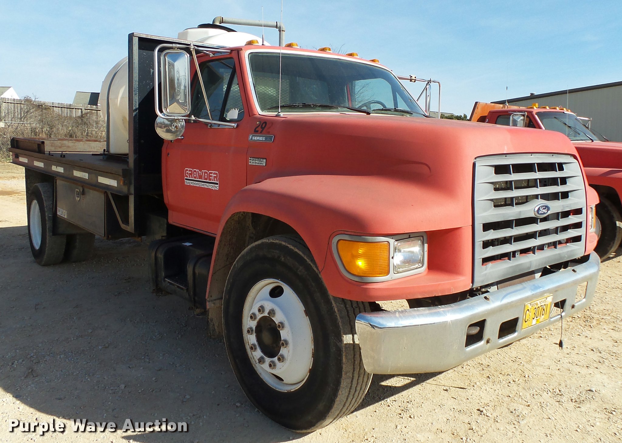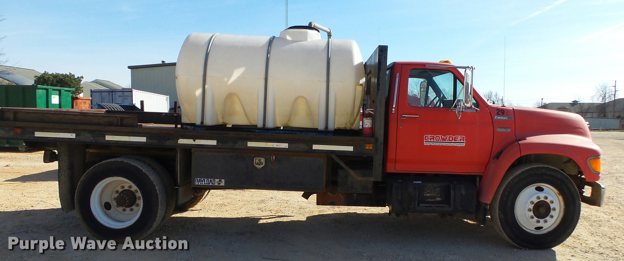 1995 Ford F800 Super Duty flatbed truck. 86,879 miles on odometer, Cummins ISB 5.9L L6 turbo diesel engine, Nine speed manual transmission, Tandem axle, AC and heat, AM/FM, Spring suspension seat, Front tow hooks, 14'L x 8'W steel flatbed Stake side pockets, Storage boxes, Headache rack, Pintle hitch, Trailer wiring, 700 gallon poly tank, Dual fuel tanks, 177" wheelbase, Spring suspension, Air brakes, 11R22.5 front tires, 10R22.5 rear tires, GVWR 27,000 lbs. Arkansas title. 1FDXF80C7SVA09592. Dean Crowder Construction. 804 SE 21st St. Bentonville, AR 72712