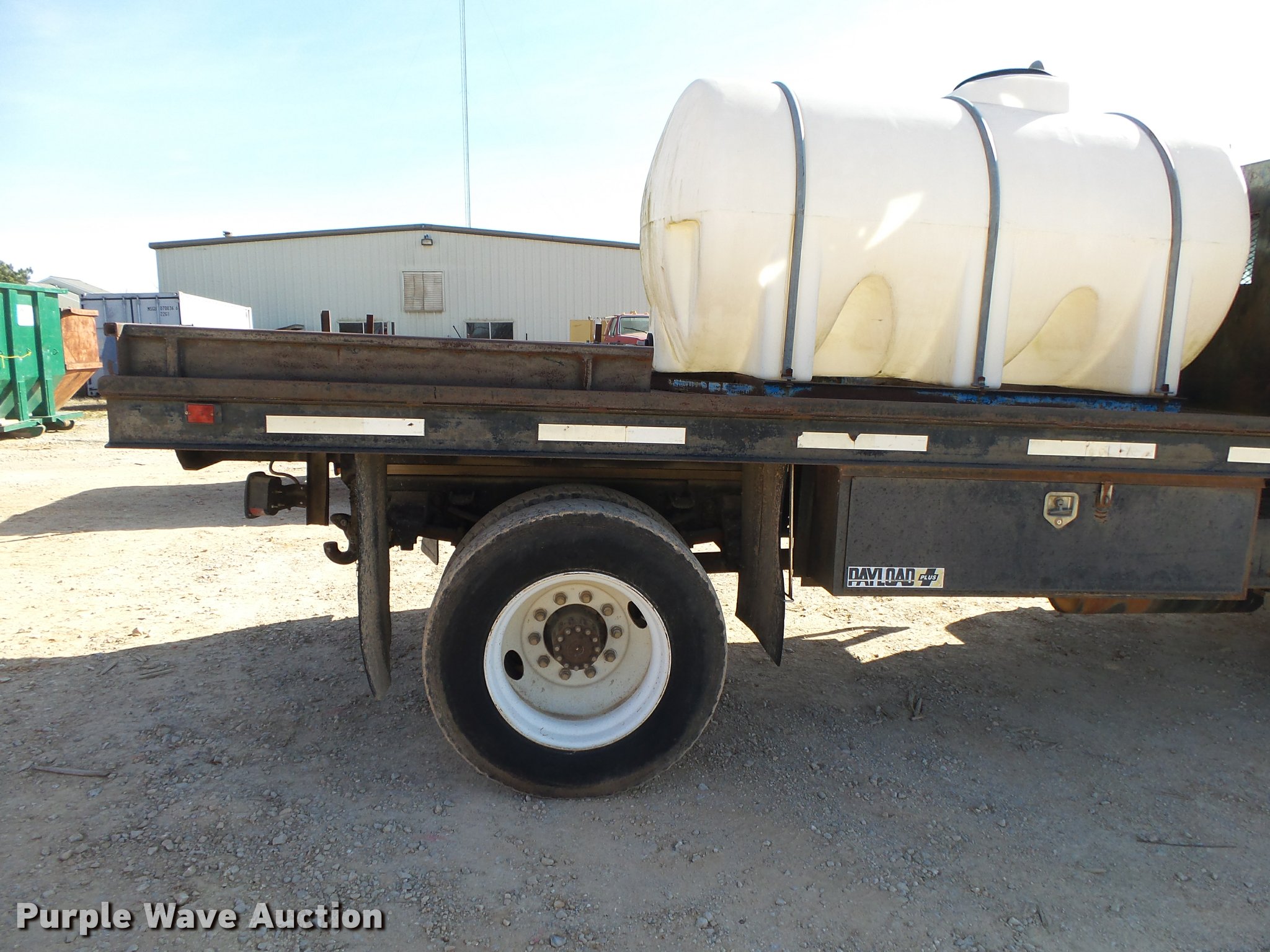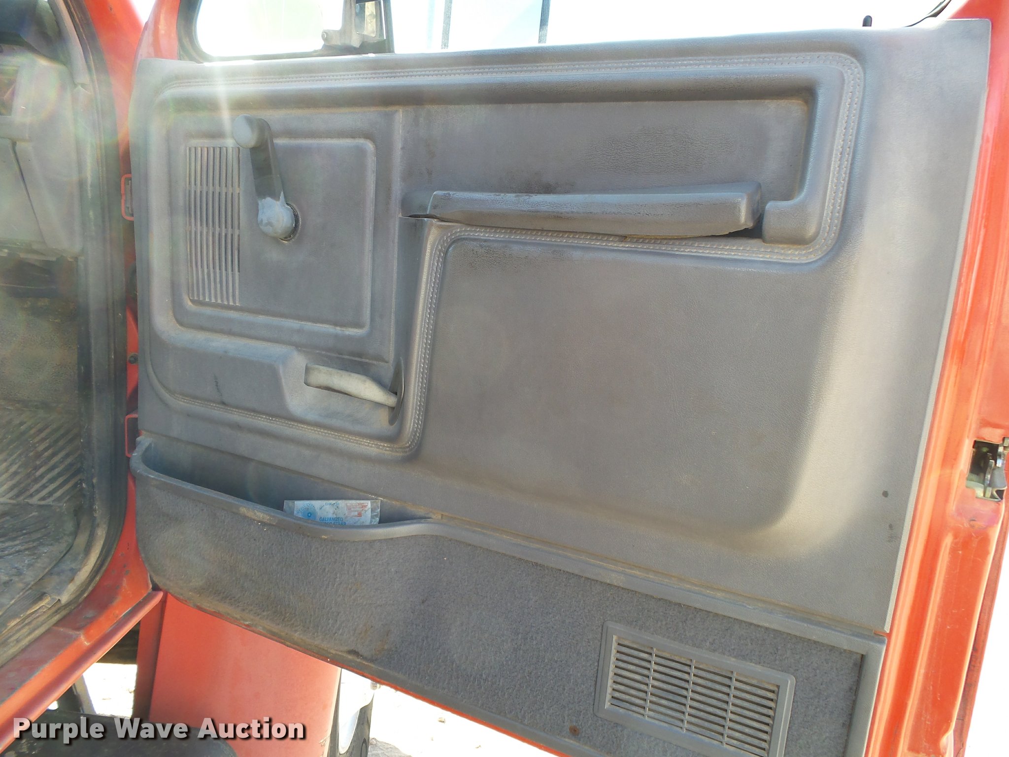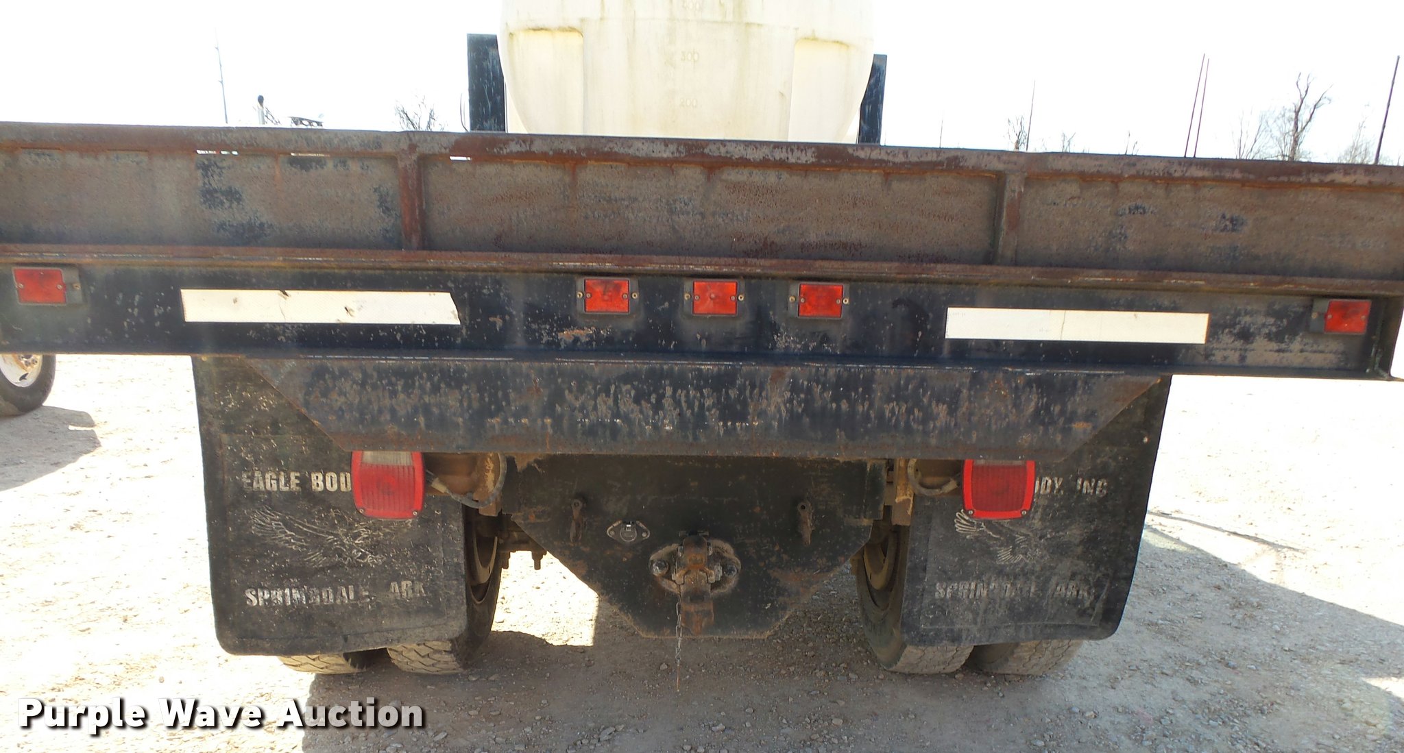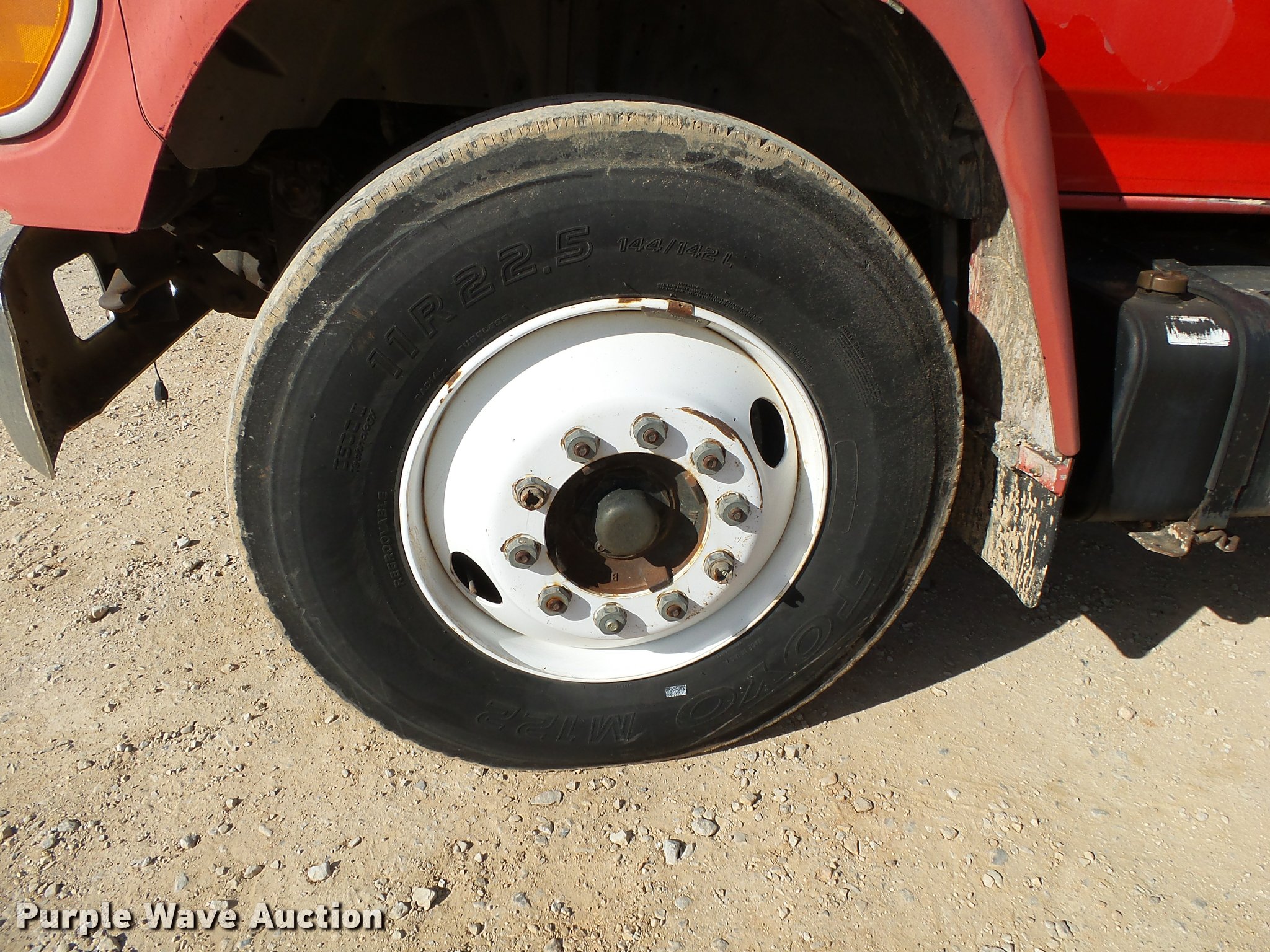 Purple Wave is selling a used Flat Bed Truck in Arkansas. This item is a 1995 Ford F800 Super Duty flatbed truck with the following: 86,879 miles on odometer, Cummins ISB 5.9L L6 turbo diesel engine, Nine speed manual transmission, Tandem axle, AC and heat, AM/FM, Spring suspension seat, Front tow hooks, 14'L x 8'W steel flatbed, Stake side pockets, Storage boxes, Headache rack, Pintle hitch, Trailer wiring, 700 gallon poly tank, Dual fuel tanks, 177" wheelbase, Spring suspension, Air brakes, 11R22.5 front tires, 10R22.5 rear tires, GVWR 27,000 lbs