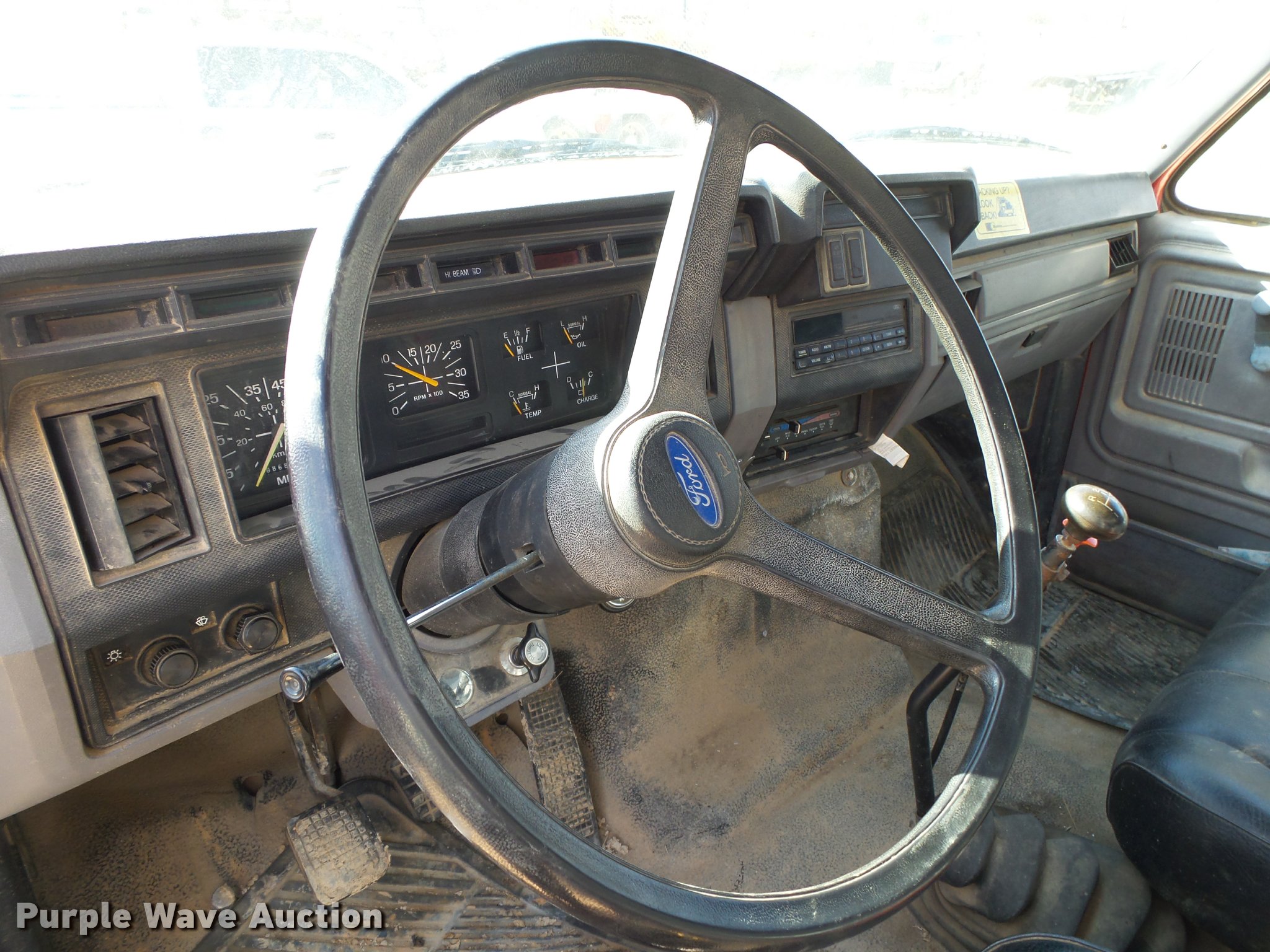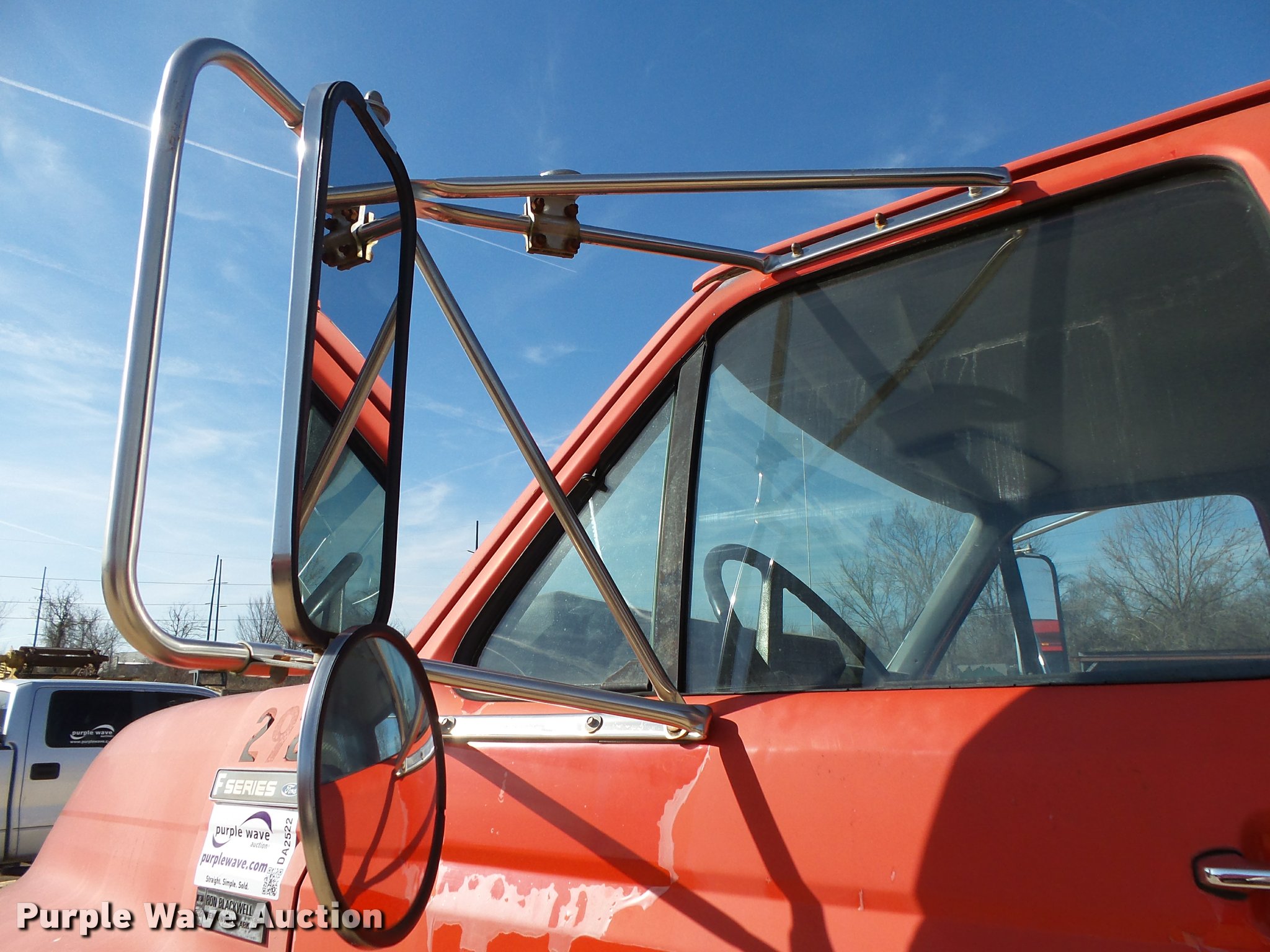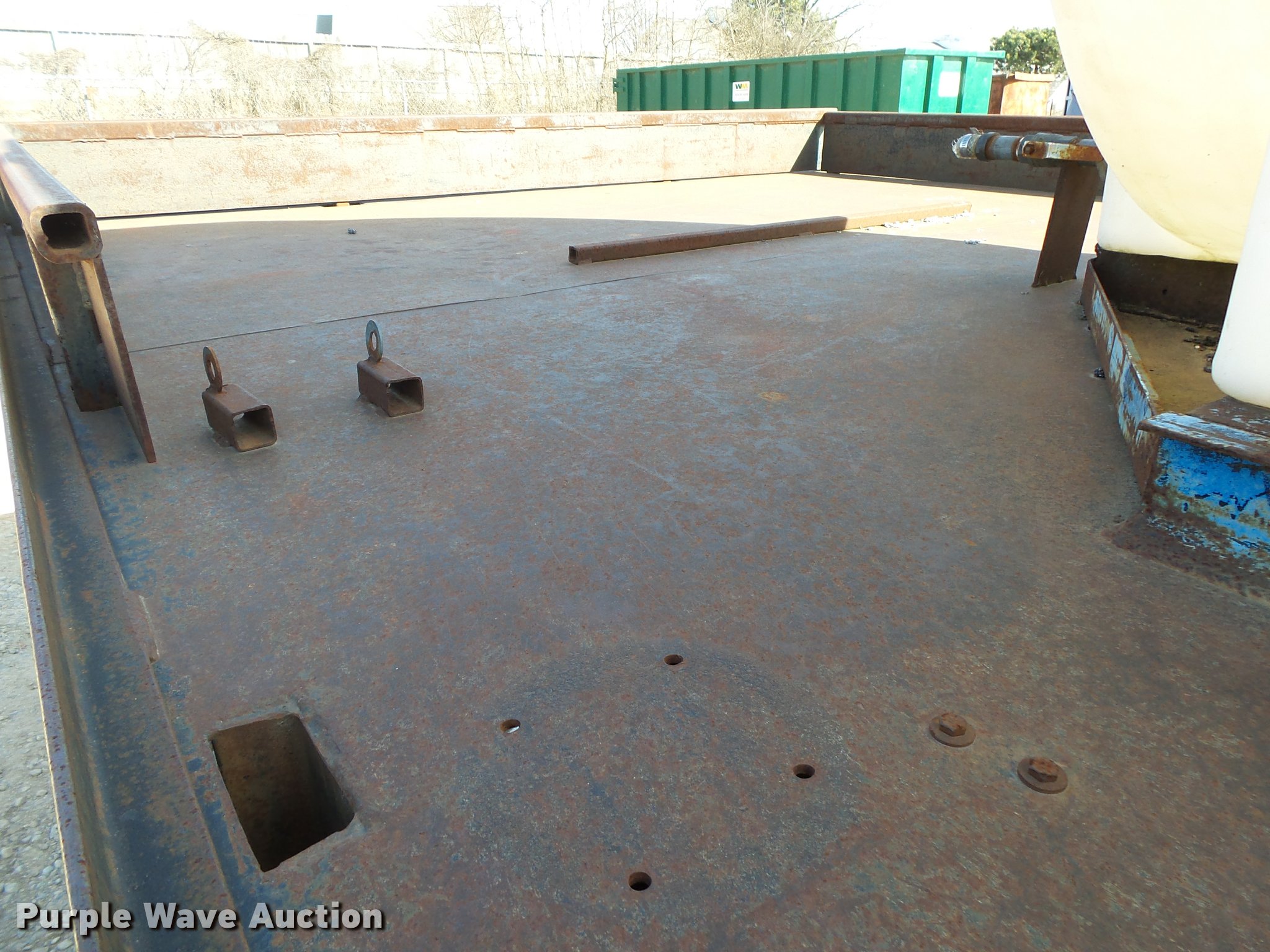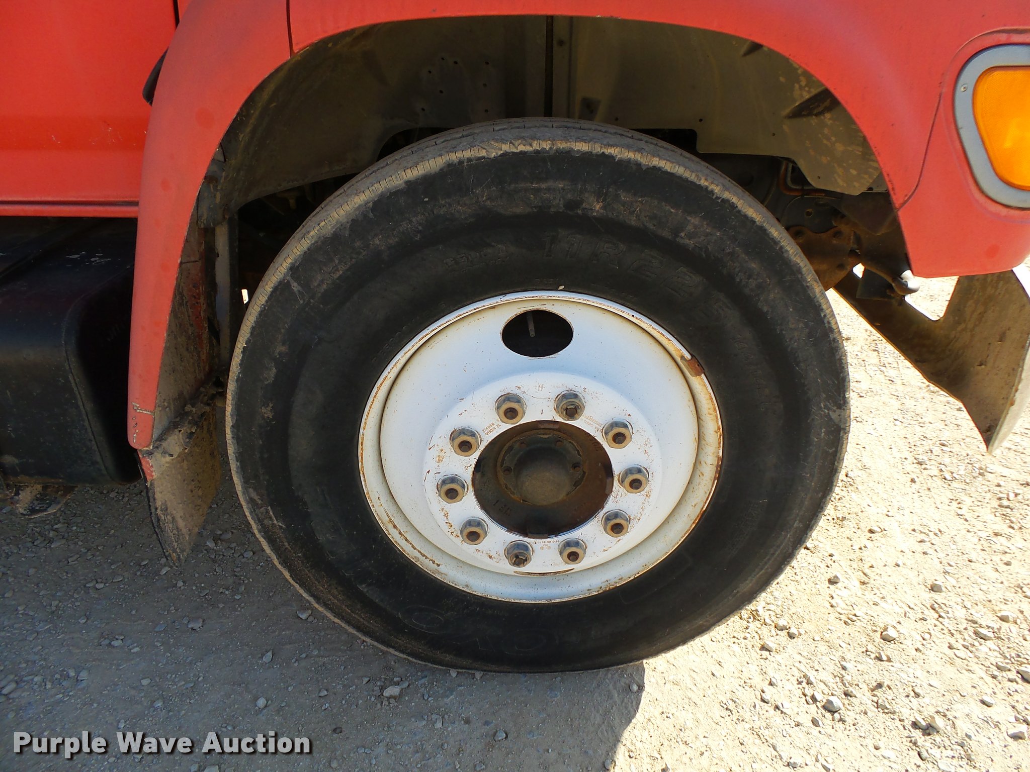 Purple Wave is selling a used Flat Bed Truck in Arkansas. This item is a 1995 Ford F800 Super Duty flatbed truck with the following: 86,879 miles on odometer, Cummins ISB 5.9L L6 turbo diesel engine, Nine speed manual transmission, Tandem axle, AC and heat, AM/FM, Spring suspension seat, Front tow hooks, 14'L x 8'W steel flatbed, Stake side pockets, Storage boxes, Headache rack, Pintle hitch, Trailer wiring, 700 gallon poly tank, Dual fuel tanks, 177" wheelbase, Spring suspension, Air brakes, 11R22.5 front tires, 10R22.5 rear tires, GVWR 27,000 lbs