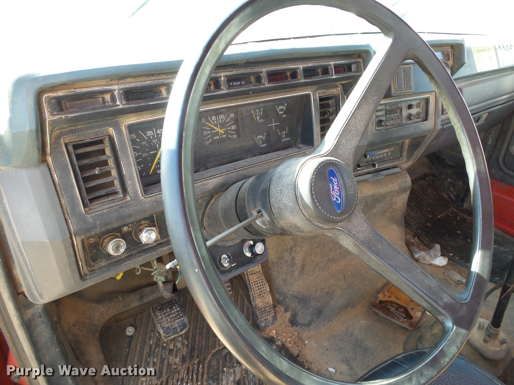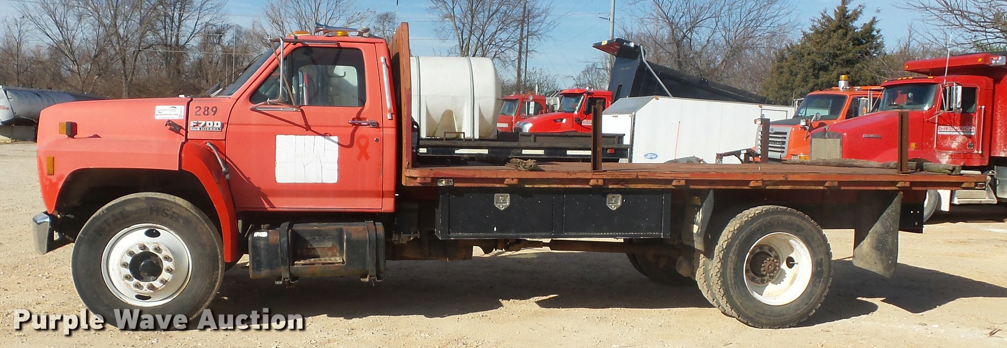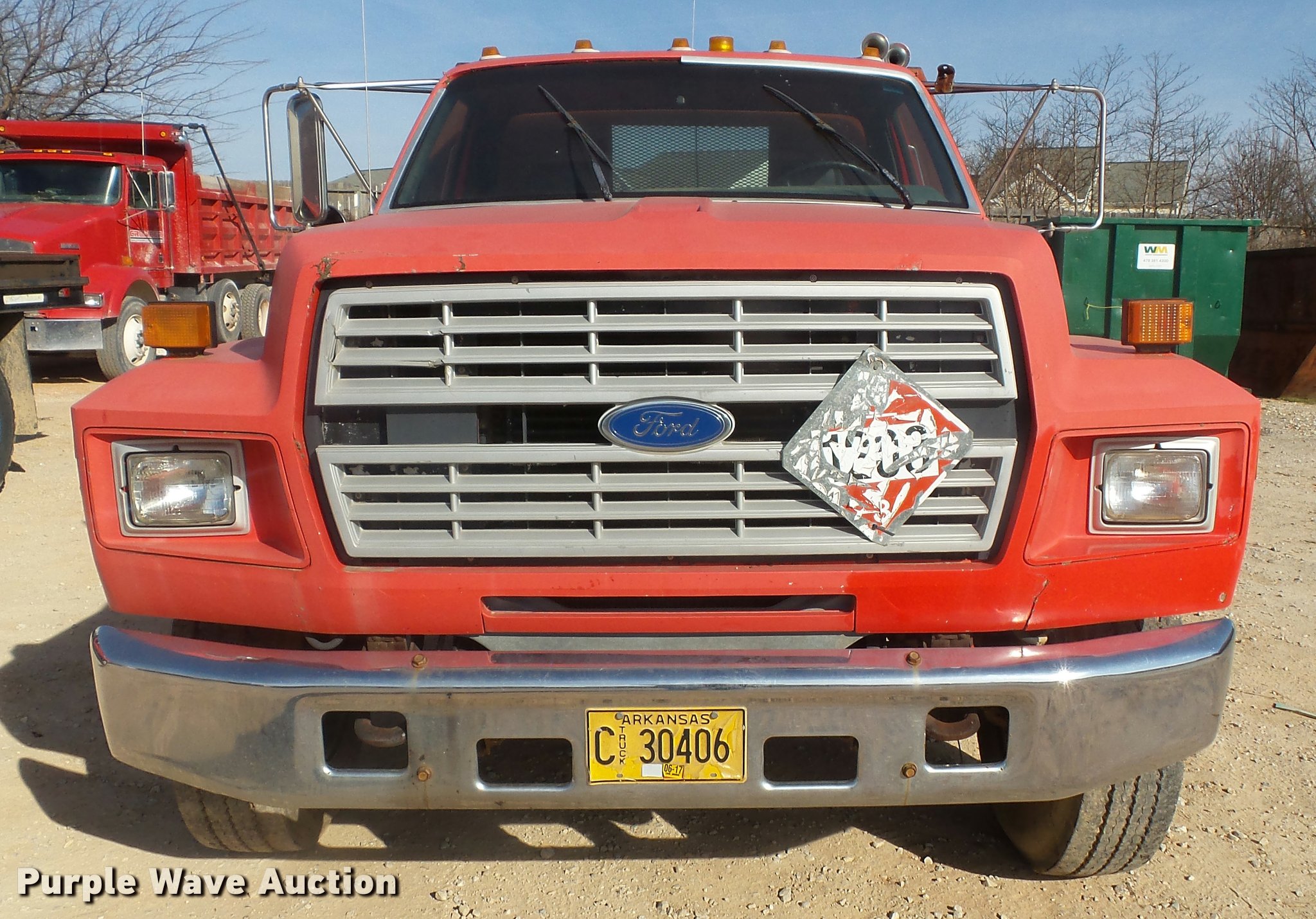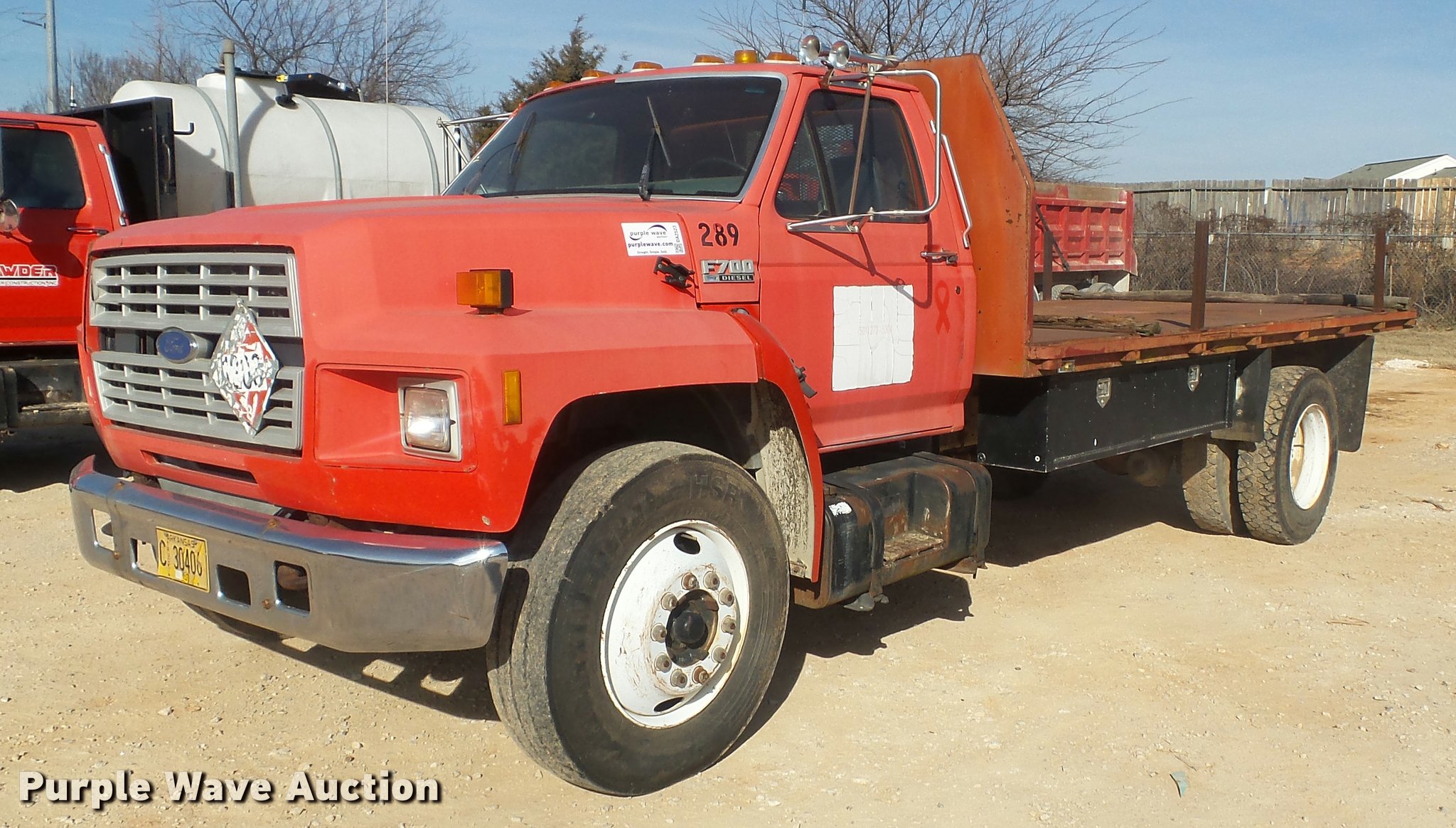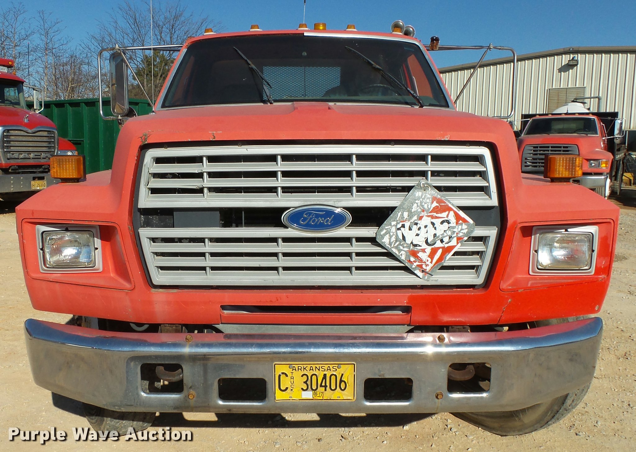 Purple Wave is selling a used Flat Bed Truck in Arkansas. This item is a 1994 Ford F700 flatbed truck with the following: 248,862 miles on odometer, Cummins ISB 5.9L L6 turbo diesel engine, Five speed manual transmission, Single axle, AC and heat, AM/FM, Air suspension seat, Front tow hooks, 16'L x 91"W steel flatbed, Stake side pockets, Headache rack, Toolbox, Dual fuel tanks, 189" wheelbase, Spring suspension, Air brakes, 275/80R22.5 front tires, 10R22.5 rear tires, GVWR 26,000 lbs, Tread separating on one tire, Driver side mirror missing