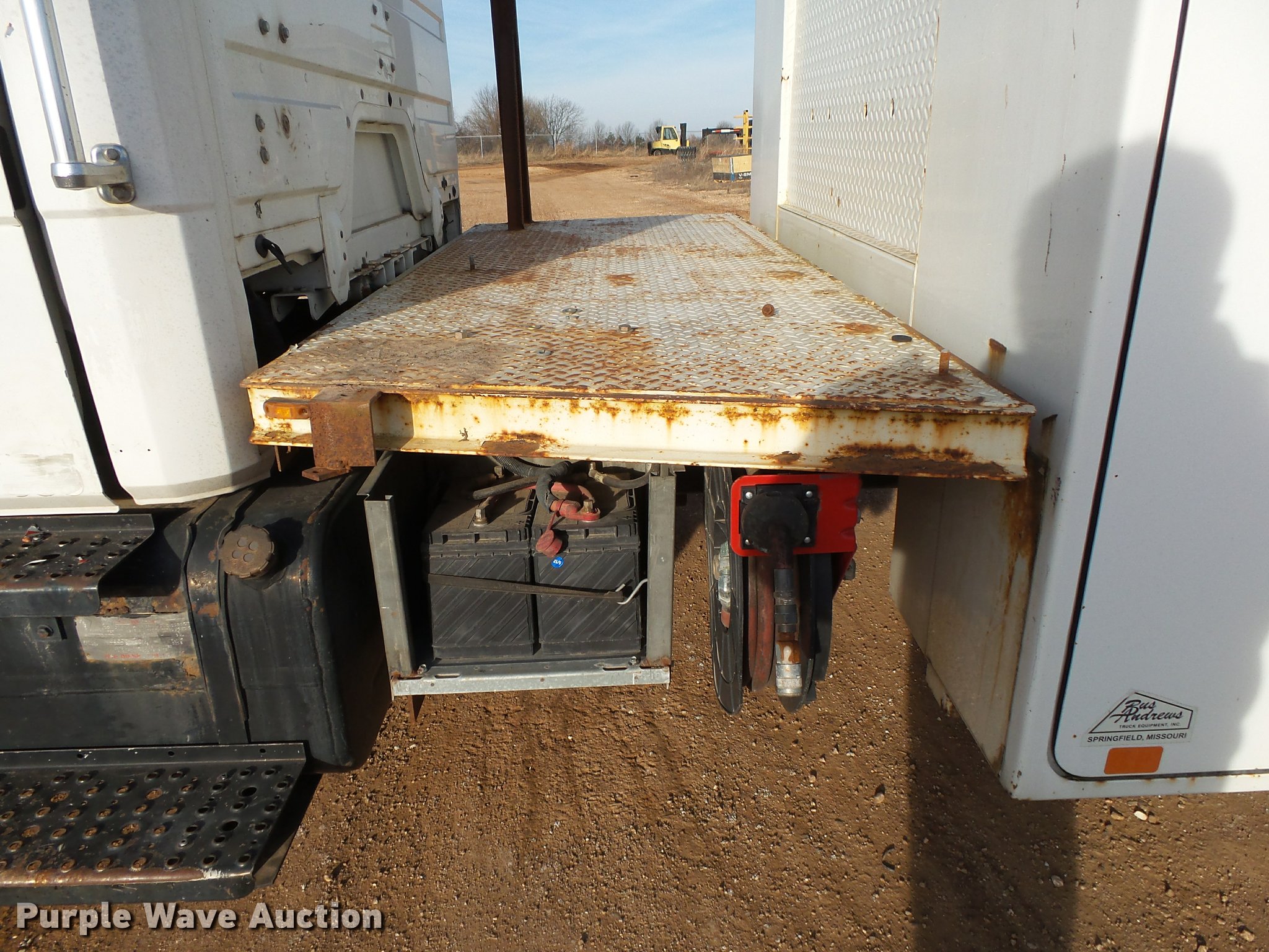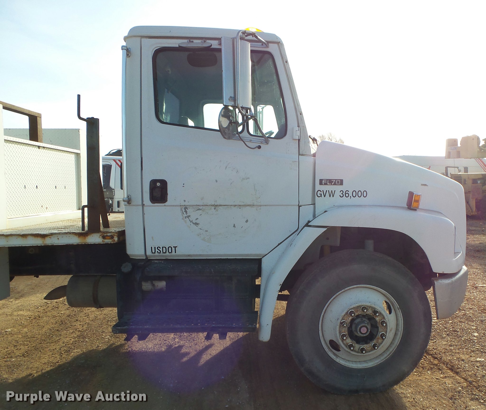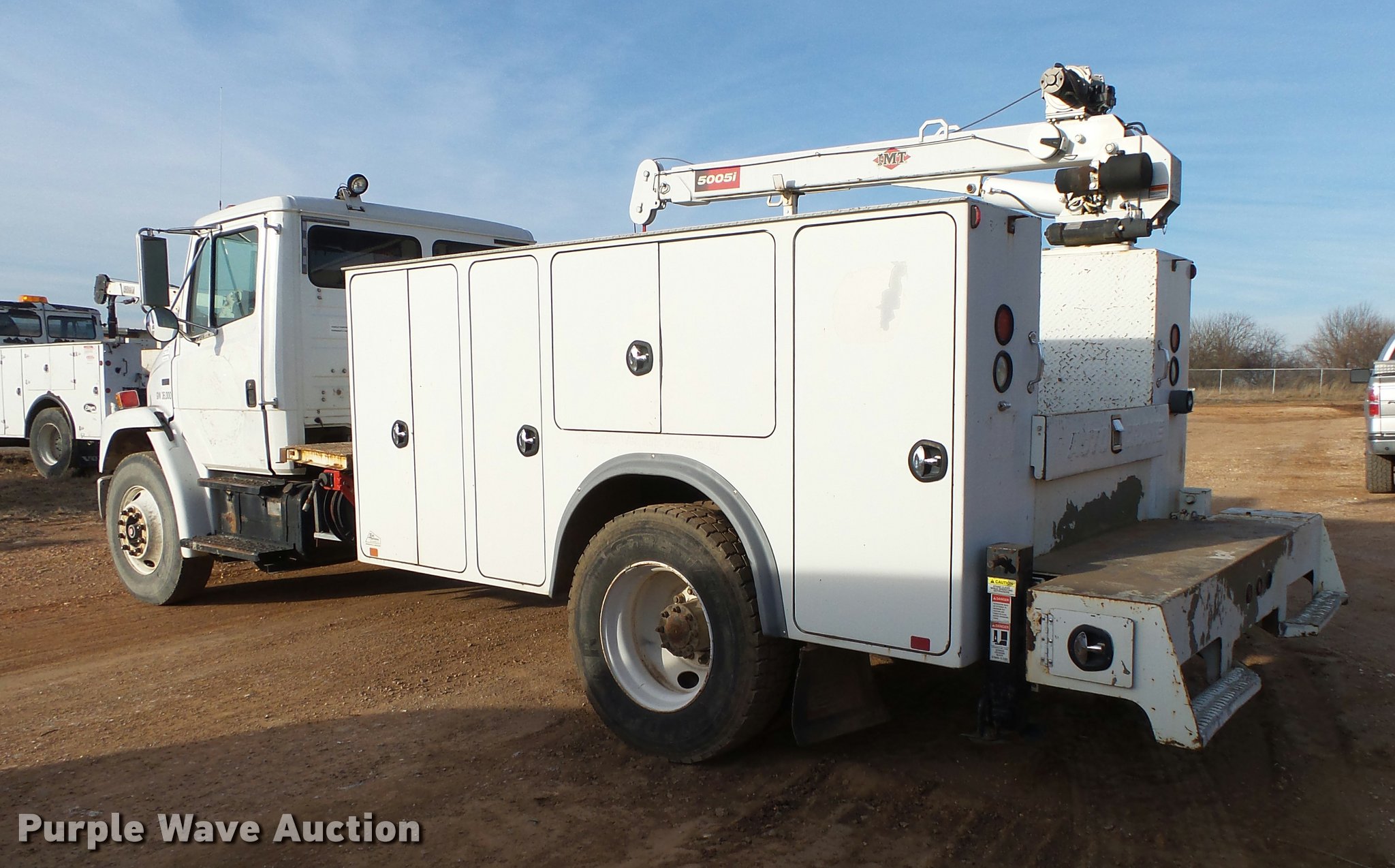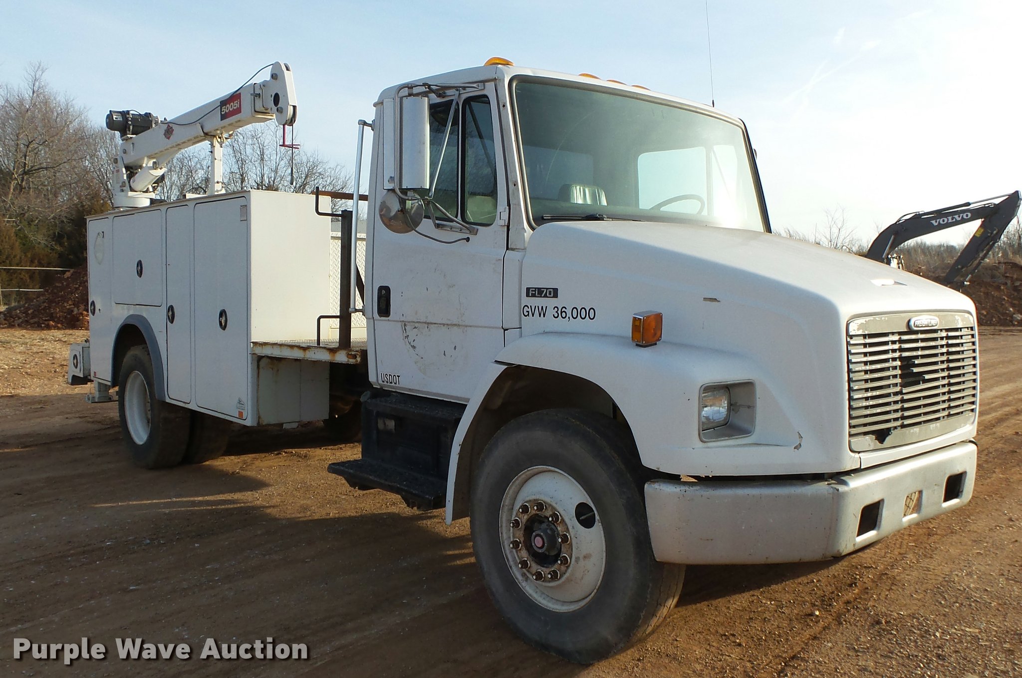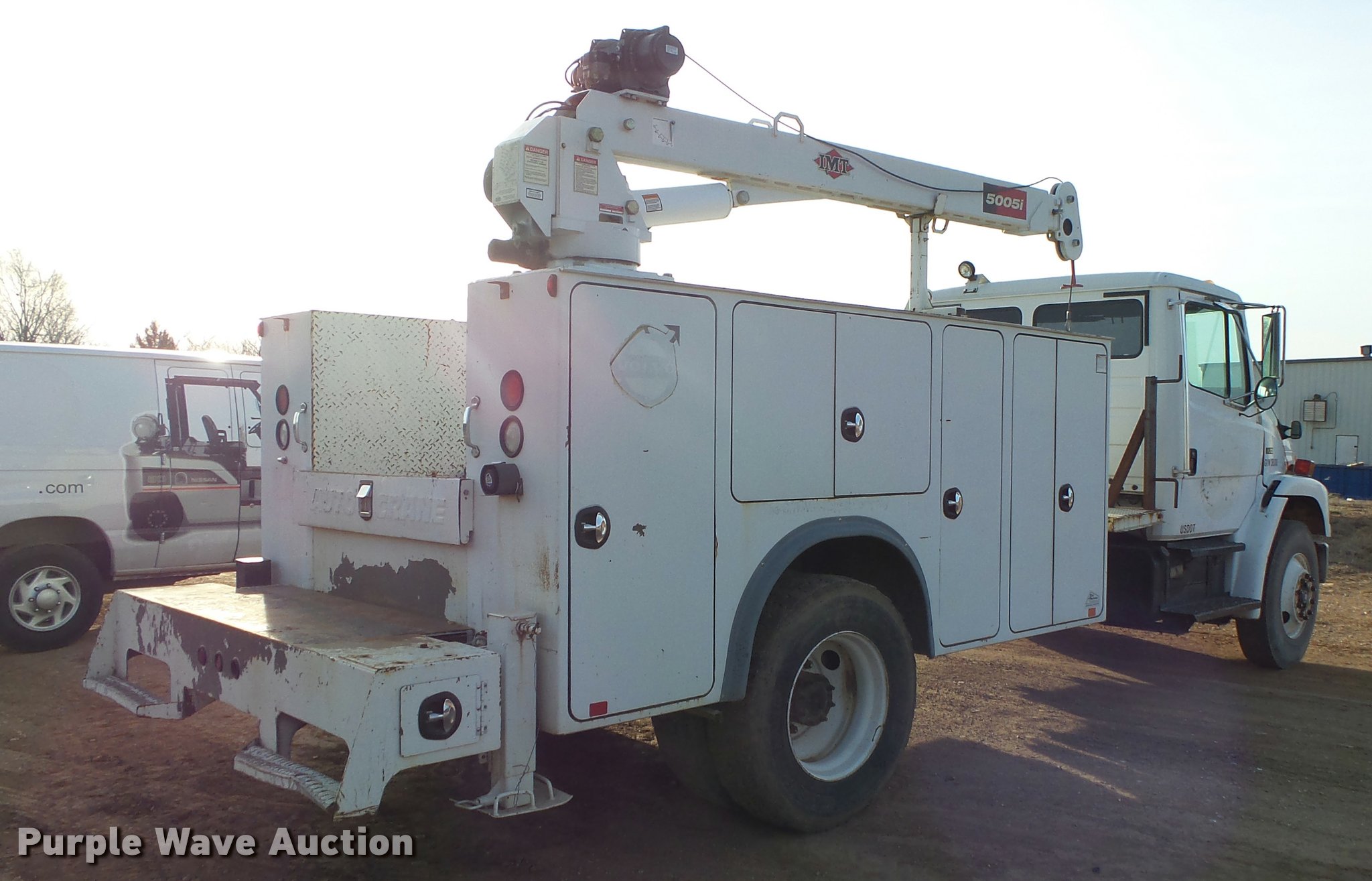 Purple Wave is selling a used Service Truck in Missouri. This item is a 1999 Freightliner FL70 service truck with crane with the following: 66,487 miles on odometer, Cummins ISC 8.3L L6 turbo diesel engine, Eaton Fuller nine speed manual transmission, Single axle, Heat, Heated mirrors, Suspension seat, Autocrane 50K service bed, Work lights, Air compressor, Hose reel, IMT 5005i crane, 2,500 lbs maximum lift capacity, 20' boom length, (2) outriggers, Remote control, Dual fuel tanks, Spring suspension, Air brakes, 11R22.5 front tires, 295/75R22.5 rear tires, GVWR 30,000 lbs, Bed is not wired, Crane is not wired, Unit# 77