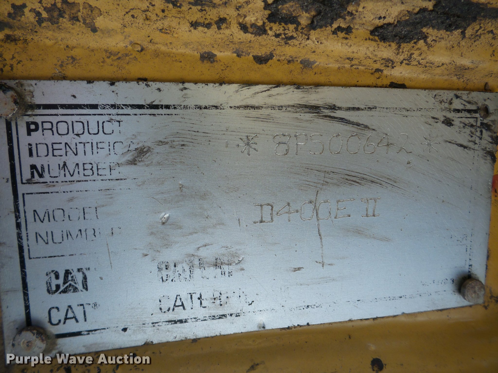 2000 Caterpillar D400E II haul truck. 23,507 hours on meter, Caterpillar 3406E six cylinder turbo diesel engine Serial 9AP00892, Powershift transmission 4F-1R gears, AC and heat, AM/FM/cassette, Air suspension seat, Approximately 18'L x 11'W x 64"H bed, Hydraulic brakes, 29.5R25 tires, Serial 08D500642. Northern Lines Contracting. 11039 Lamont Ave NE. Hanover, MN 55341