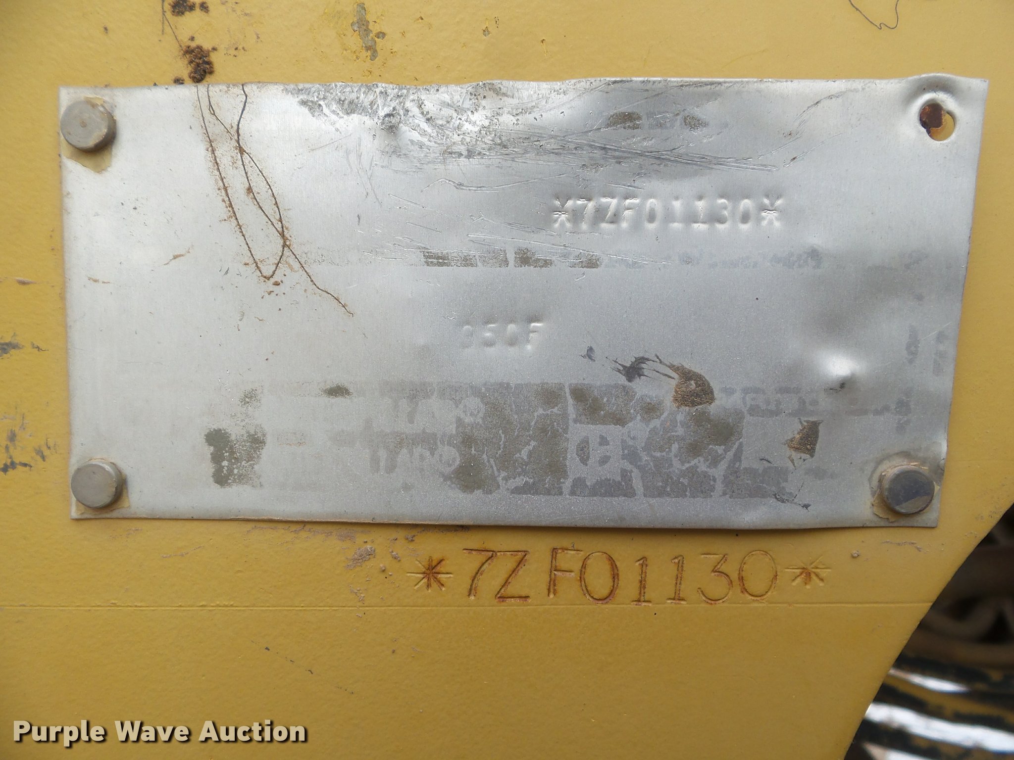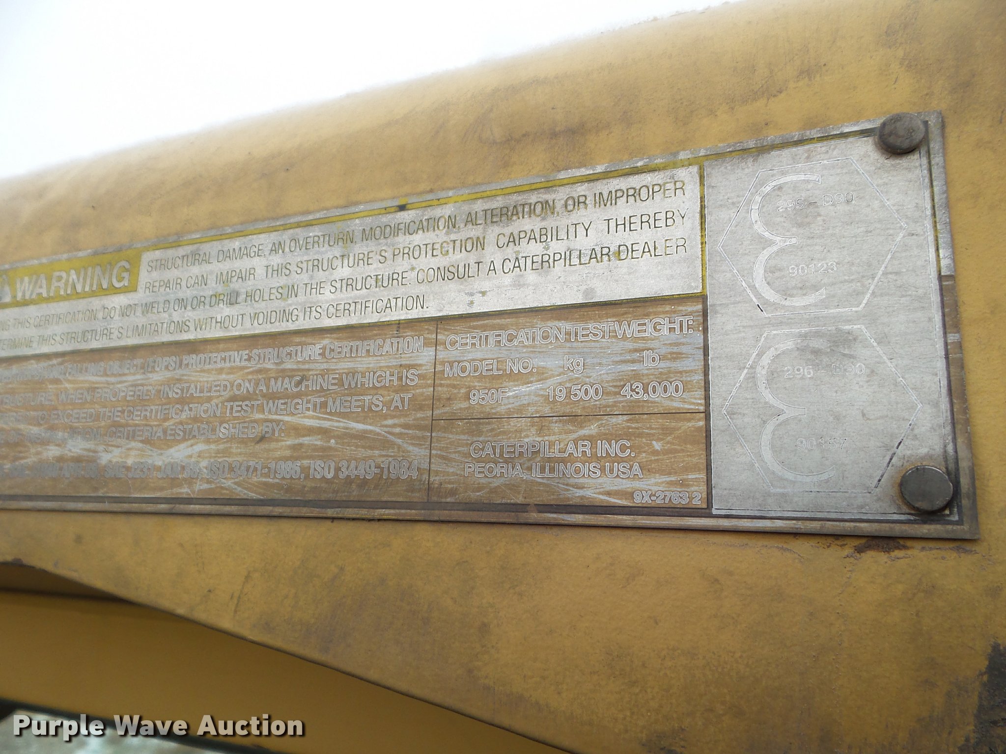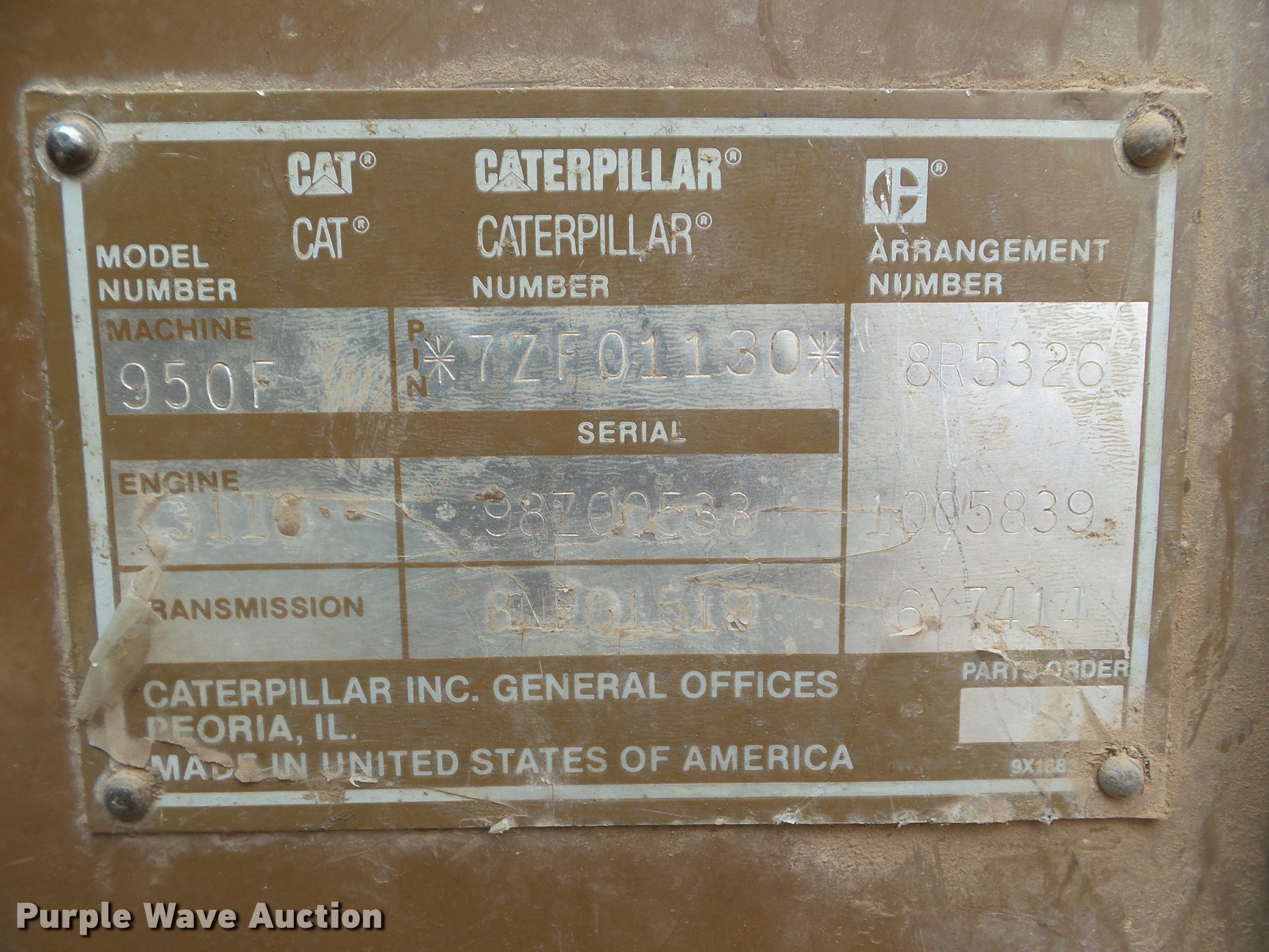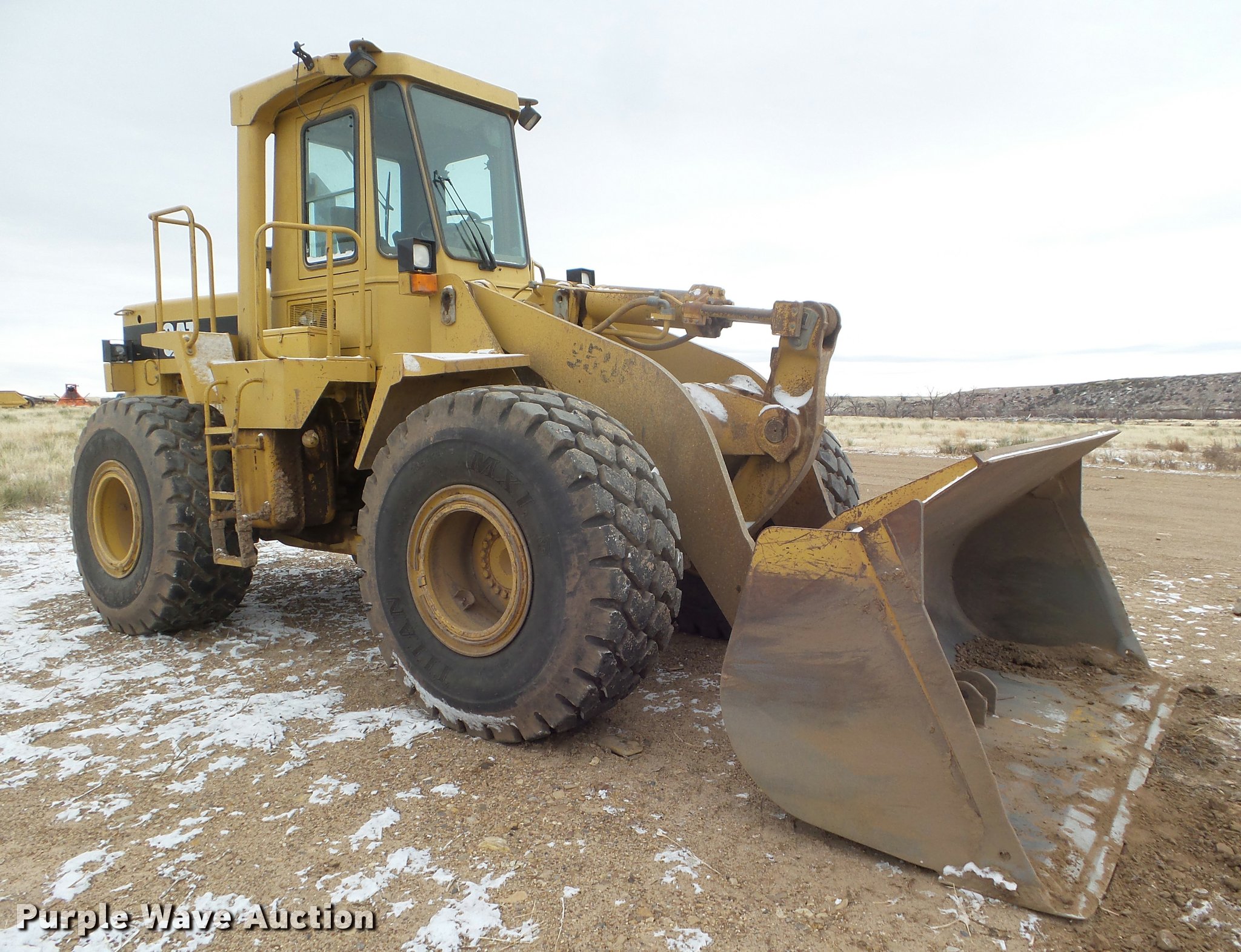 Purple Wave is selling a used Wheel Loader in Oklahoma. This item is a 1992 Caterpillar 950F wheel loader with the following: 10,623 hours on meter, Caterpillar 3110 six cylinder turbo diesel engine, Powershift transmission, 4F-4R gears, EROPS, AC and heat, AM/FM, Tilt steering wheel, Suspension seat, Two-lever bucket controls, Wipers, Front and rear work lights, 110"W general purpose bucket, Bolt-on cutting edge, Self-leveling, Counterweights, 23.5R25 tires, Serial 7ZF01130
