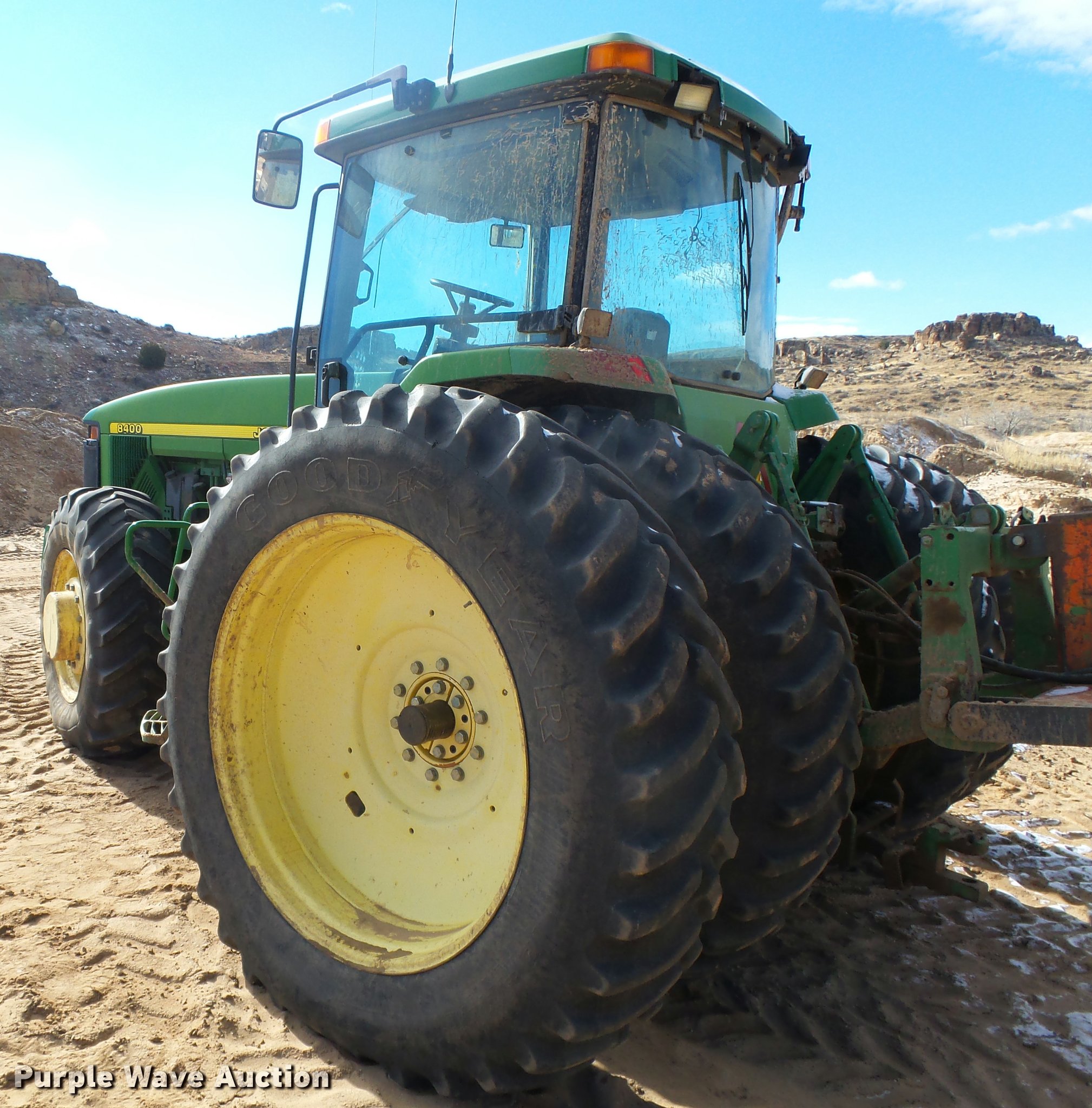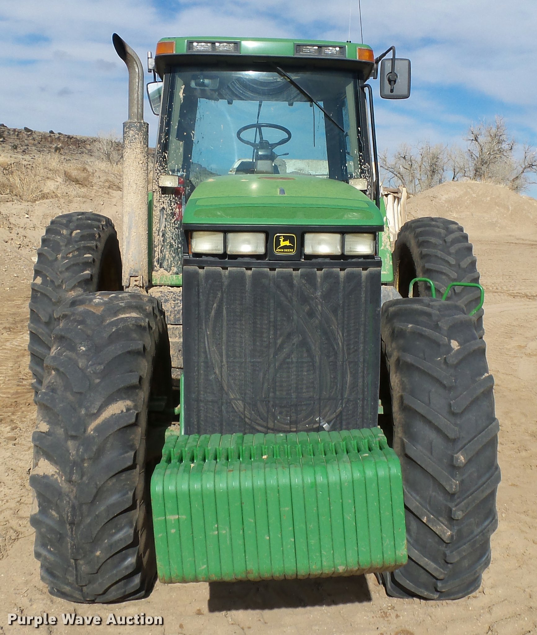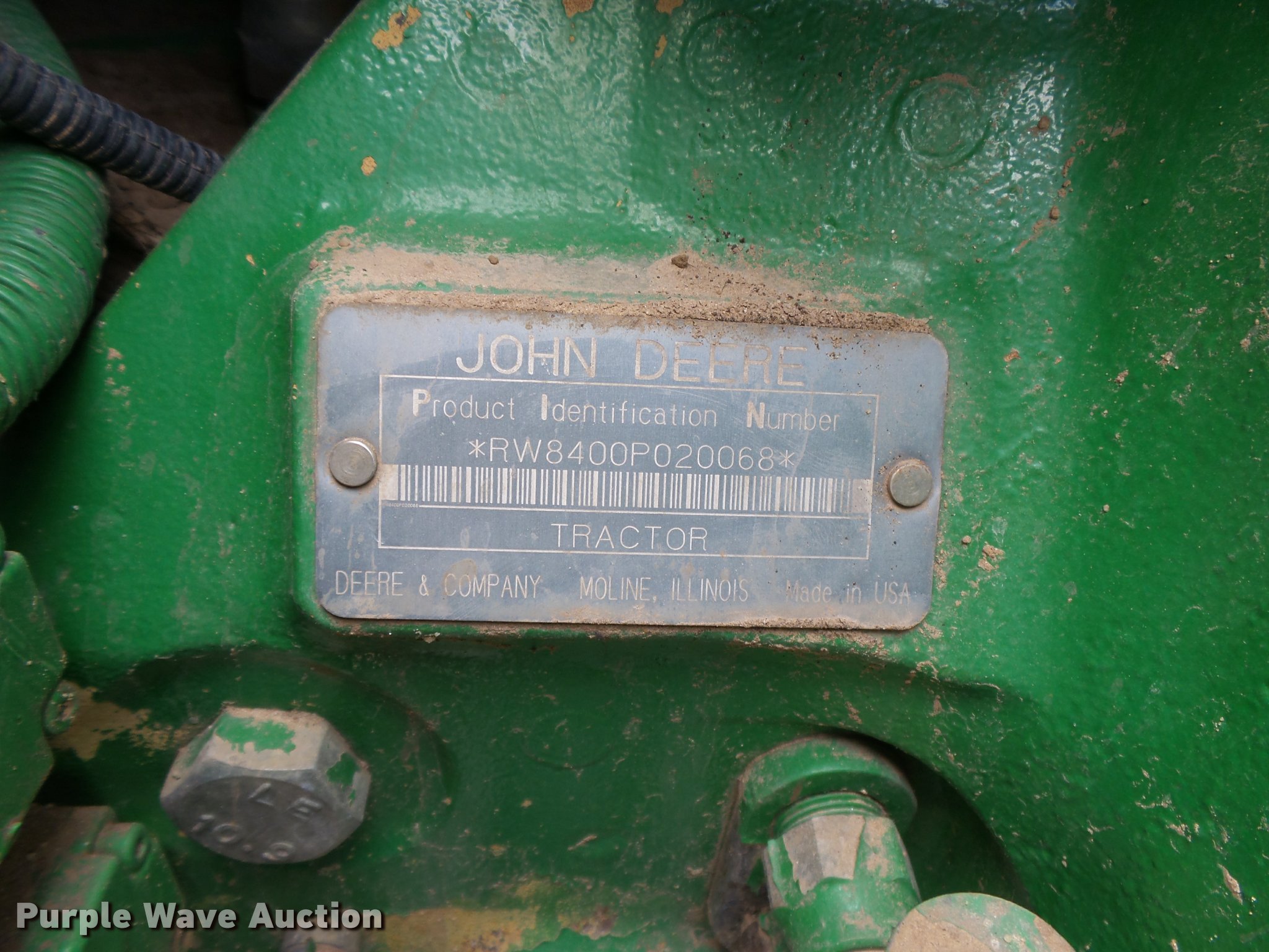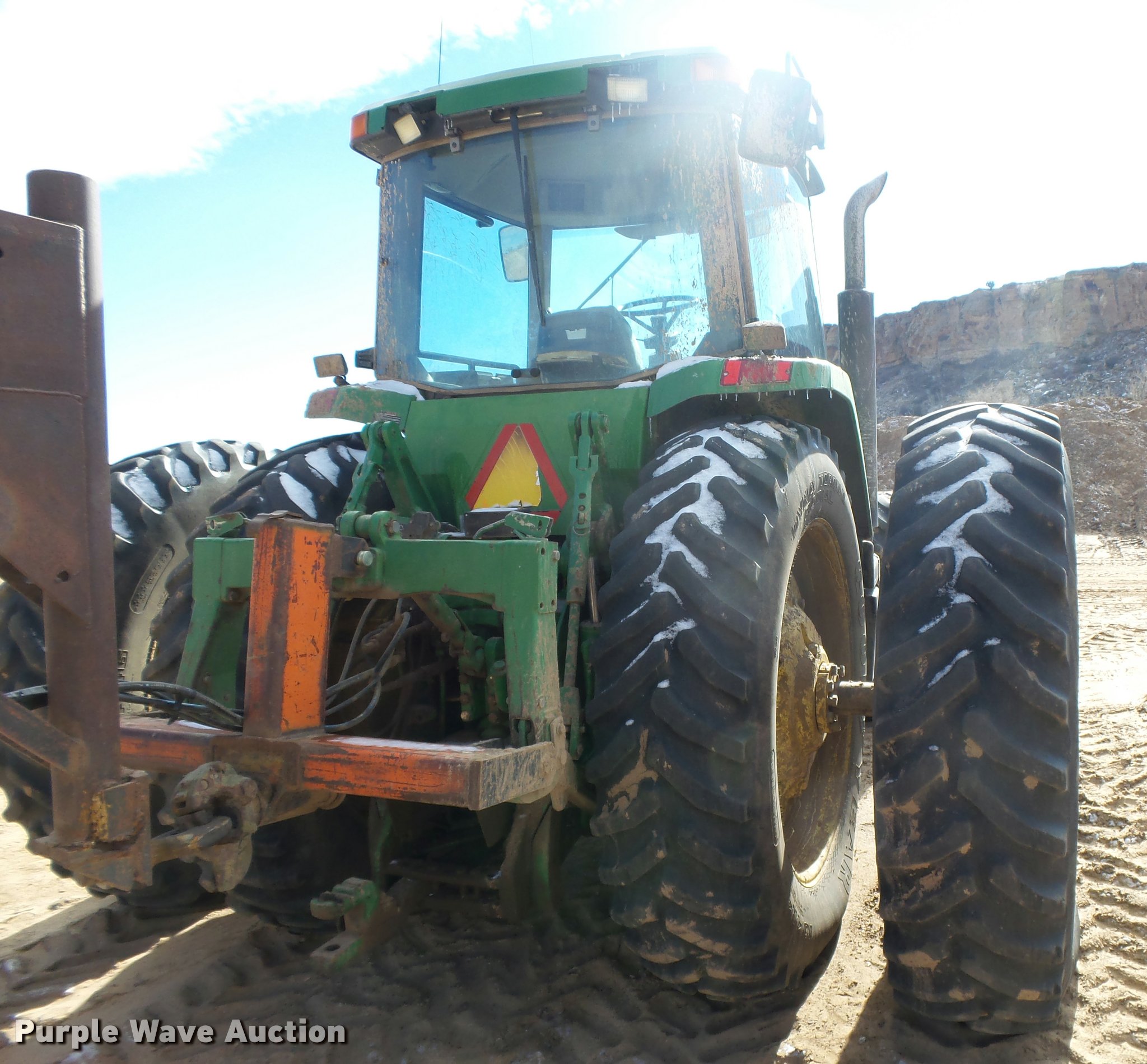 Purple Wave is selling a used Tractor in Oklahoma. This item is a 1998 John Deere 8400 MFWD tractor with the following: 8,168 hours on meter, John Deere 6081HRW01 8.1L six cylinder turbo diesel engine, Powershift transmission, 16F-4R gears, AC and heat, FM, Air suspension seat, Tilt steering wheel, Visors, Three point, Quick attach, Large 1000 PTO, Seven pin outlet, (4) rear hydraulic remote sets, (20) suitcase weights, One inner wheel weight per side, 240/90R30 front tires, 18.4R46 dual rear tires, Serial RW8400P020068