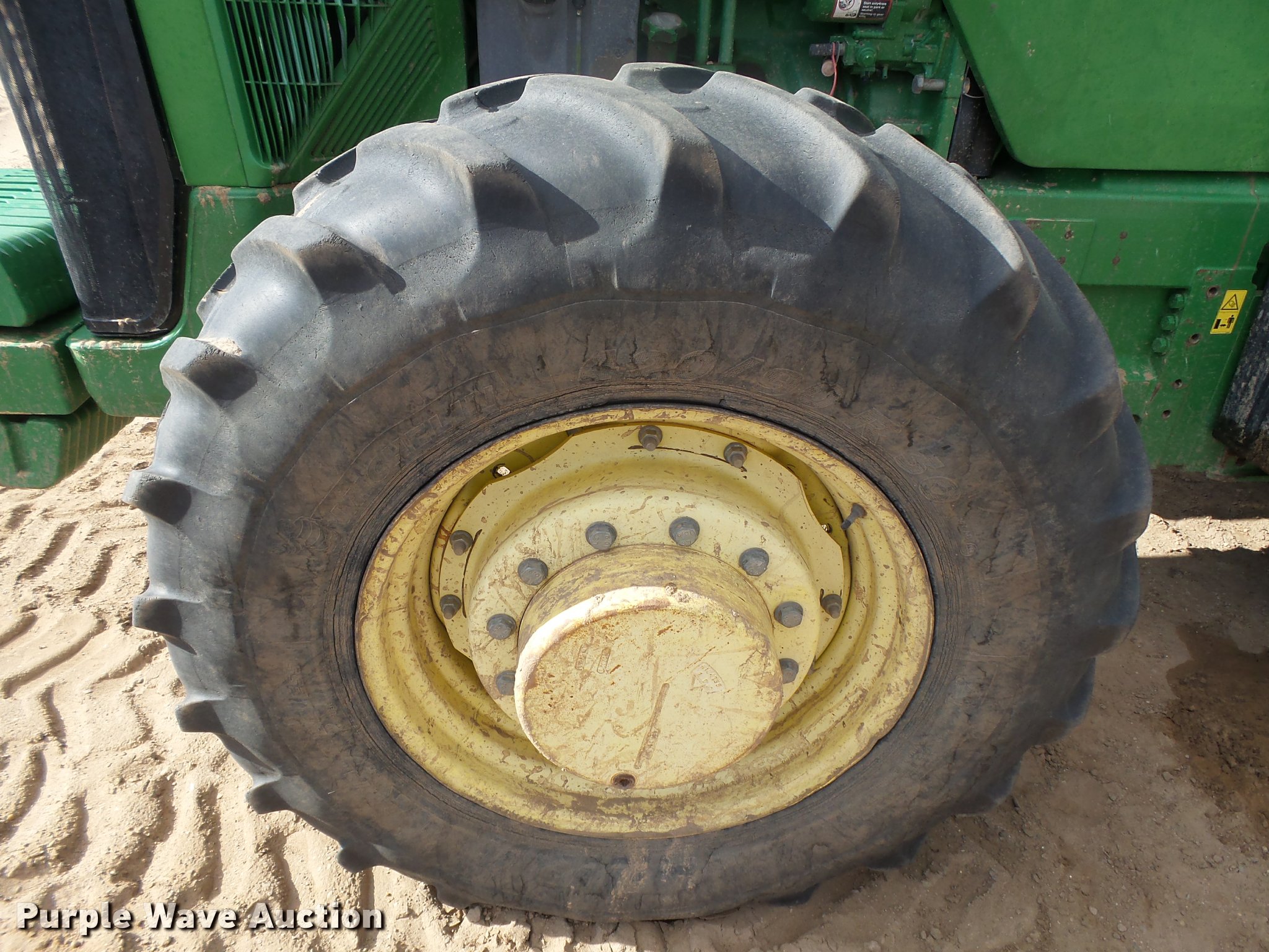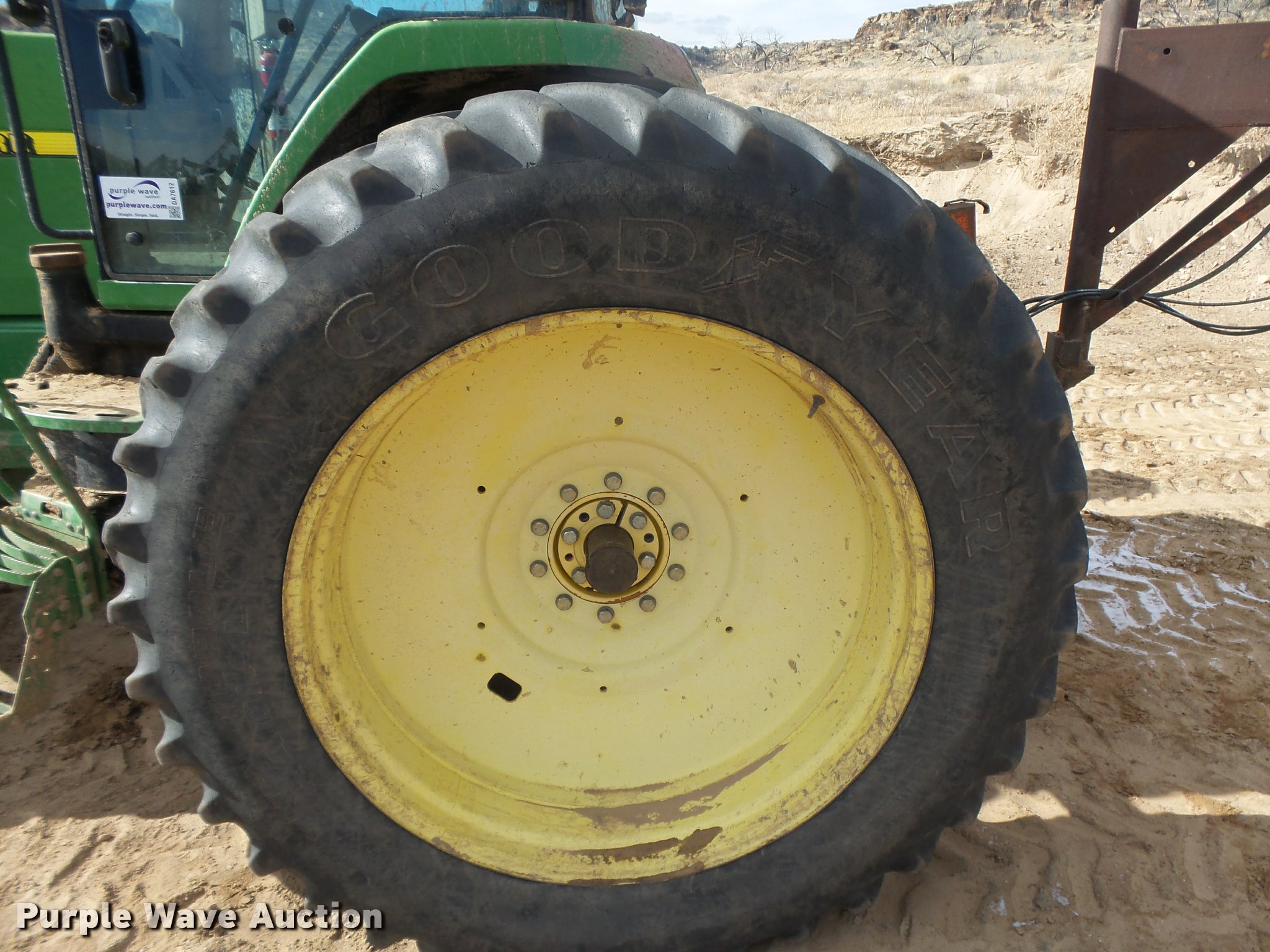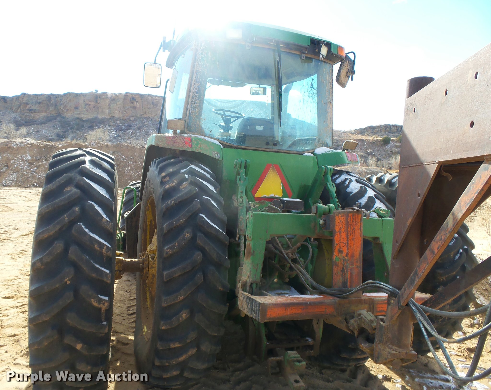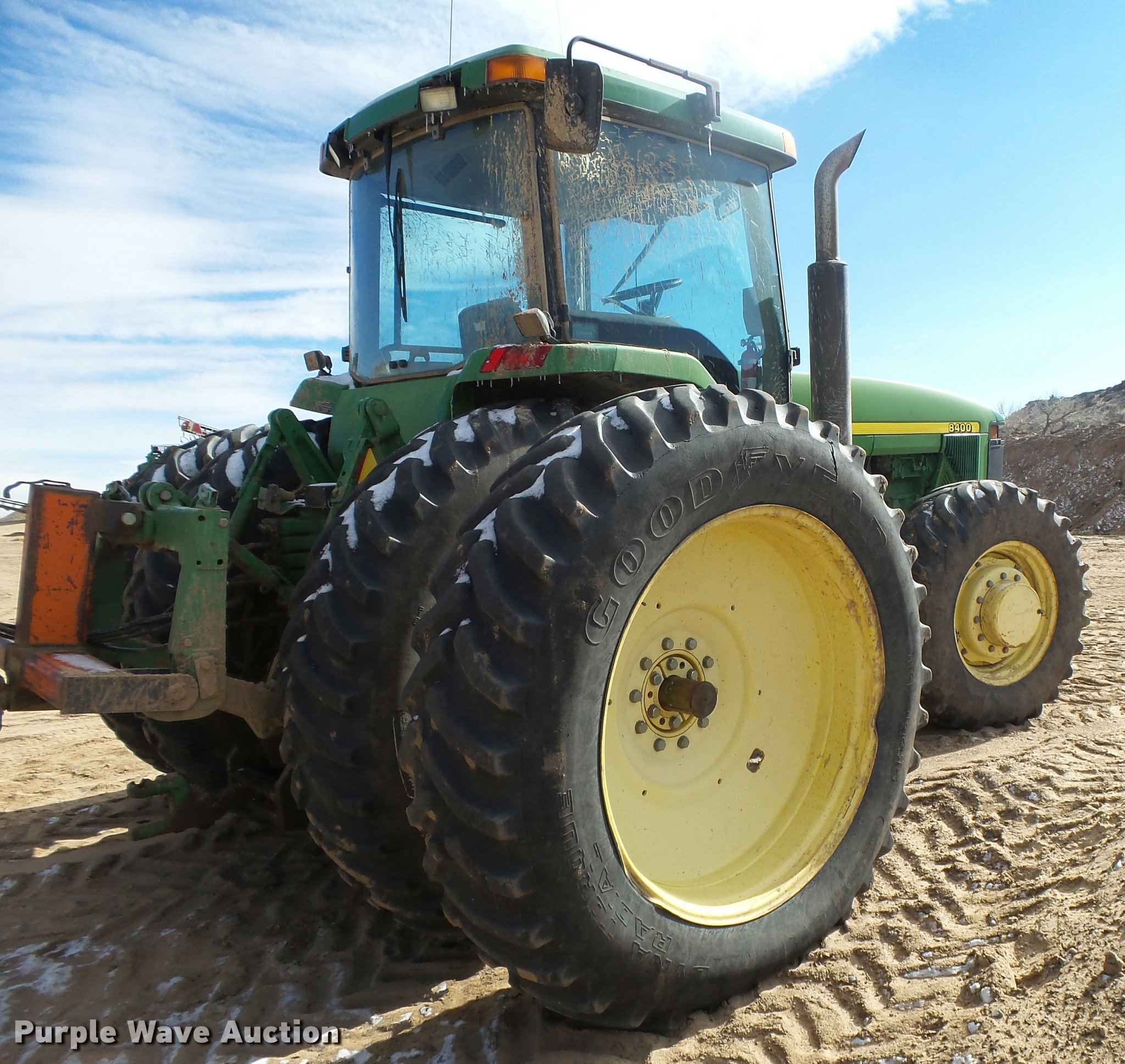 Purple Wave is selling a used Tractor in Oklahoma. This item is a 1998 John Deere 8400 MFWD tractor with the following: 8,168 hours on meter, John Deere 6081HRW01 8.1L six cylinder turbo diesel engine, Powershift transmission, 16F-4R gears, AC and heat, FM, Air suspension seat, Tilt steering wheel, Visors, Three point, Quick attach, Large 1000 PTO, Seven pin outlet, (4) rear hydraulic remote sets, (20) suitcase weights, One inner wheel weight per side, 240/90R30 front tires, 18.4R46 dual rear tires, Serial RW8400P020068