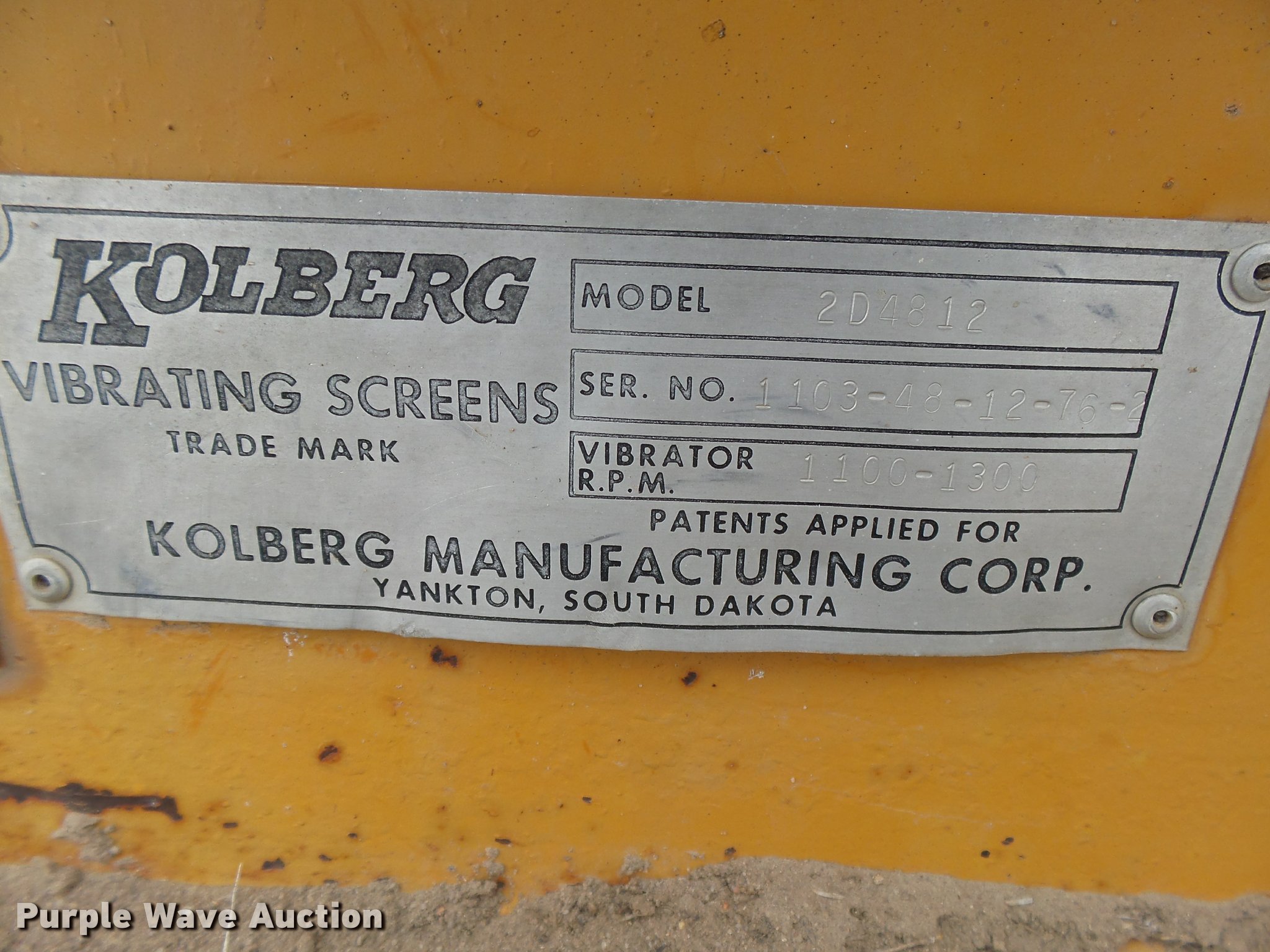 Purple Wave is selling a used Screen or Screening Plant in Oklahoma. This item is a Kolberg 2D4812 vibrating screen with the following: 12'L x 48"W, 1,100 to 1,300 RPM, Additional conveyor rollers, Serial 1103-48-12-76-2