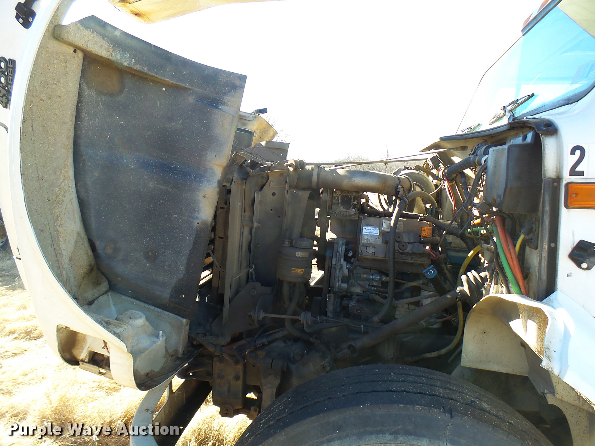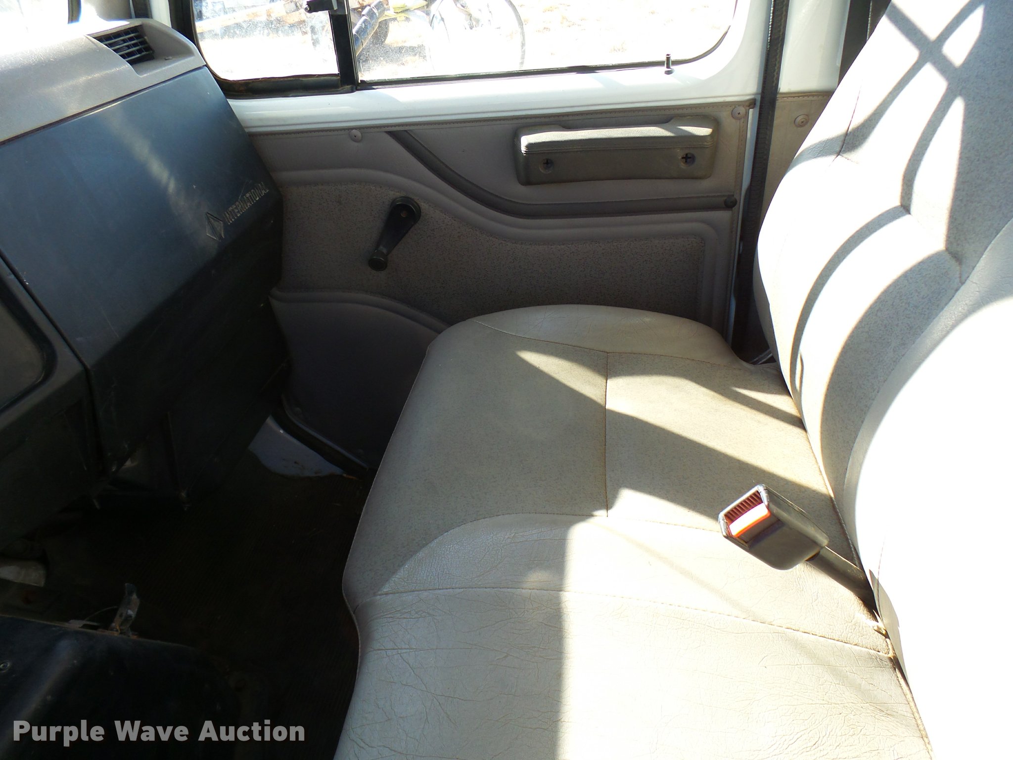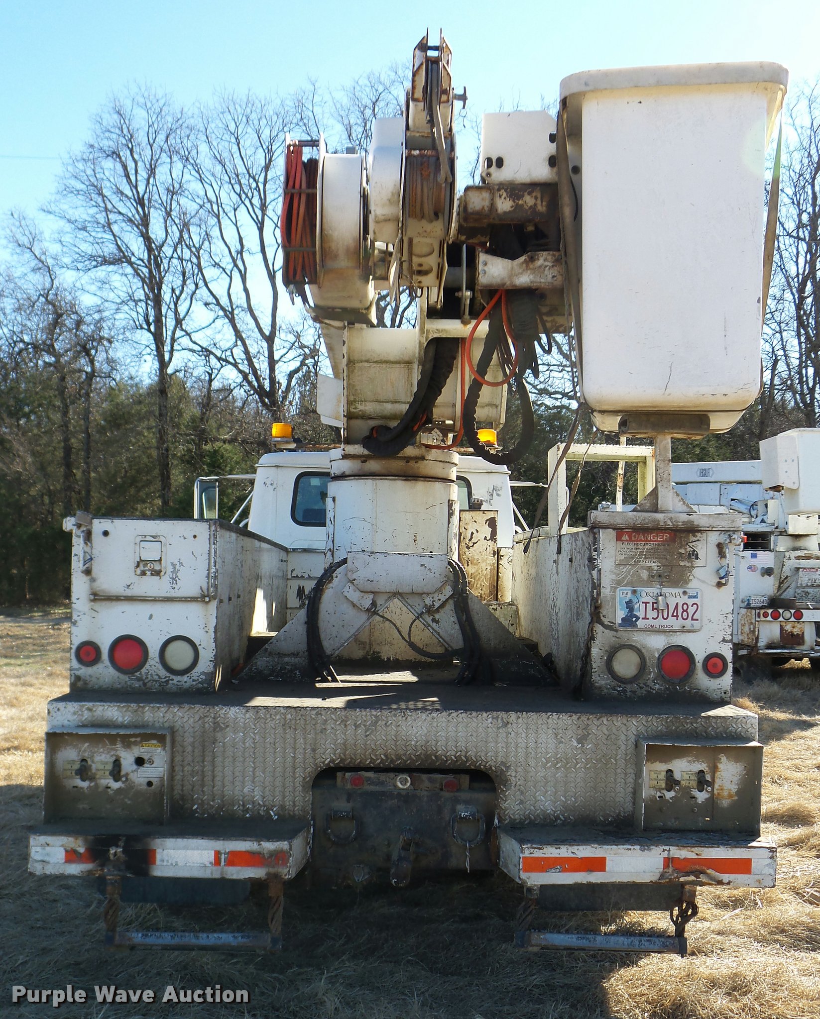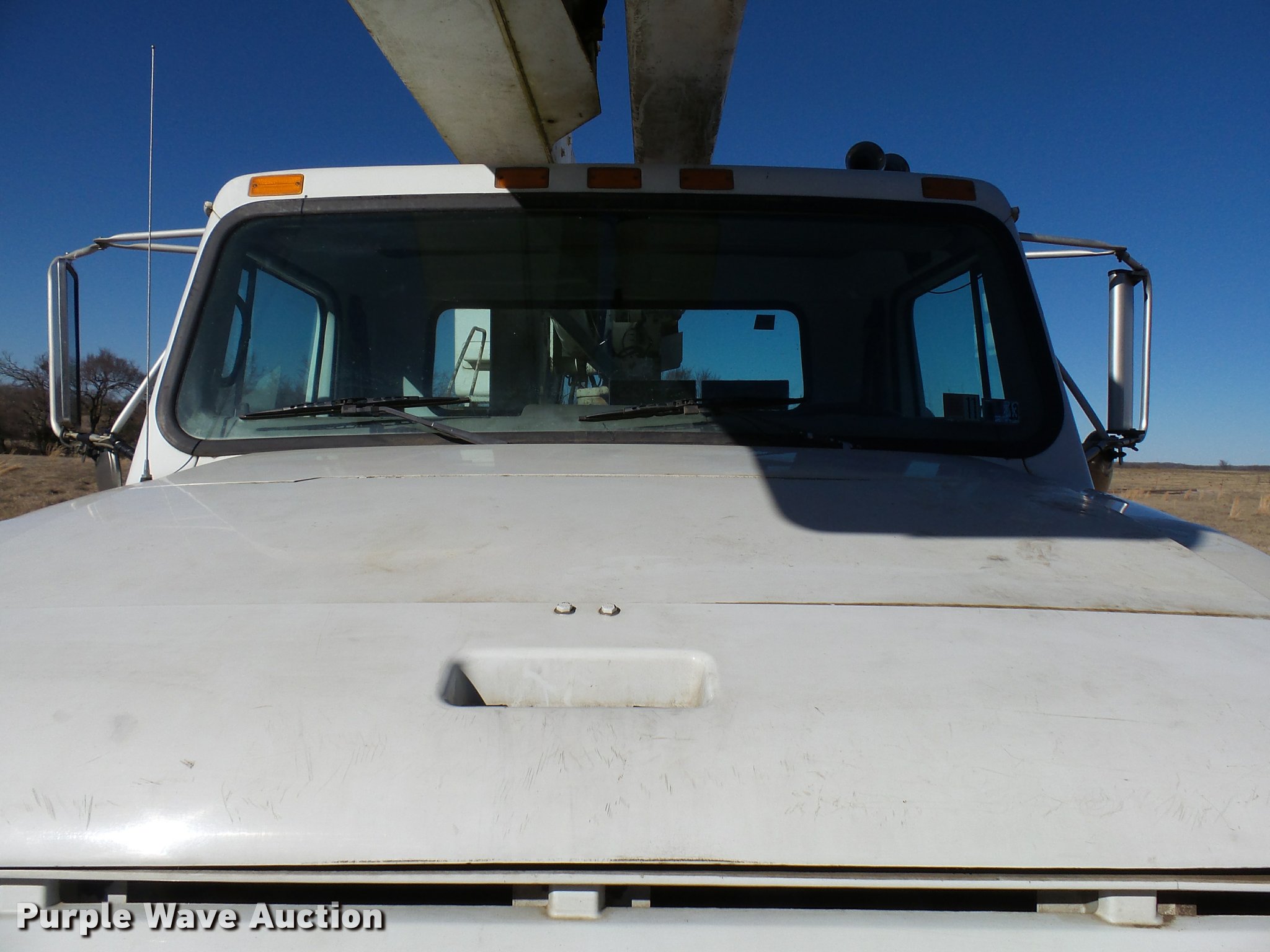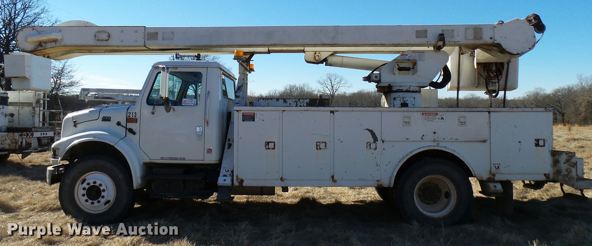 Purple Wave is selling a used Digger Derrick Truck in Oklahoma. This item is a 2001 International 4900 bucket truck material handler with the following: 61,134 miles on odometer, 6,715 hours on meter, International DT466E 7.6L L6 turbo diesel engine, Allison automatic transmission, Single axle, AC and heat, AM/FM, Suspension seat, Auxiliary controls, Front tow hooks, Beacon light, PTO, Reading 2AT174ADW service bed, 16'L, Catwalk, Air outlet, Serial B430049, 2000 Versalift V0355MH1 digger derrick, 50' boom length, 600 lbs max lift capacity, Two man basket, 55' max lift height, Platform boom controls, Boom rotation, Material handler, Articulating insulated boom, (4) outriggers, Serial DB0020, Dual fuel tanks, Spring suspension, Air brakes, 188" wheelbase, Goodyear 11R22.5 tires, GVWR 35,000 lbs, Left front headlight missing, Unit# 213