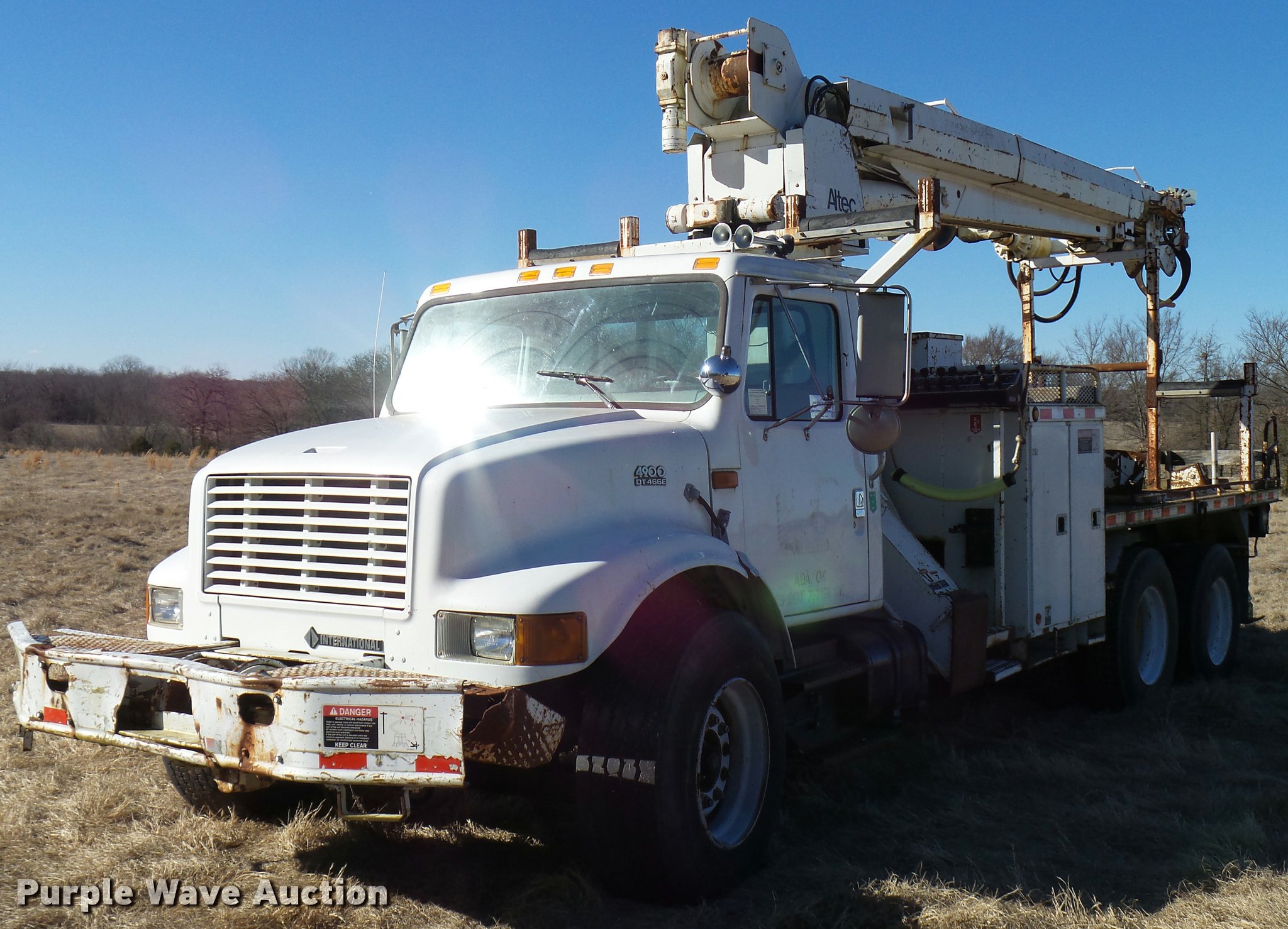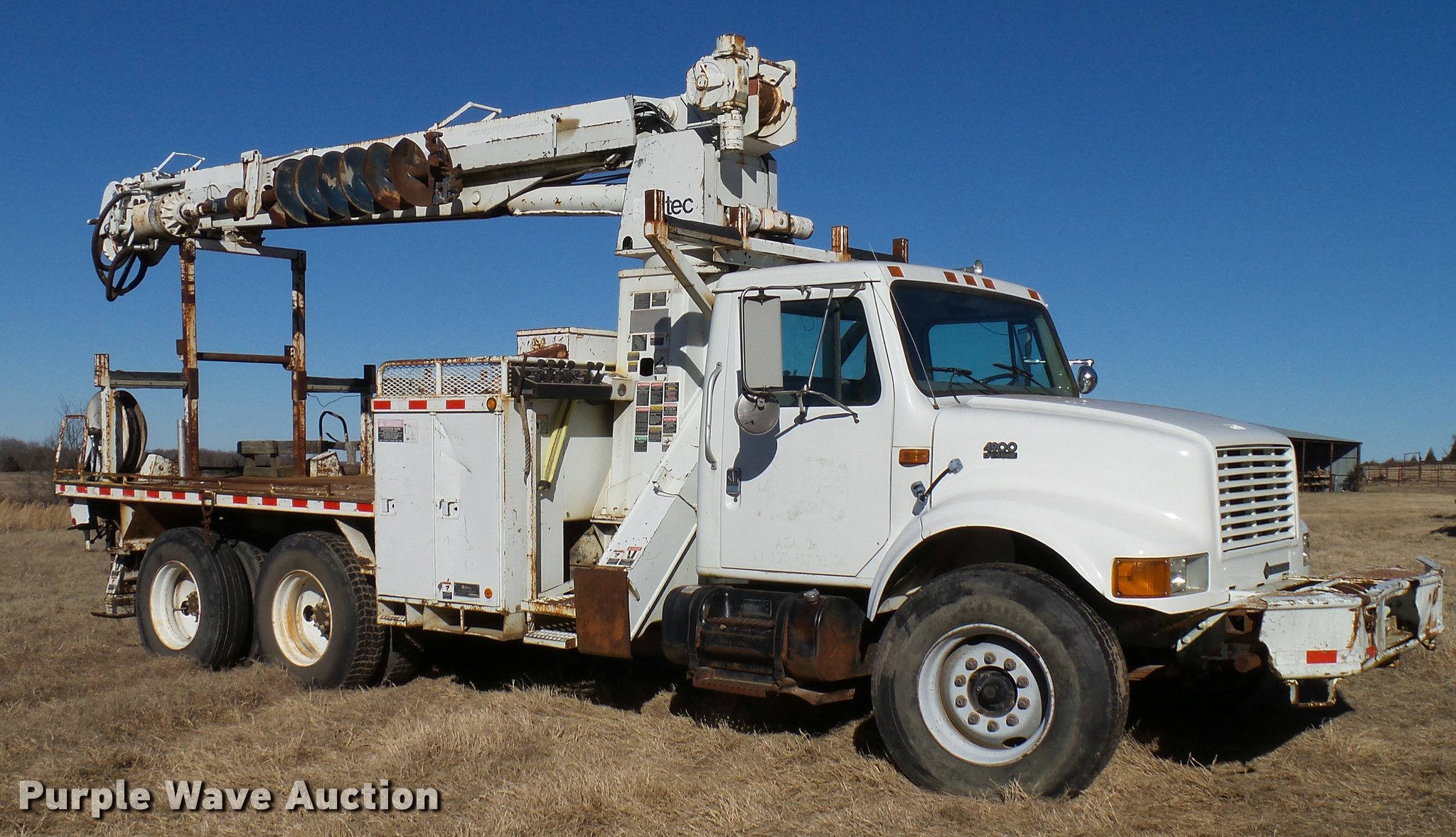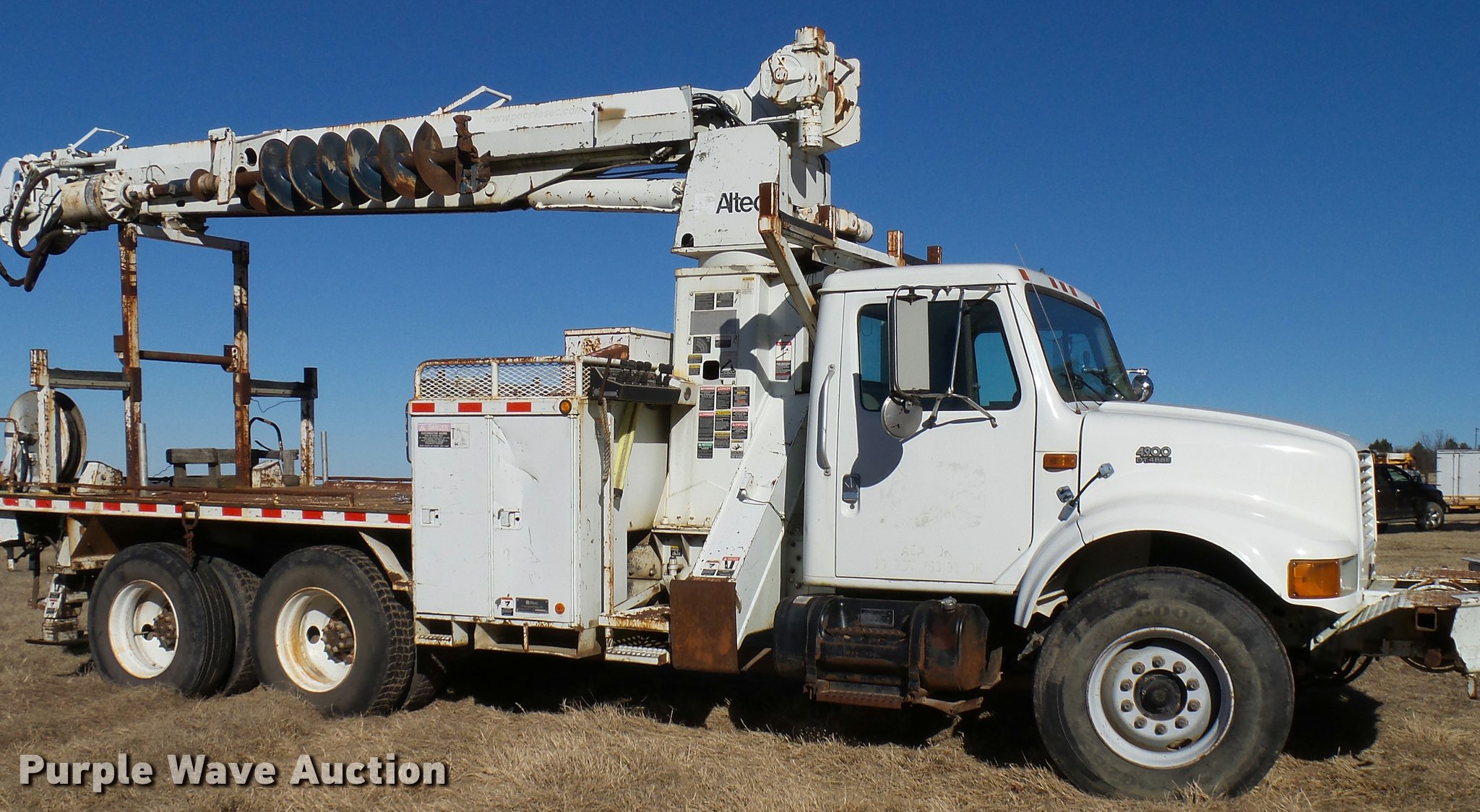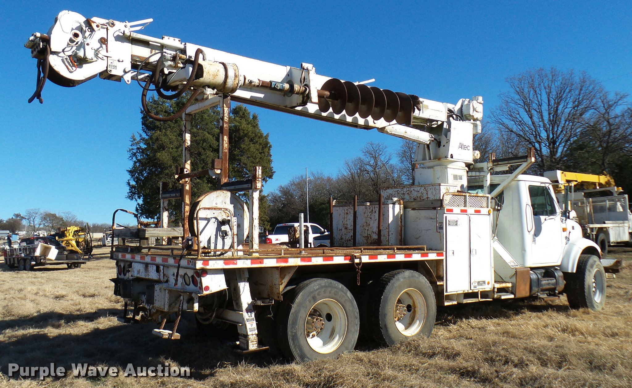 Purple Wave is selling a used Digger Derrick Truck in Oklahoma. This item is a 1998 International 4900 digger derrick truck with the following: 208,402 miles on odometer, International DT466E 7.6L L6 turbo diesel engine, Allison automatic transmission, Tandem axle, AC and heat, Cruise, AM/FM/CD, Suspension seat, Spotlight, Auxiliary controls, Brake controller, Front tow hooks, Front winch and bumper, No coil on spool, Altec service bed, 18'L, Shelving, Utility rack, Serial 37-68245, 1997 Altec D945TB digger derrick, 45' boom length, 7,600 lbs max lift capacity, 52' max lift height, Platform boom controls, Boom rotation, Material handler, Pole guide, (2) pole racks, Articulating insulated telescopic boom, 18" diameter auger, (4) outriggers, Serial 0597BA1032, Pintle hitch, Trailer wiring, Spring suspension, Air brakes, 206" wheelbase, 385/65R22.5 front tires, 11R22.5 rear tires, Idle issues, possible computer issues