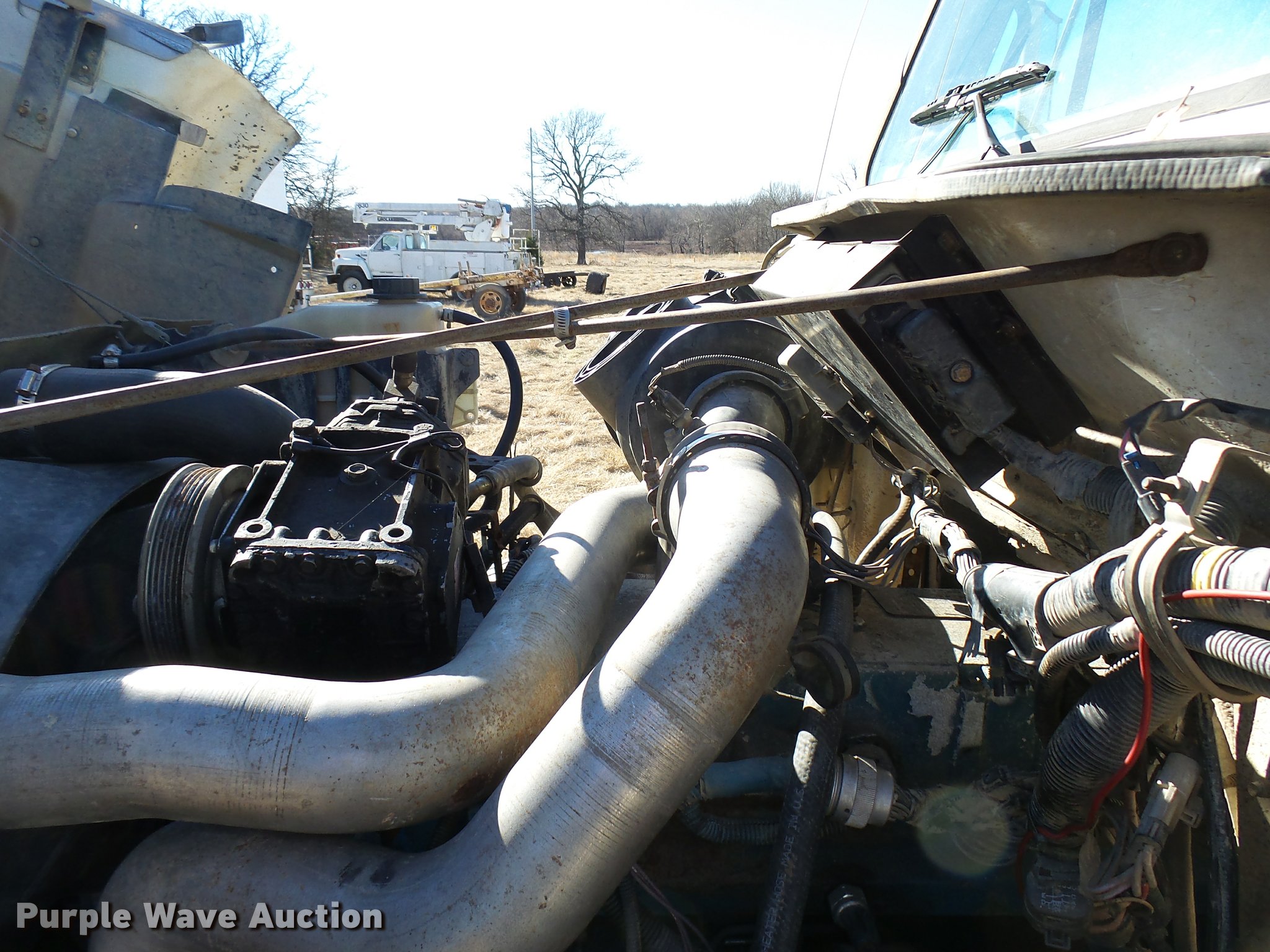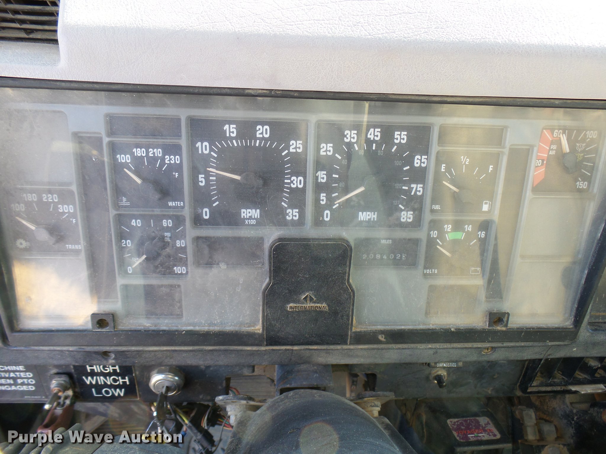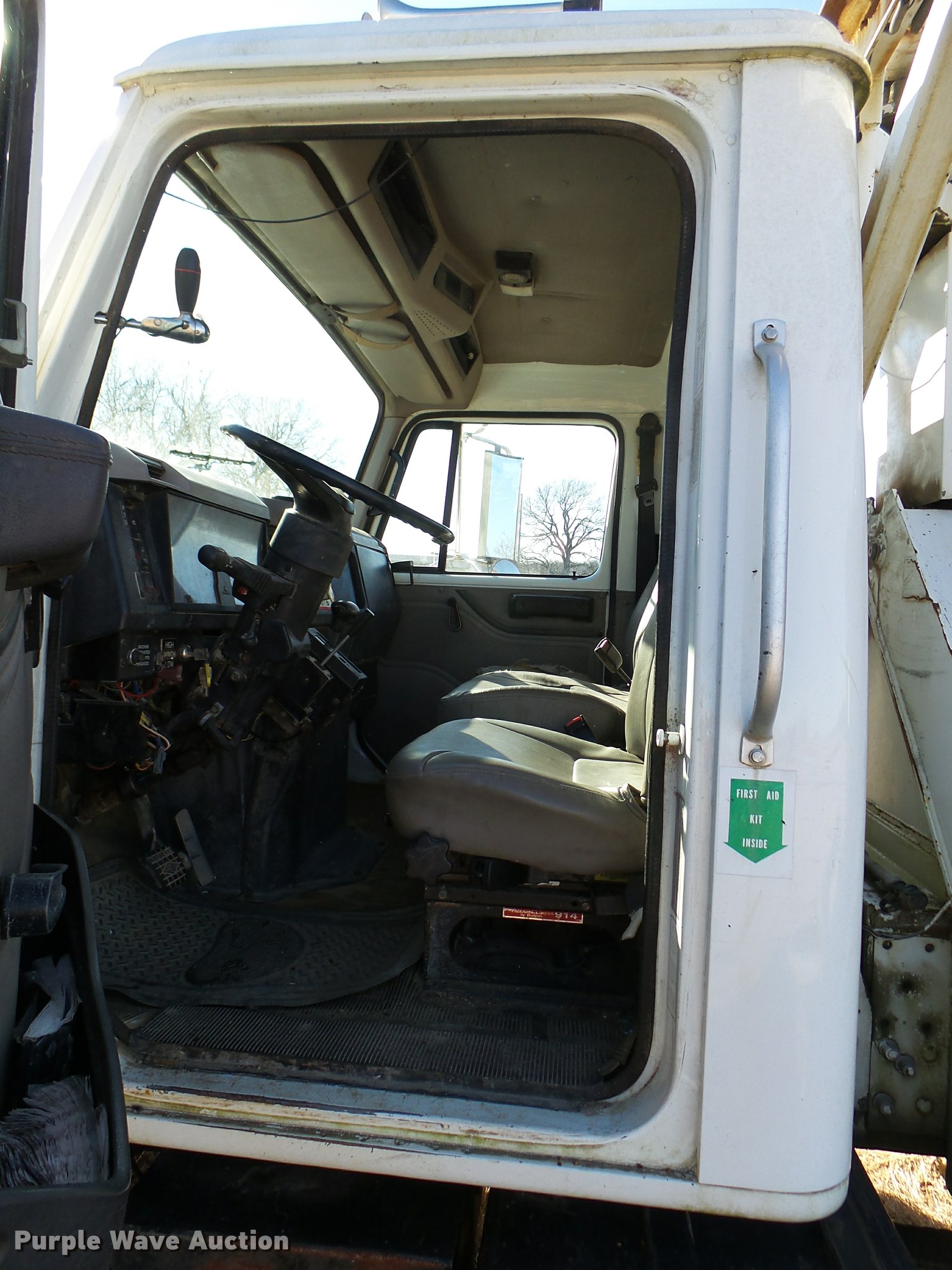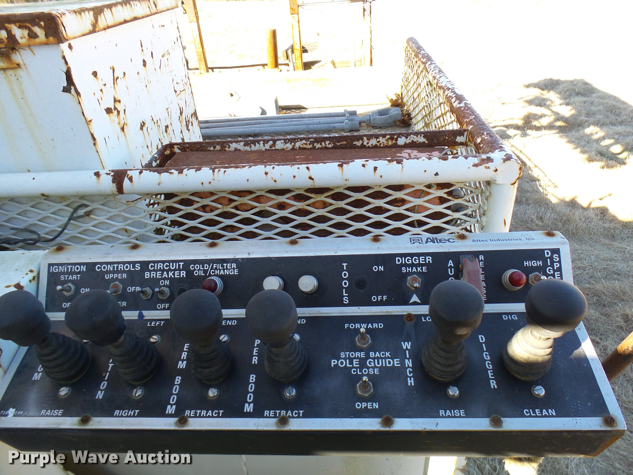 Purple Wave is selling a used Digger Derrick Truck in Oklahoma. This item is a 1998 International 4900 digger derrick truck with the following: 208,402 miles on odometer, International DT466E 7.6L L6 turbo diesel engine, Allison automatic transmission, Tandem axle, AC and heat, Cruise, AM/FM/CD, Suspension seat, Spotlight, Auxiliary controls, Brake controller, Front tow hooks, Front winch and bumper, No coil on spool, Altec service bed, 18'L, Shelving, Utility rack, Serial 37-68245, 1997 Altec D945TB digger derrick, 45' boom length, 7,600 lbs max lift capacity, 52' max lift height, Platform boom controls, Boom rotation, Material handler, Pole guide, (2) pole racks, Articulating insulated telescopic boom, 18" diameter auger, (4) outriggers, Serial 0597BA1032, Pintle hitch, Trailer wiring, Spring suspension, Air brakes, 206" wheelbase, 385/65R22.5 front tires, 11R22.5 rear tires, Idle issues, possible computer issues