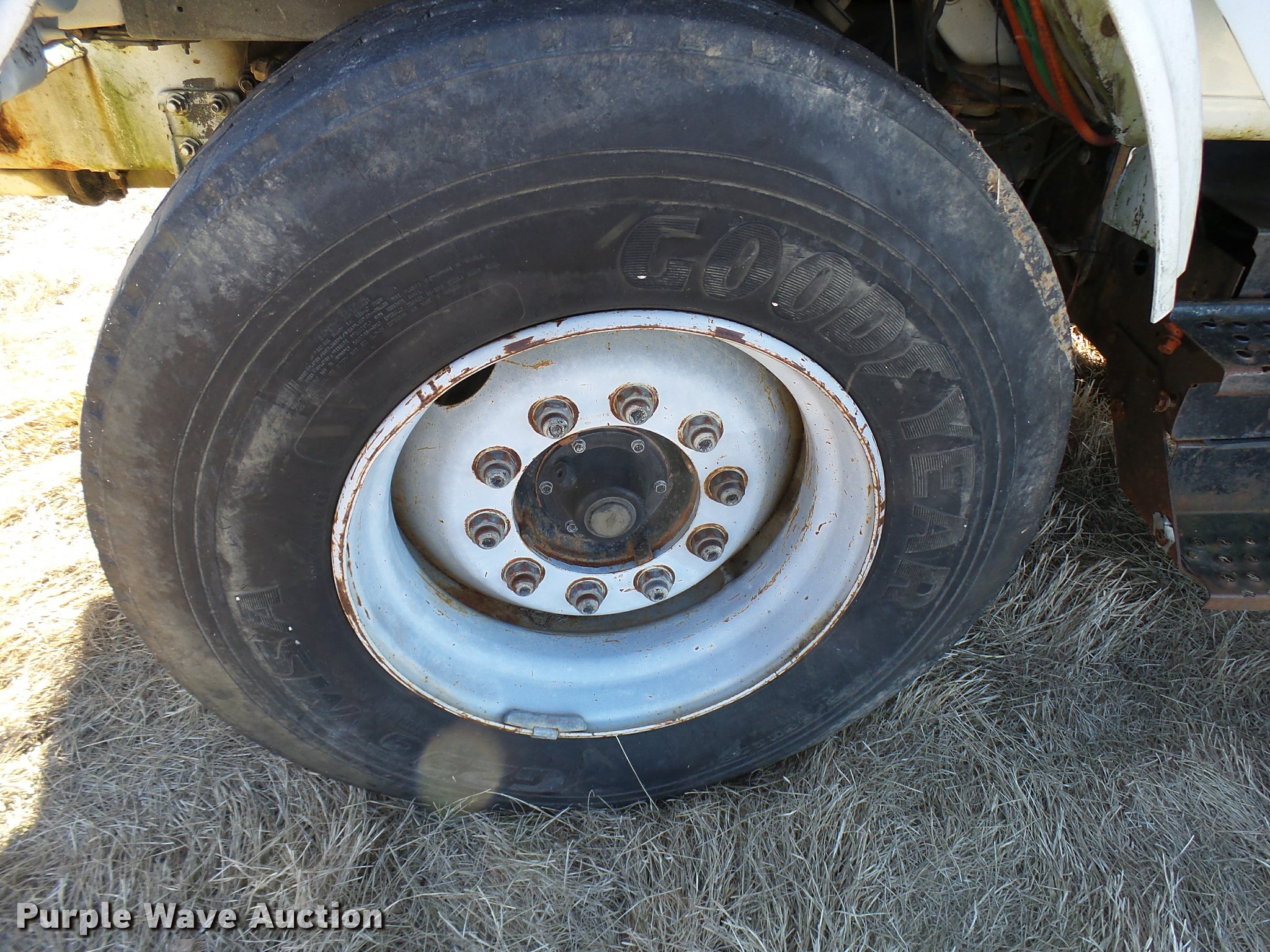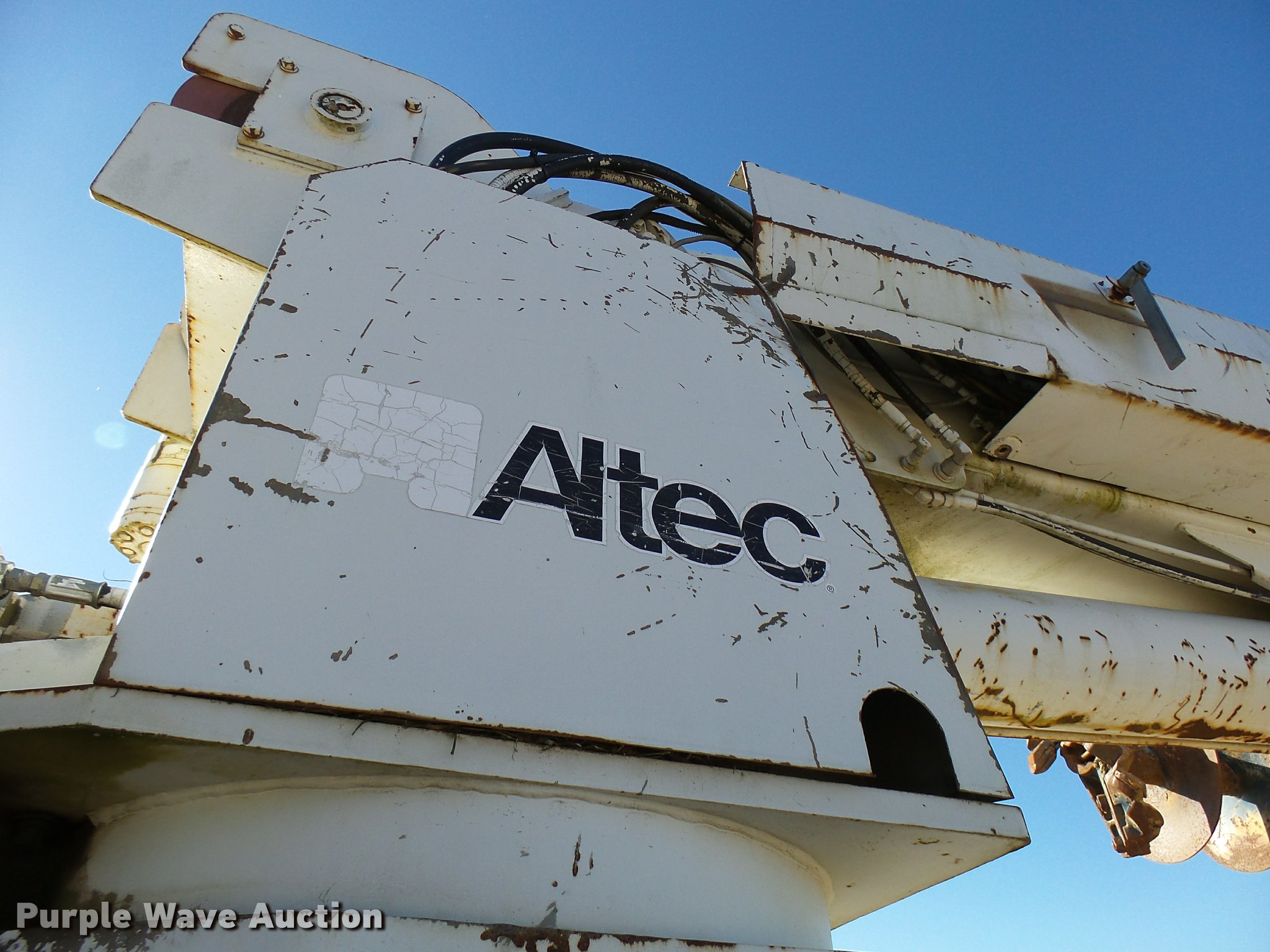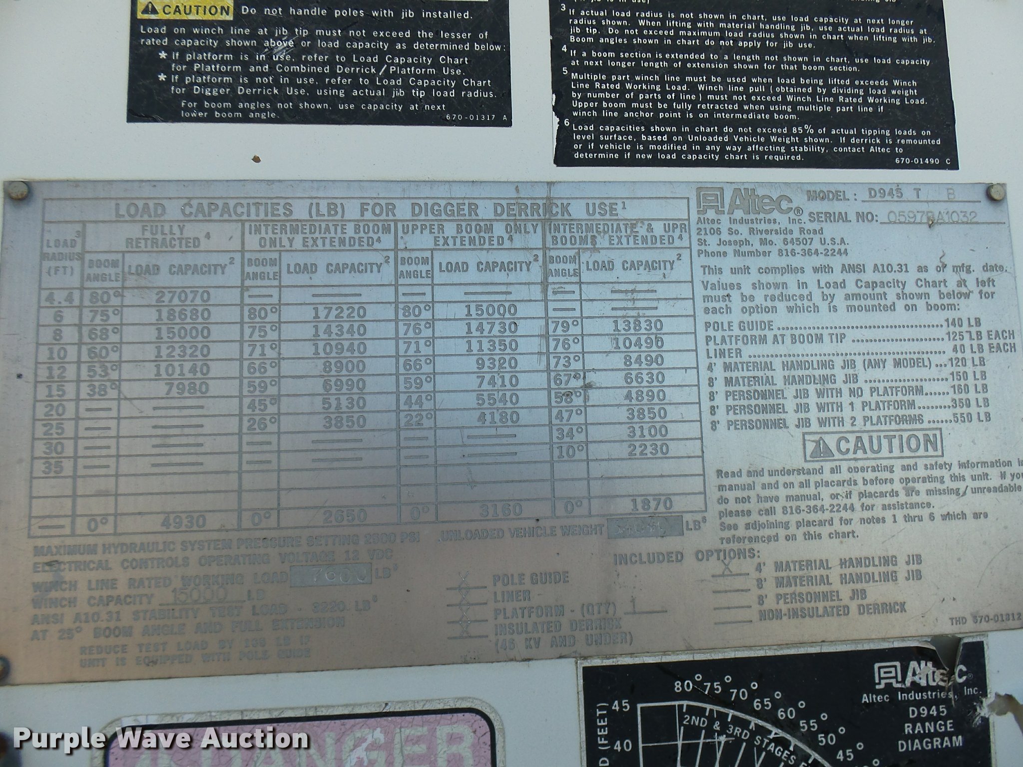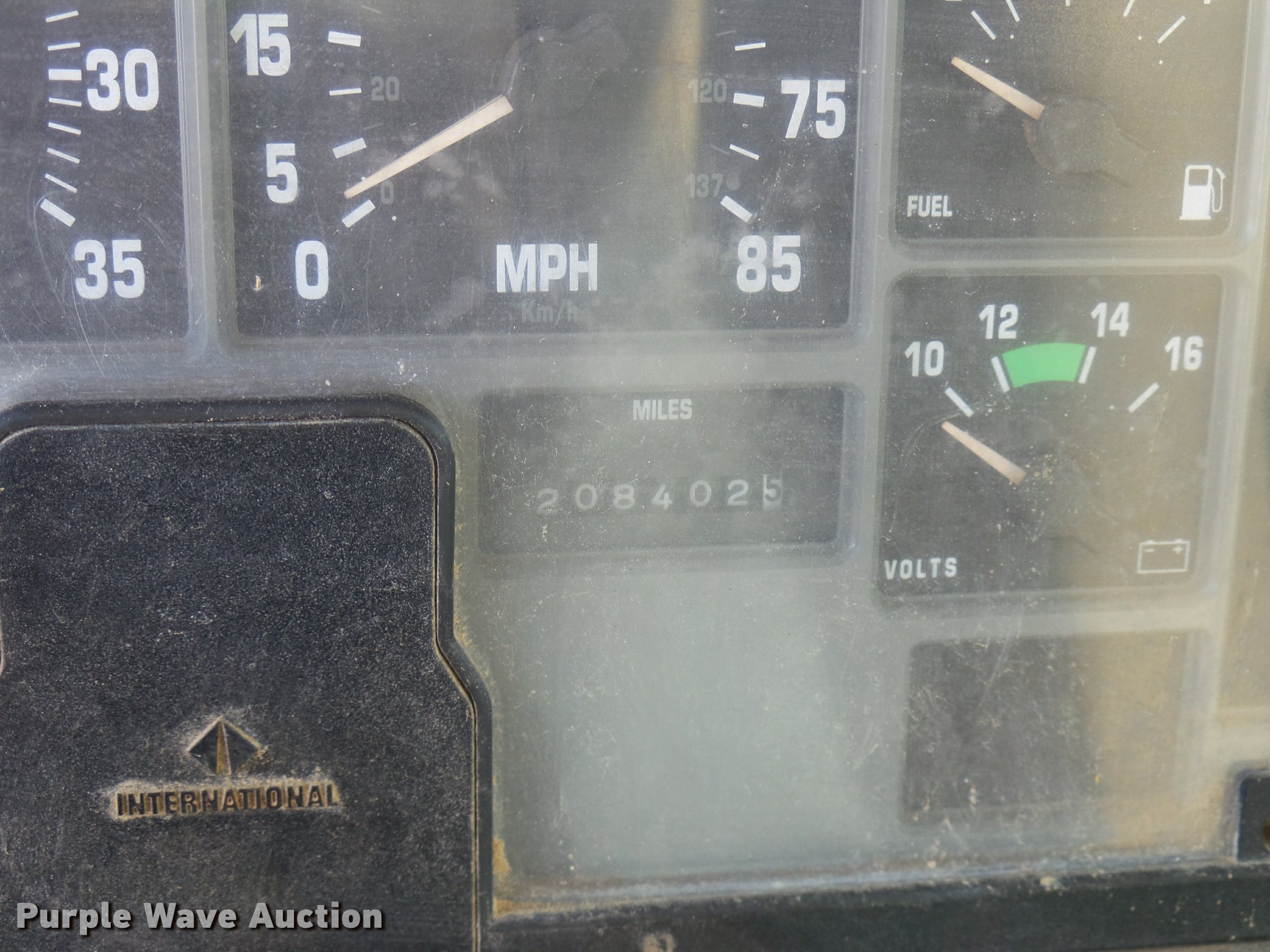 Purple Wave is selling a used Digger Derrick Truck in Oklahoma. This item is a 1998 International 4900 digger derrick truck with the following: 208,402 miles on odometer, International DT466E 7.6L L6 turbo diesel engine, Allison automatic transmission, Tandem axle, AC and heat, Cruise, AM/FM/CD, Suspension seat, Spotlight, Auxiliary controls, Brake controller, Front tow hooks, Front winch and bumper, No coil on spool, Altec service bed, 18'L, Shelving, Utility rack, Serial 37-68245, 1997 Altec D945TB digger derrick, 45' boom length, 7,600 lbs max lift capacity, 52' max lift height, Platform boom controls, Boom rotation, Material handler, Pole guide, (2) pole racks, Articulating insulated telescopic boom, 18" diameter auger, (4) outriggers, Serial 0597BA1032, Pintle hitch, Trailer wiring, Spring suspension, Air brakes, 206" wheelbase, 385/65R22.5 front tires, 11R22.5 rear tires, Idle issues, possible computer issues