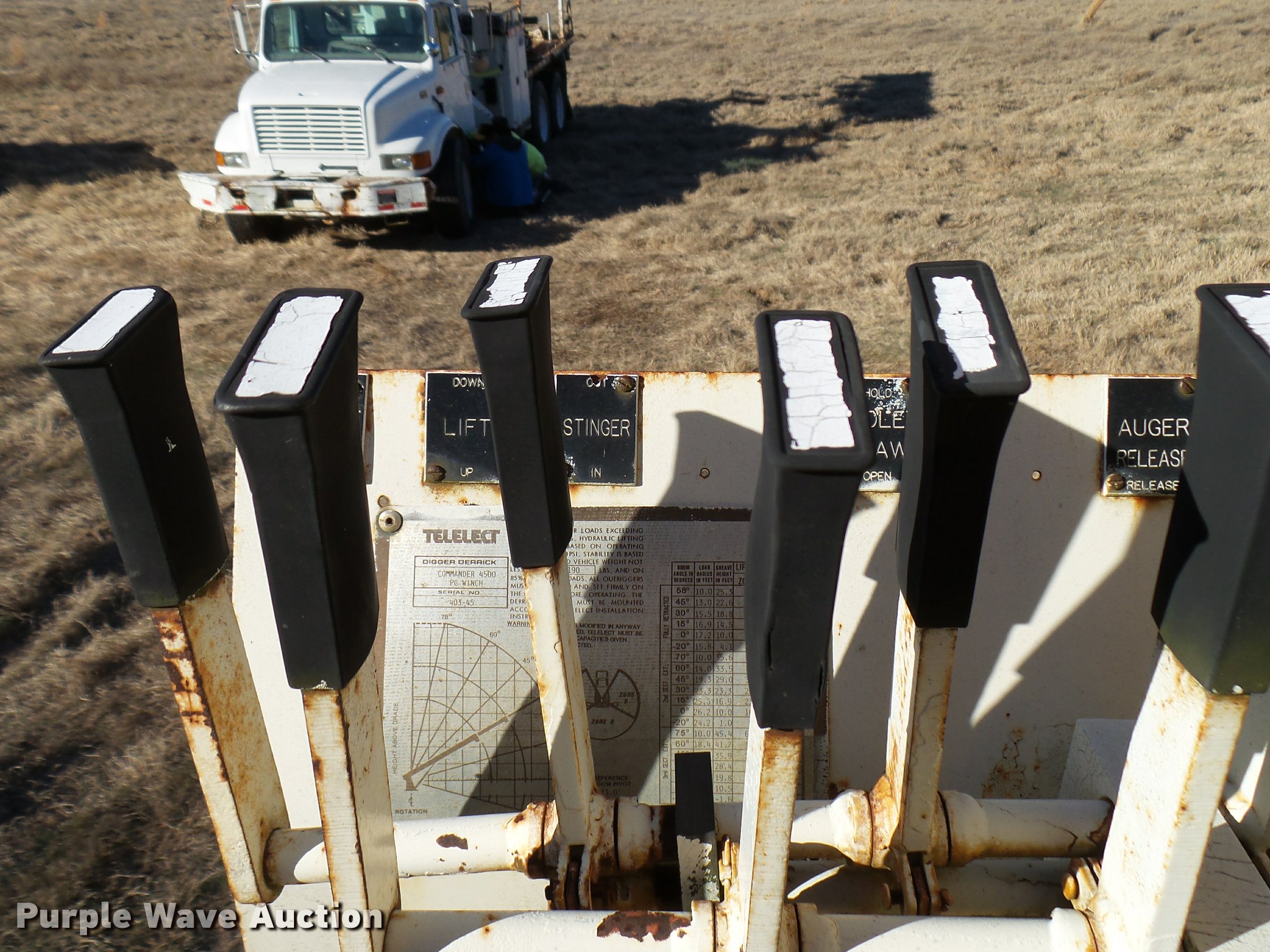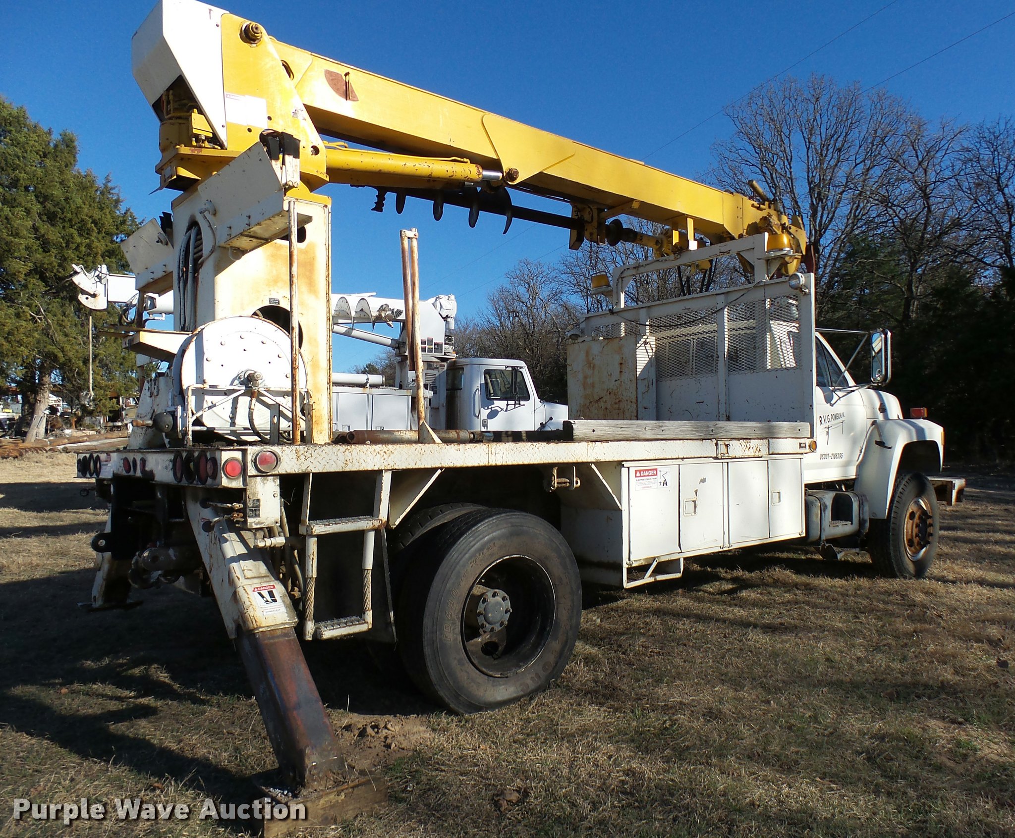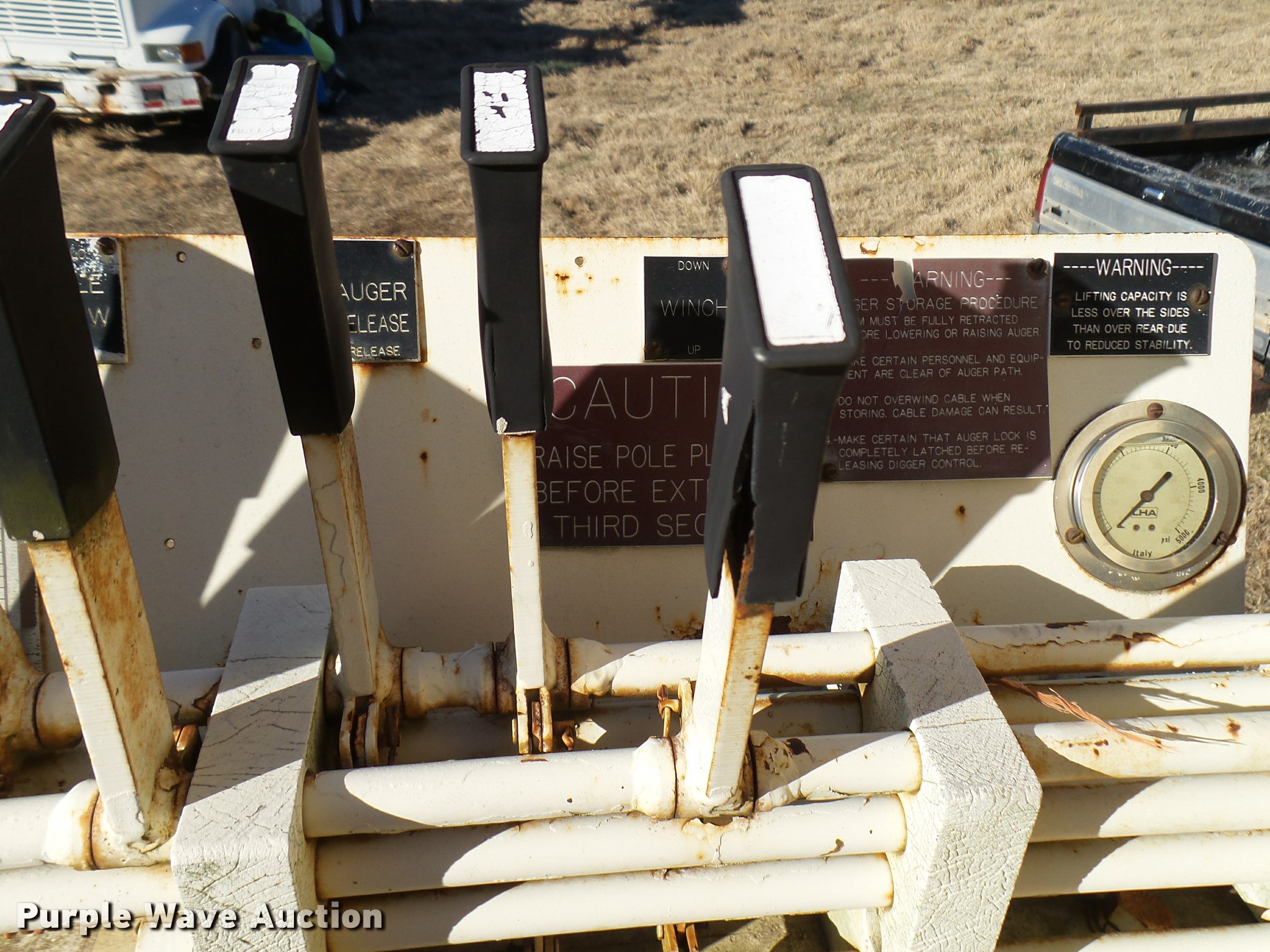 Purple Wave is selling a used Digger Derrick Truck in Oklahoma. This item is a 1986 Ford F800 digger derrick truck with the following: 114,262 miles on odometer, Caterpillar 3208 10.4L V8 diesel engine, Automatic transmission, Single axle, Heat, AM/FM, Suspension seat, Front tow hooks, Hi speed PTO, Baker 1176-03 service bed, 14'L, Utility rack, Serial 113336-07-87, Telelect Command 4587 digger derrick, 45' boom length, 47' max lift height, Platform boom controls, Boom rotation, Material handler, Articulating insulated boom, 16" auger diameter, Serial 403-45, Front winch and bumper, Catman hoist, Single fuel tank, Pintle hitch, Trailer wiring, Spring suspension, Air brakes, 190" wheelbase, 10.00x20 front tires, 11R22.5 rear tires, Non-operational radio, Transmission stuck in reverse gear, Drivers door interior door handle missing, Driveline removed