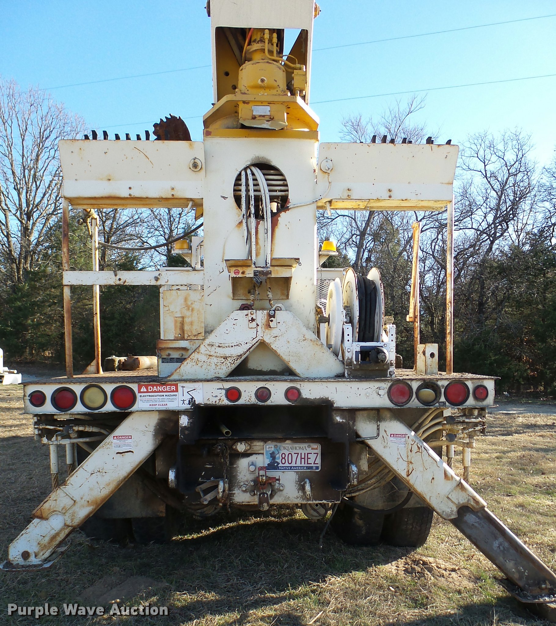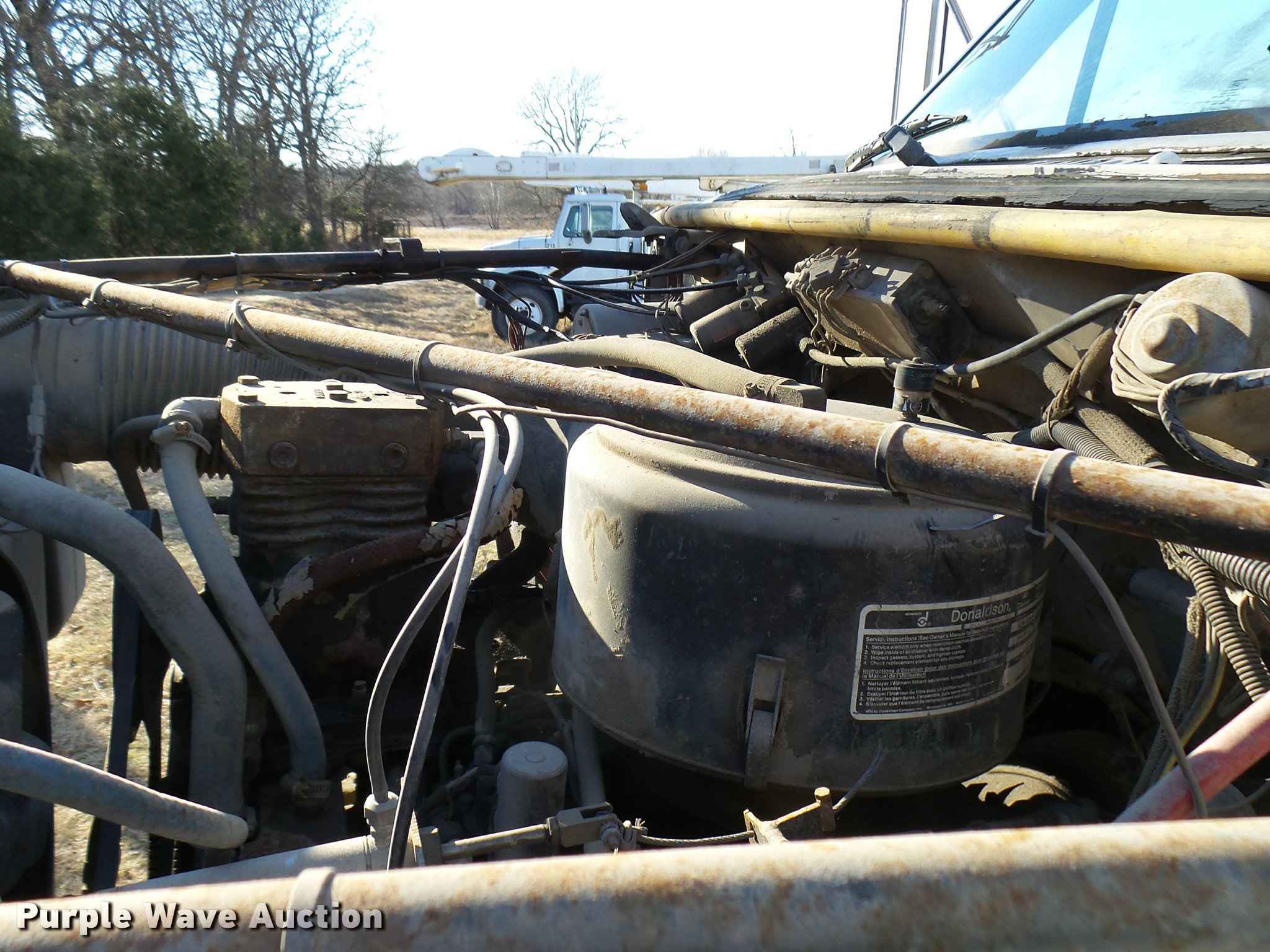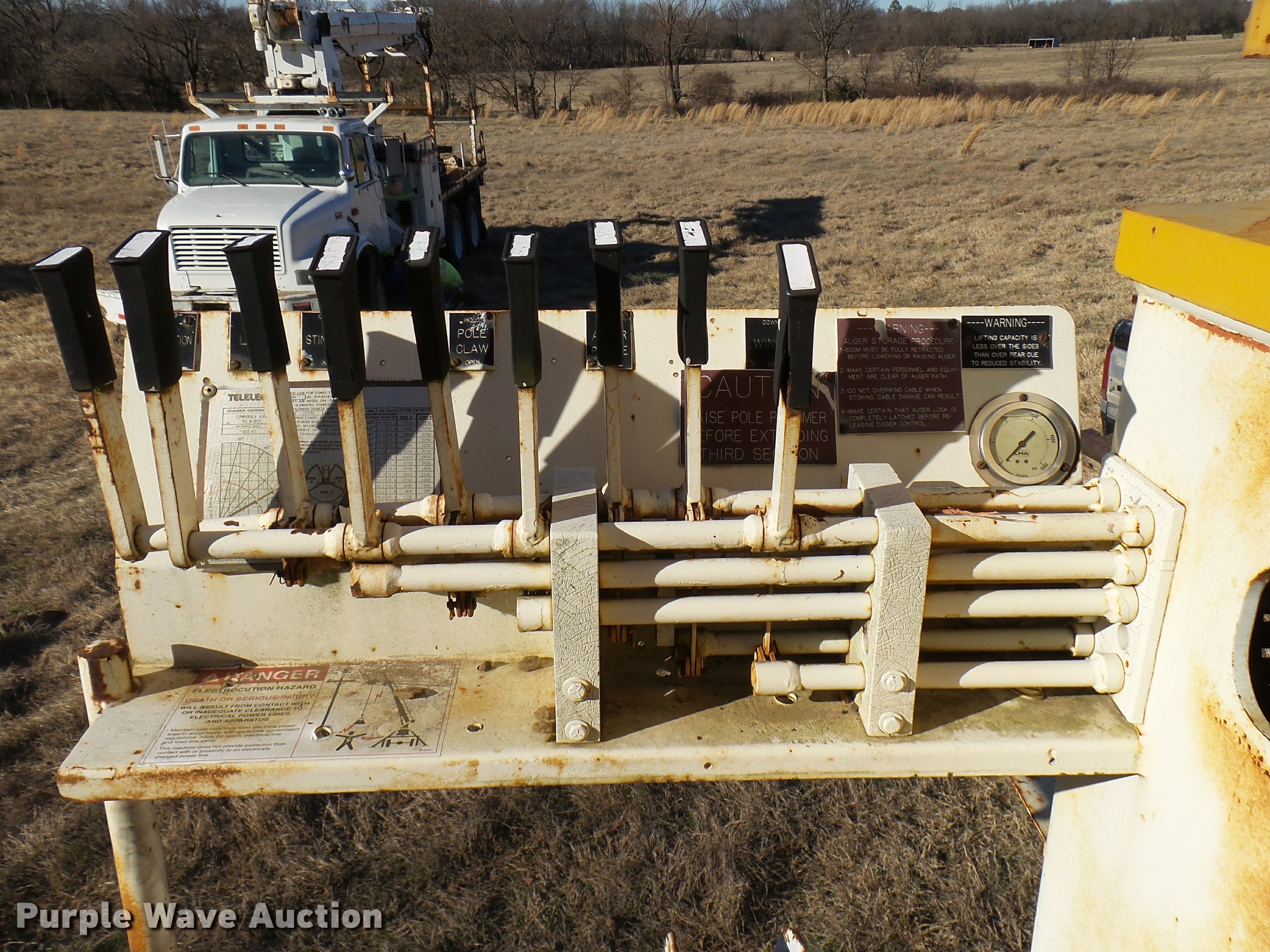 Purple Wave is selling a used Digger Derrick Truck in Oklahoma. This item is a 1986 Ford F800 digger derrick truck with the following: 114,262 miles on odometer, Caterpillar 3208 10.4L V8 diesel engine, Automatic transmission, Single axle, Heat, AM/FM, Suspension seat, Front tow hooks, Hi speed PTO, Baker 1176-03 service bed, 14'L, Utility rack, Serial 113336-07-87, Telelect Command 4587 digger derrick, 45' boom length, 47' max lift height, Platform boom controls, Boom rotation, Material handler, Articulating insulated boom, 16" auger diameter, Serial 403-45, Front winch and bumper, Catman hoist, Single fuel tank, Pintle hitch, Trailer wiring, Spring suspension, Air brakes, 190" wheelbase, 10.00x20 front tires, 11R22.5 rear tires, Non-operational radio, Transmission stuck in reverse gear, Drivers door interior door handle missing, Driveline removed