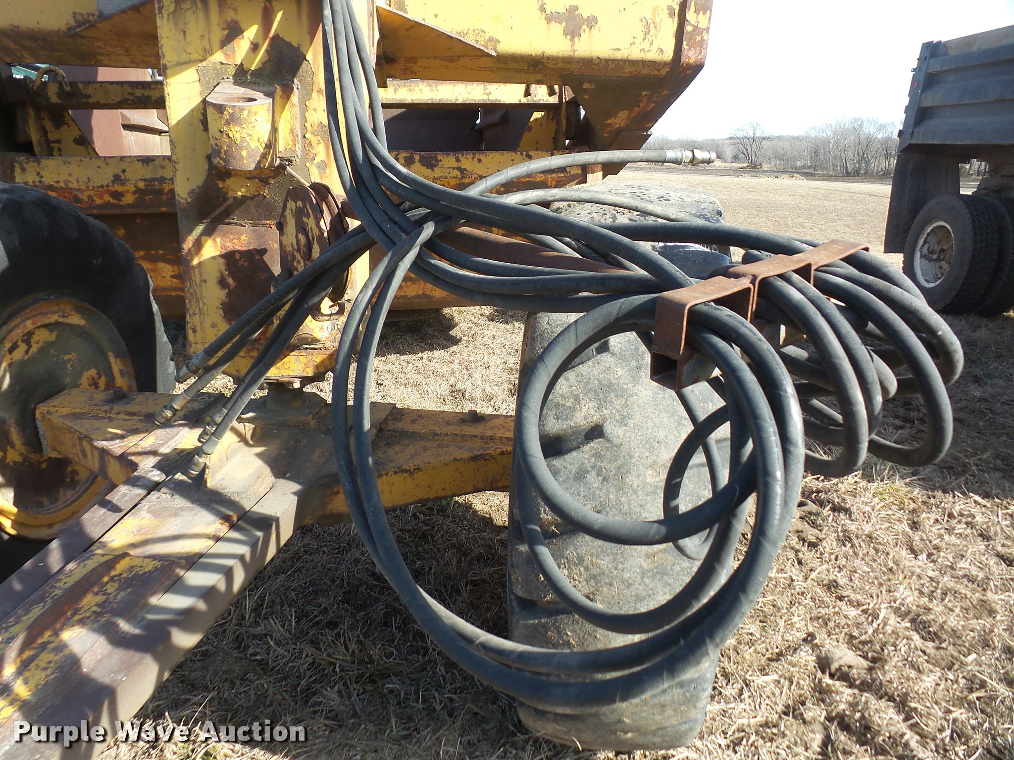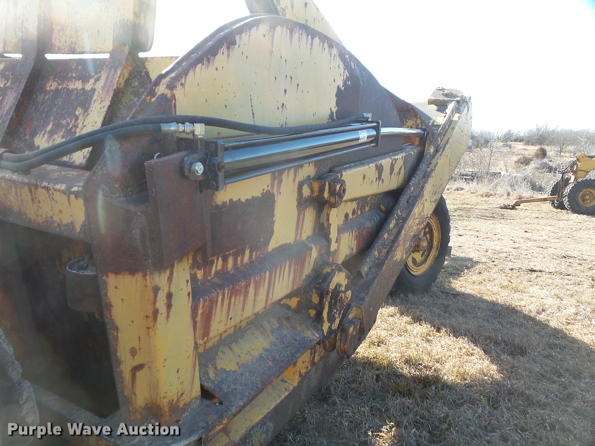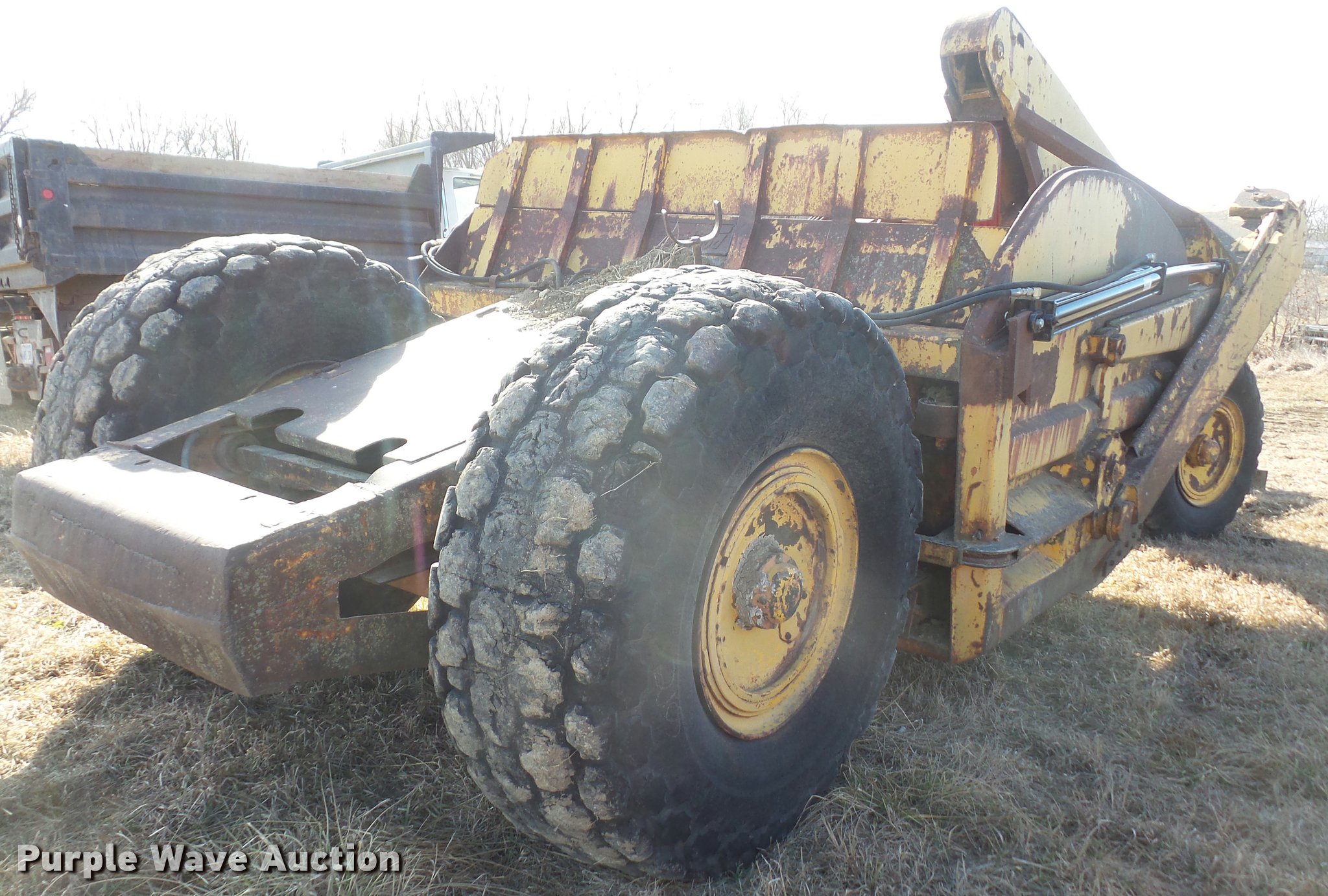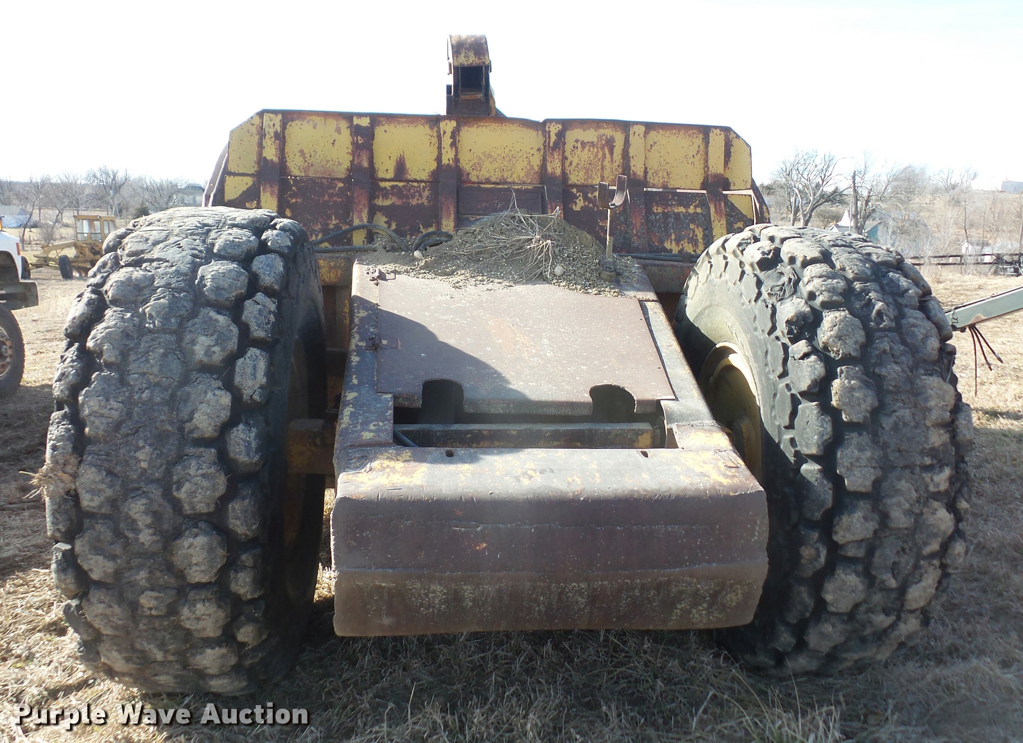 Purple Wave is selling a used Pull Type Scraper in Kansas. This item is a Garwood 615 conventional scraper with the following: 15 cu.yd. capacity, 16.00-24 front tires, 21.00-25 rear tires, Apron lift cylinders bent, Serial 247