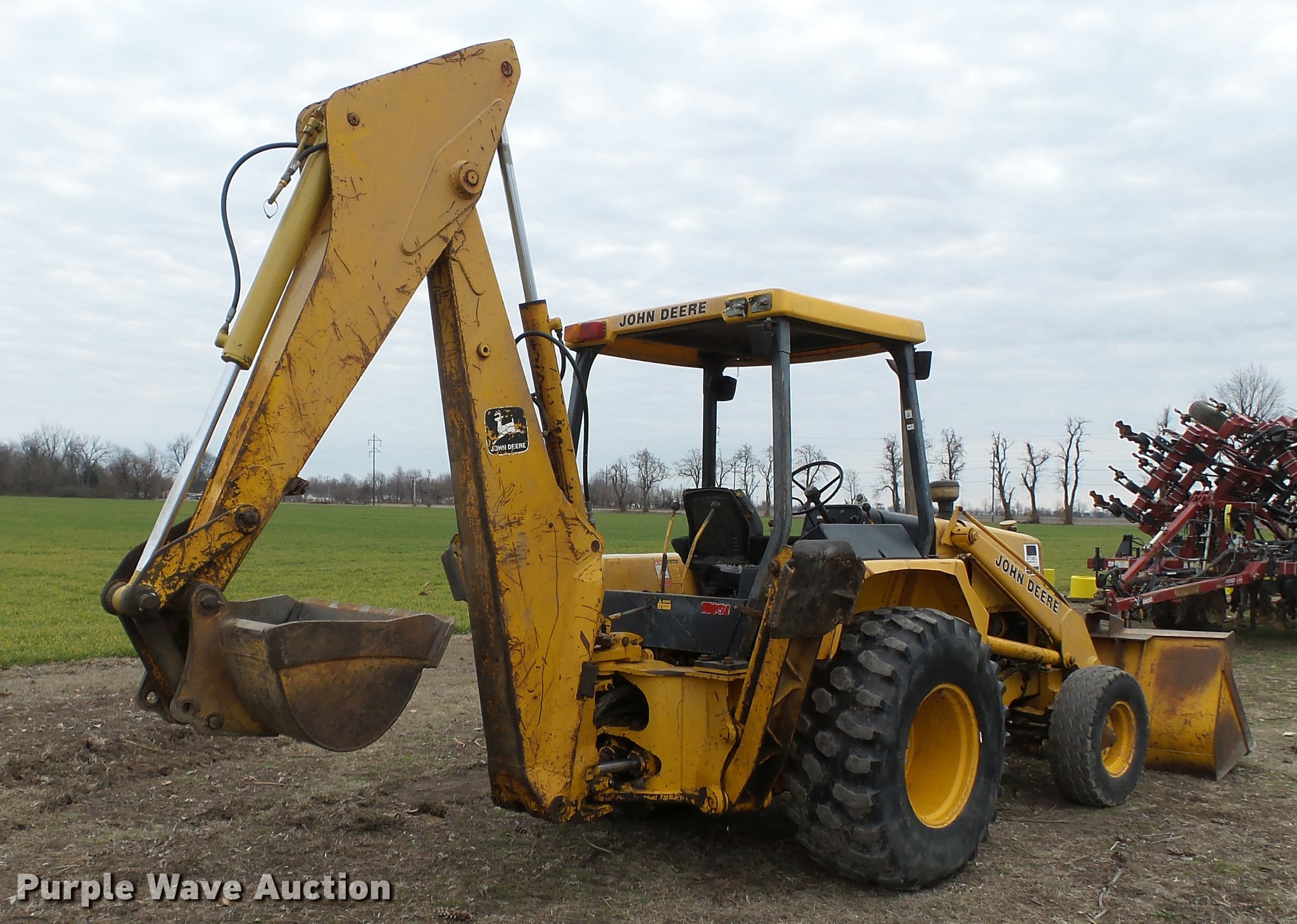 Purple Wave is selling a used Tractor Loader Backhoe in Missouri. This item is a 1989 John Deere 410C backhoe with the following: 5,821 hours on meter, John Deere 4.5L four cylinder diesel engine, Serial T04276204864, Shuttle shift transmission, 4F-4R gears, OROPS, Suspension seat, Wobble stick backhoe controls, Front and rear work lights, John Deere AT113825 loader bucket, 91"W, Bolt-on cutting edge, 42"W backhoe bucket, Weld-on cutting edge, Front counterweight, 11L-16SL front tires, 19.5LR24 rear tires, Serial T0410CA755436