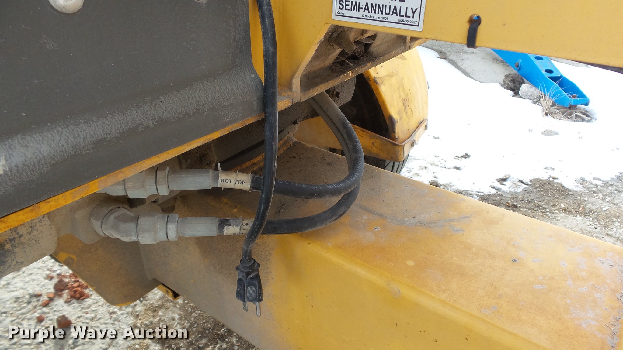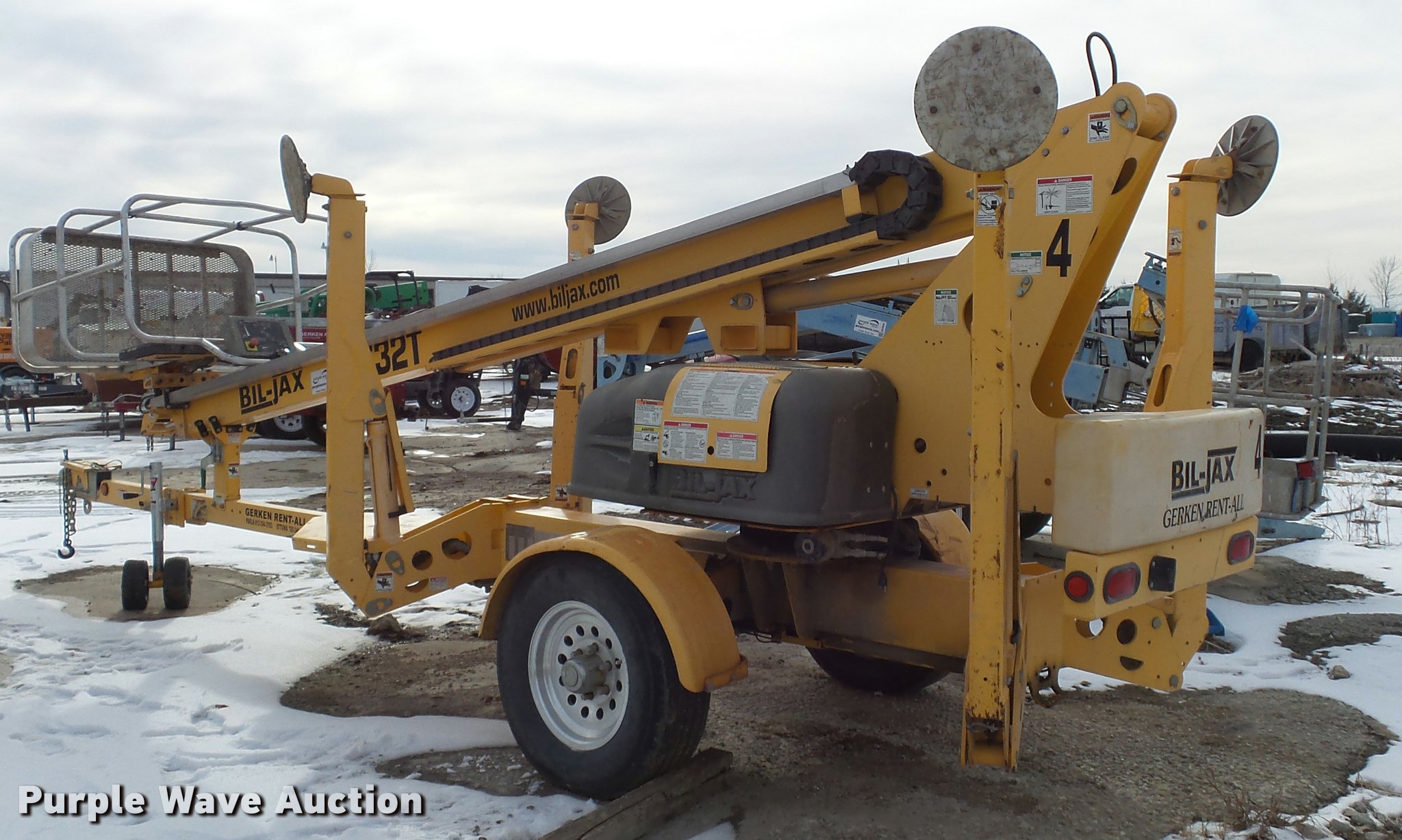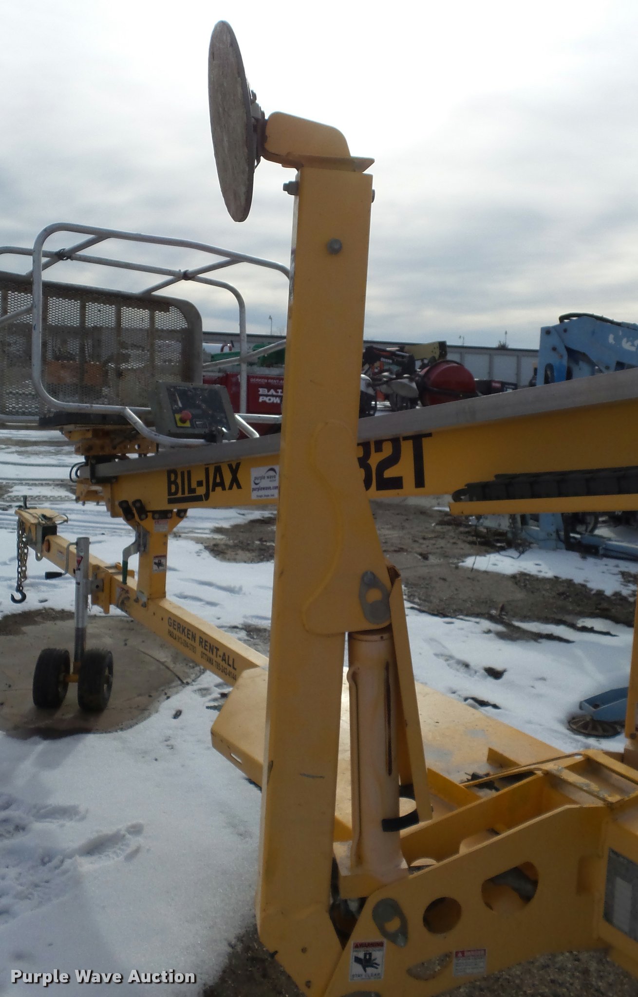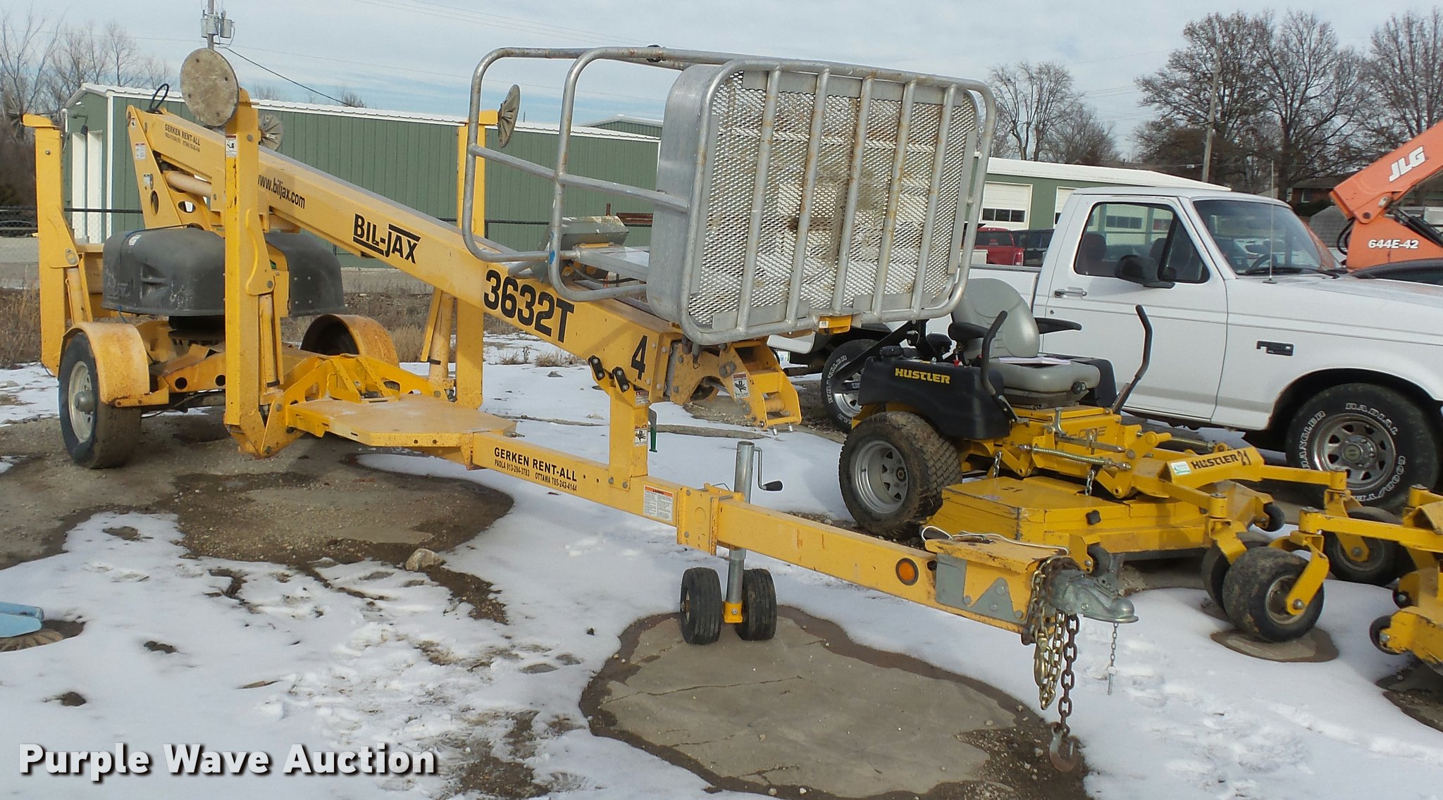 Purple Wave is selling a used Boom Lift in Kansas. This item is a 2008 Bil-jax 3632T boom lift with the following: 24V operation, 500 lbs maximum lift capacity, 30' maximum reach length, 40' maximum lift height, 4'L x 28" platform, Two person capacity, AC power outlet, Auto leveler, Hydraulic outriggers, Safety chains, 2" ball hitch, 225/75R15 tires, GVWR 5,240 lbs, Serial 36T08-00223